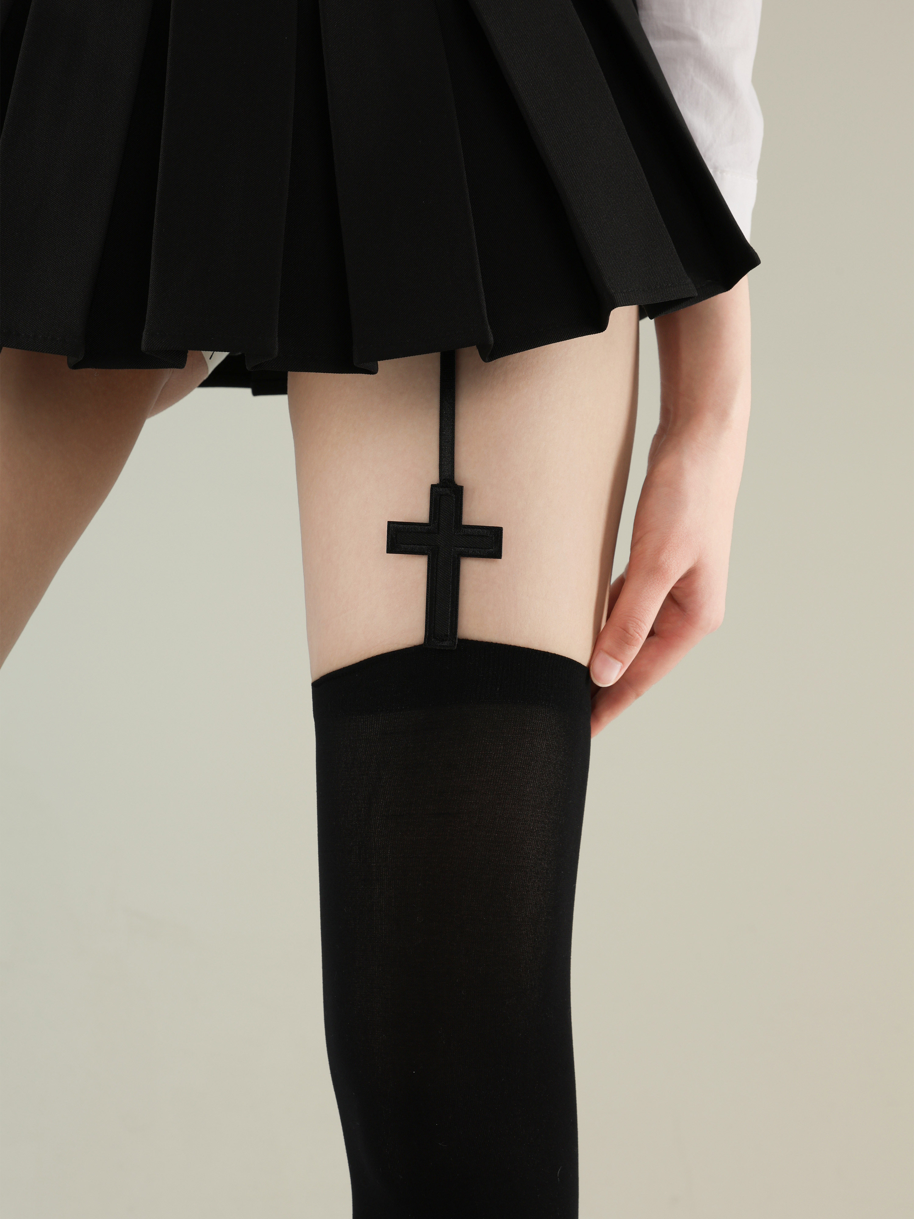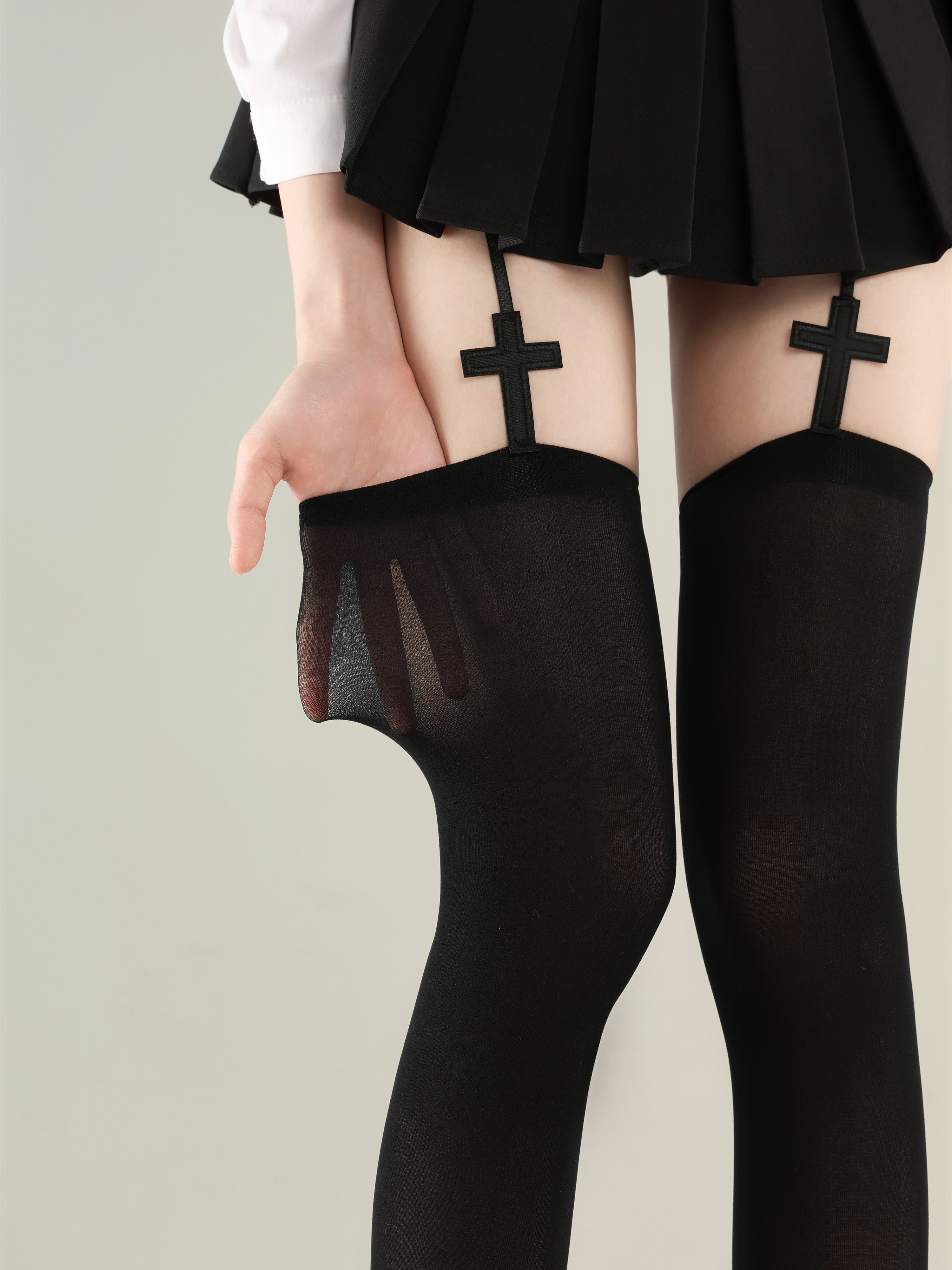 Arriving at the First Floor, Hot Girl Cross Suspender Stockings, Black Absolute Domain Gothic Dark Lolita Thigh-High Stockings