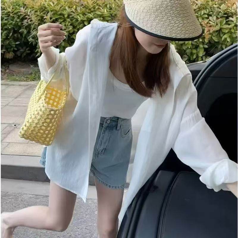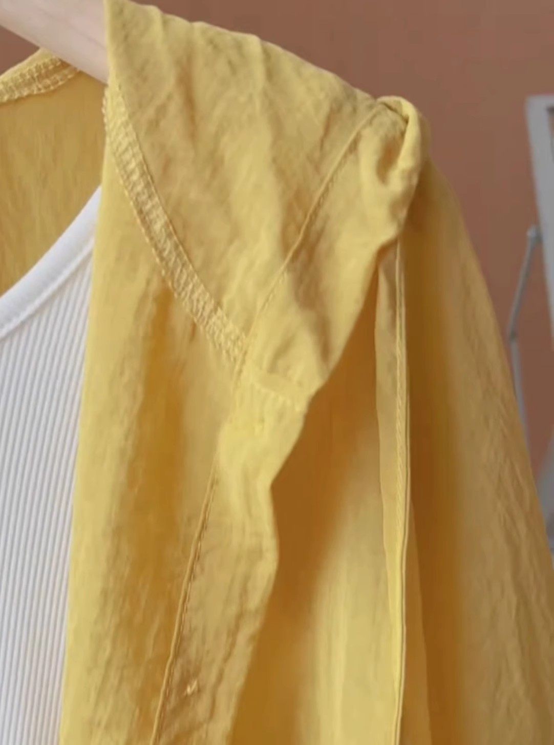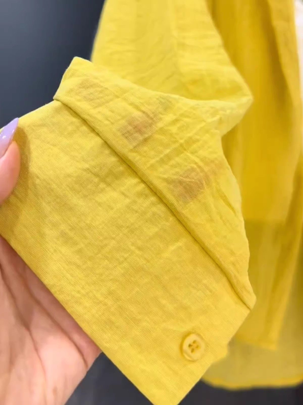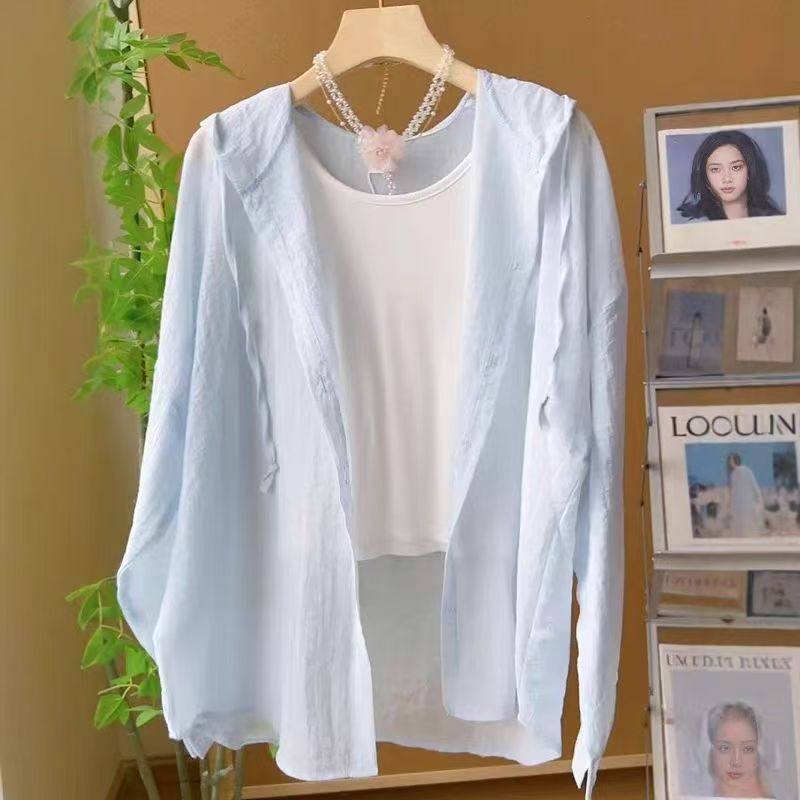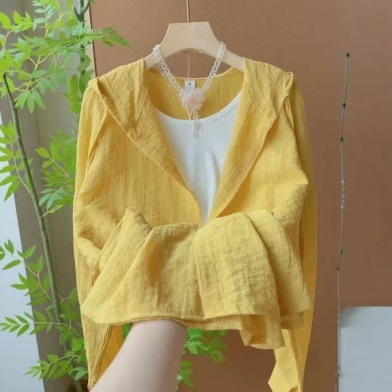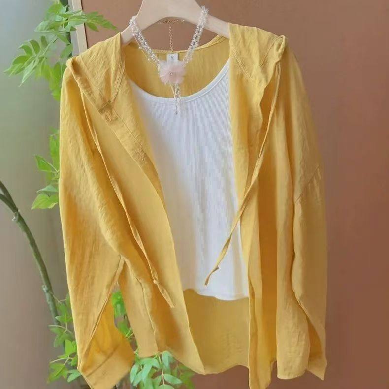 Summer and Autumn Lightweight Milky Yellow Lace-Up Hooded Long-Sleeved Shirt for Women, Loose and Lazy Style Windbreaker, Sun Protection Jacket, Air-Conditioning Shirt