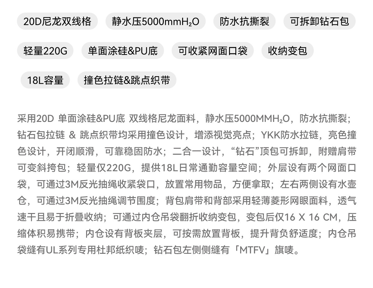 Mountainfever Ul 20D Silicone-Coated Nylon Two-In-One Lightweight Waterproof 18L Diamond Backpack
