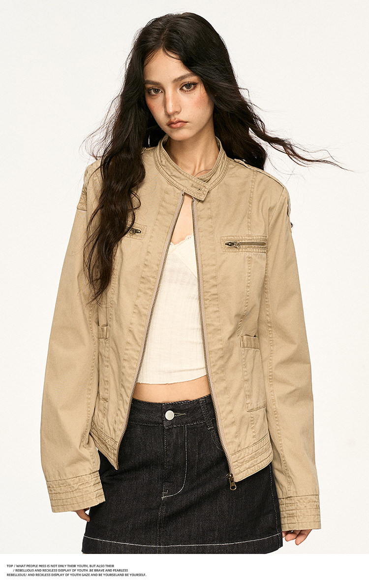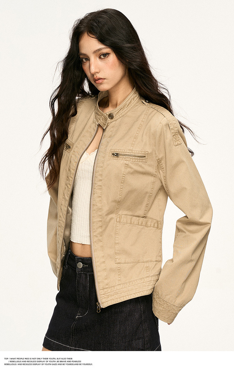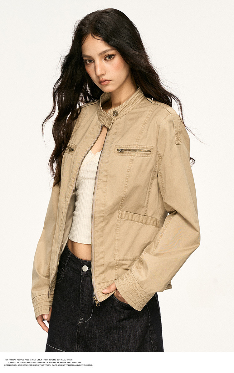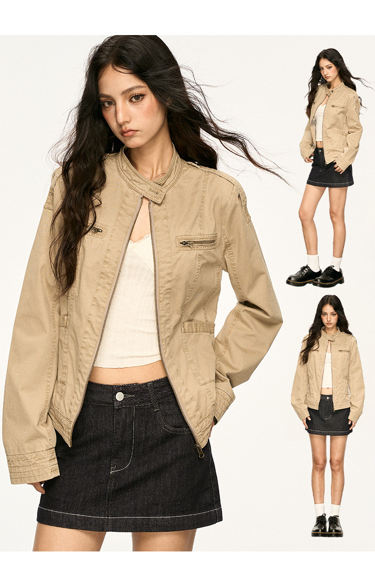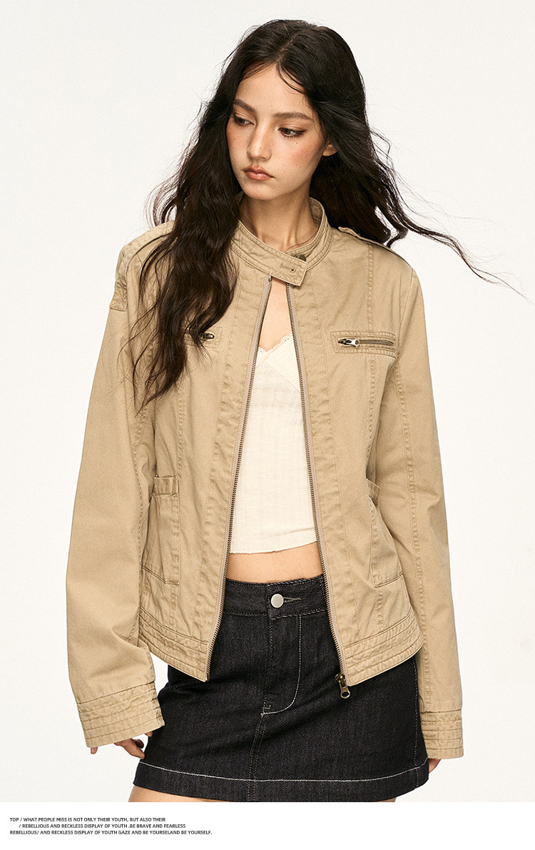 Aaisup American-Style Stand-Up Collar Vintage American Shoulder-Length Short Jacket for Women, Spring and Autumn Design, Casual Versatile Jacket Top