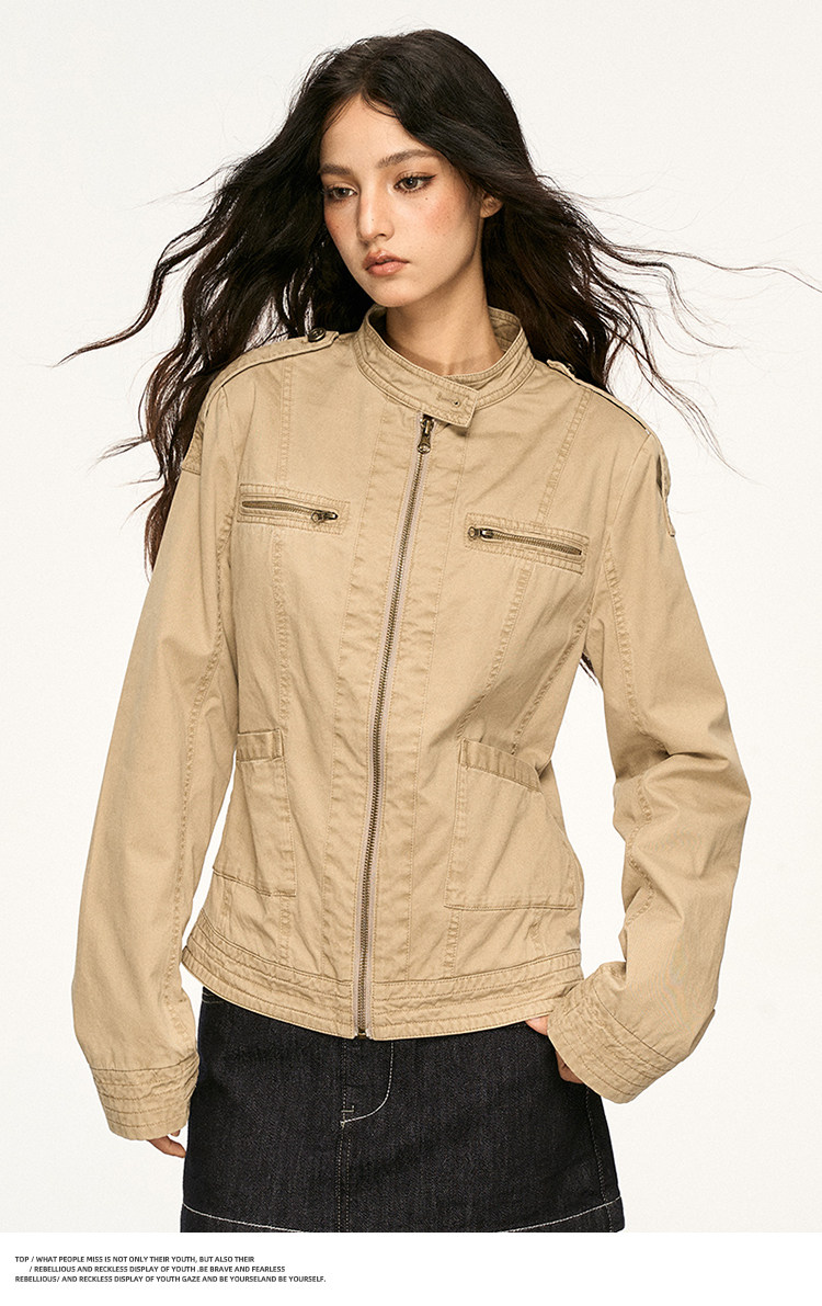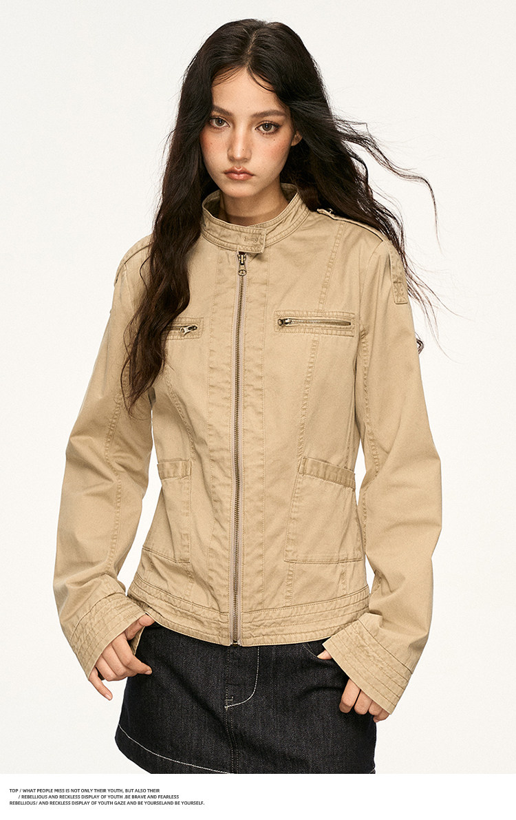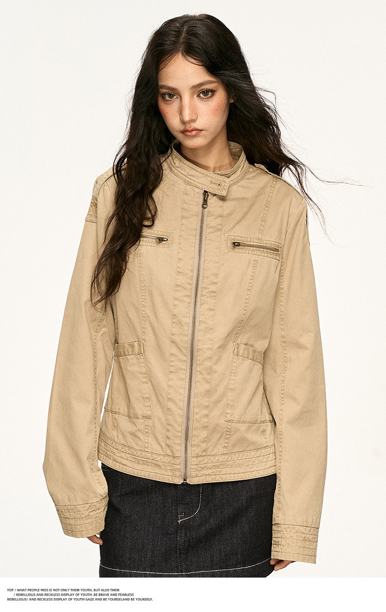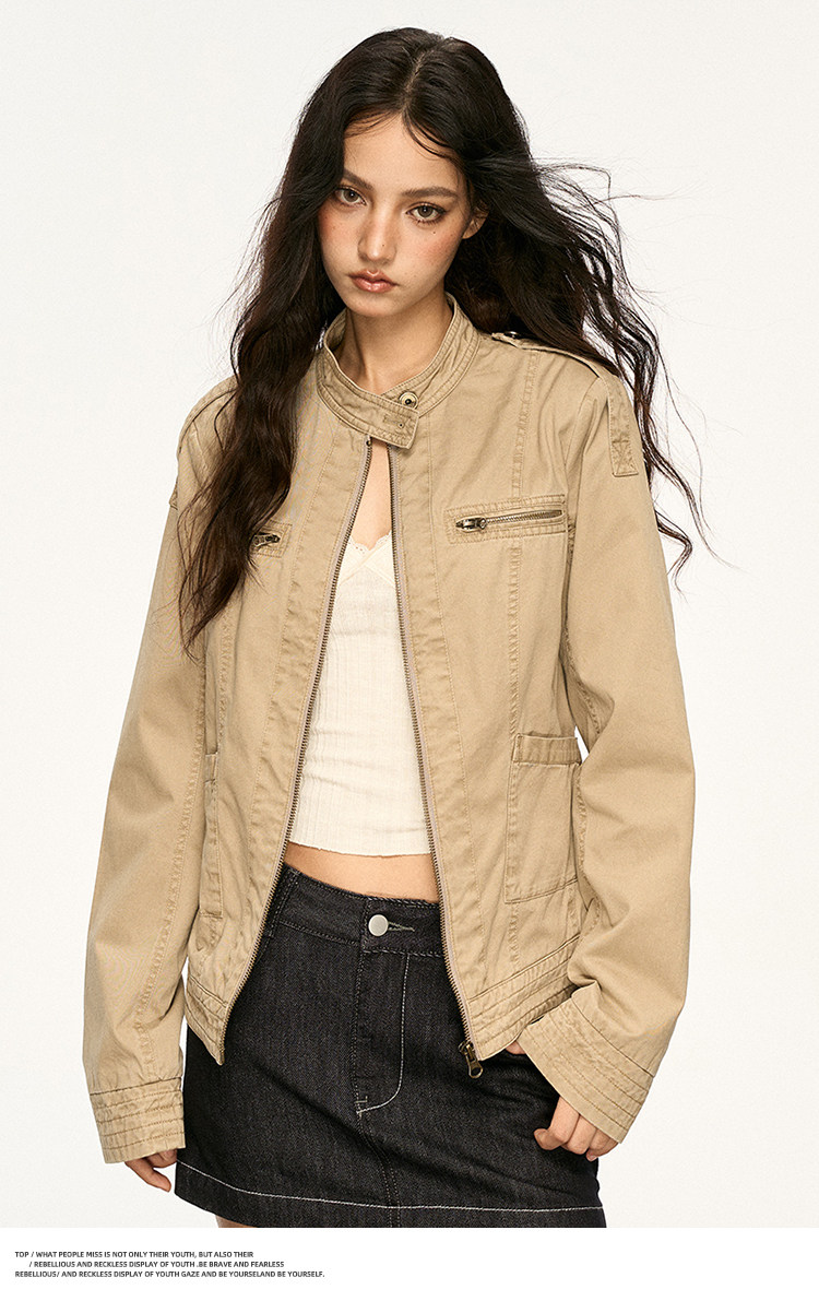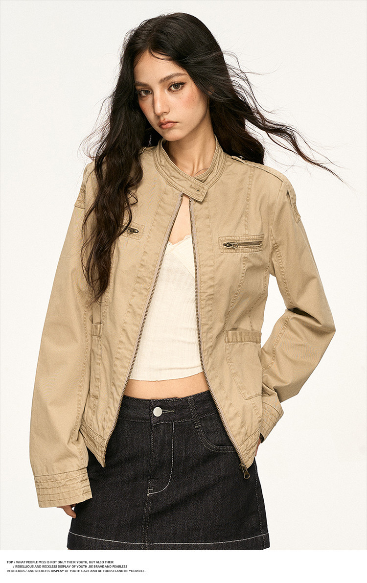 Aaisup American-Style Stand-Up Collar Vintage American Shoulder-Length Short Jacket for Women, Spring and Autumn Design, Casual Versatile Jacket Top