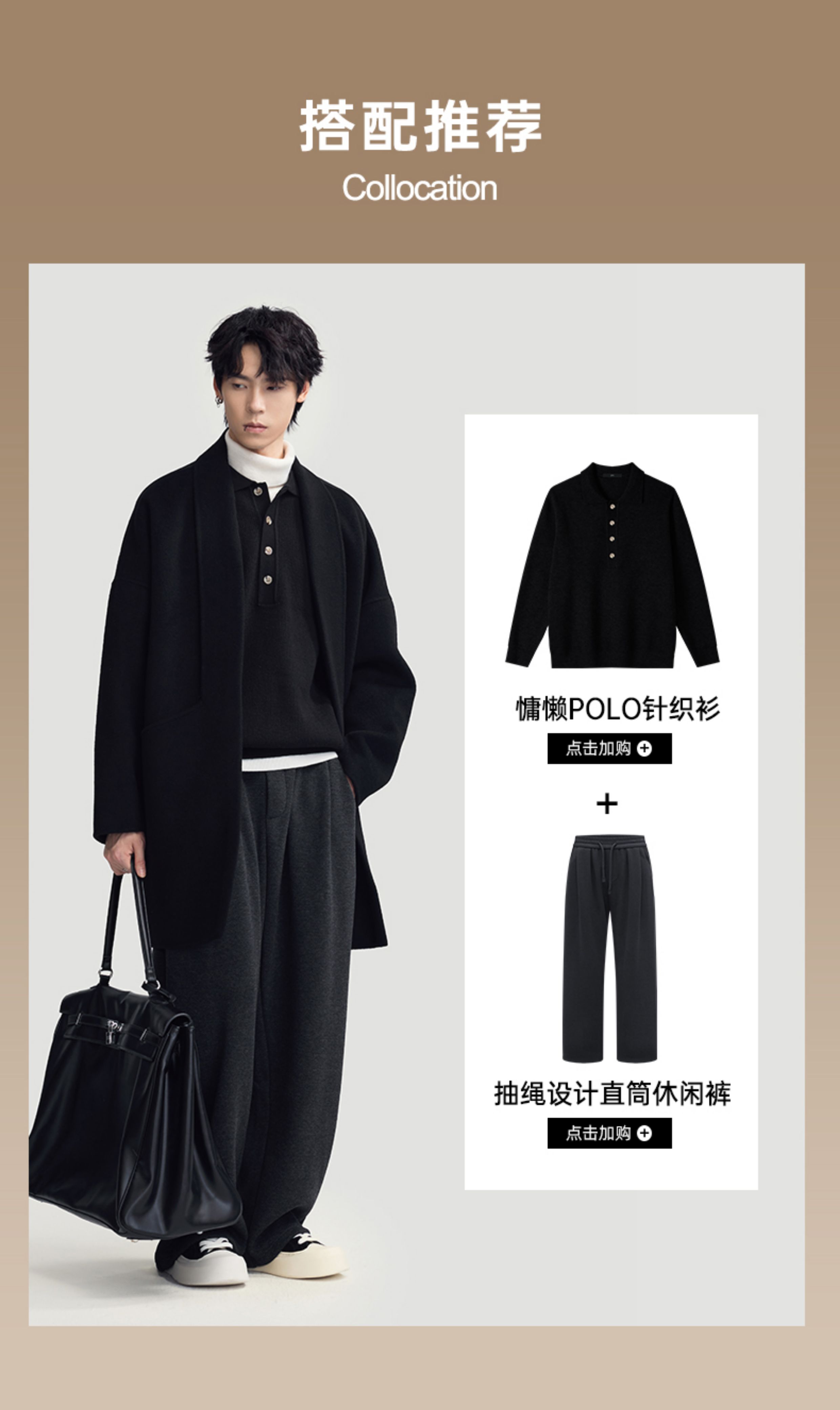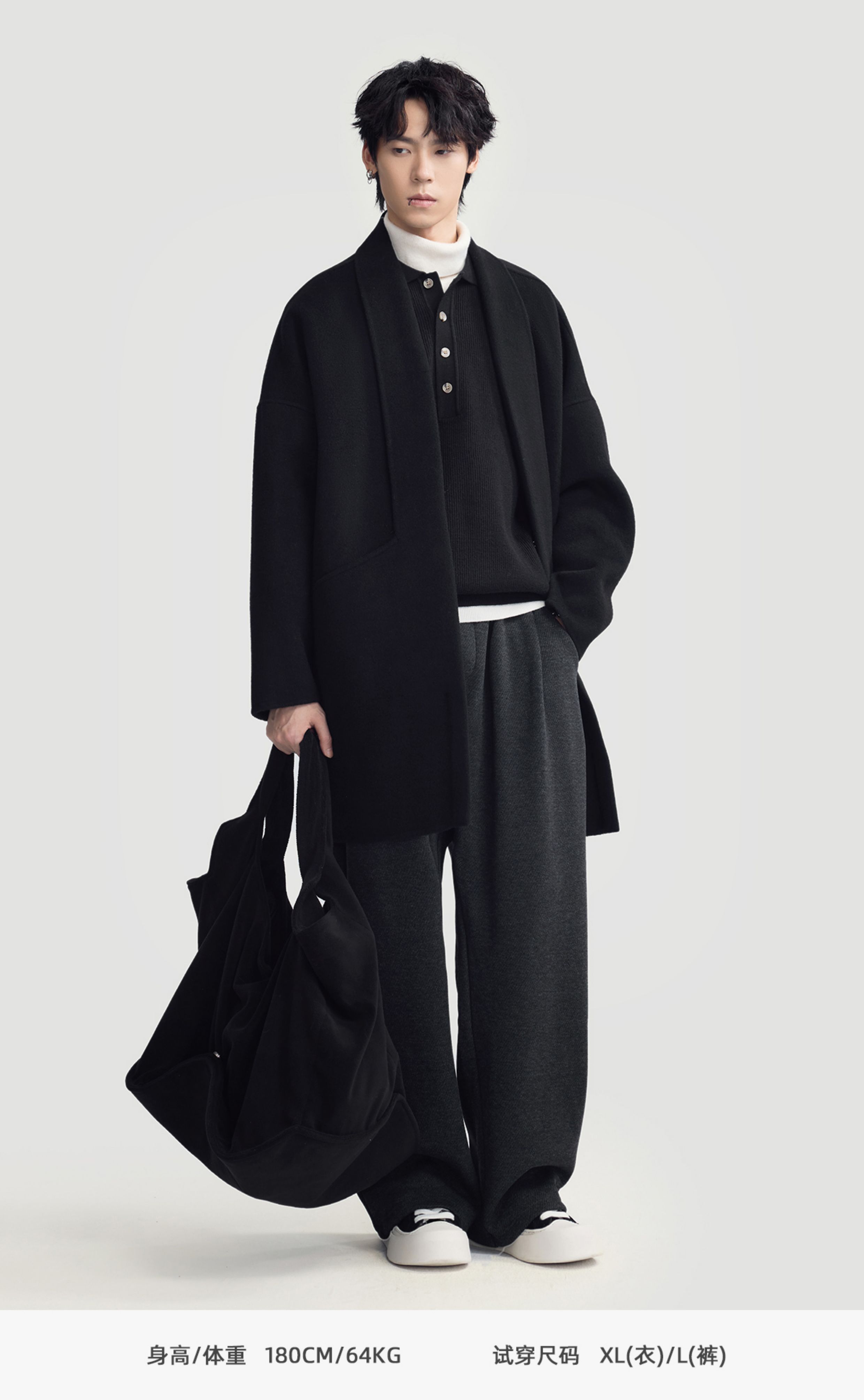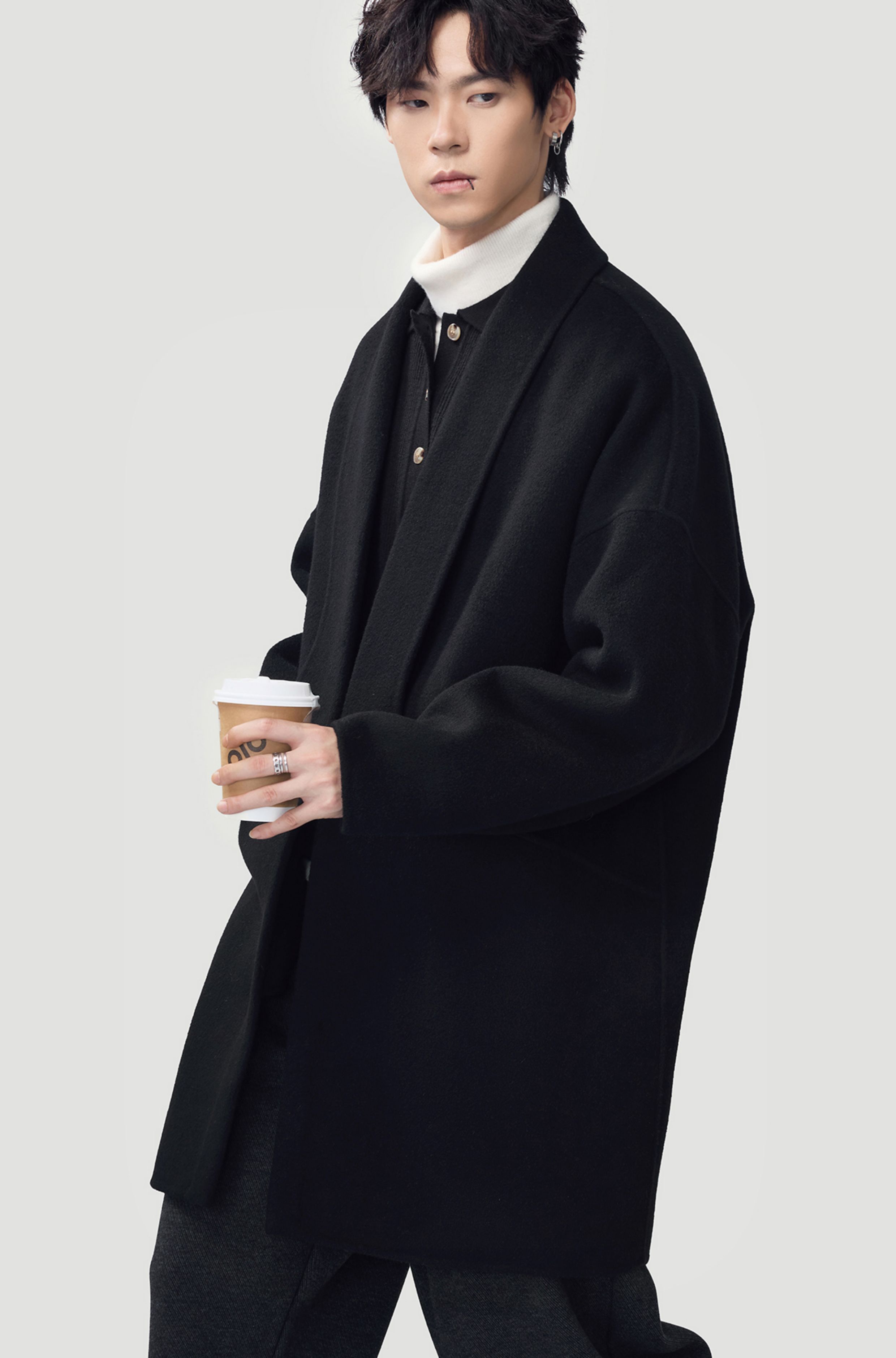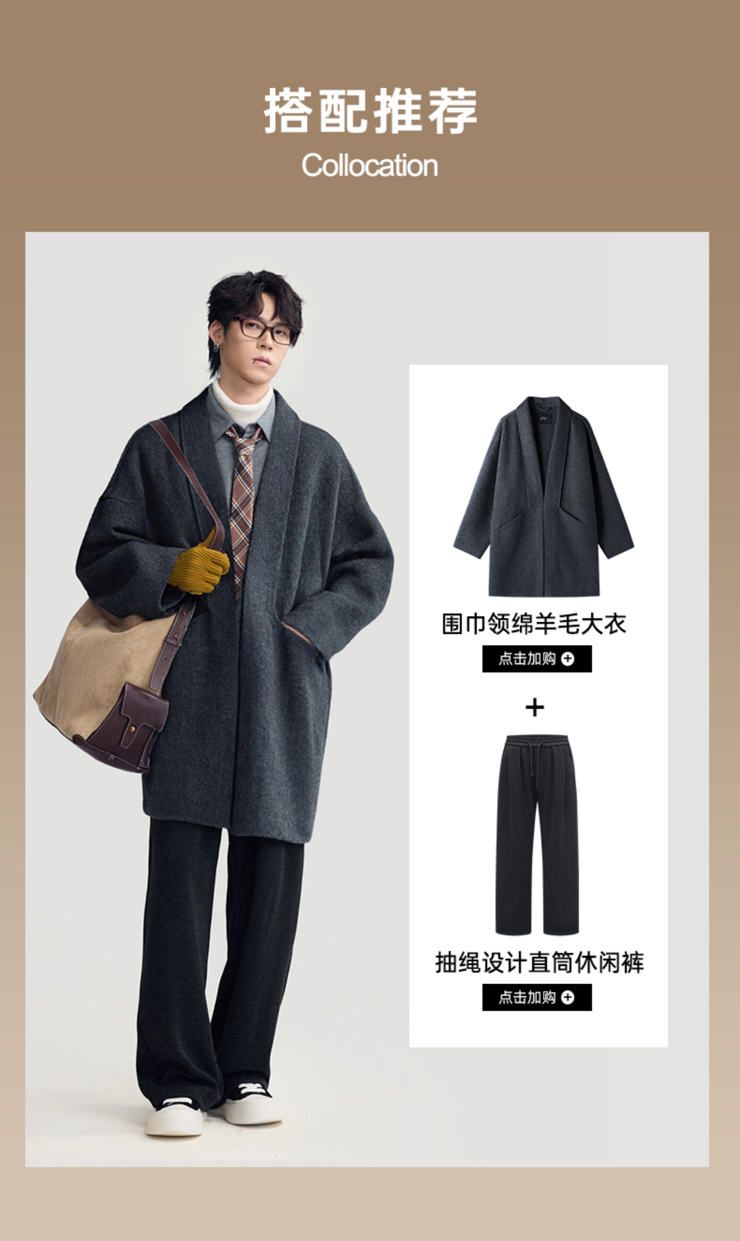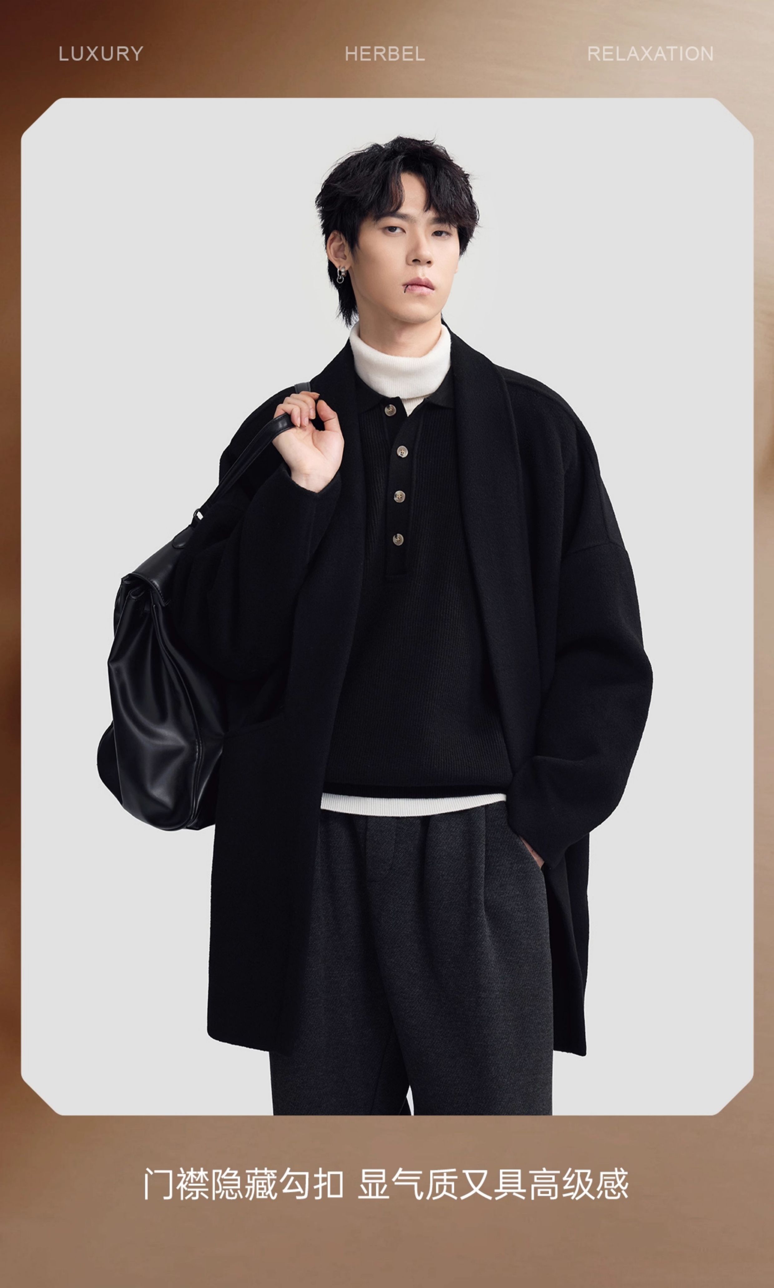 Herbel/Black and White Scarf Collar Woolen Coat Men's 2025 Winter New Warm Wool Long Coat