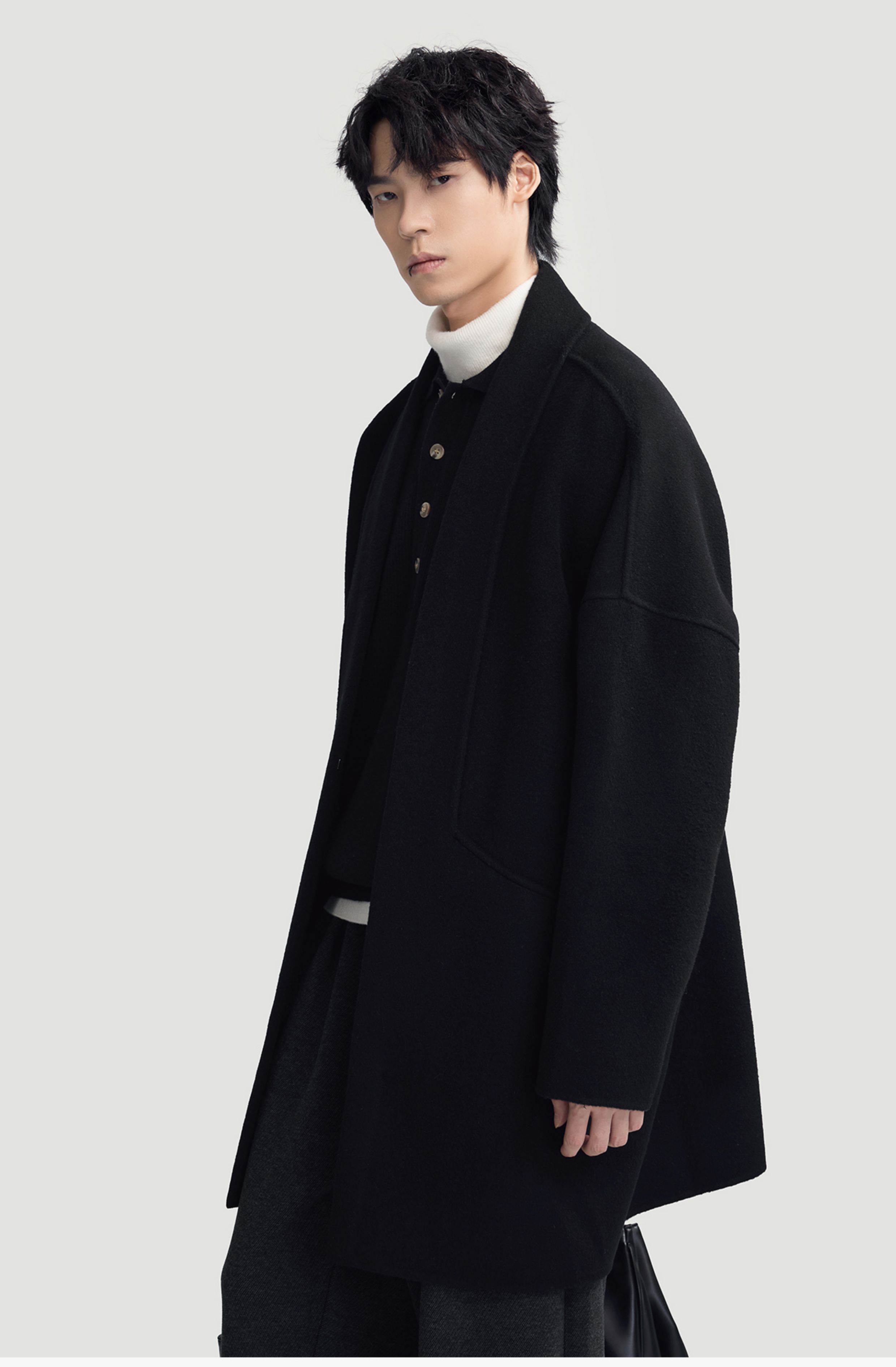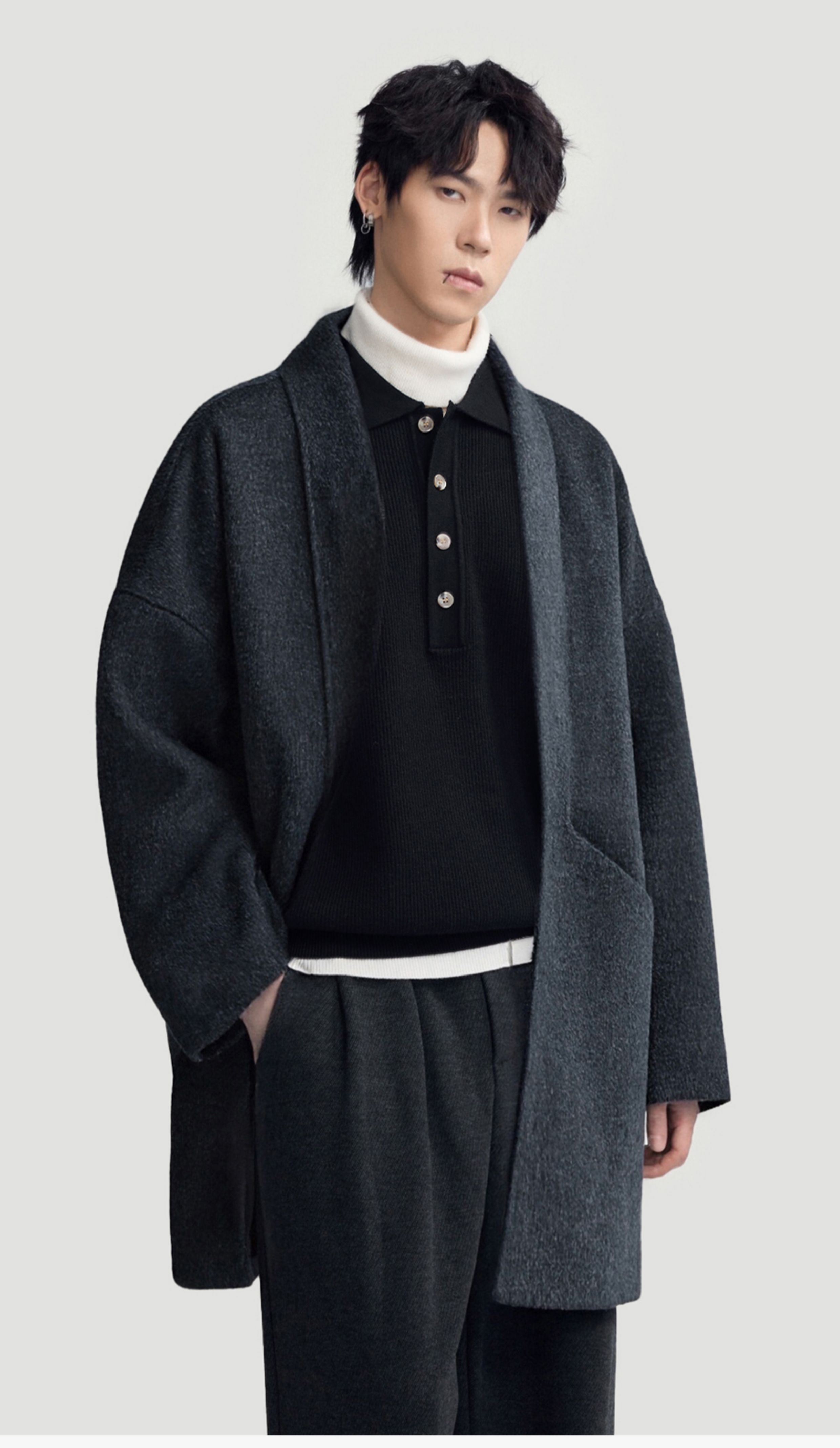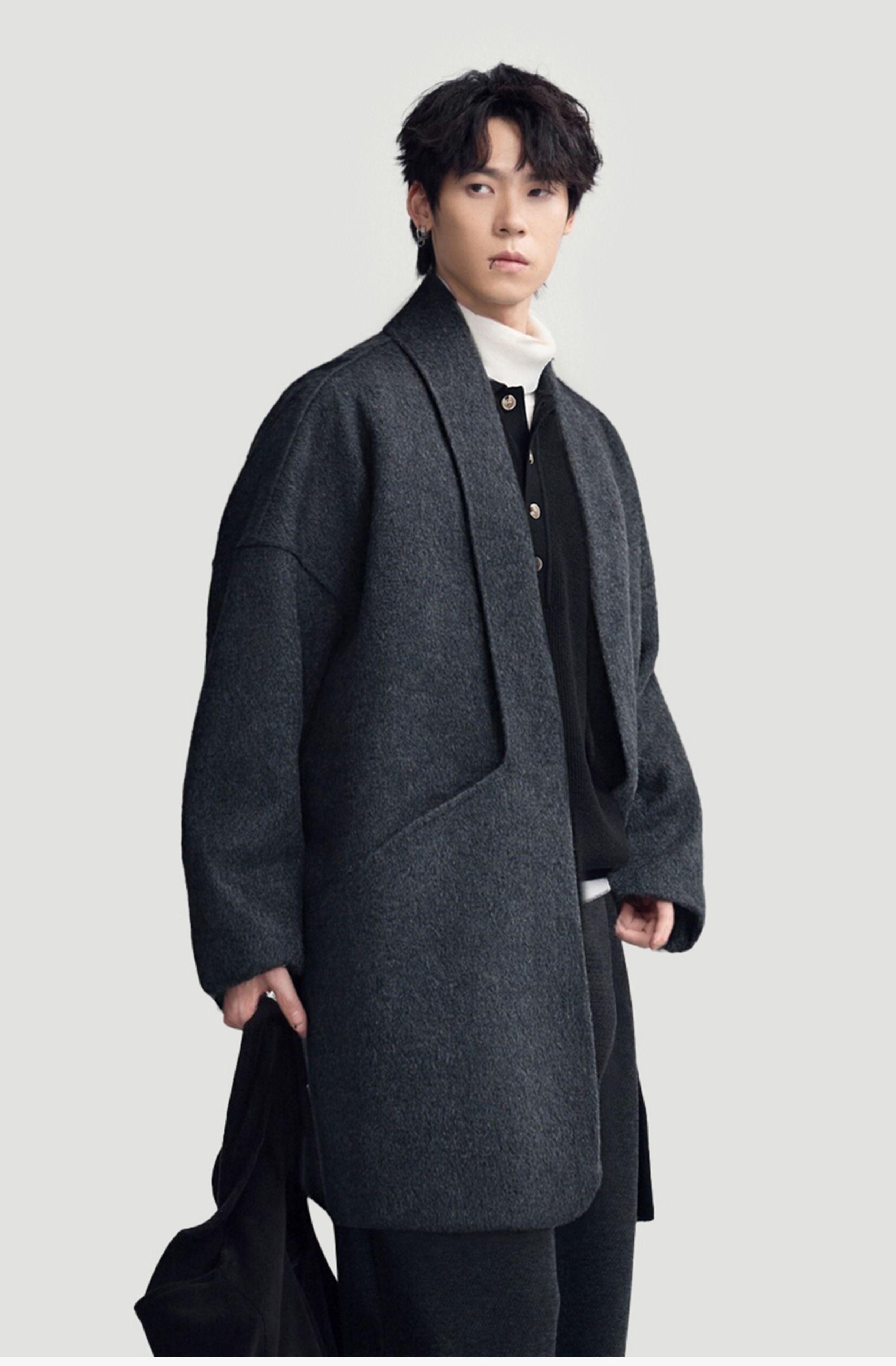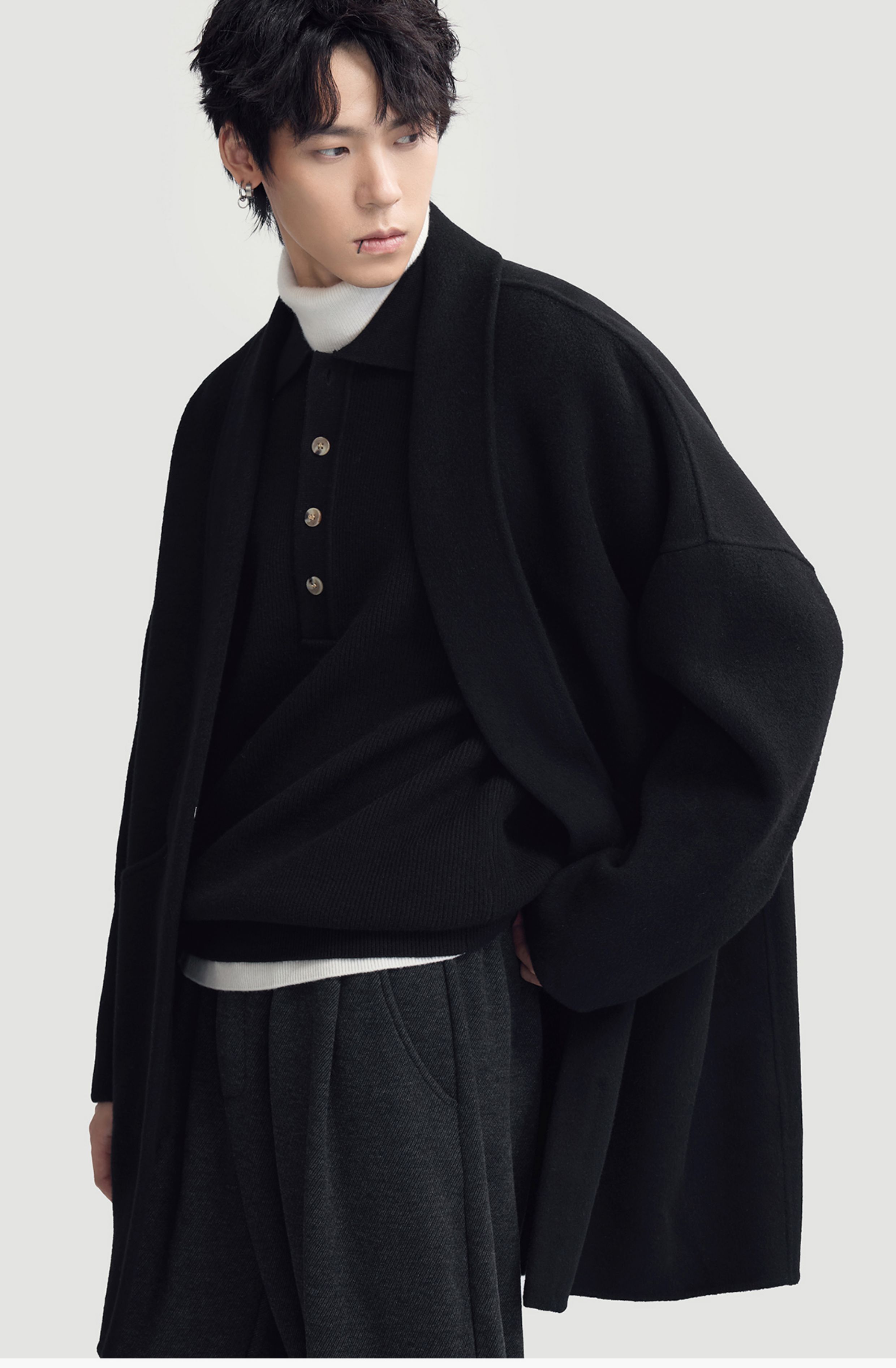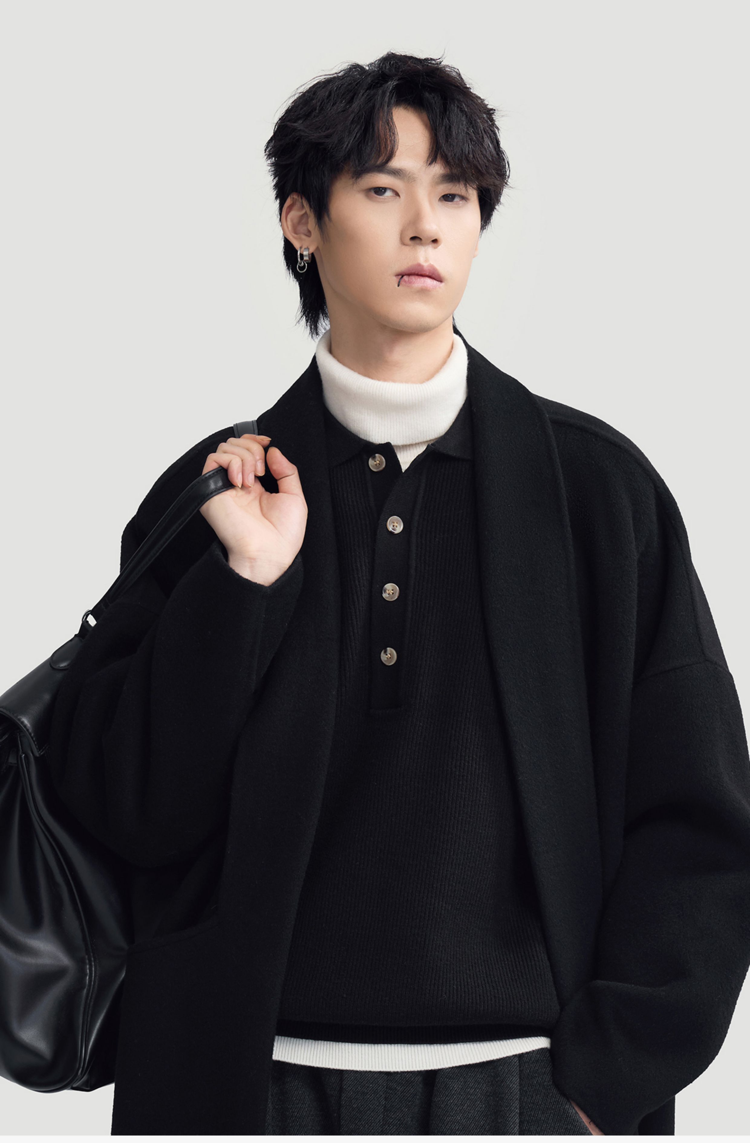 Herbel/Black and White Scarf Collar Woolen Coat Men's 2025 Winter New Warm Wool Long Coat
