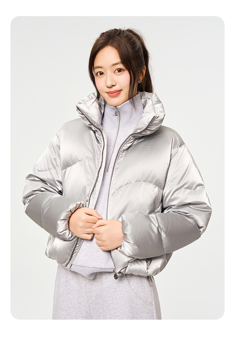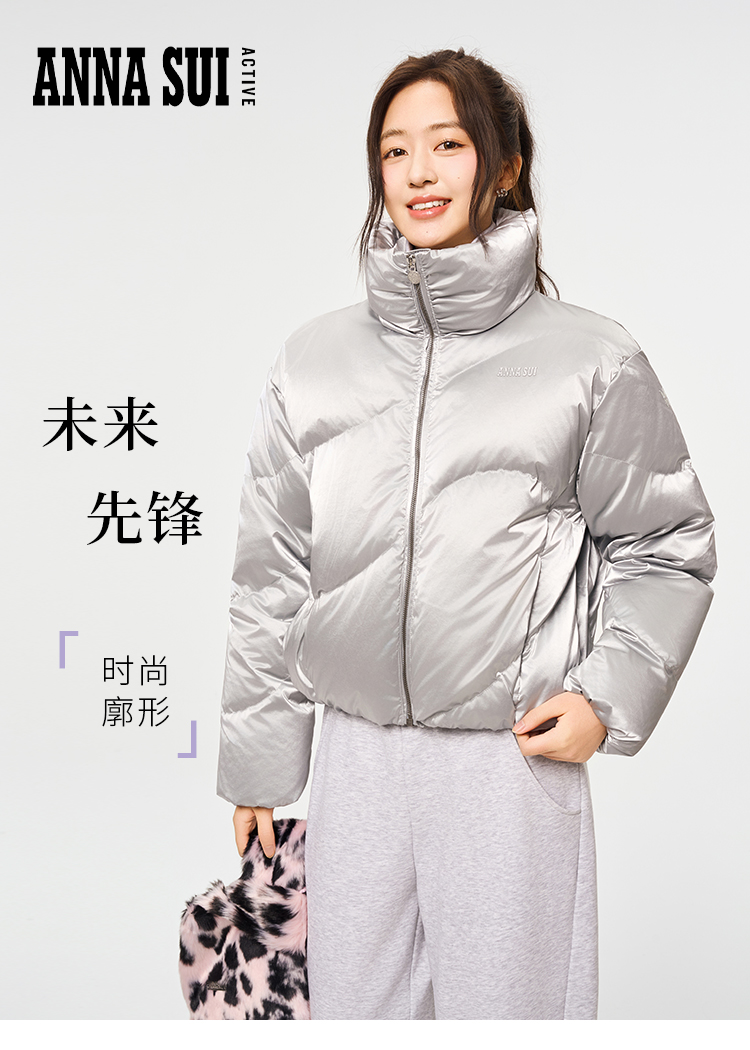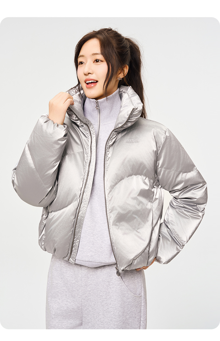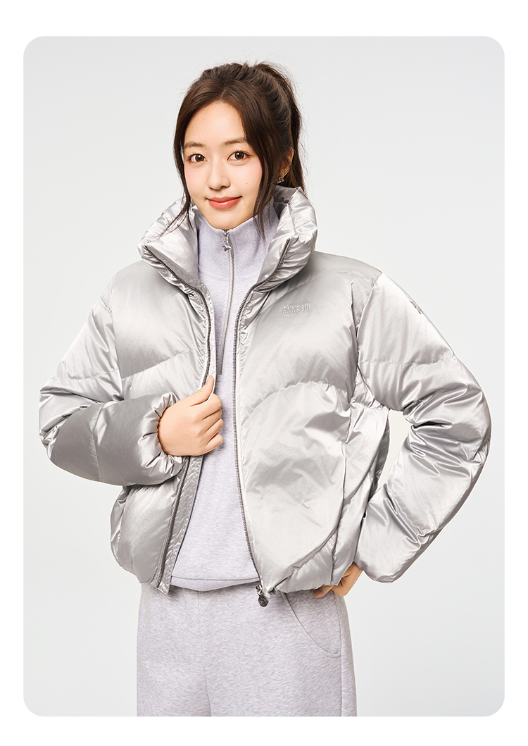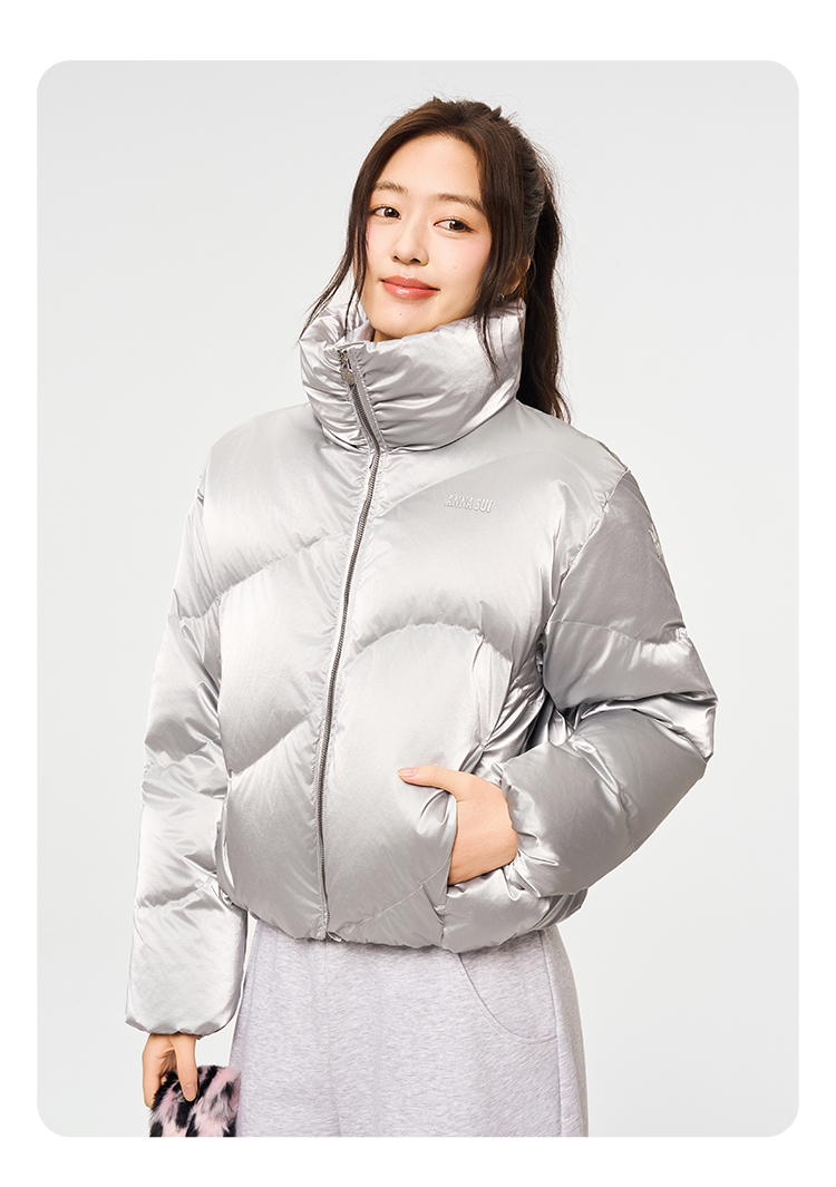Anna Sui Anna Su Sports Silver Stand-Up Collar Short Puffer Jacket Fashionable down Jacket with Drawstring Hem Soft