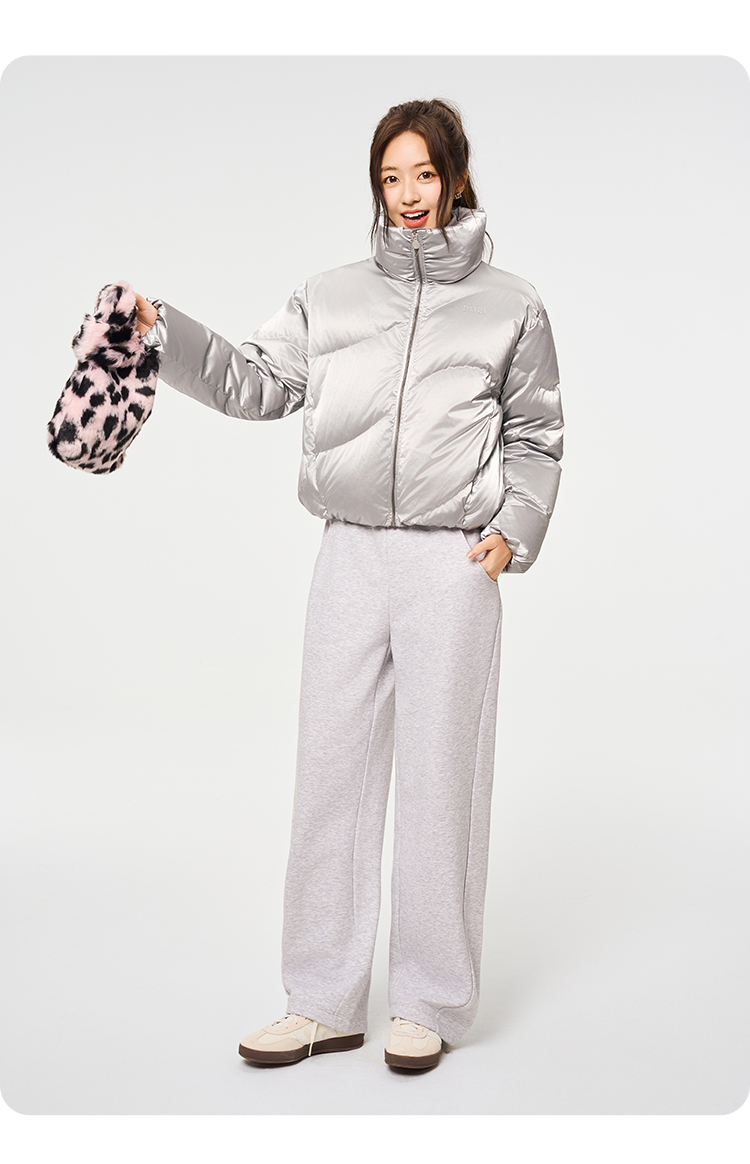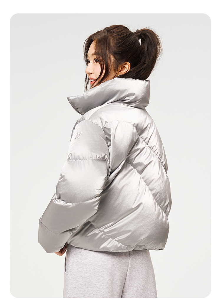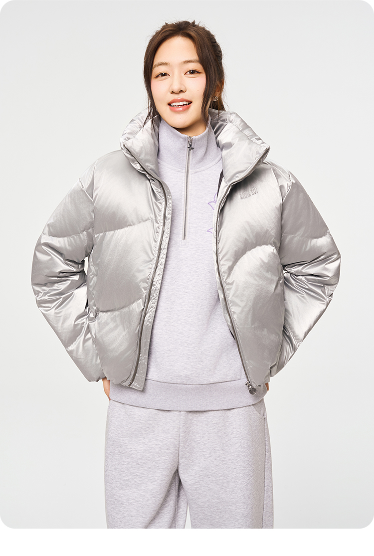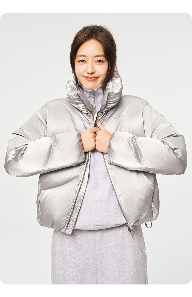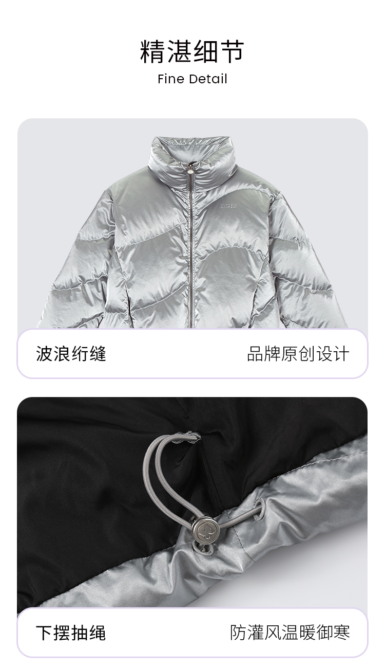 Anna Sui Anna Su Sports Silver Stand-Up Collar Short Puffer Jacket Fashionable down Jacket with Drawstring Hem Soft