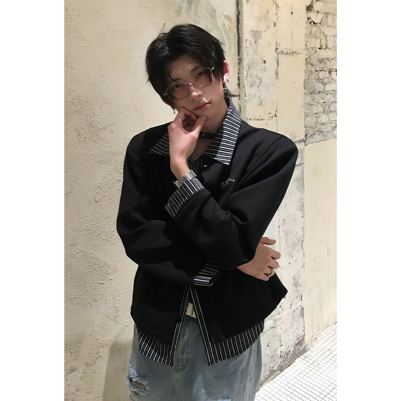 Cleanfit Fake Two-Piece Striped Patchwork Shirt Sweatshirt Men's Turn-Down Collar High-End Shirt Cool Cardigan Jacket