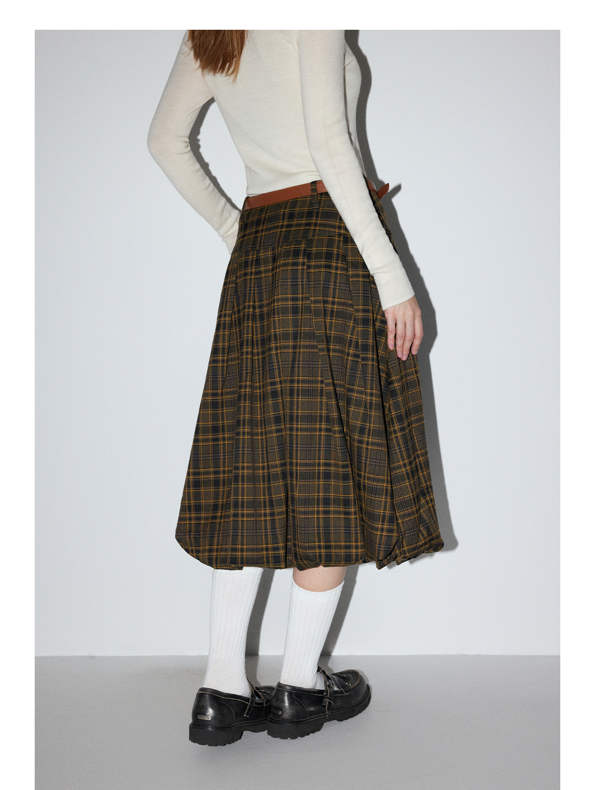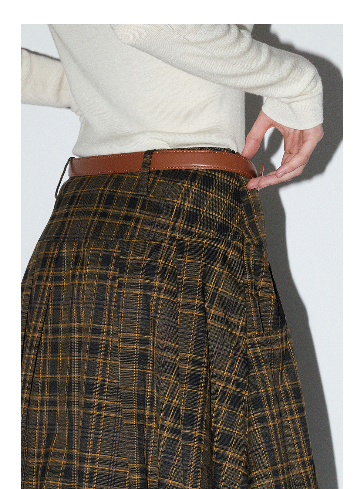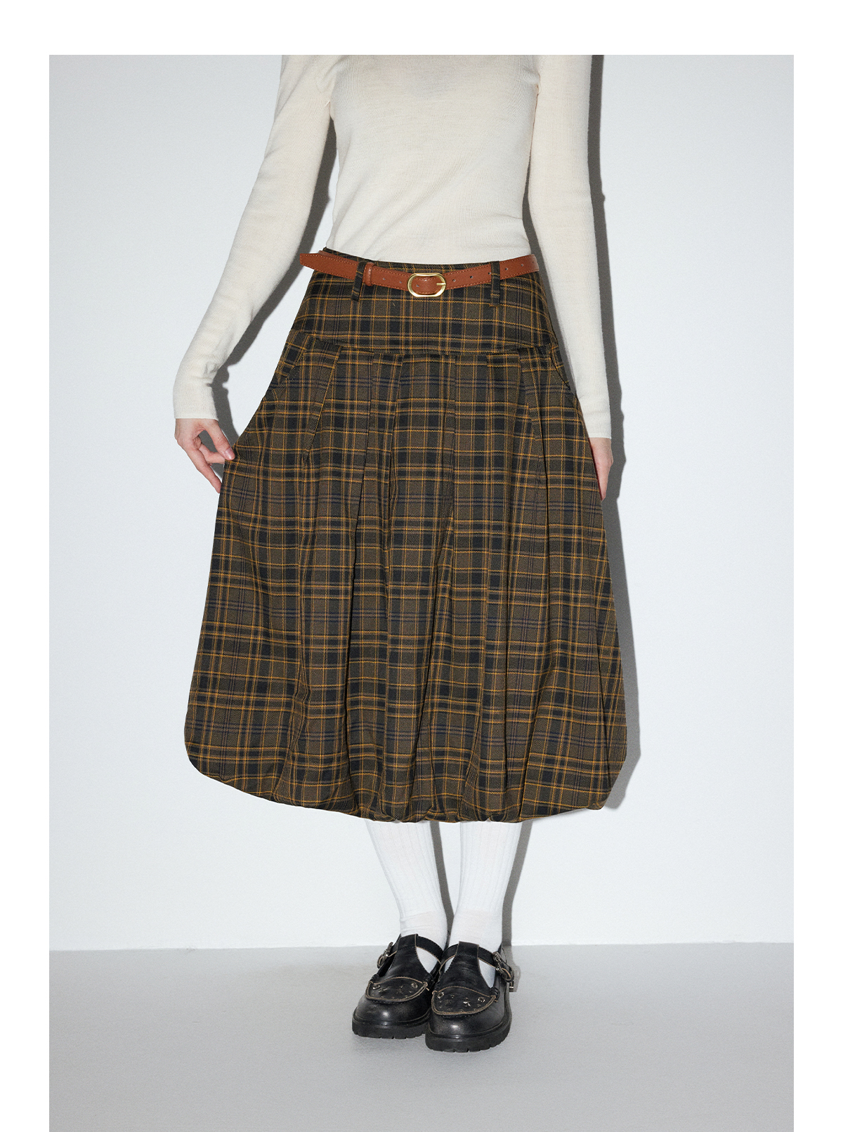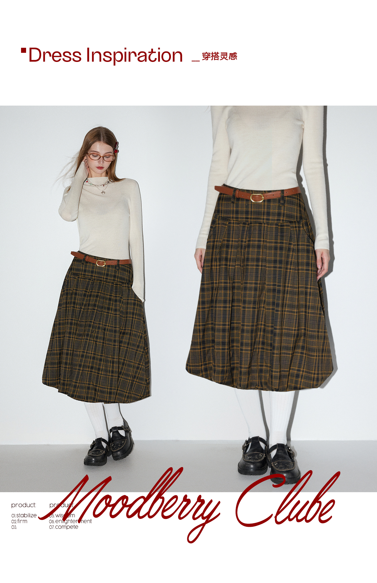 Moodberry American Retro Brown Plaid Skirt for Women in Autumn and Winter High-Waisted Mid-Length A-Line Flower Bud Skirt
