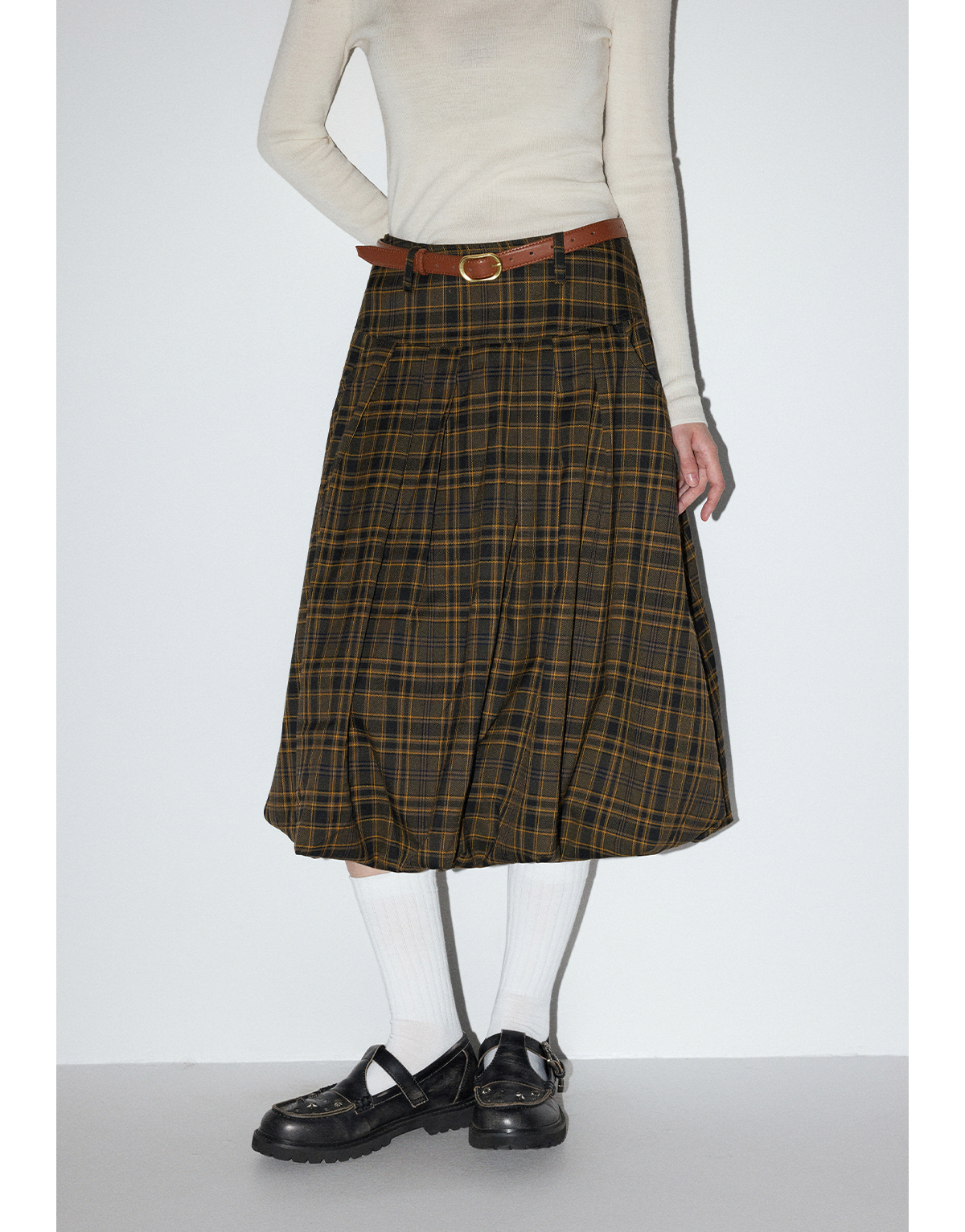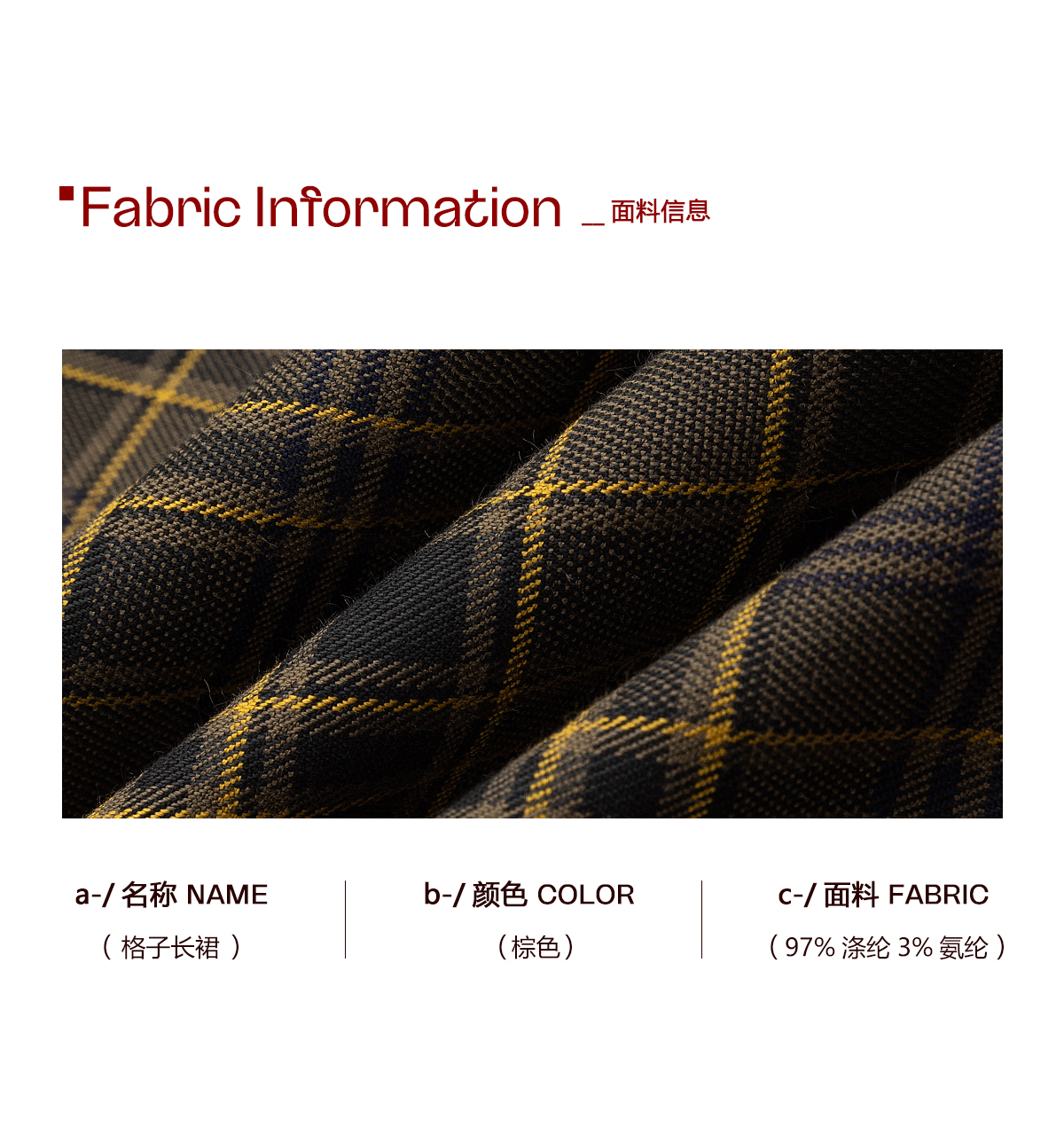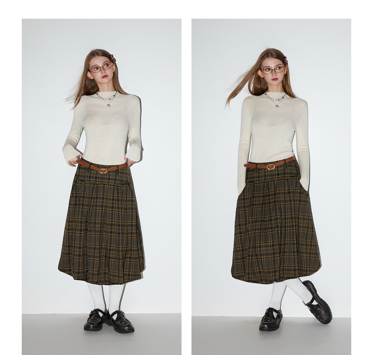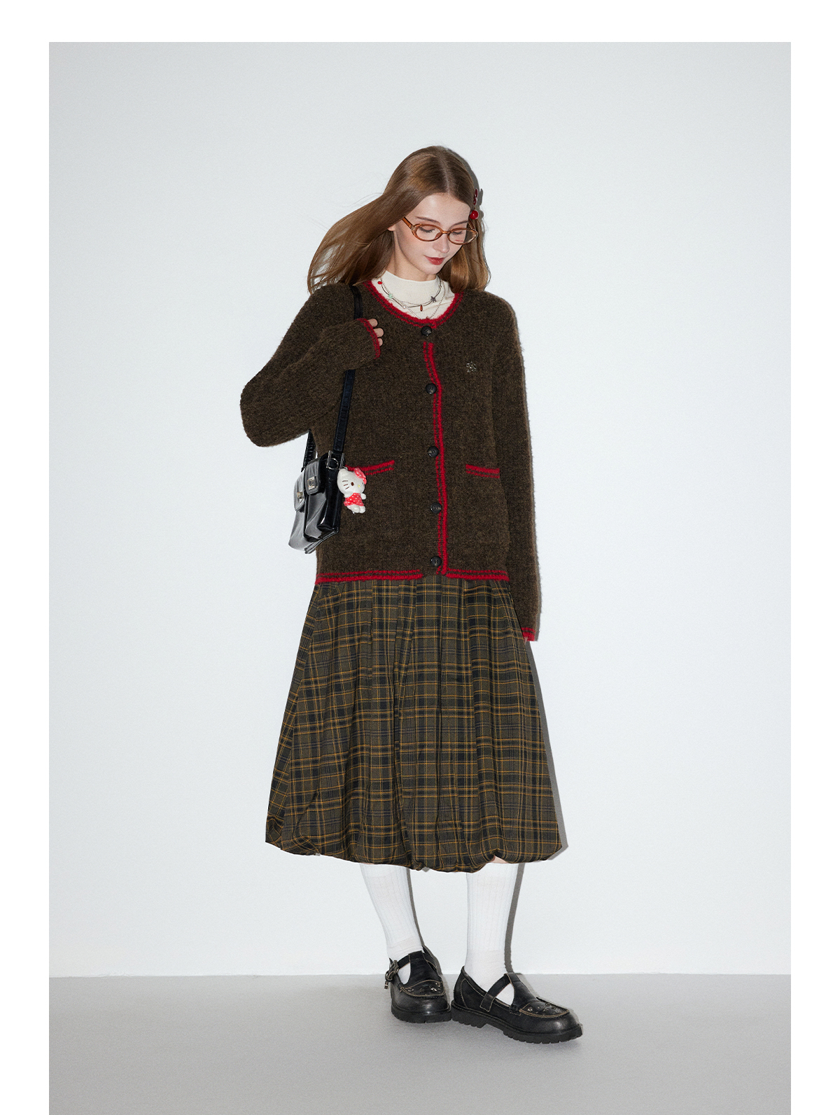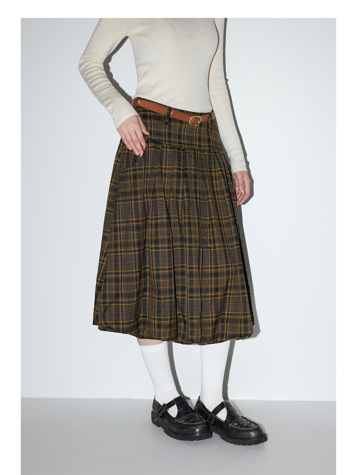 Moodberry American Retro Brown Plaid Skirt for Women in Autumn and Winter High-Waisted Mid-Length A-Line Flower Bud Skirt