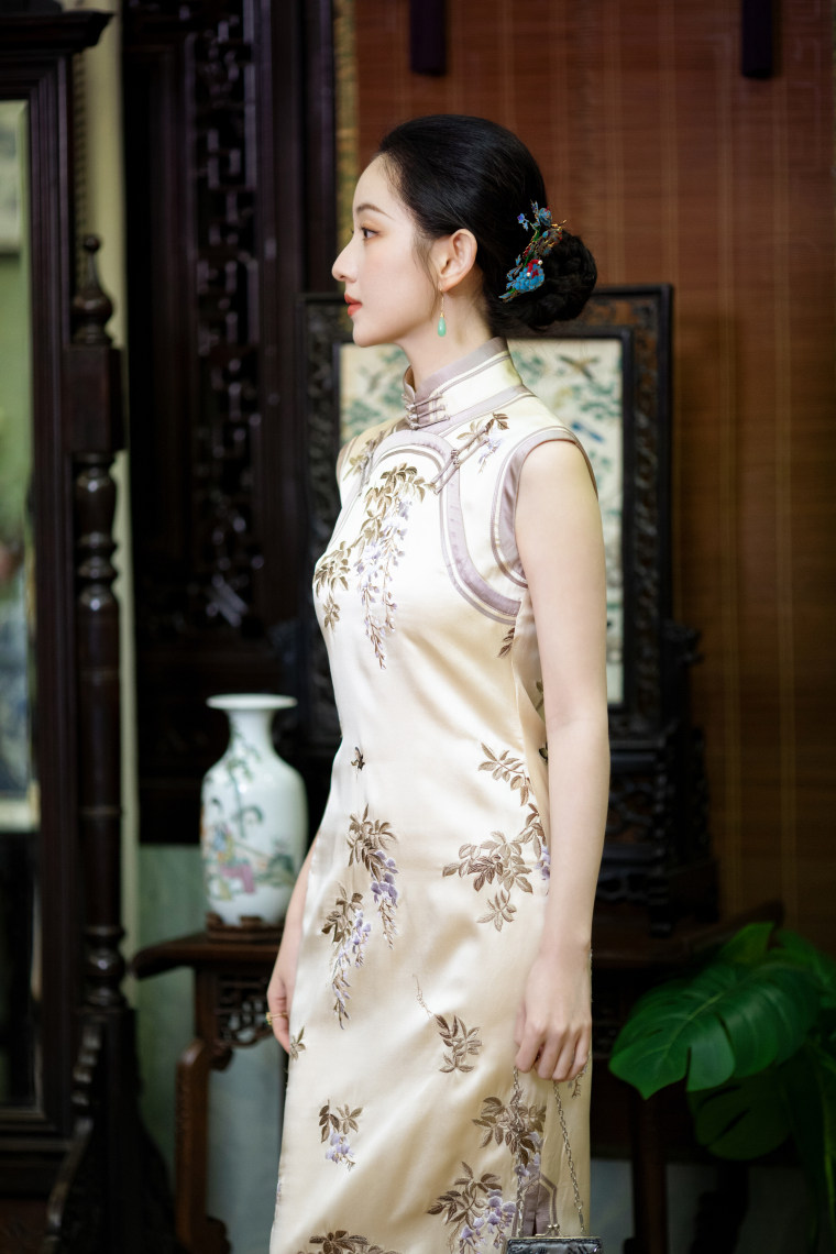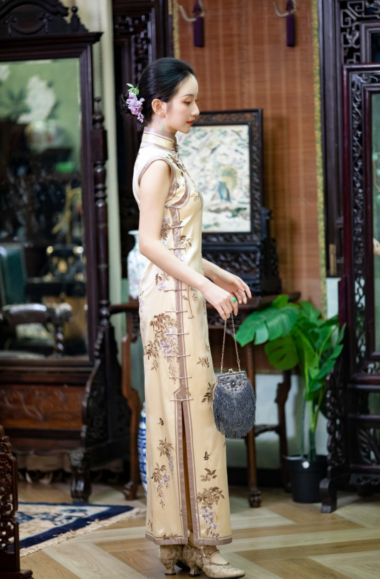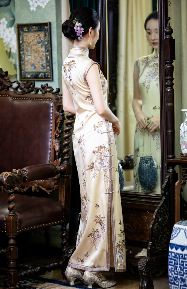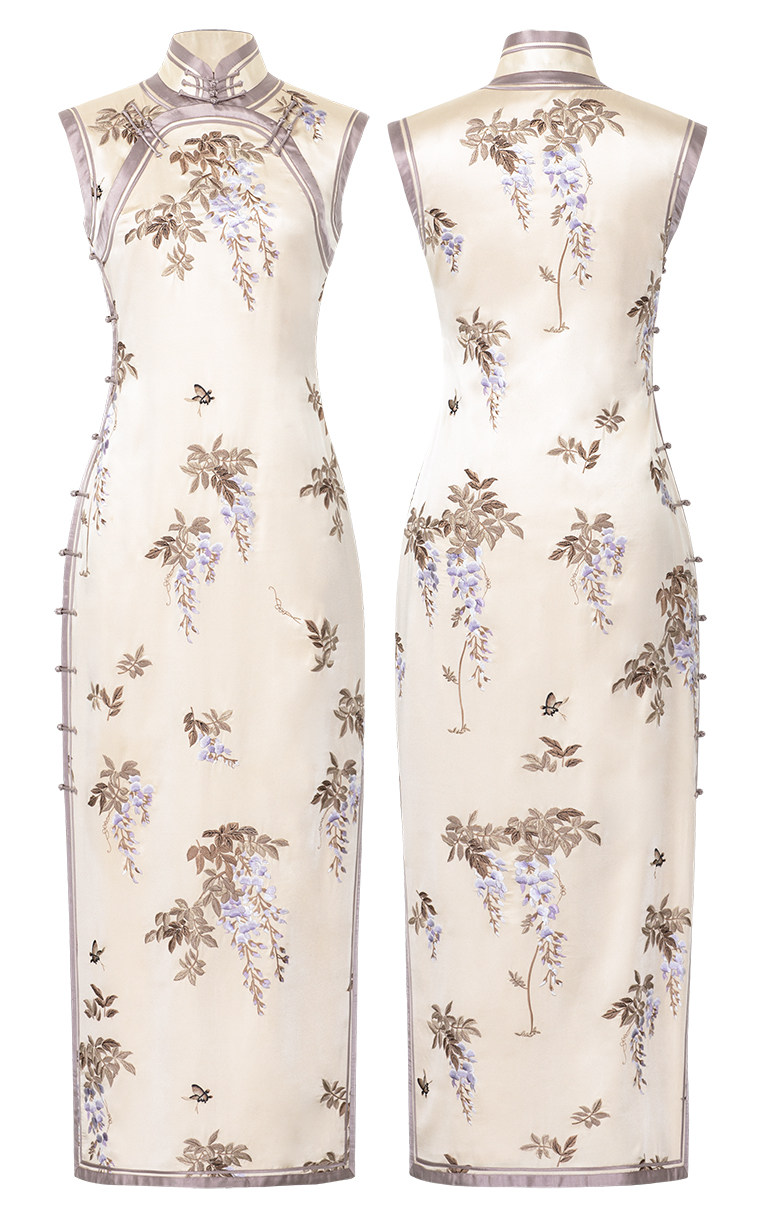 Purple Dream Cream | 2025 Autumn New Collection | Silk Satin Heavy Embroidery Sleeveless Slim Fit Stand Collar Chinese Style Cheongsam