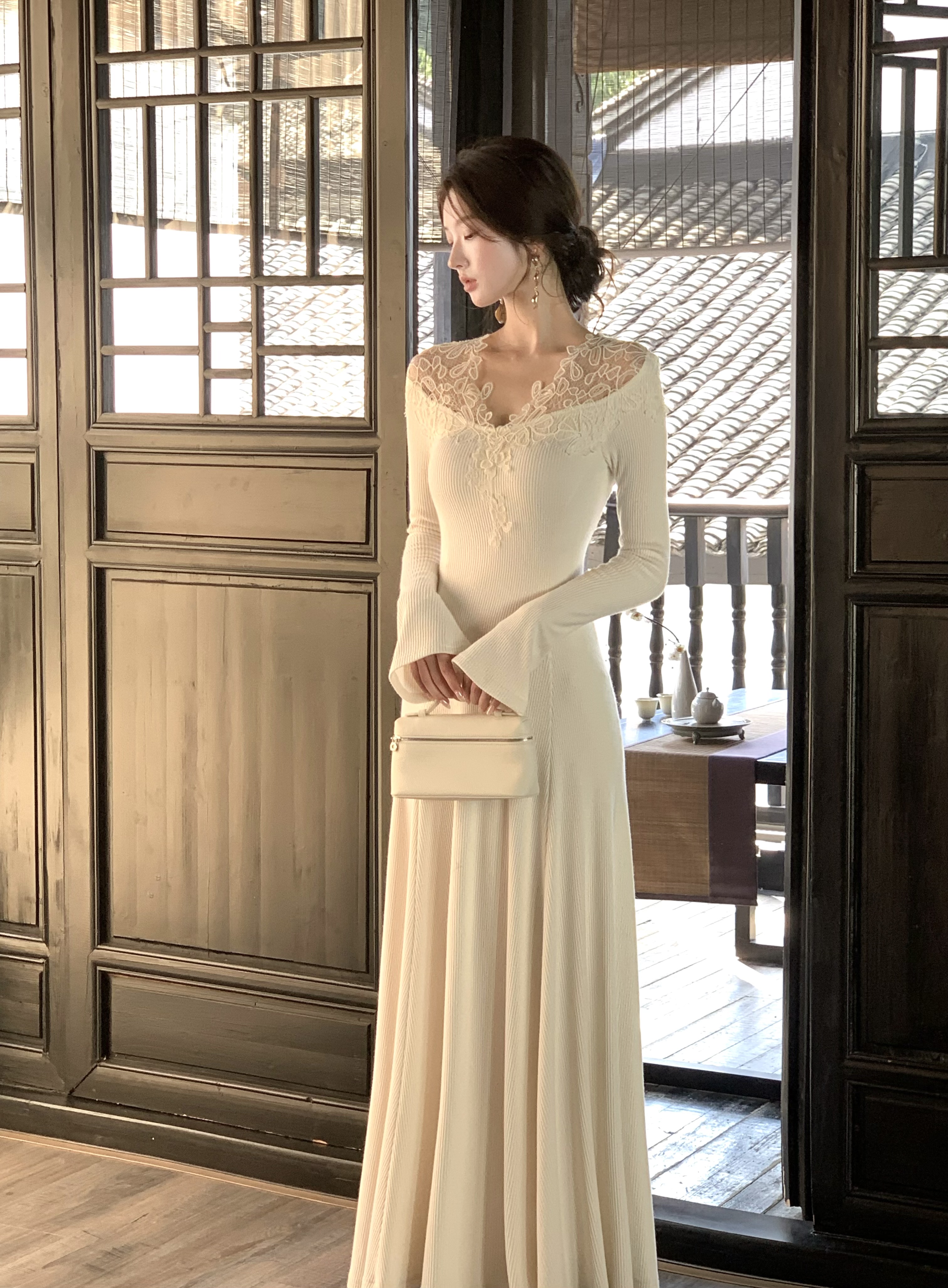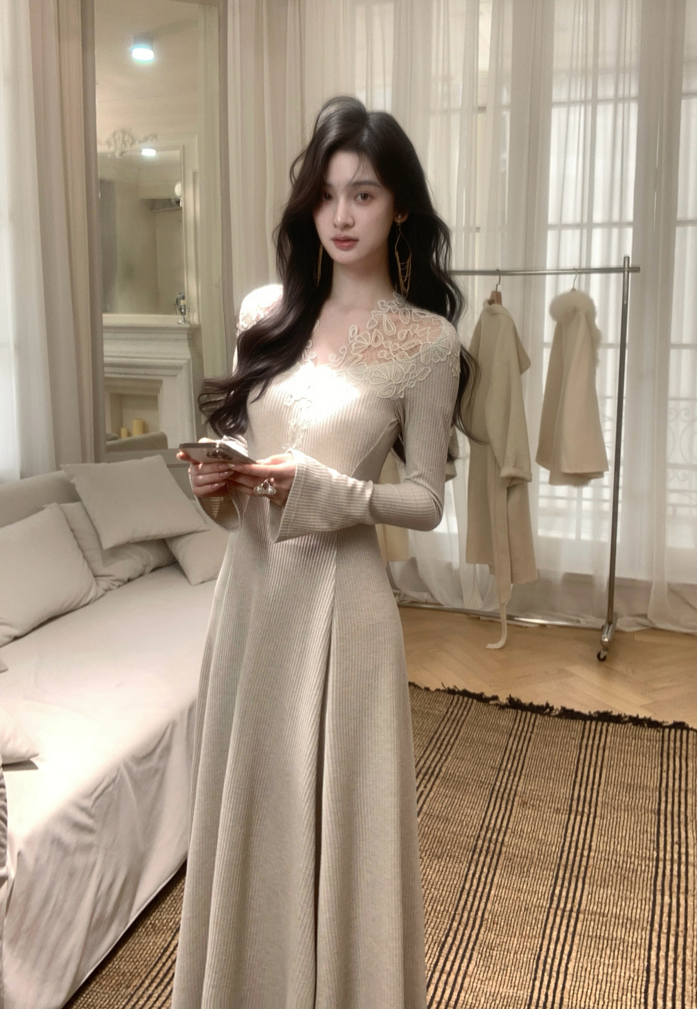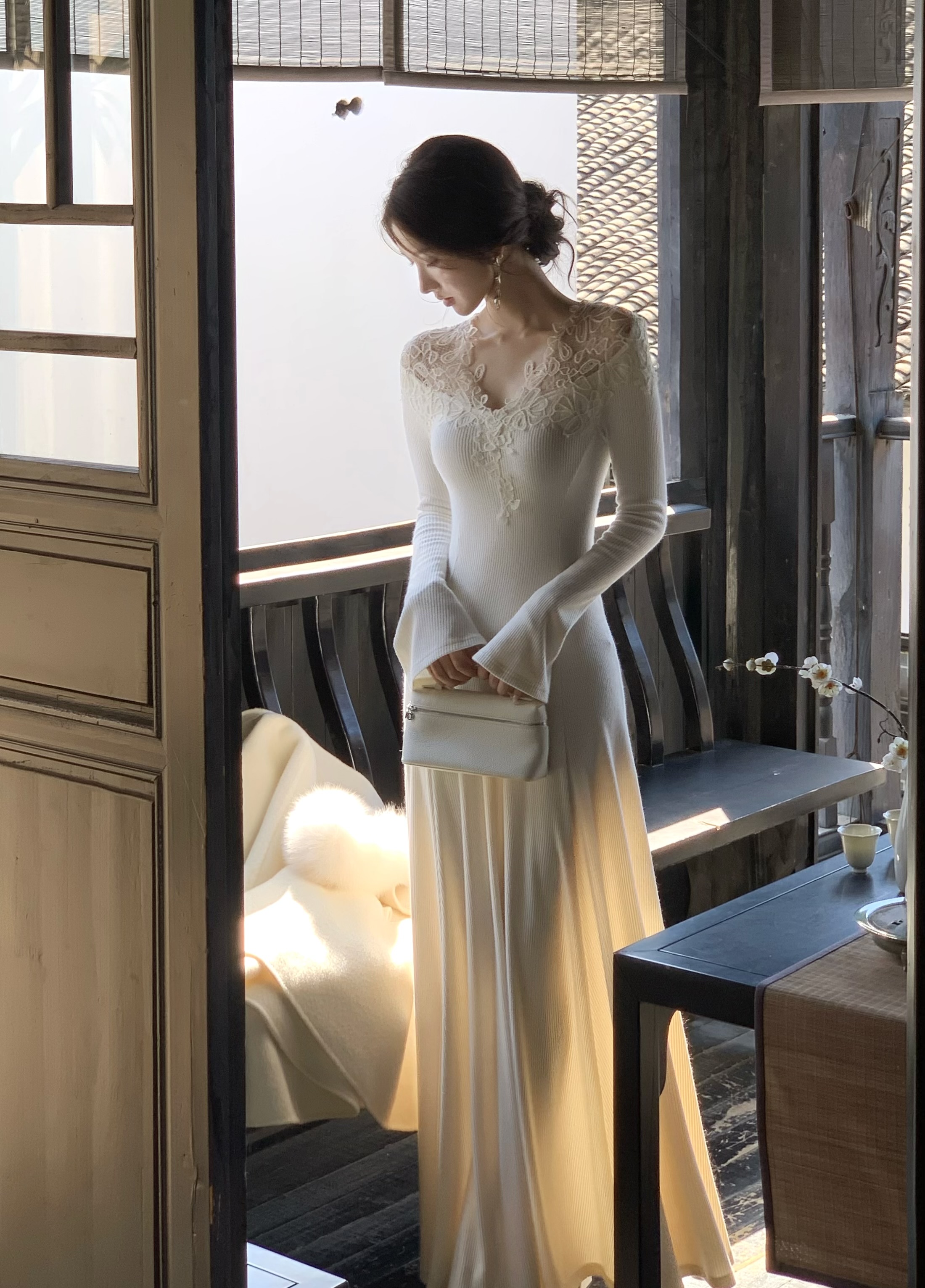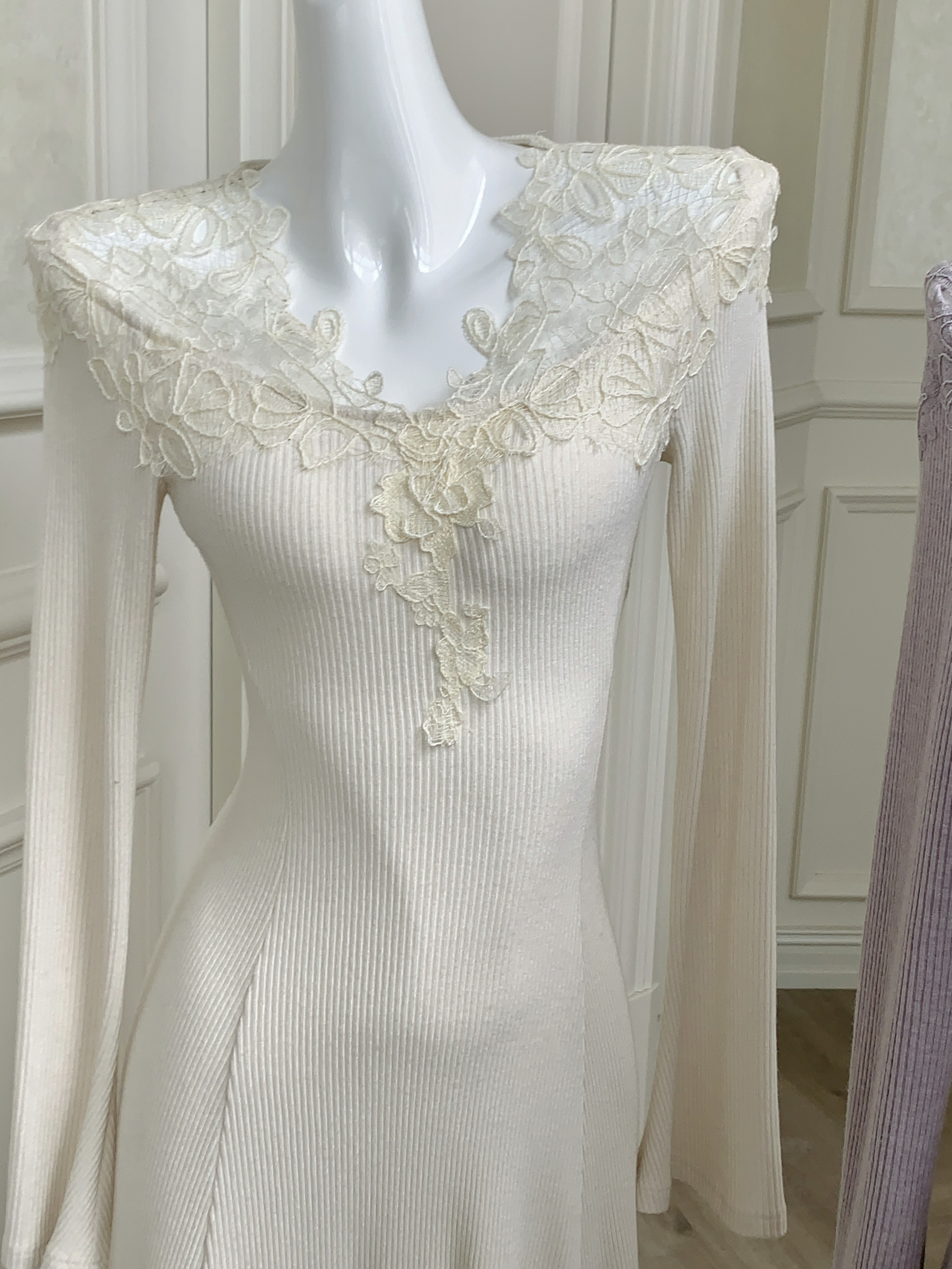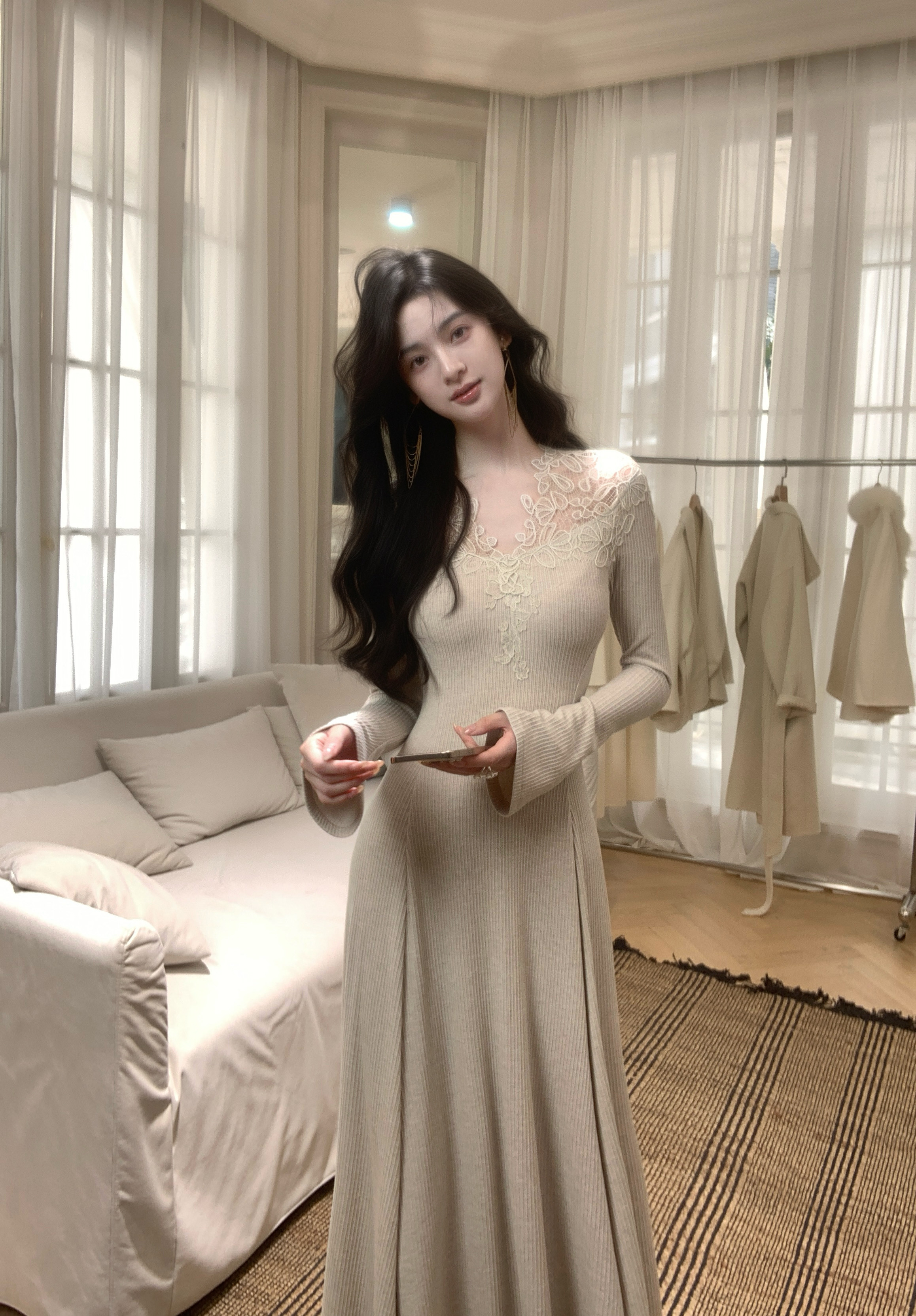 From a Moment of [Unfamiliarity] with the Snow, a Gentle and Atmospheric Lace V-Neck Knit Dress with a Waist-Cinching, Slimming A-Line Long Skirt