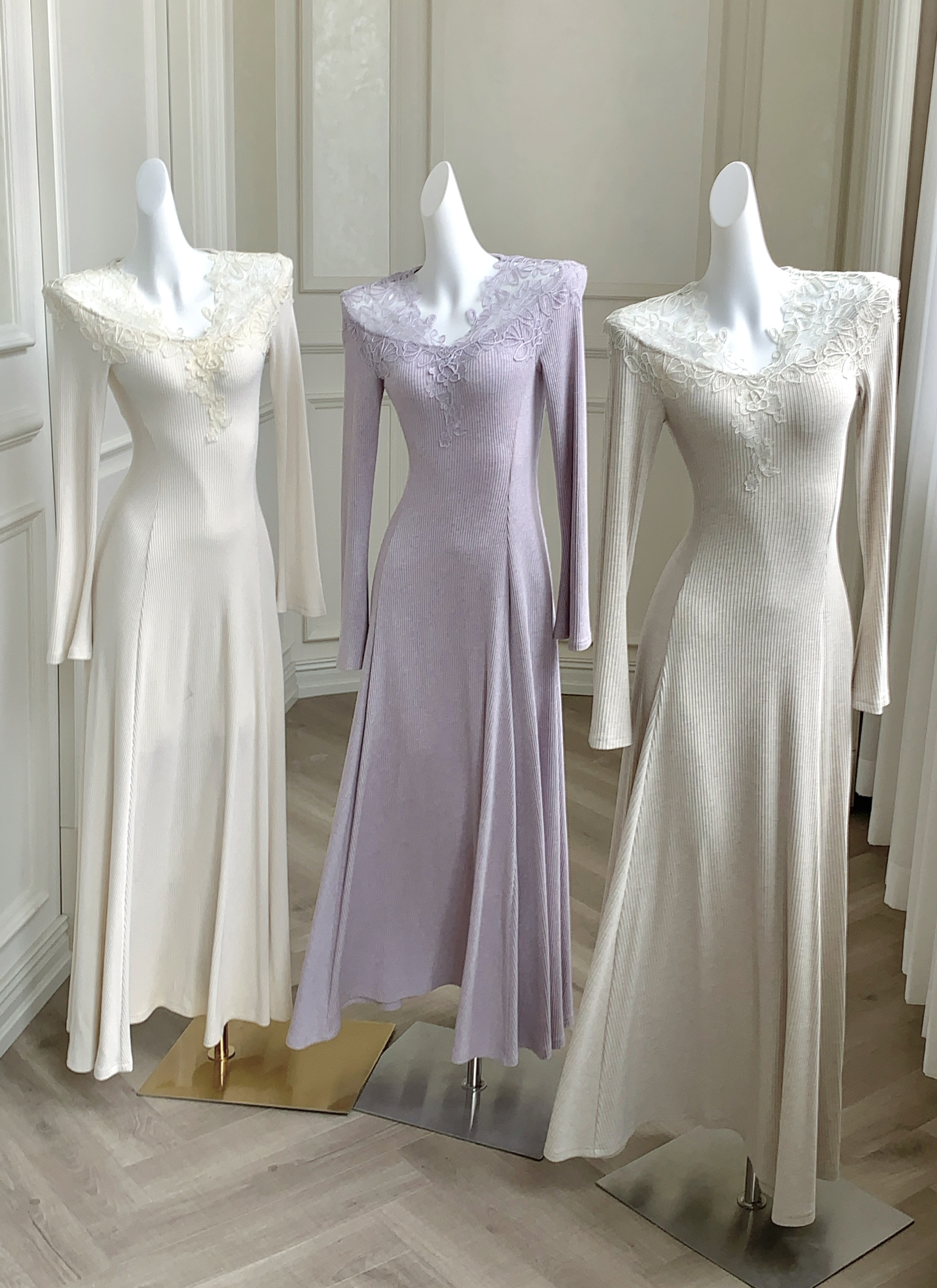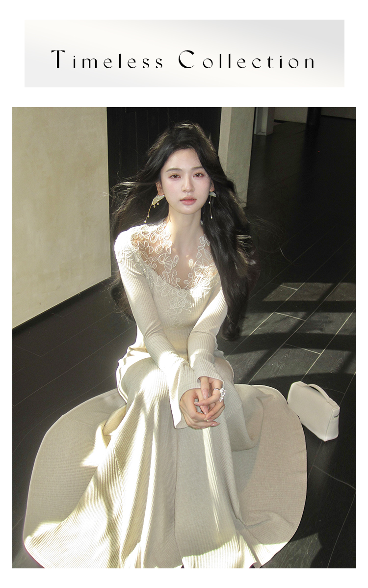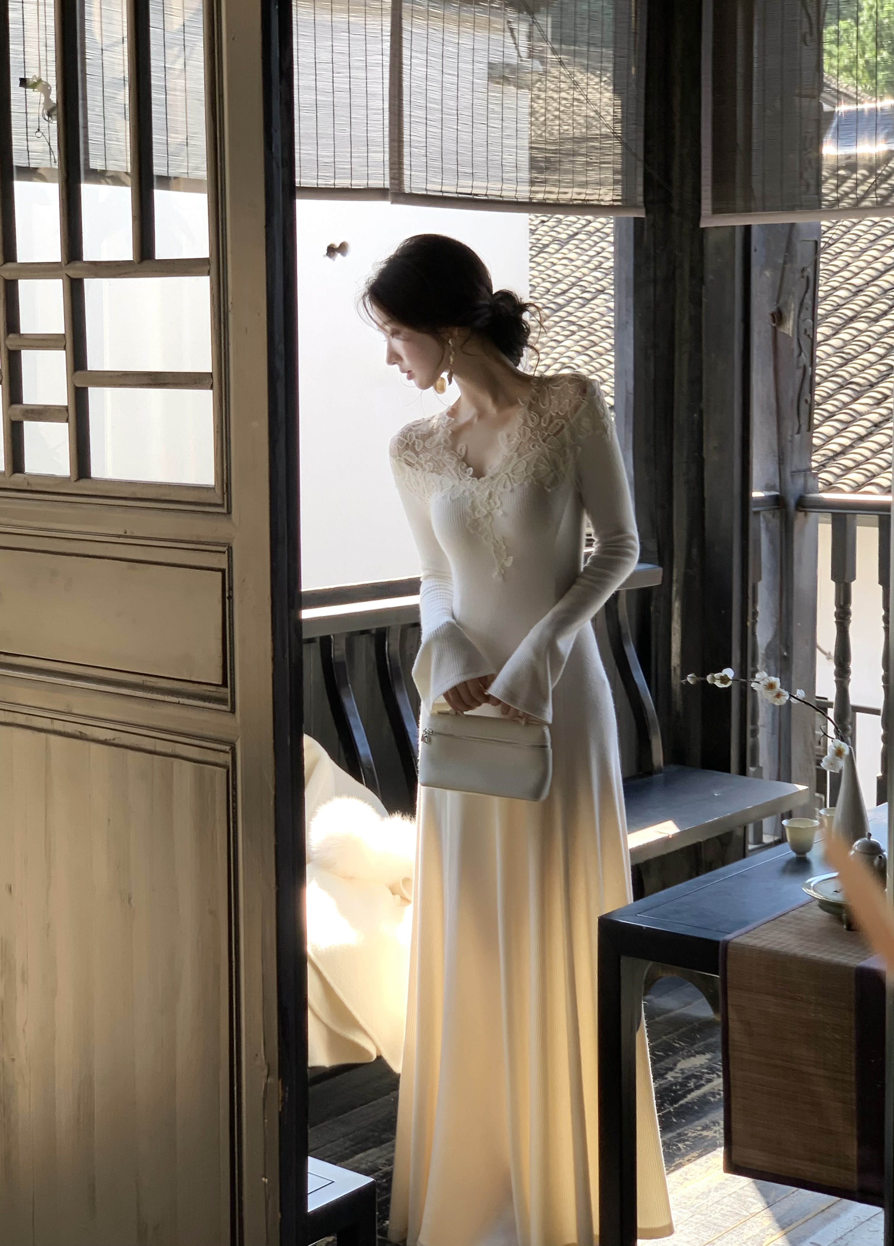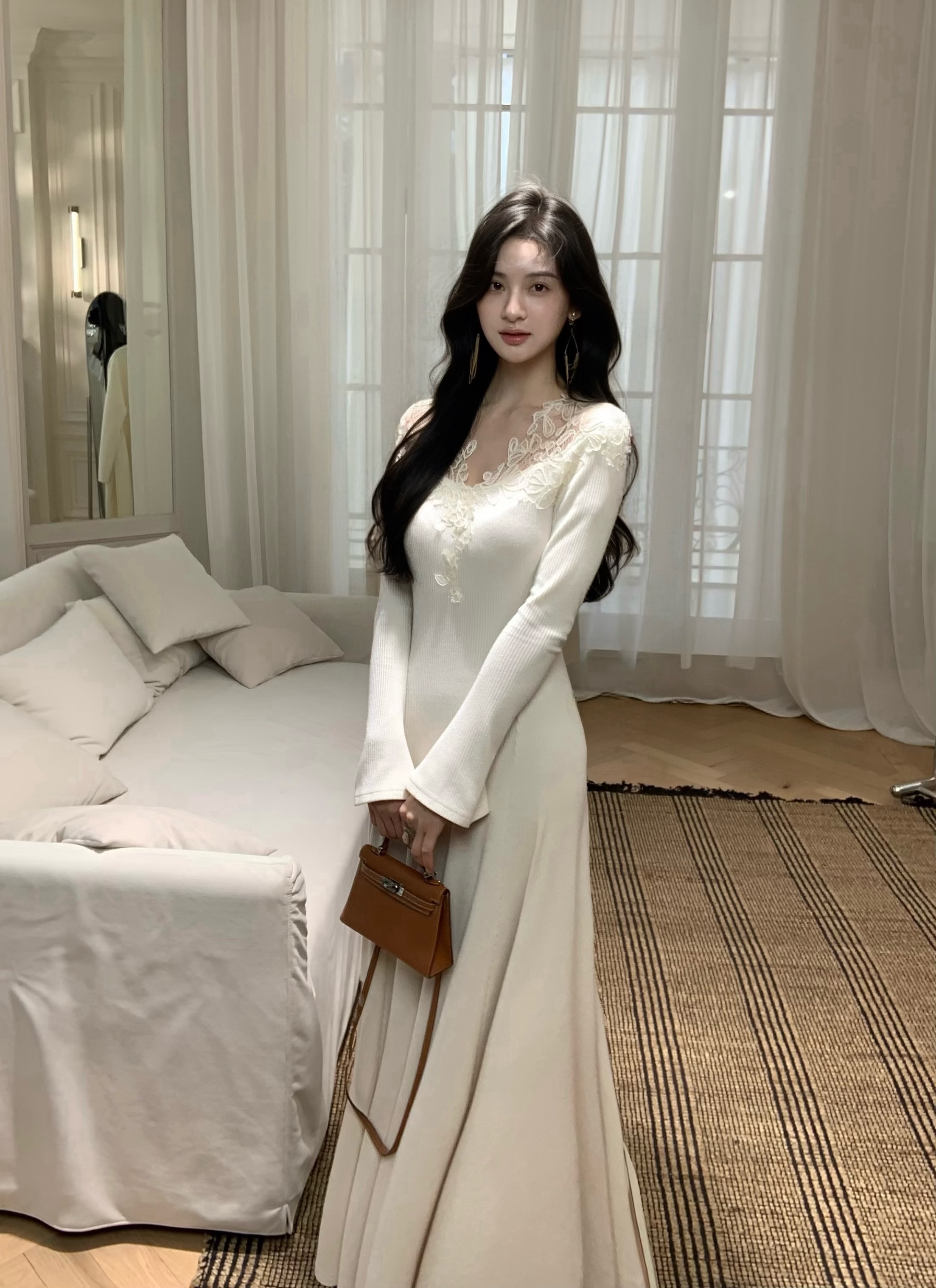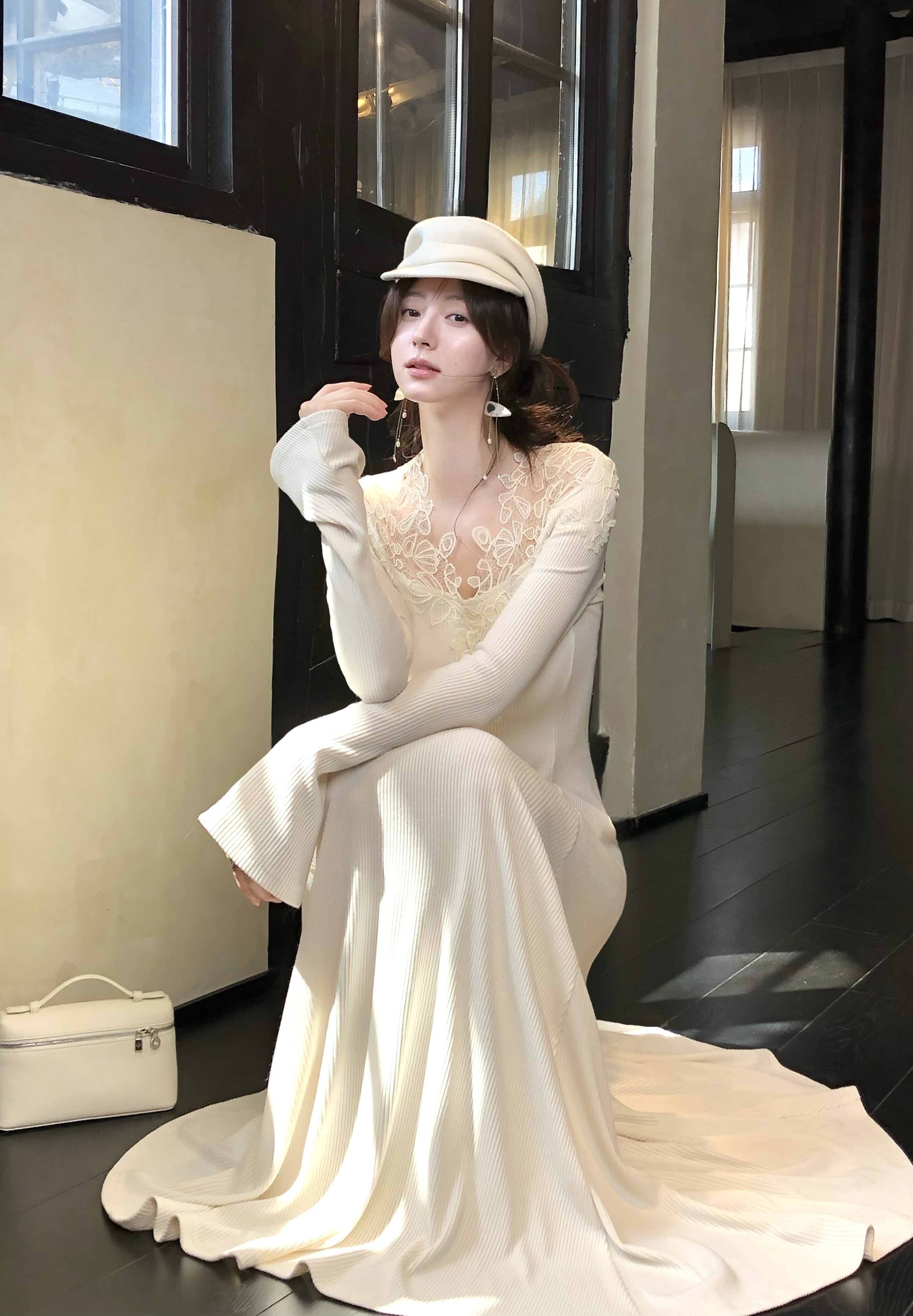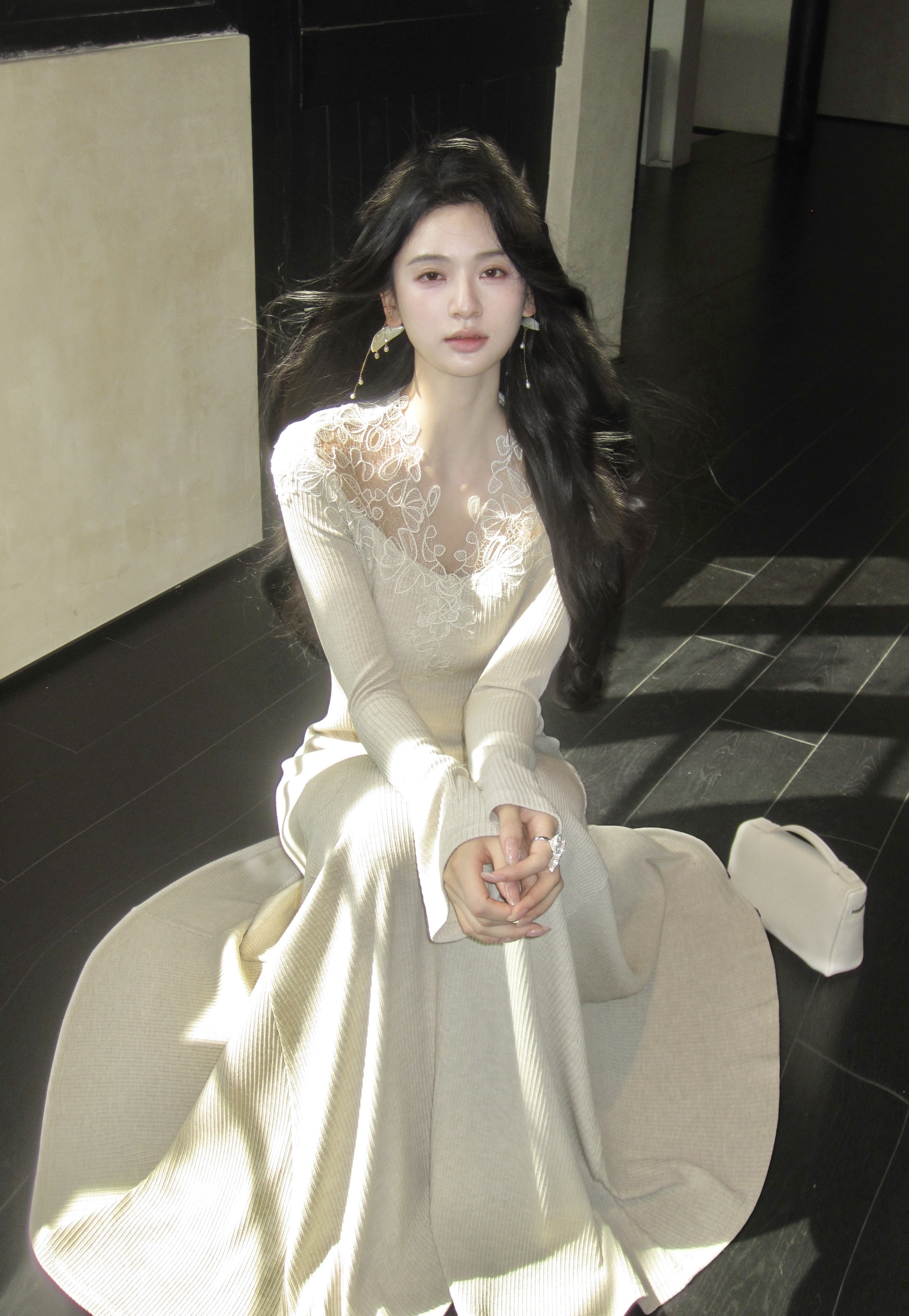 From a Moment of [Unfamiliarity] with the Snow, a Gentle and Atmospheric Lace V-Neck Knit Dress with a Waist-Cinching, Slimming A-Line Long Skirt