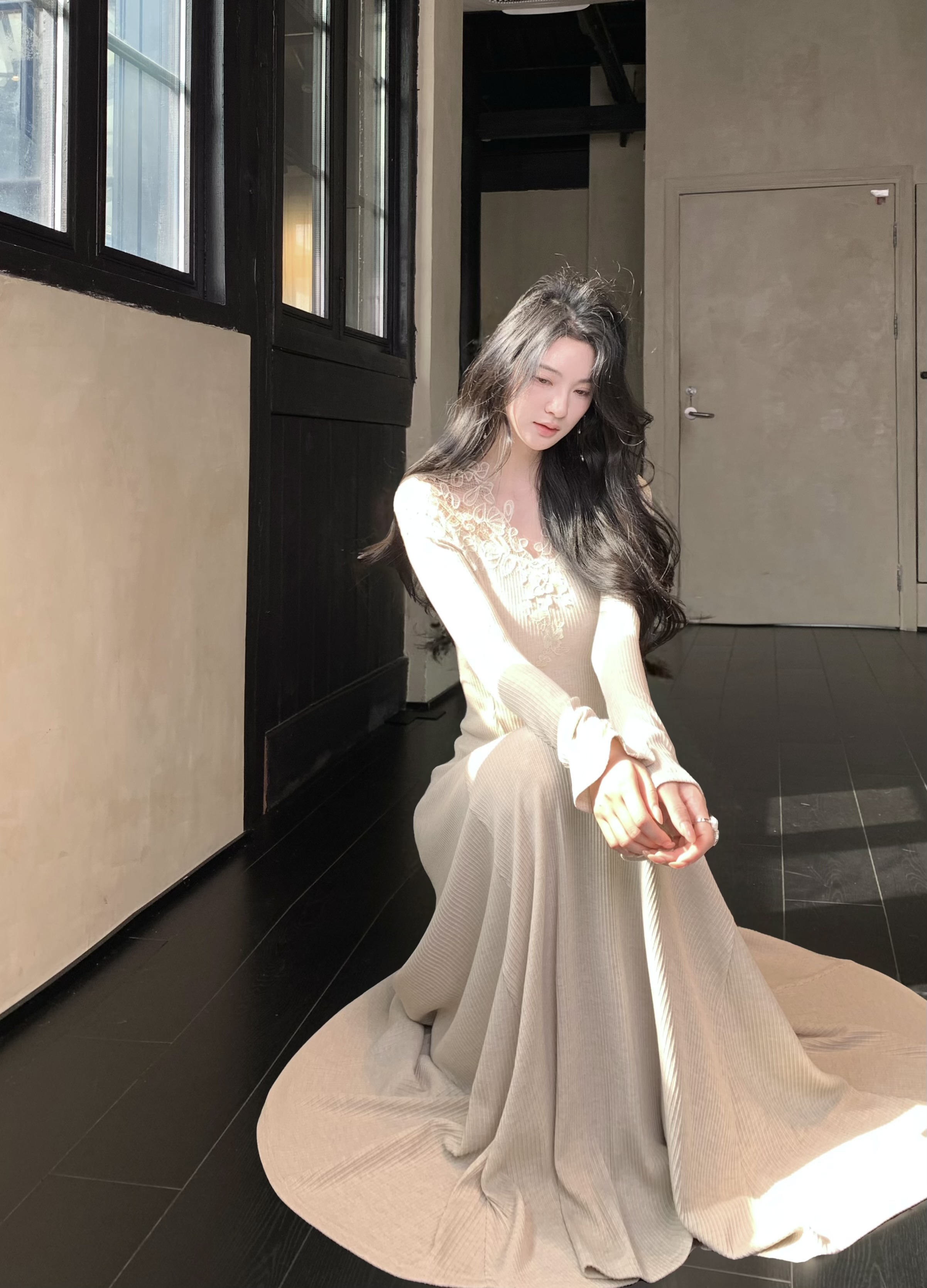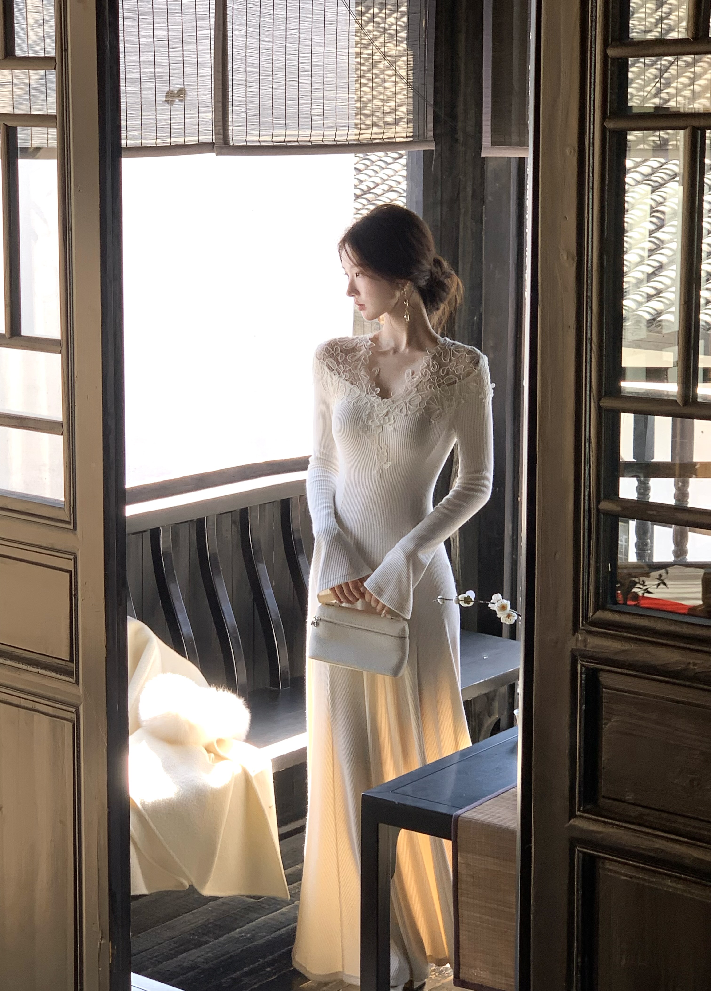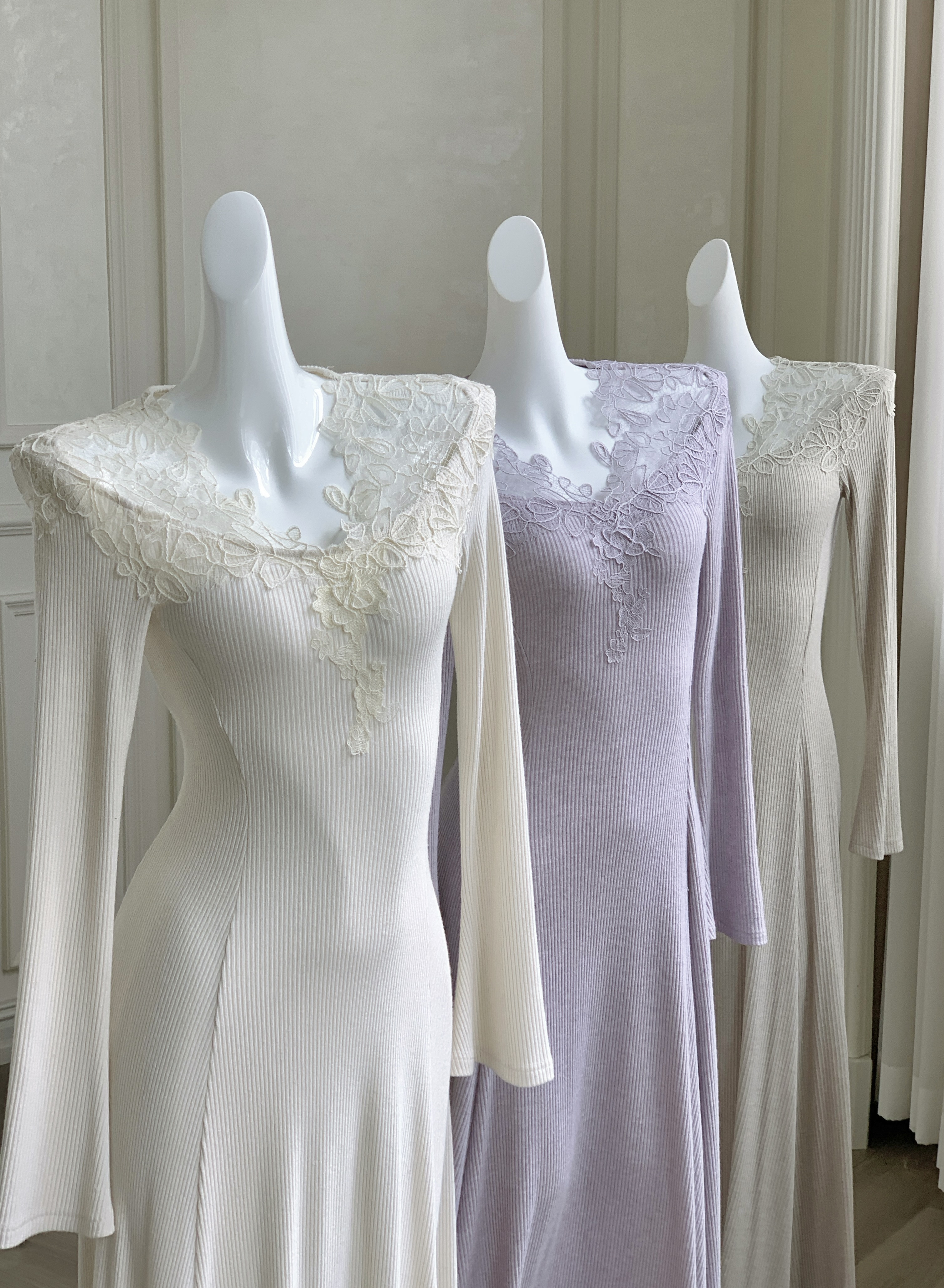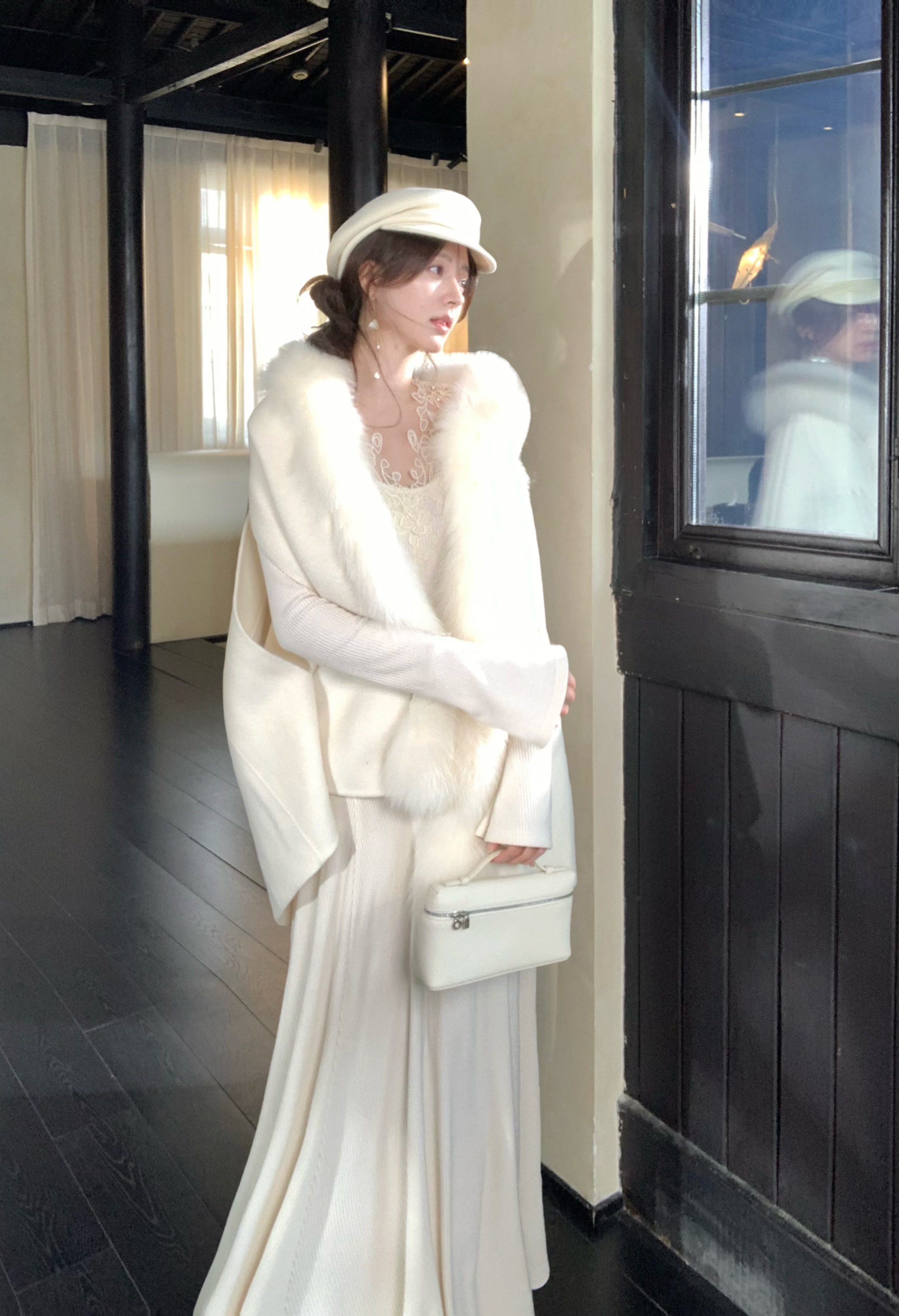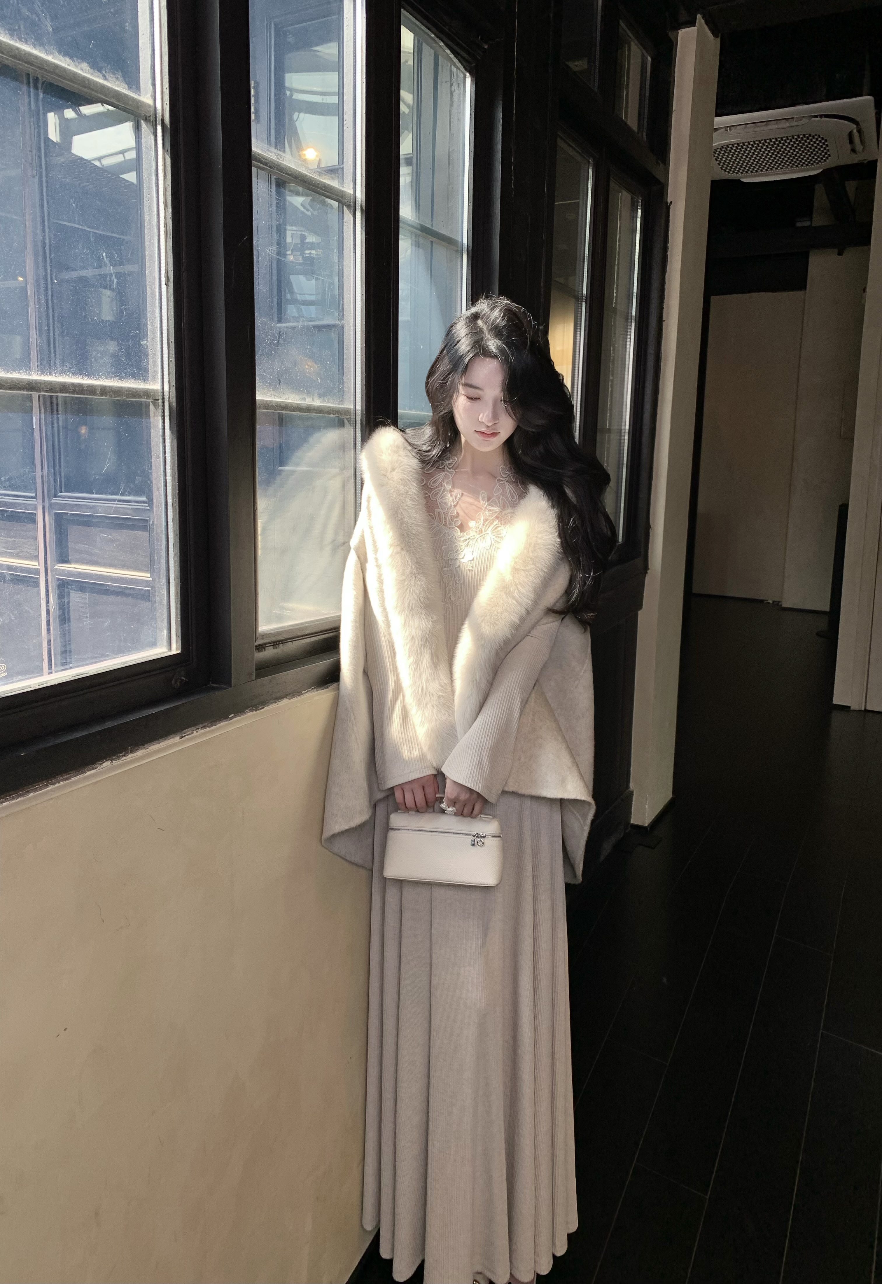 From a Moment of [Unfamiliarity] with the Snow, a Gentle and Atmospheric Lace V-Neck Knit Dress with a Waist-Cinching, Slimming A-Line Long Skirt