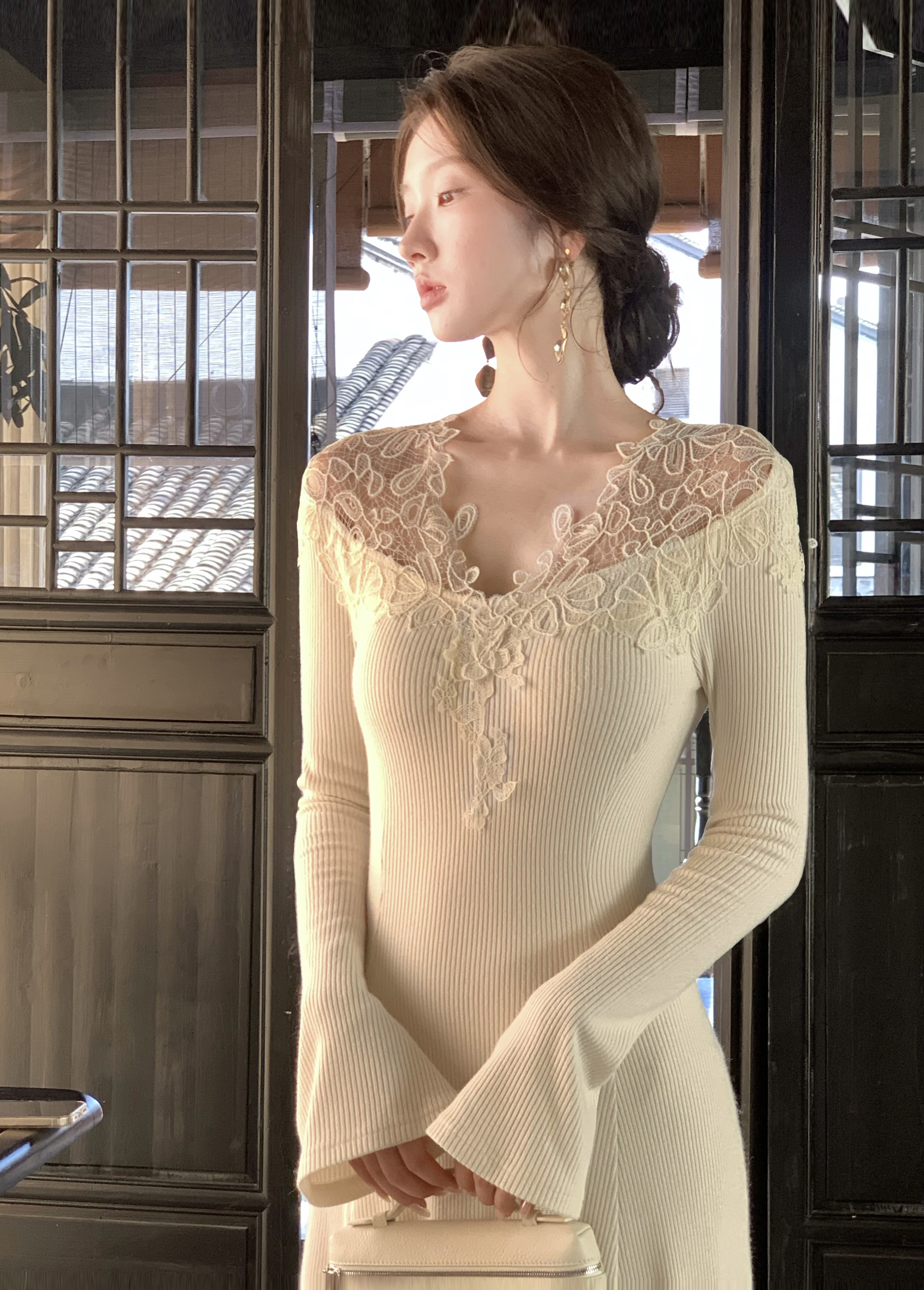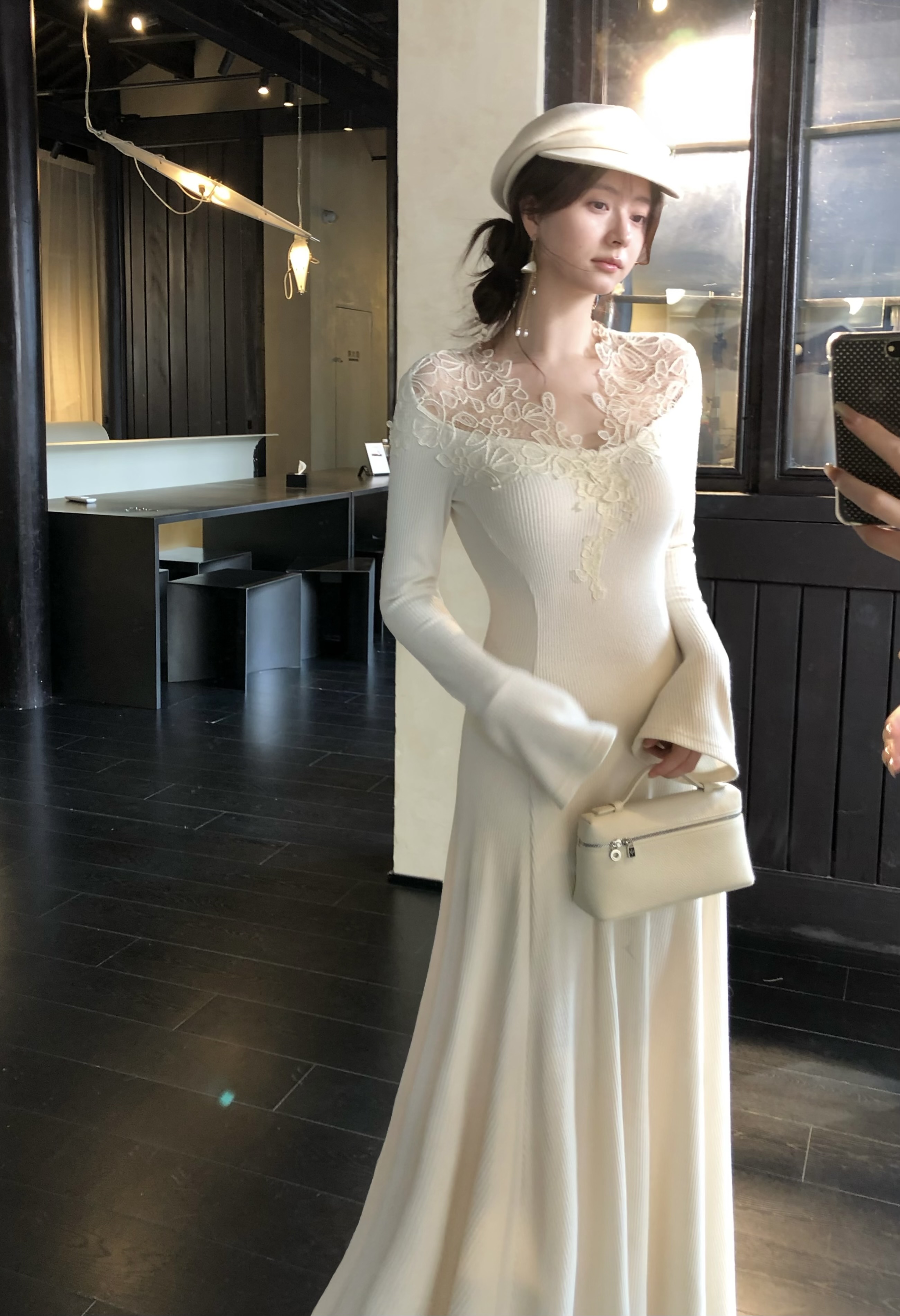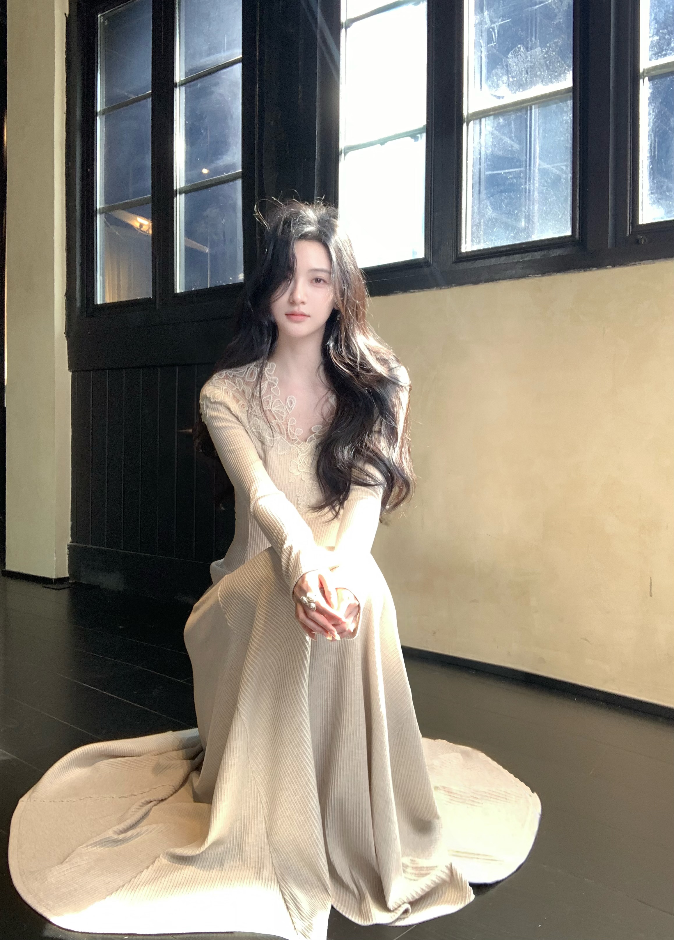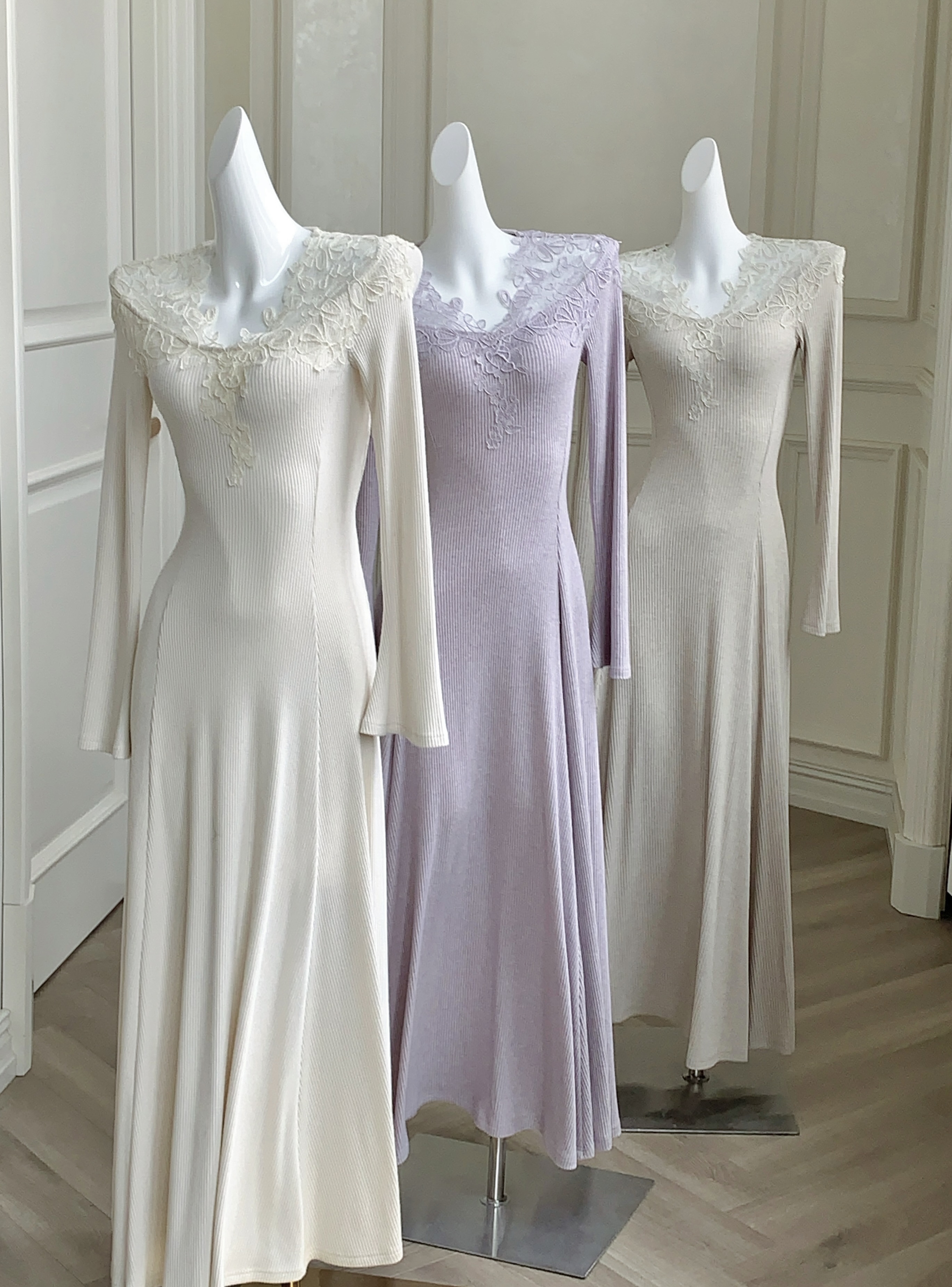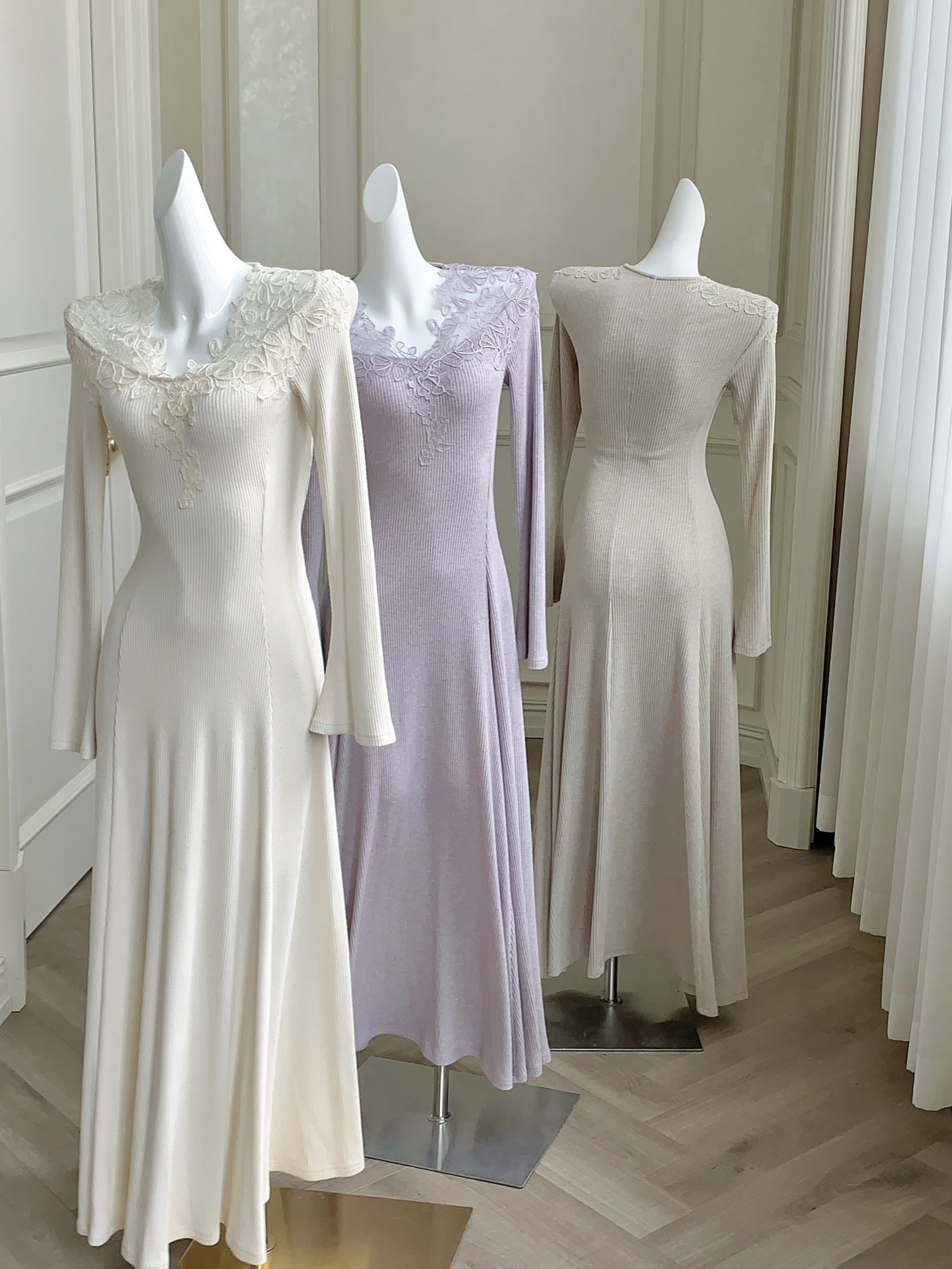 From a Moment of [Unfamiliarity] with the Snow, a Gentle and Atmospheric Lace V-Neck Knit Dress with a Waist-Cinching, Slimming A-Line Long Skirt