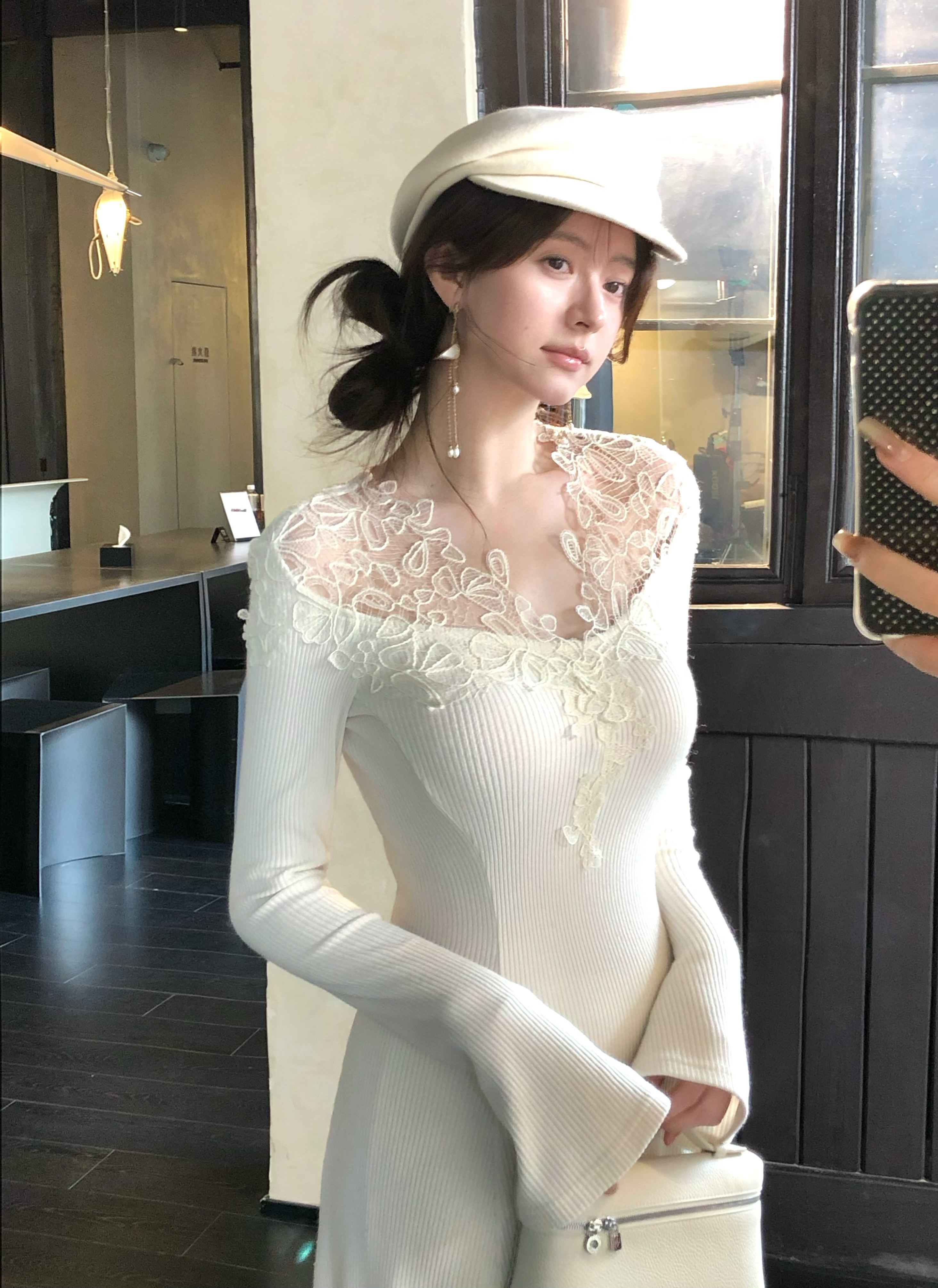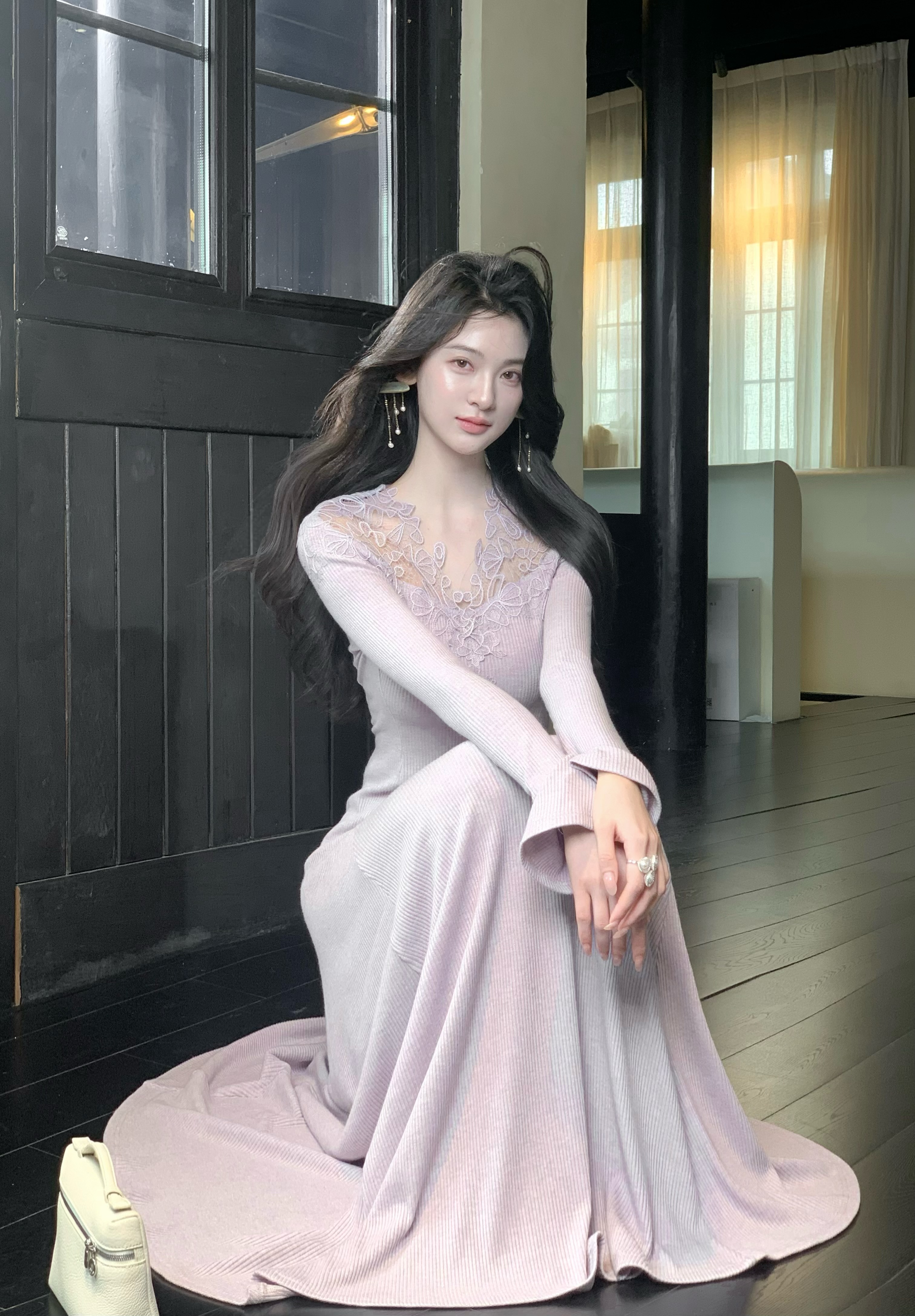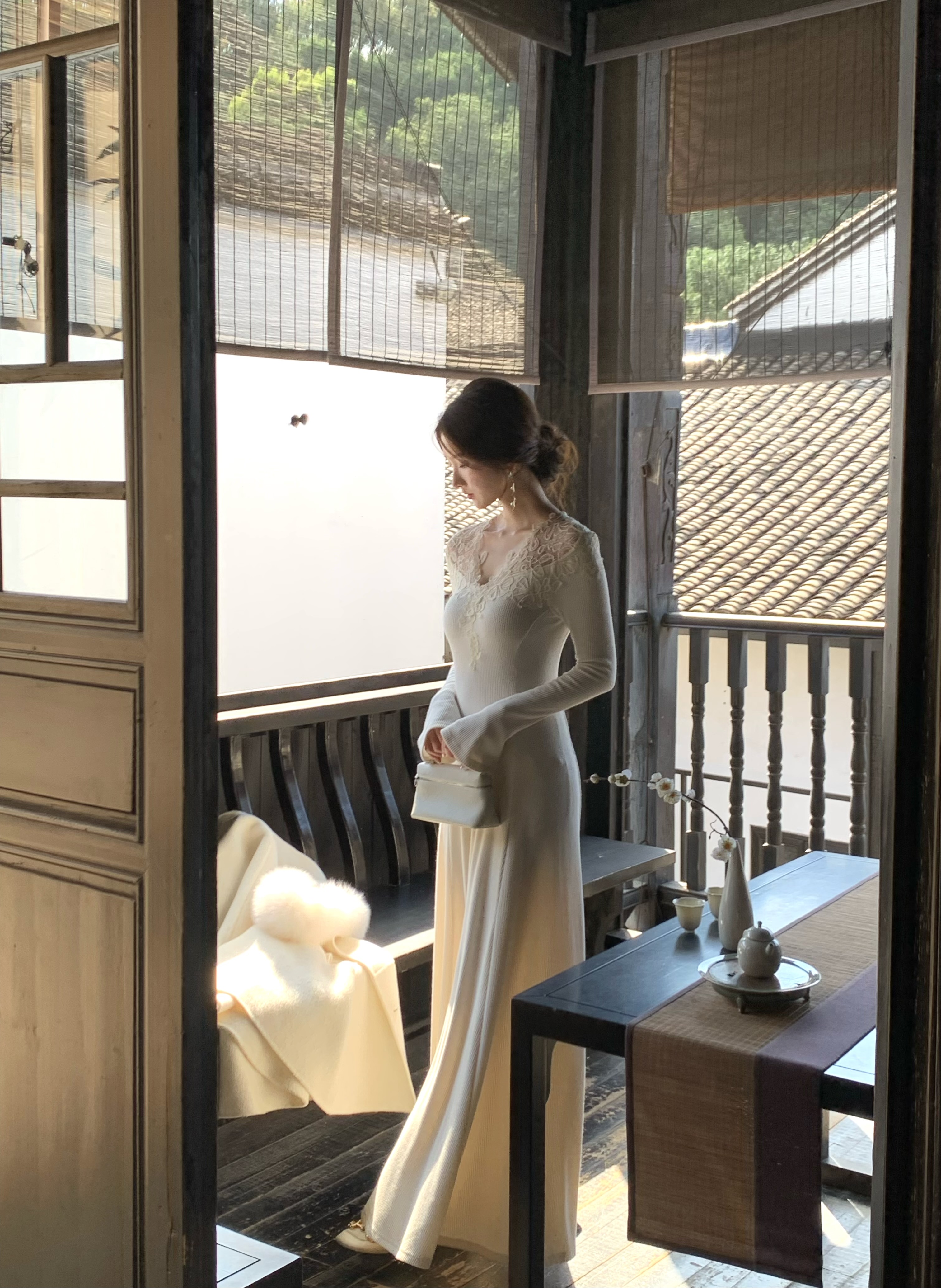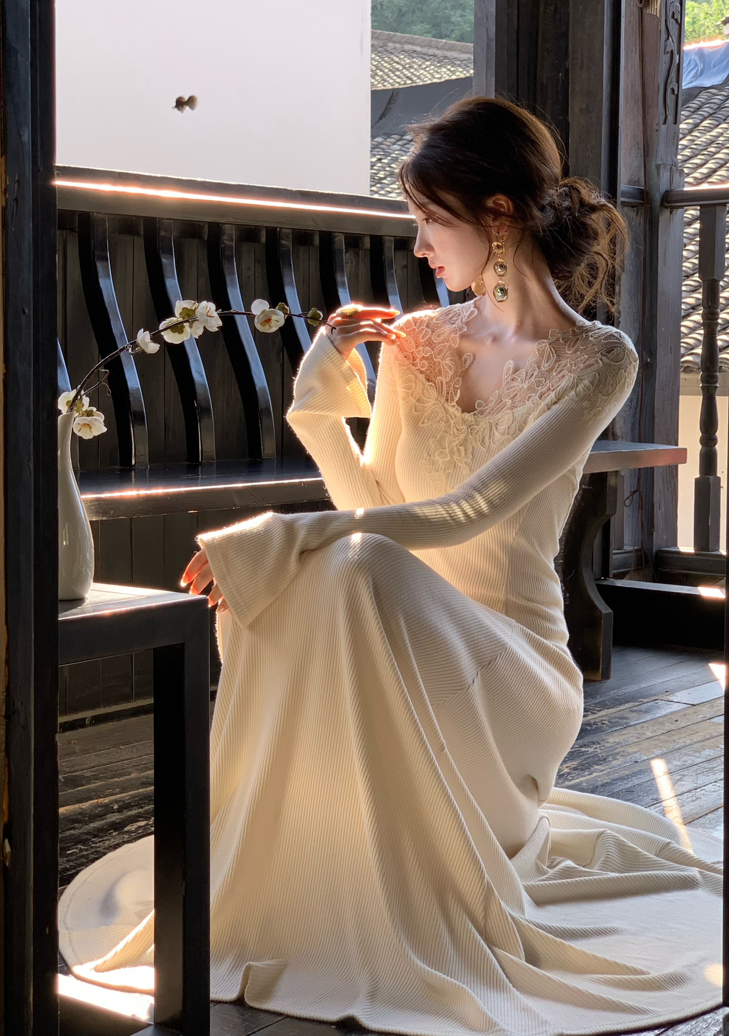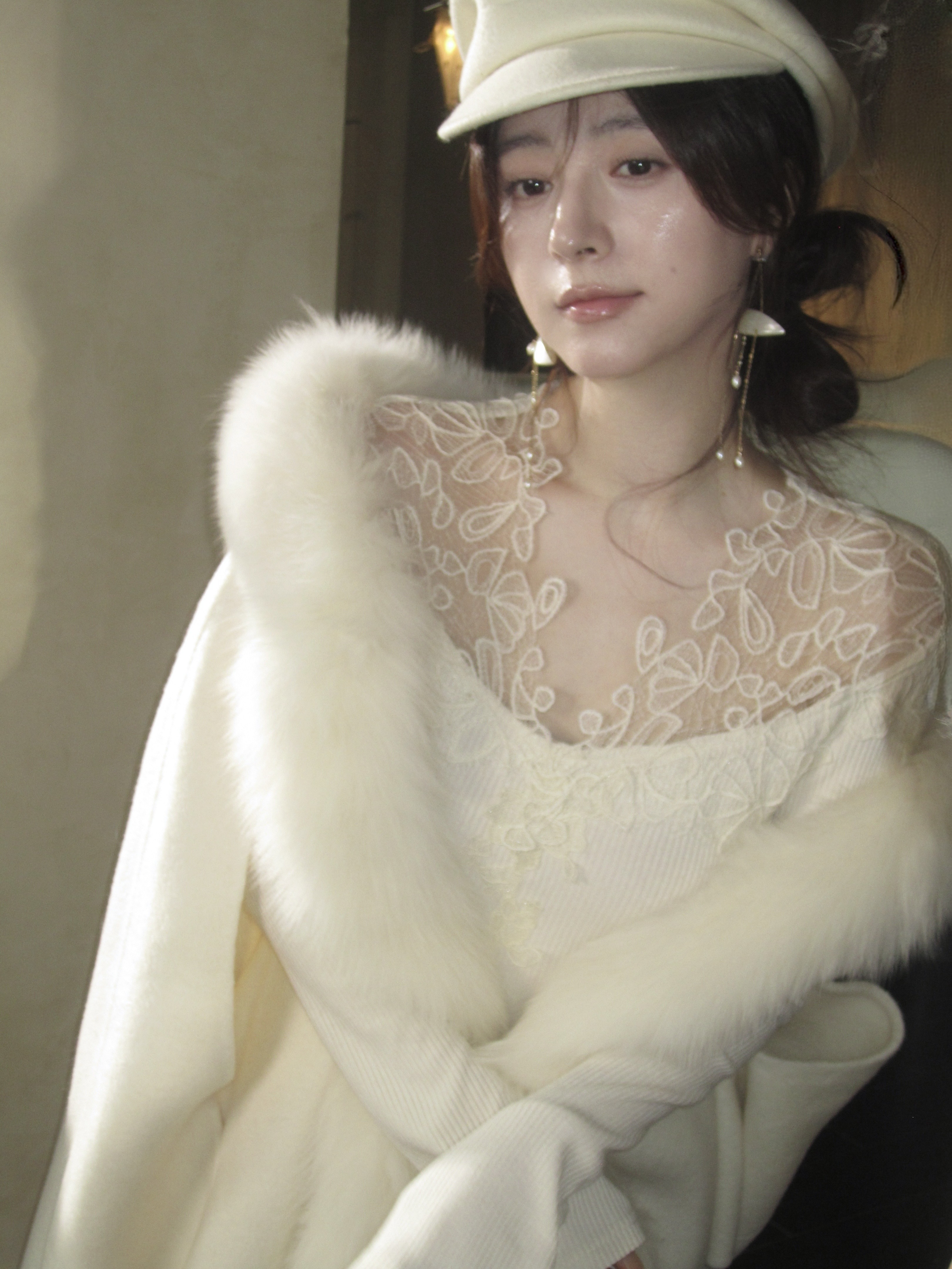 From a Moment of [Unfamiliarity] with the Snow, a Gentle and Atmospheric Lace V-Neck Knit Dress with a Waist-Cinching, Slimming A-Line Long Skirt