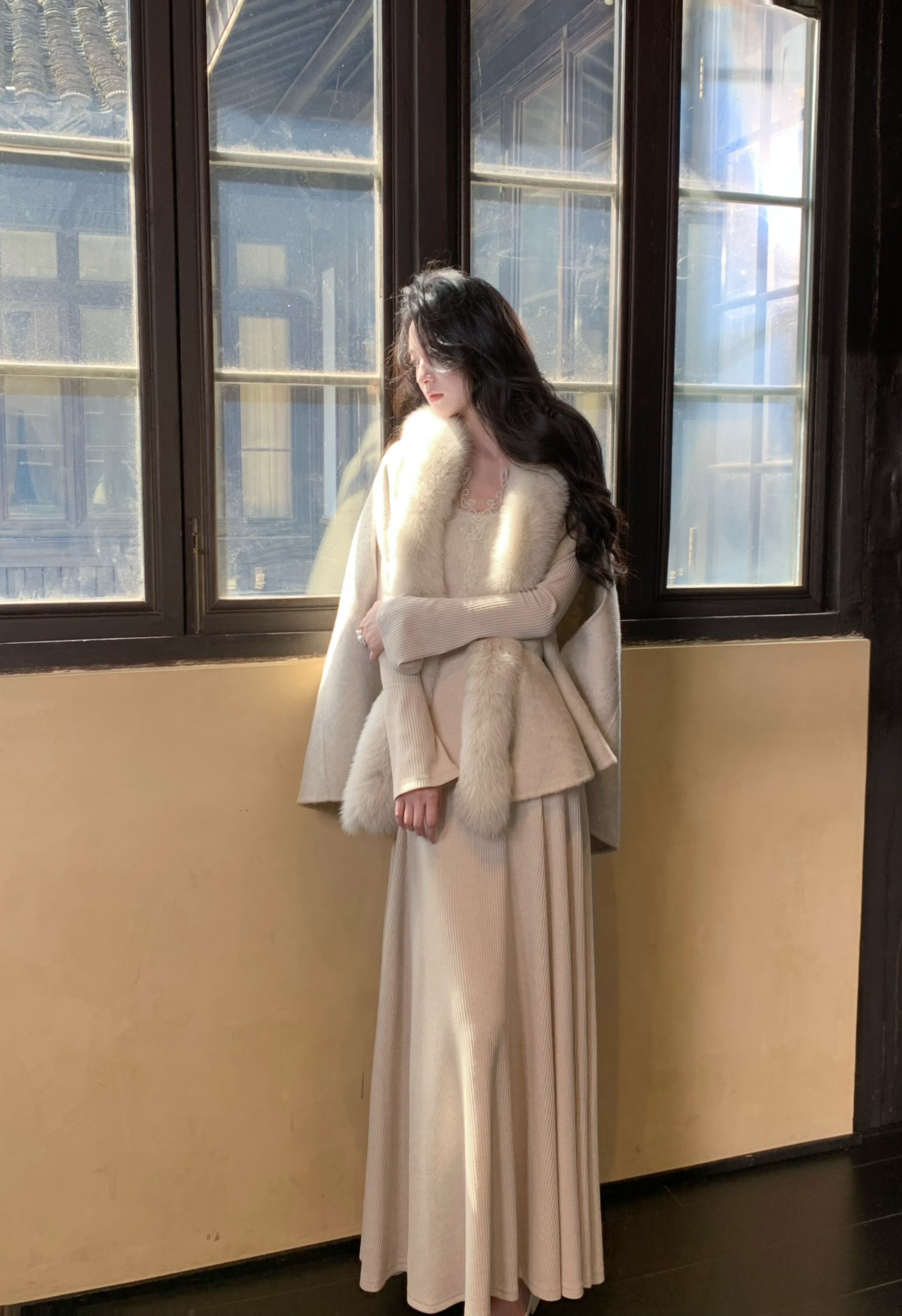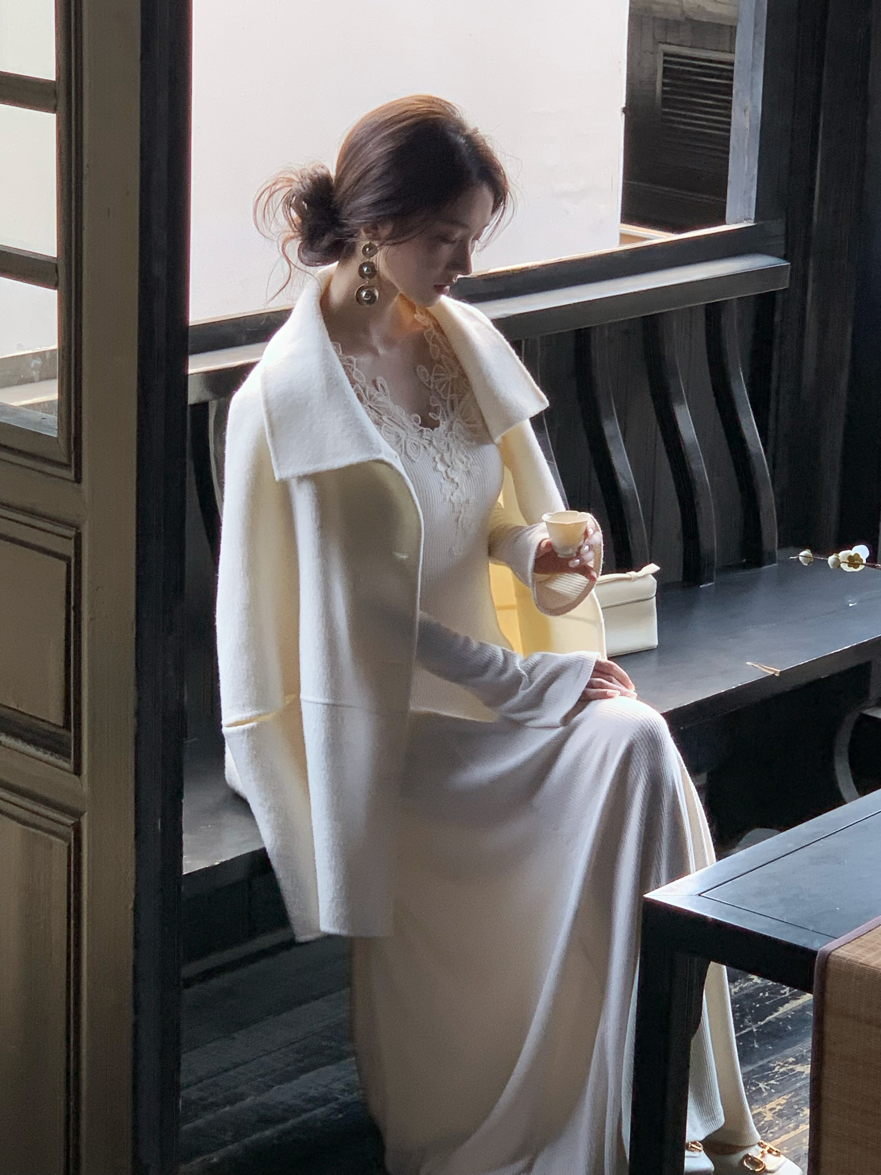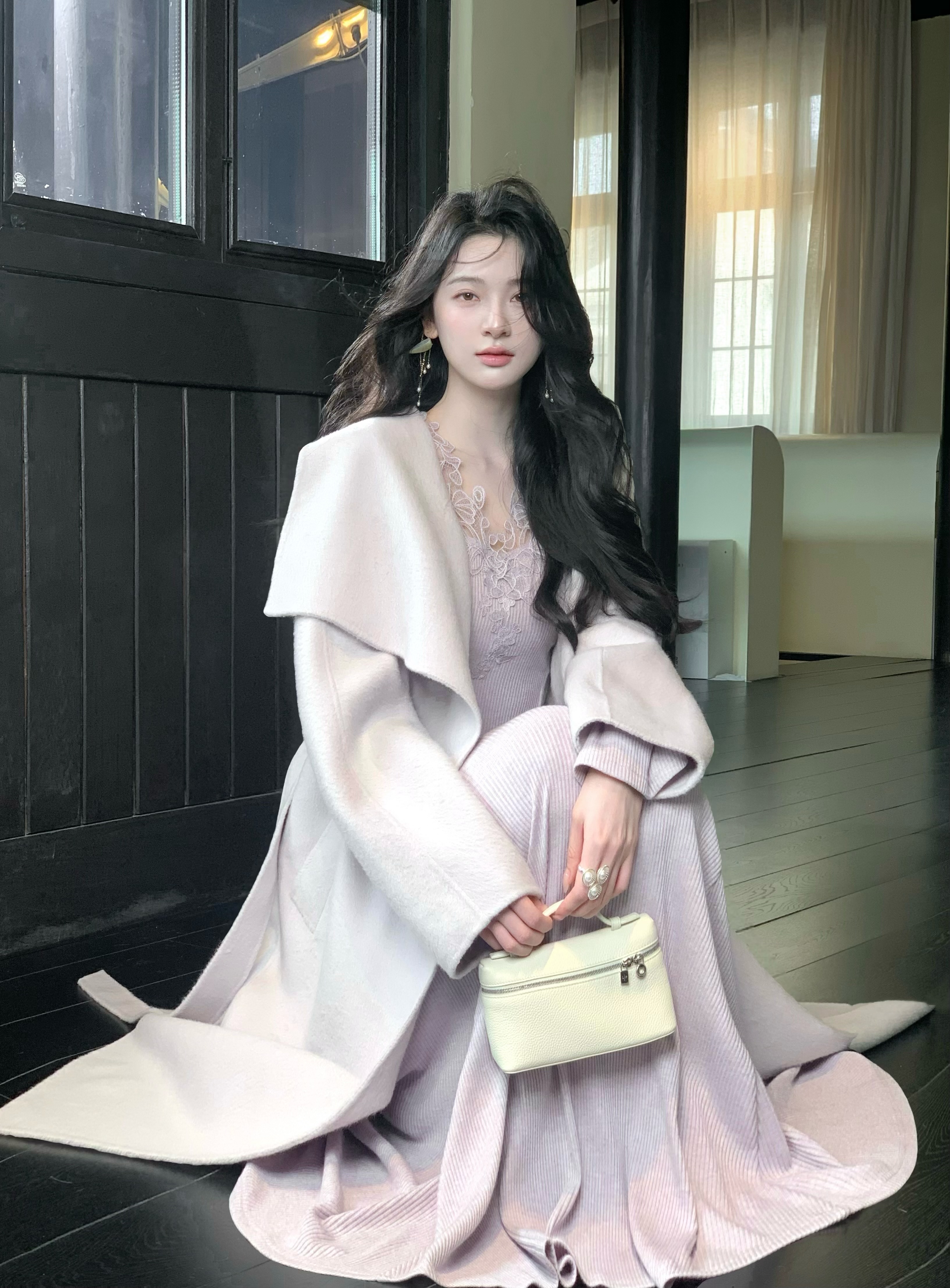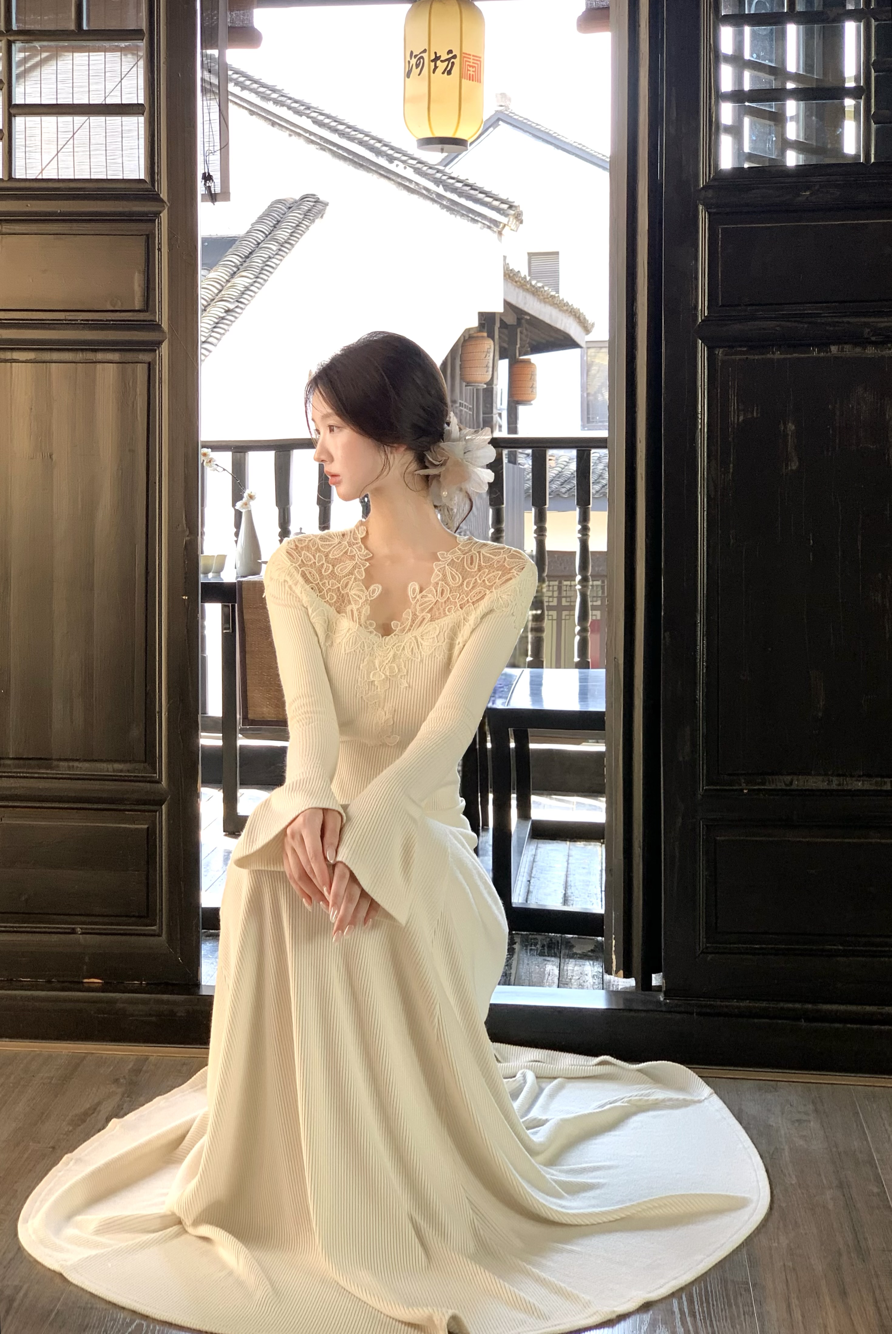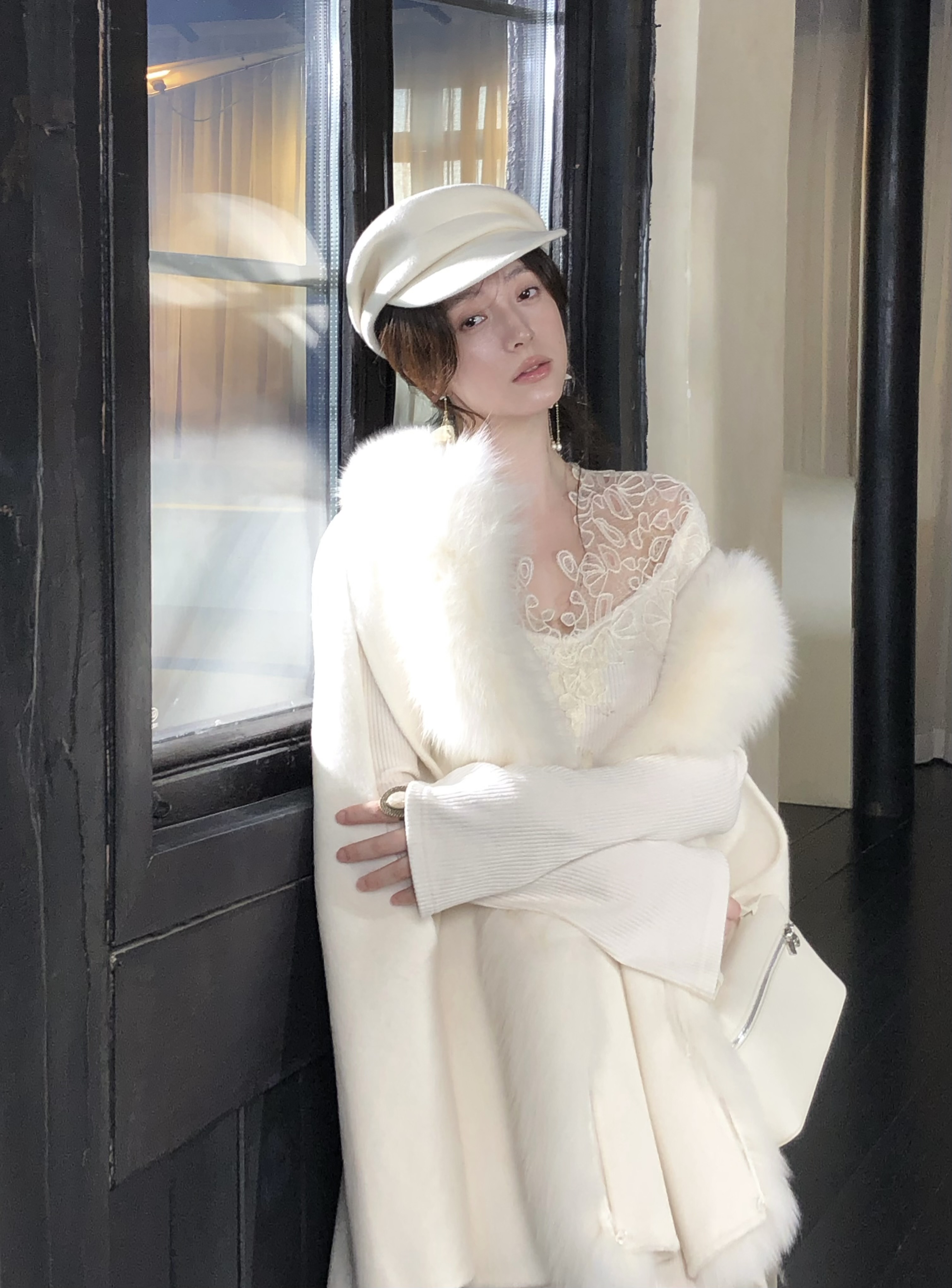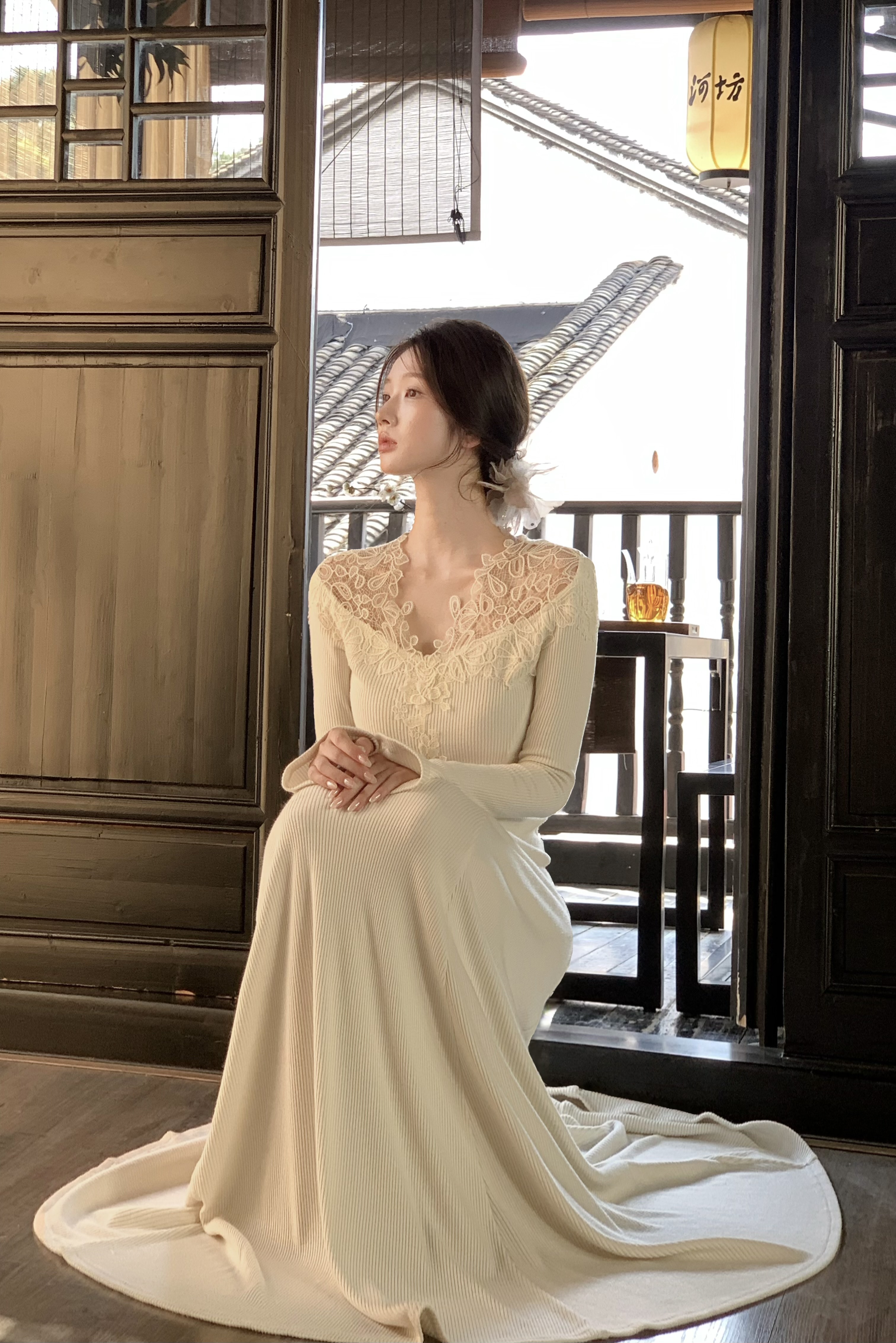 From a Moment of [Unfamiliarity] with the Snow, a Gentle and Atmospheric Lace V-Neck Knit Dress with a Waist-Cinching, Slimming A-Line Long Skirt