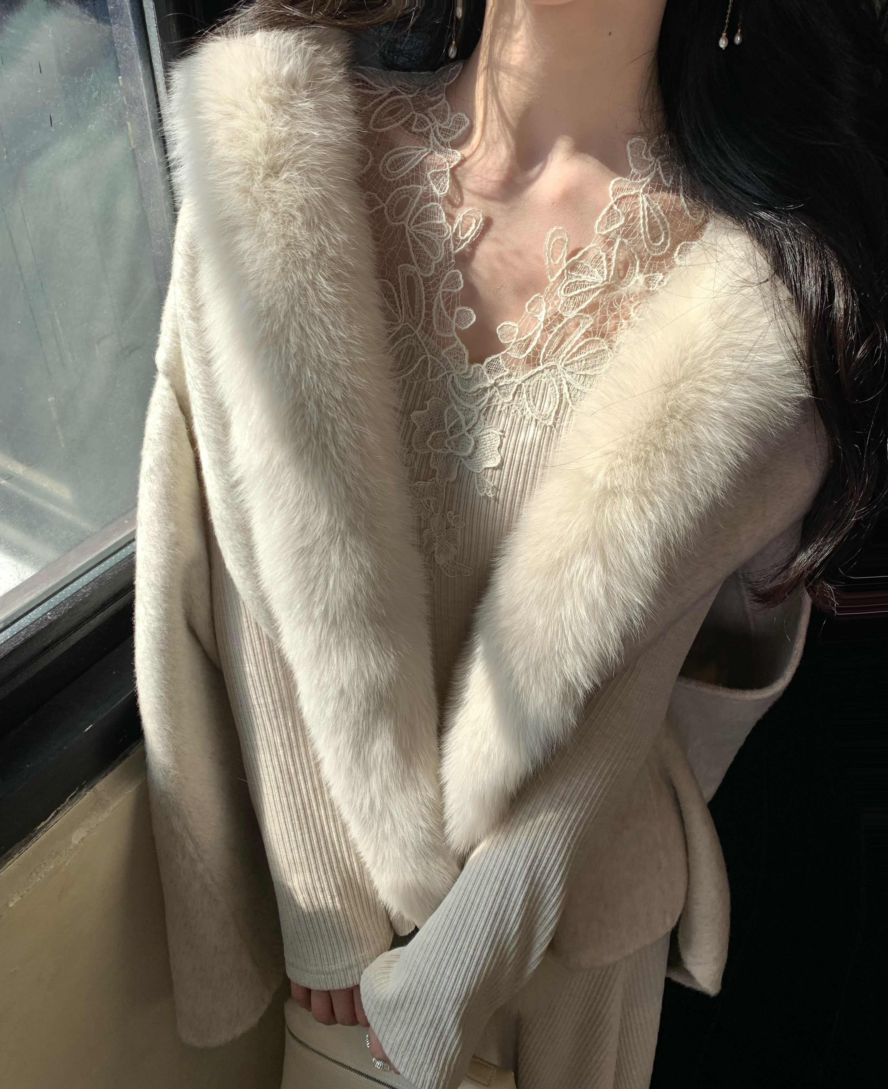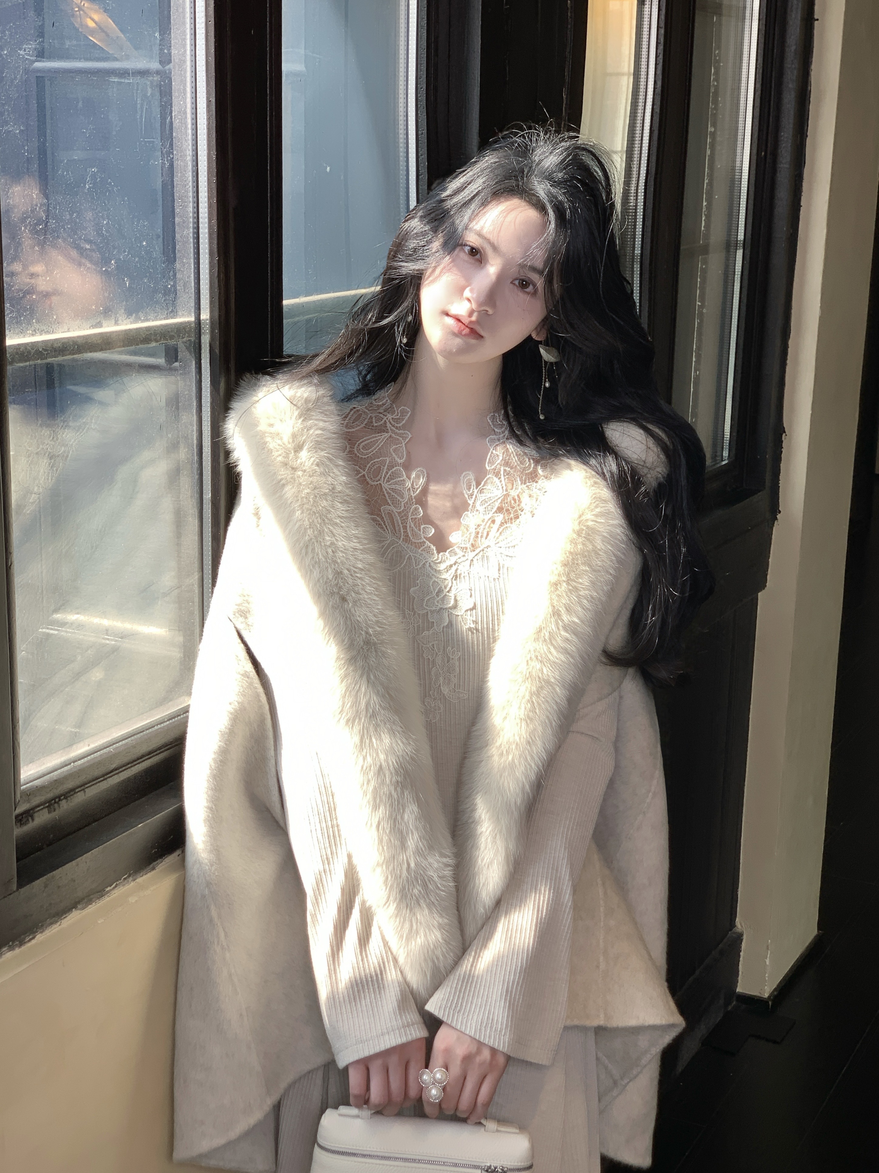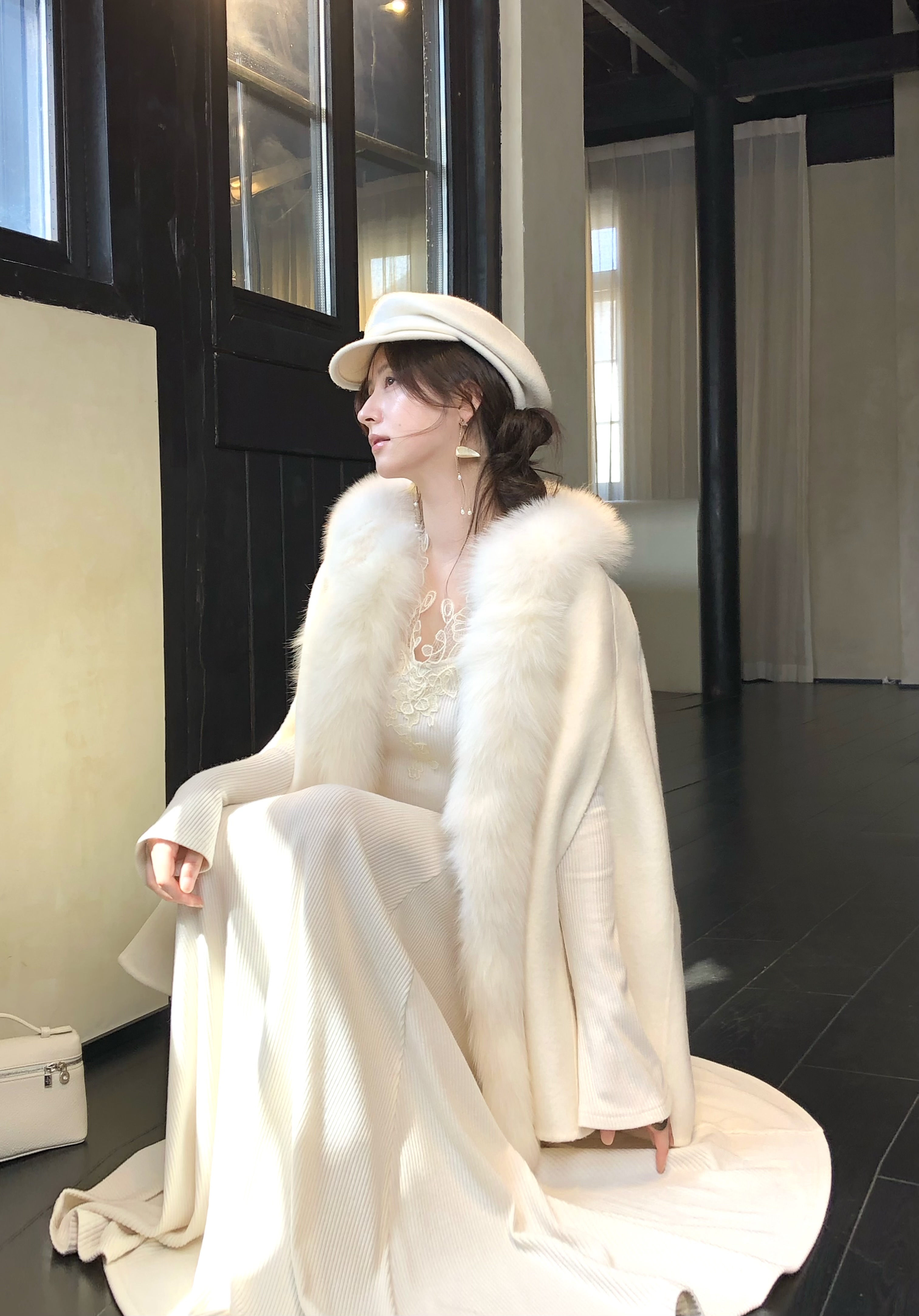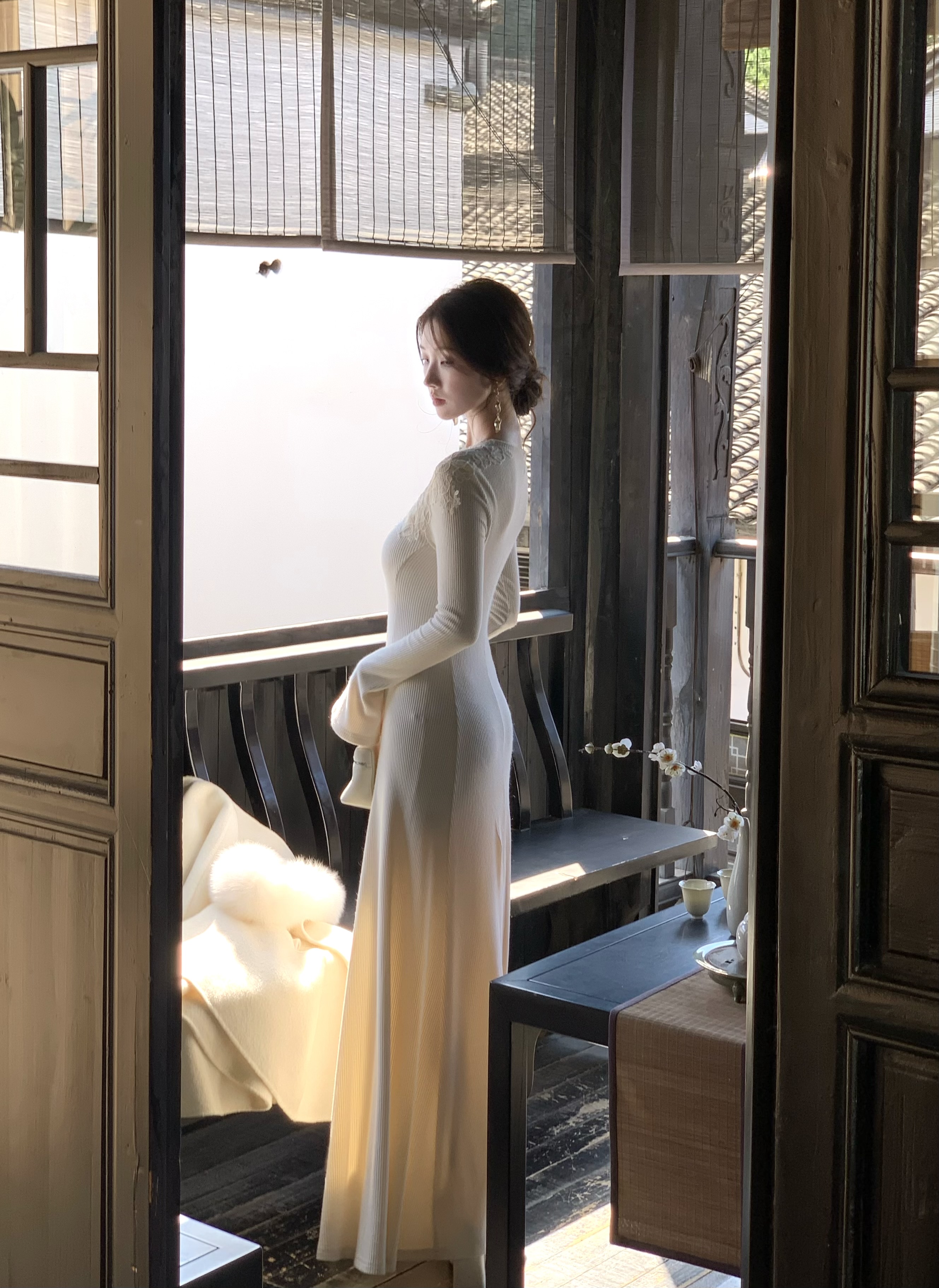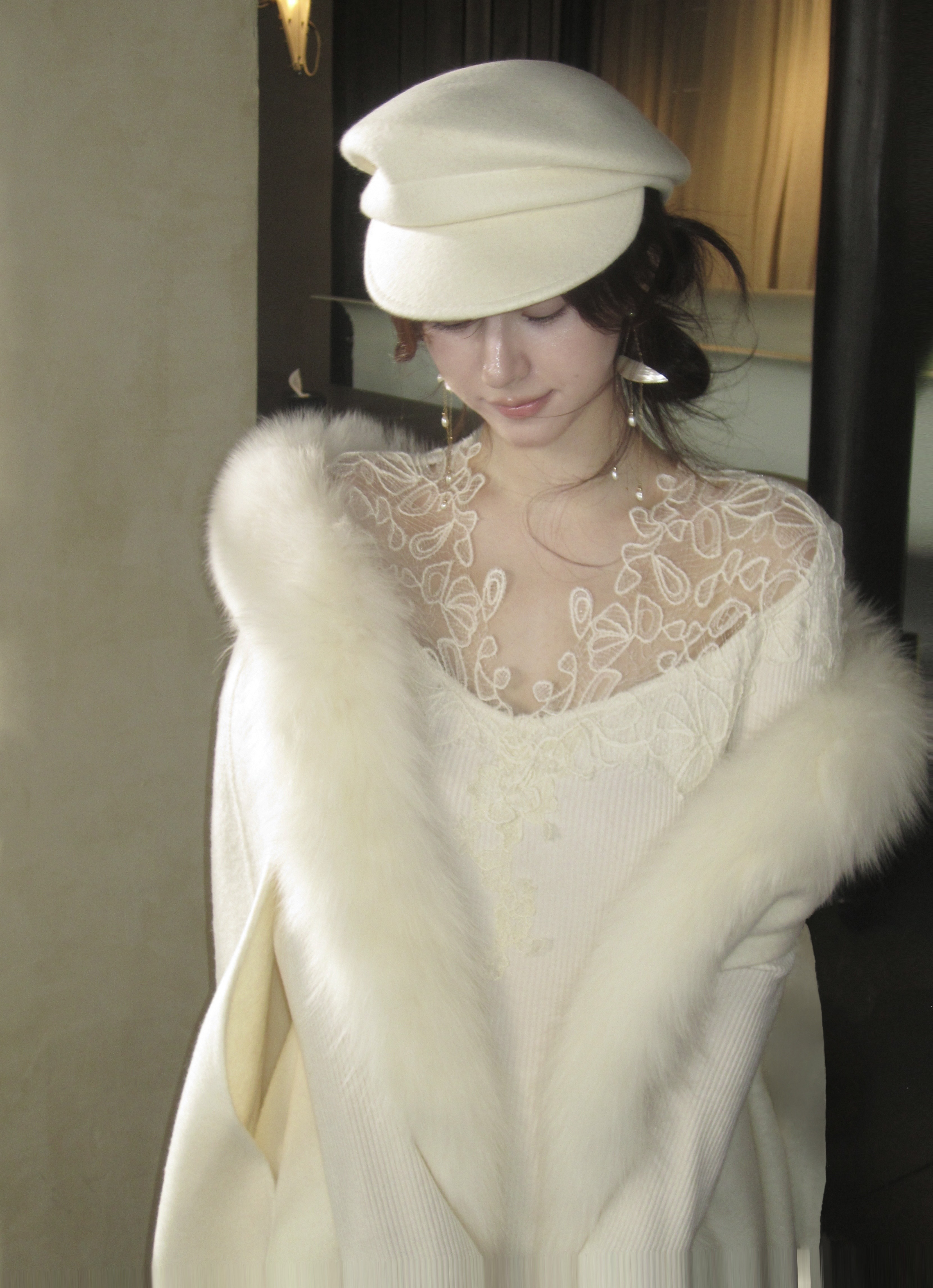 From a Moment of [Unfamiliarity] with the Snow, a Gentle and Atmospheric Lace V-Neck Knit Dress with a Waist-Cinching, Slimming A-Line Long Skirt