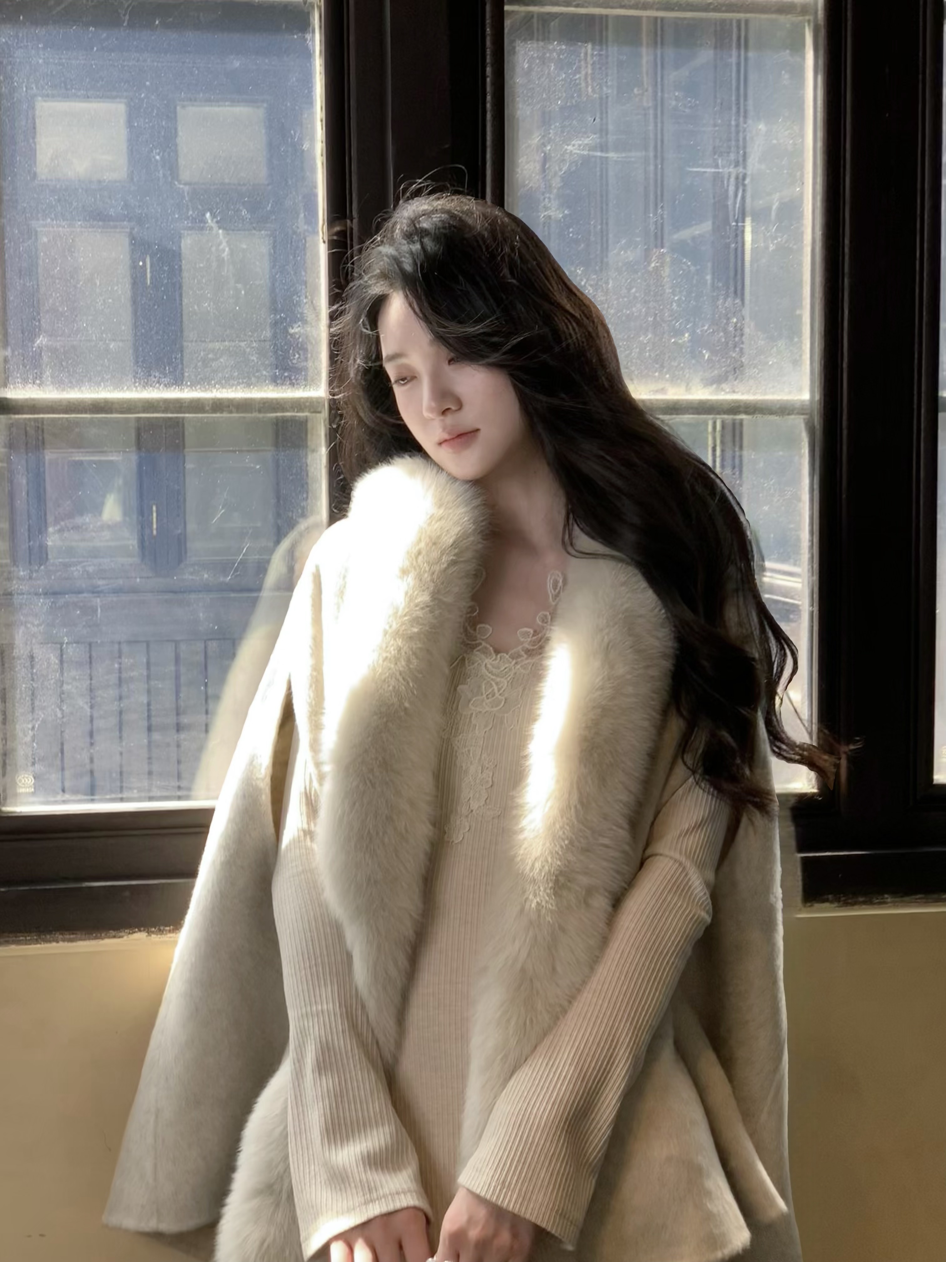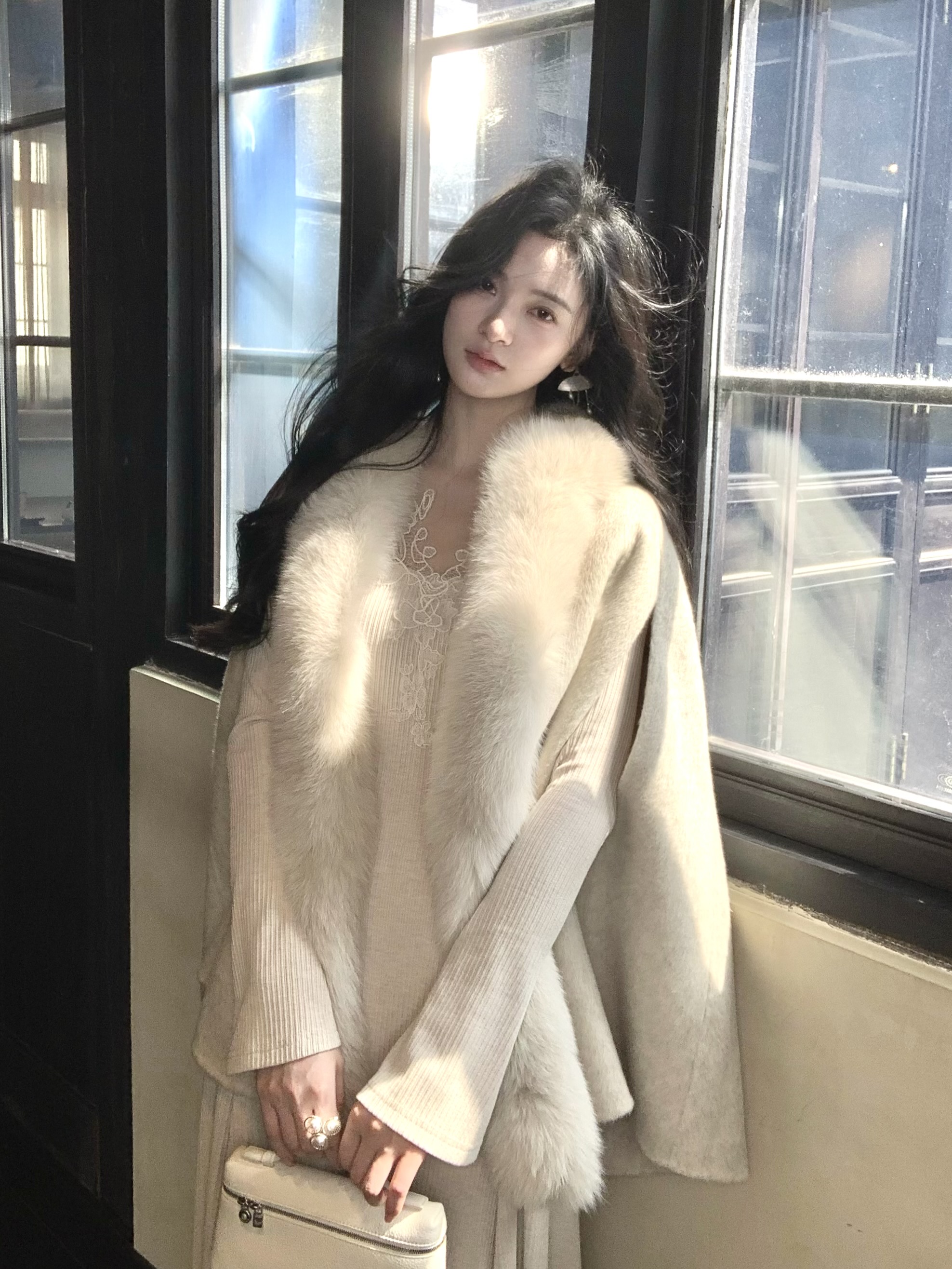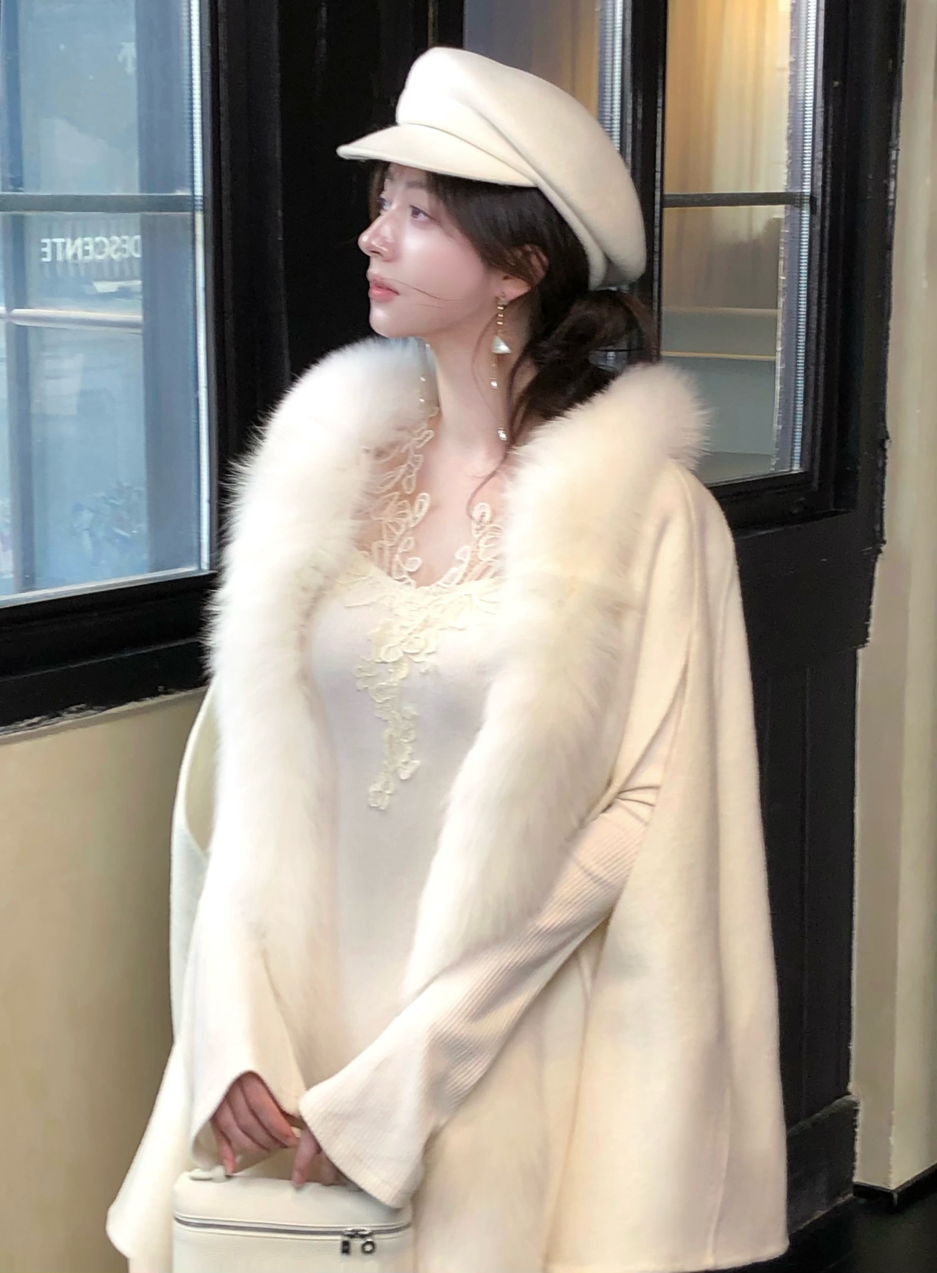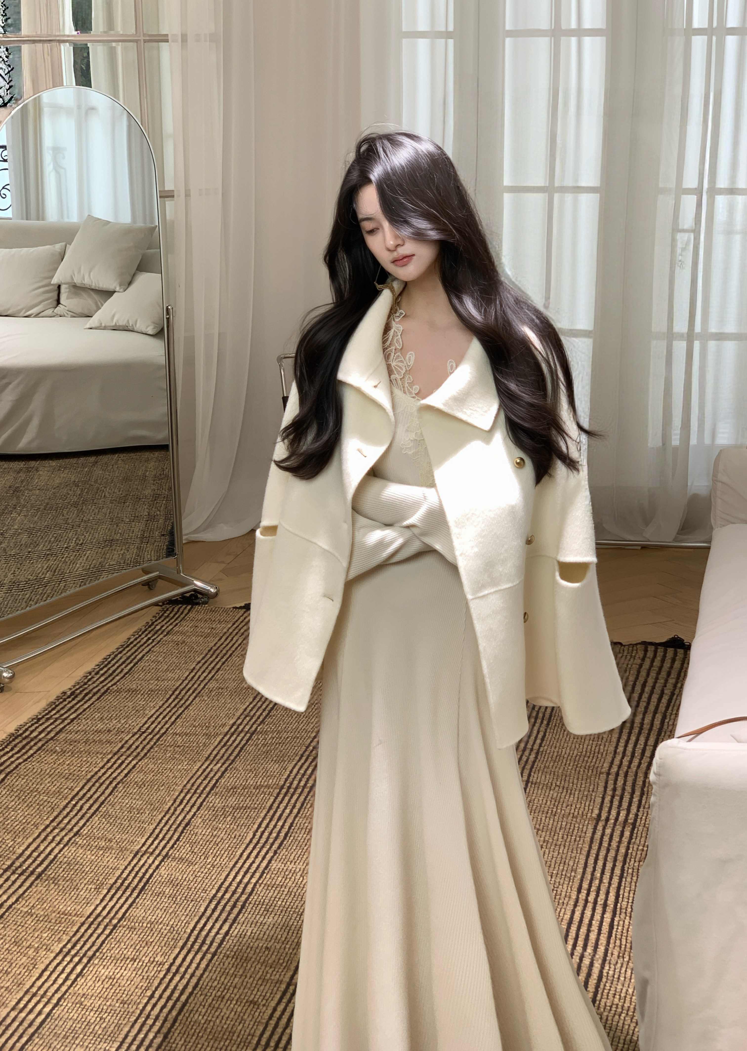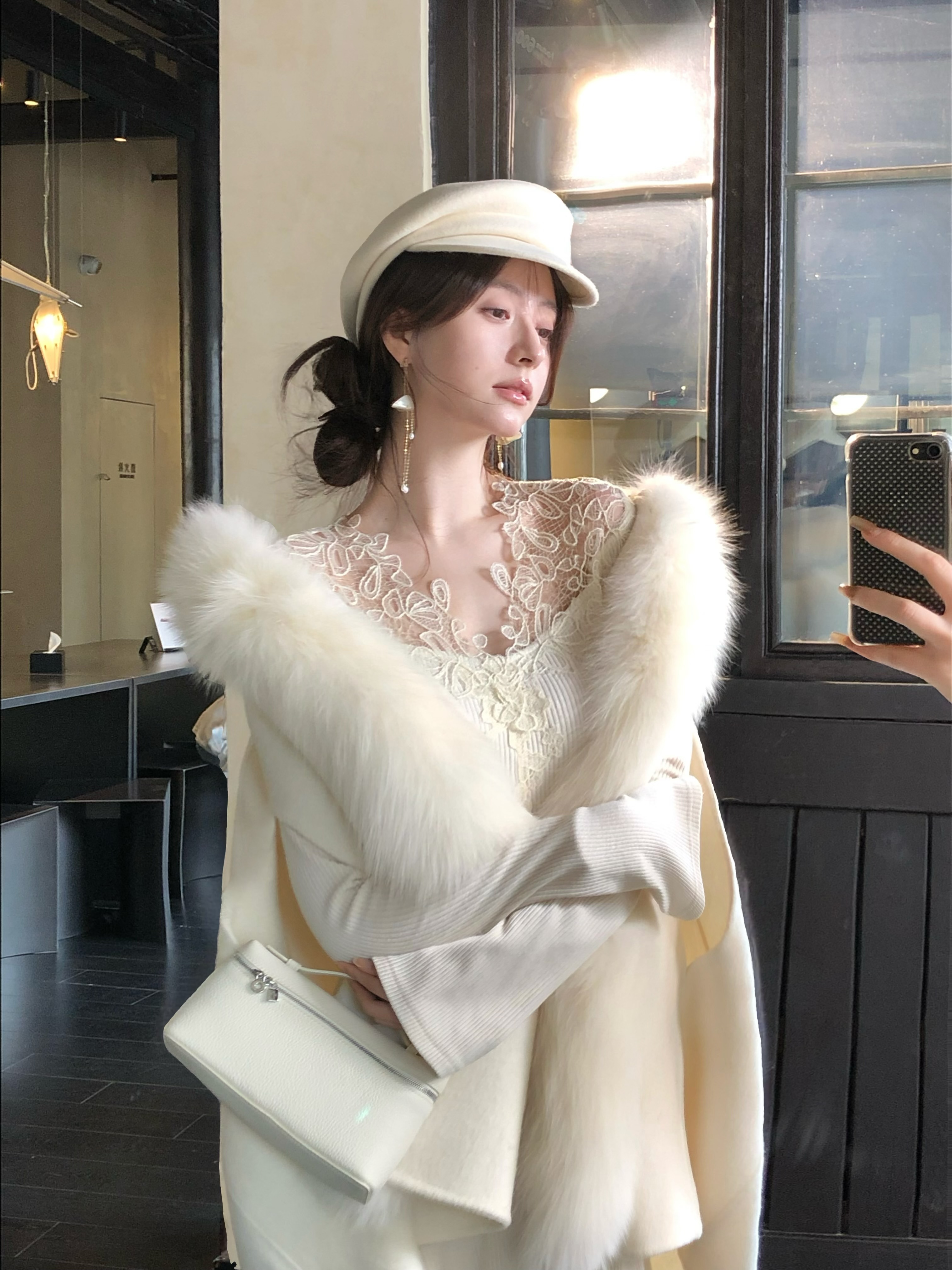 From a Moment of [Unfamiliarity] with the Snow, a Gentle and Atmospheric Lace V-Neck Knit Dress with a Waist-Cinching, Slimming A-Line Long Skirt