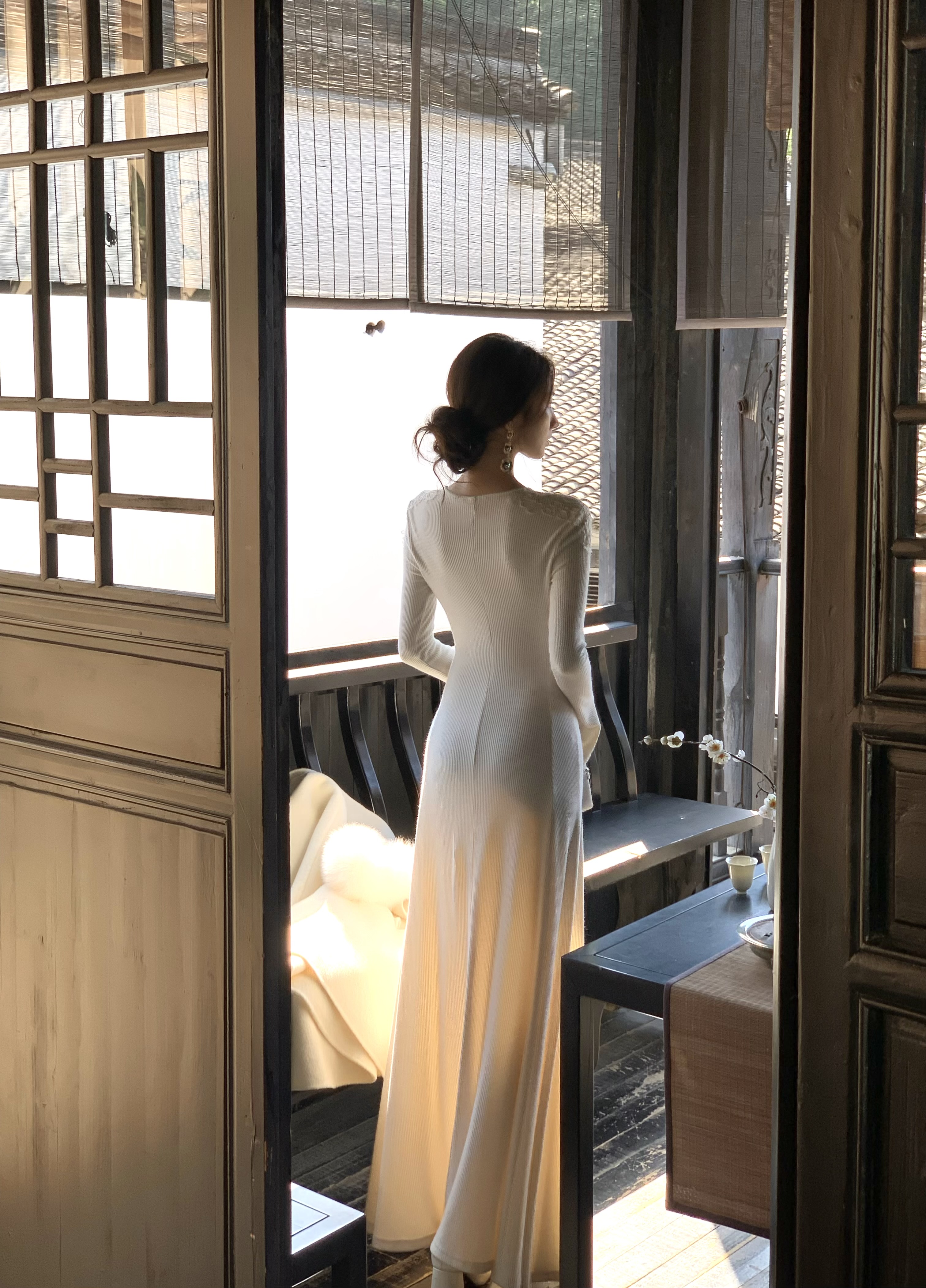 长袖版型贴合手臂曲线,袖口自肘部缓缓展开呈微喇叭状