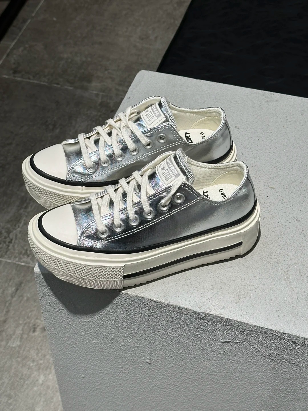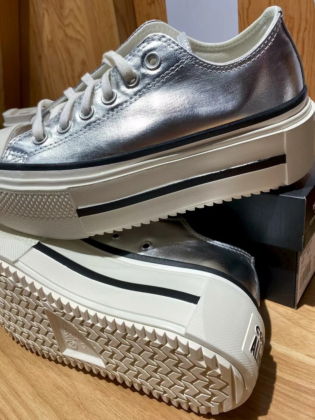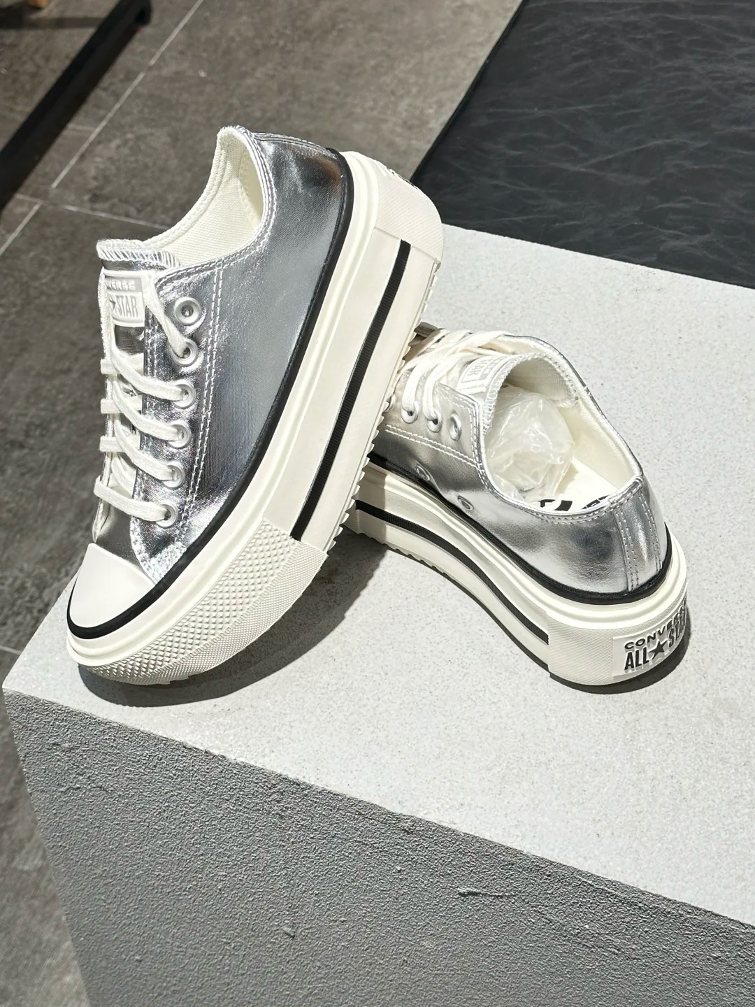 Authentic Converse Double Stack Metallic Silver Leather Low-Top Height-Increasing Platform Shoes A16406C