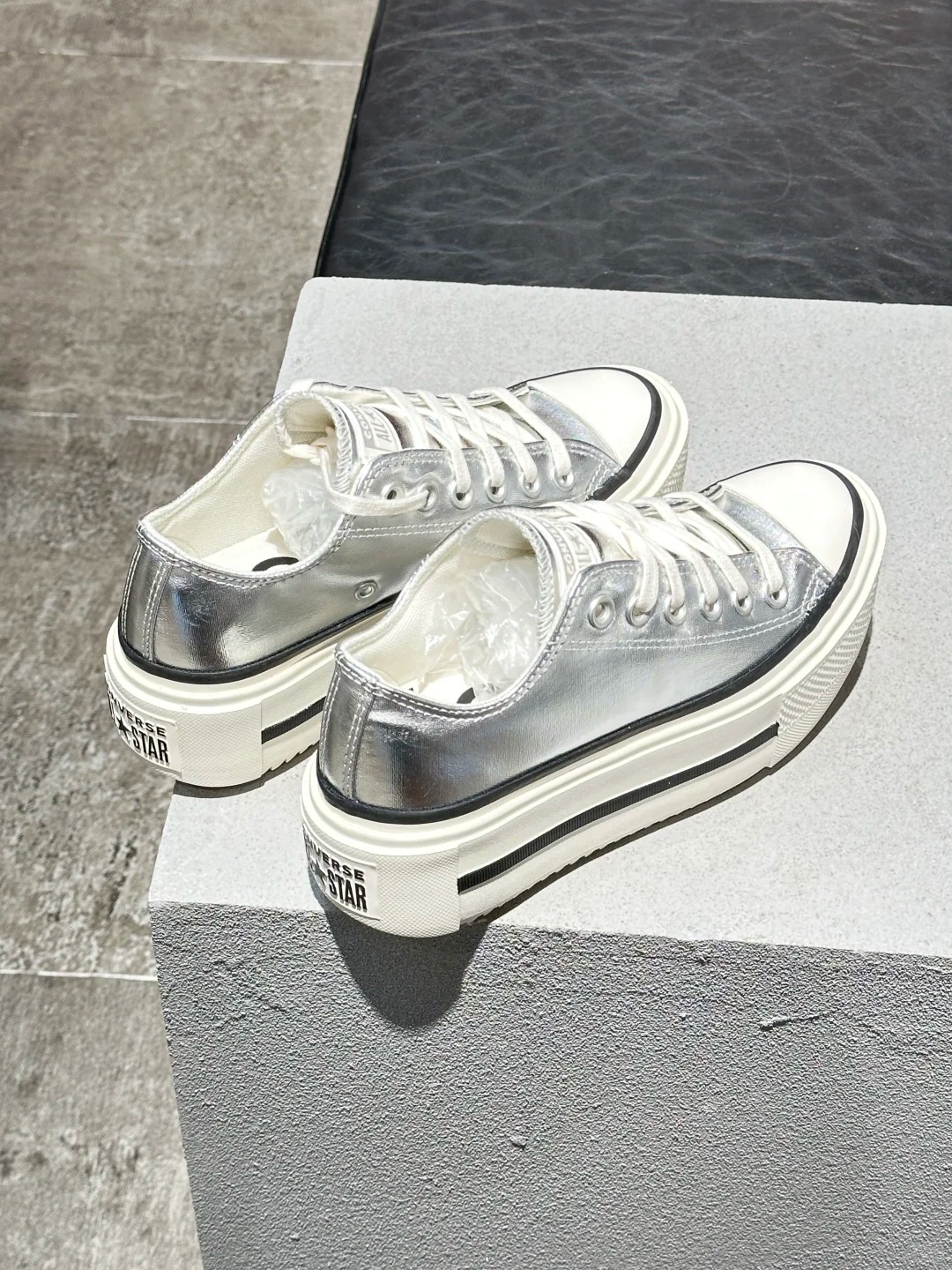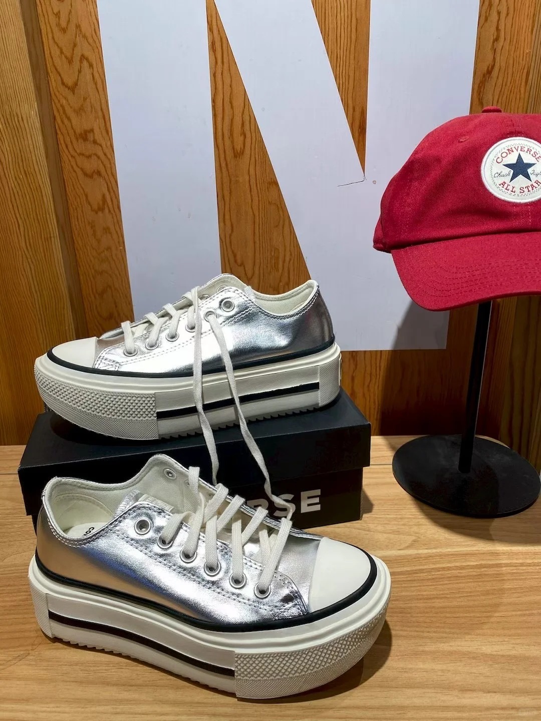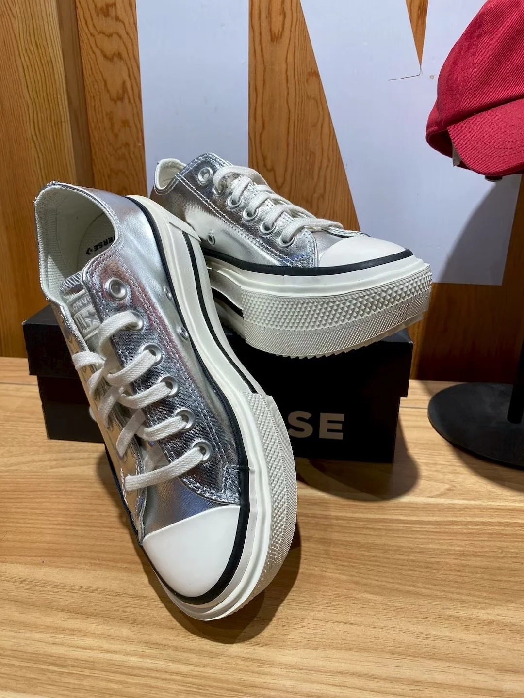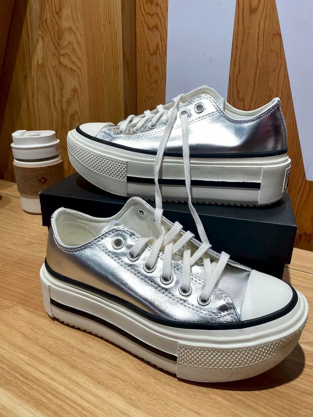 Authentic Converse Double Stack Metallic Silver Leather Low-Top Height-Increasing Platform Shoes A16406C