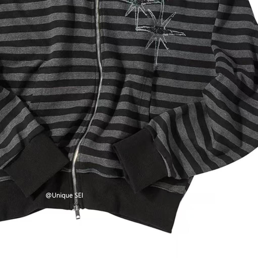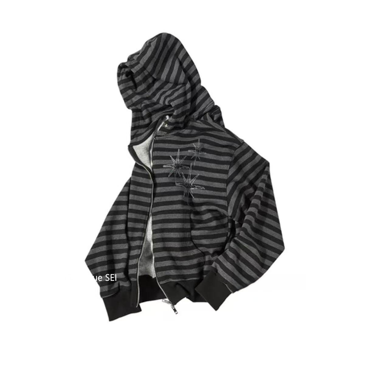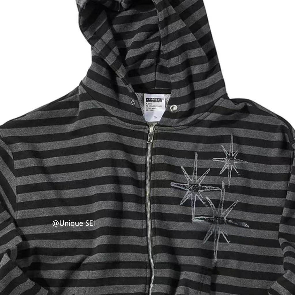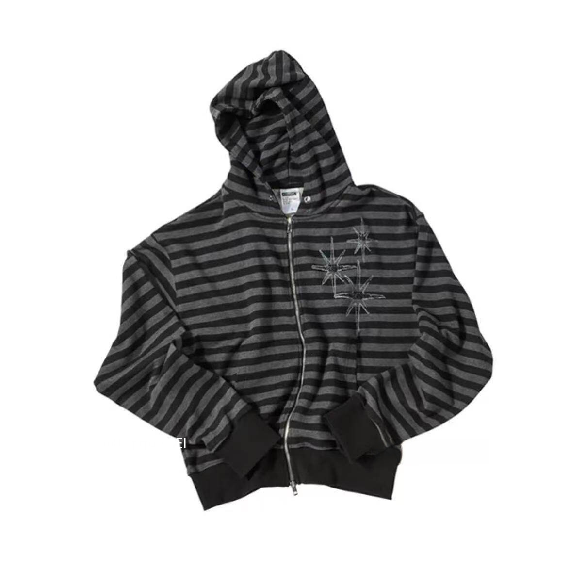 Unique Sei Korean Style Autumn and Winter Star Zipper Hooded Sweatshirt Striped Casual Loose Retro Jacket Top for Women
