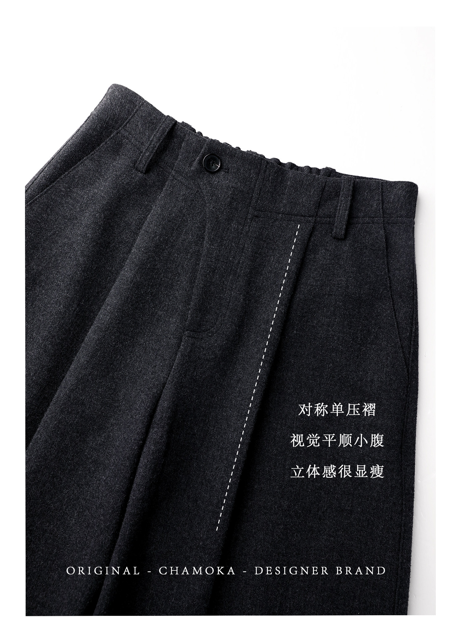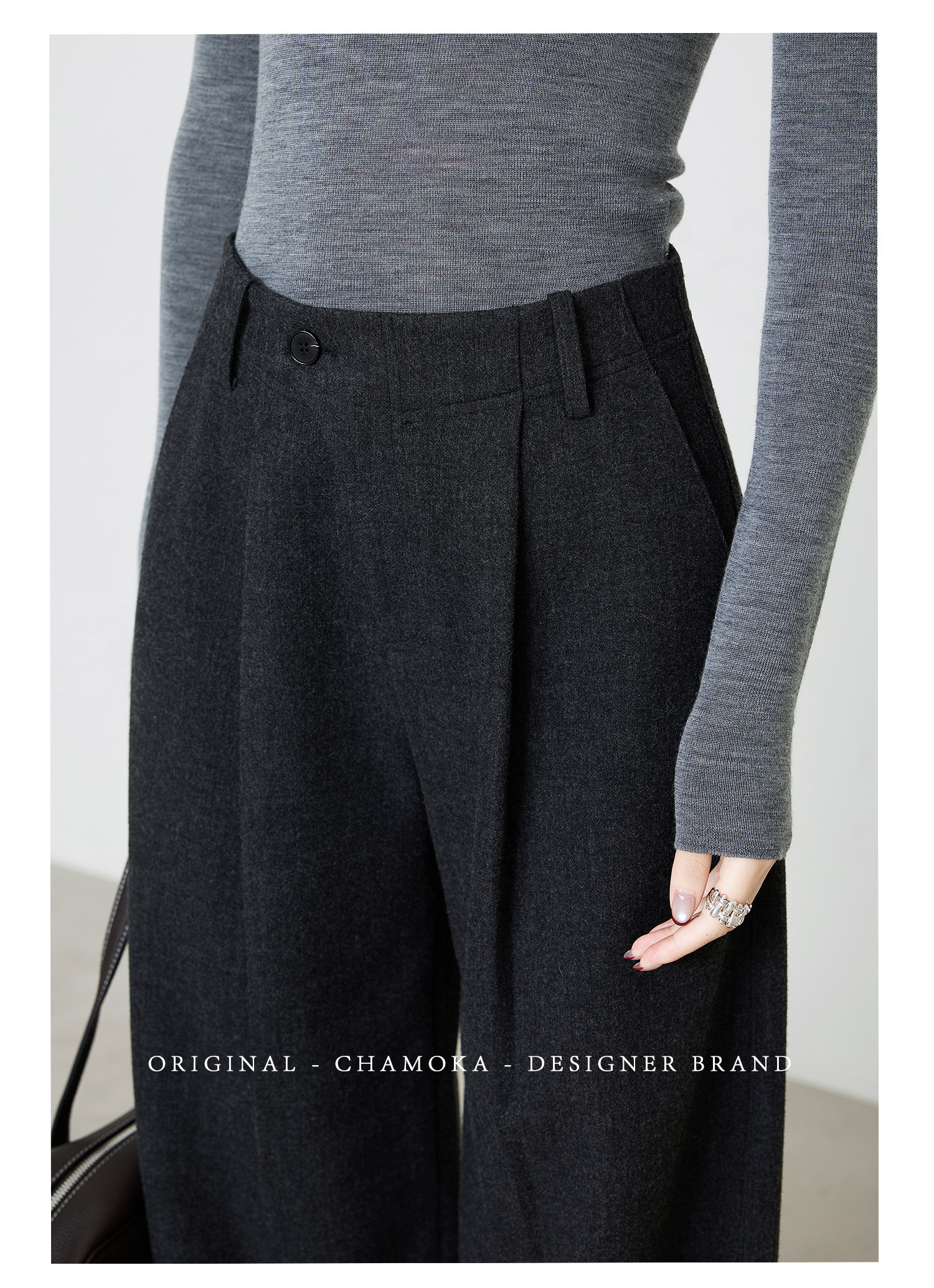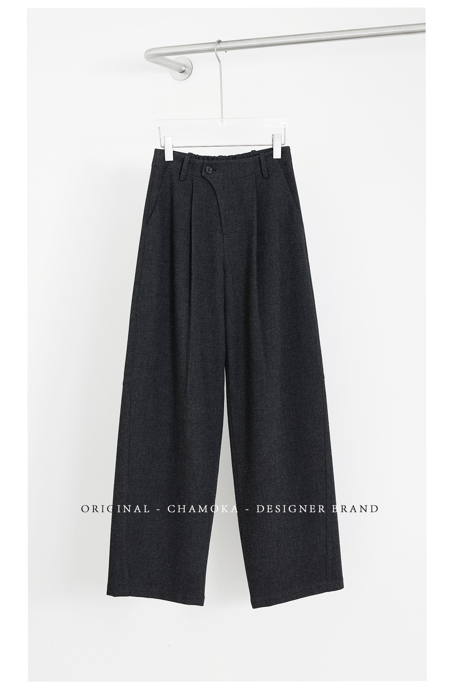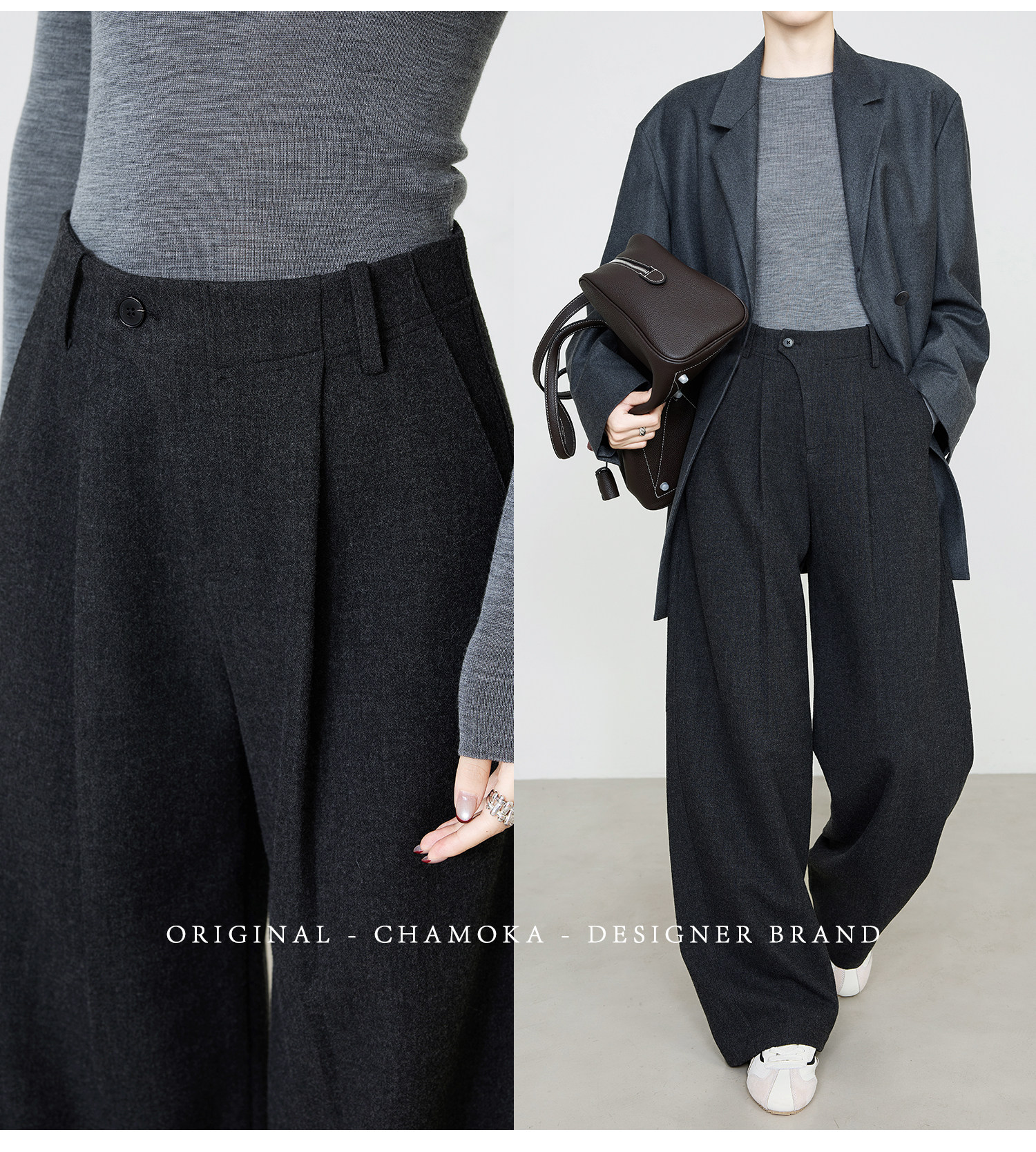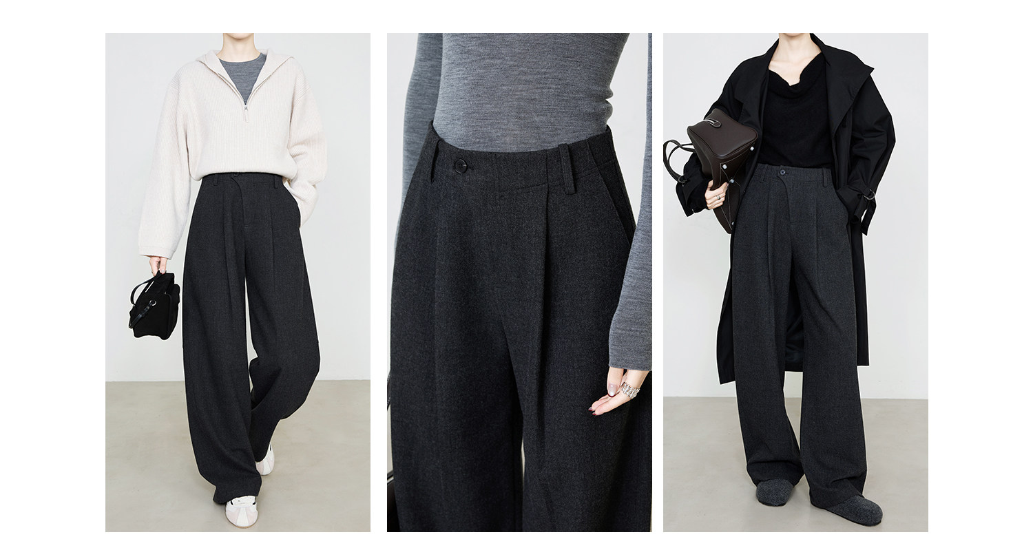 Xia Moka Diagonal Placket Gray Suit Pants for Women, Autumn and Winter, Elastic Waist, Slimming, Curved Pants, Merino Wool Wide-Leg Pants 6855