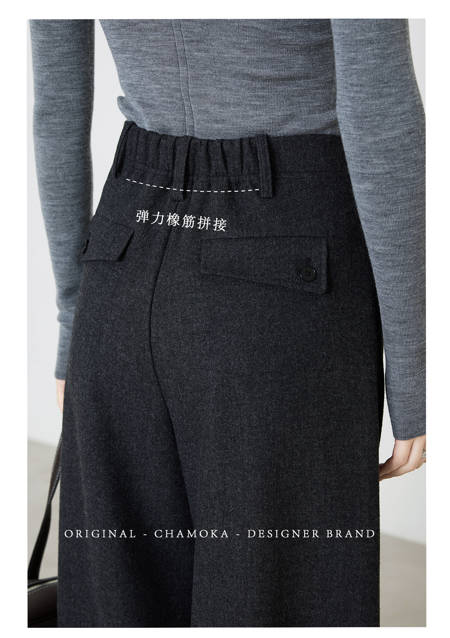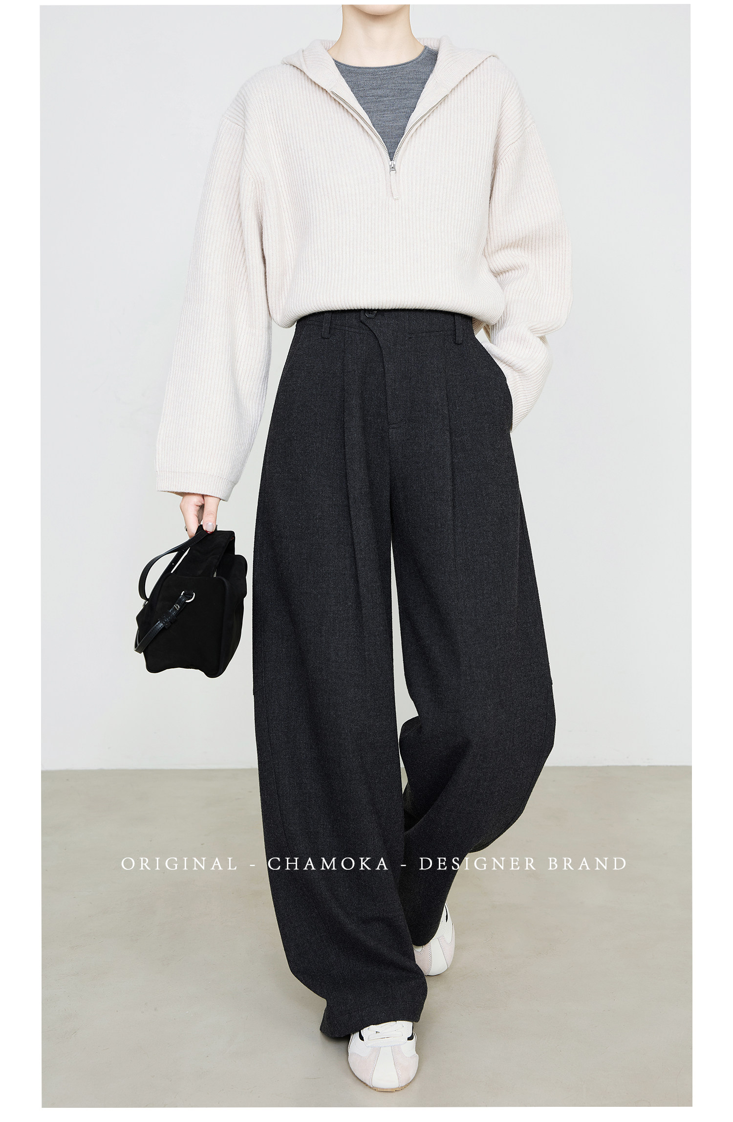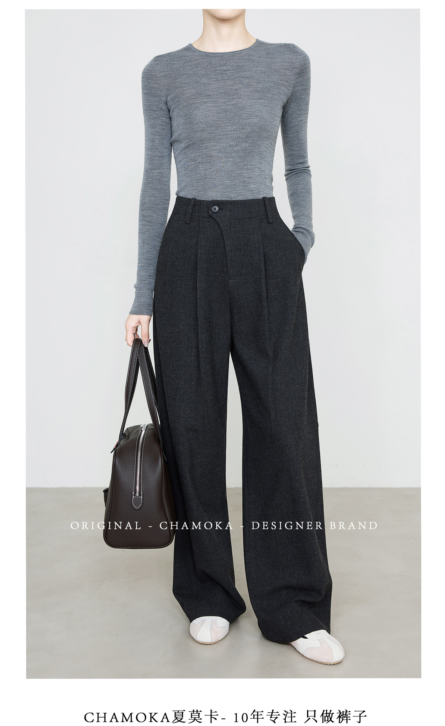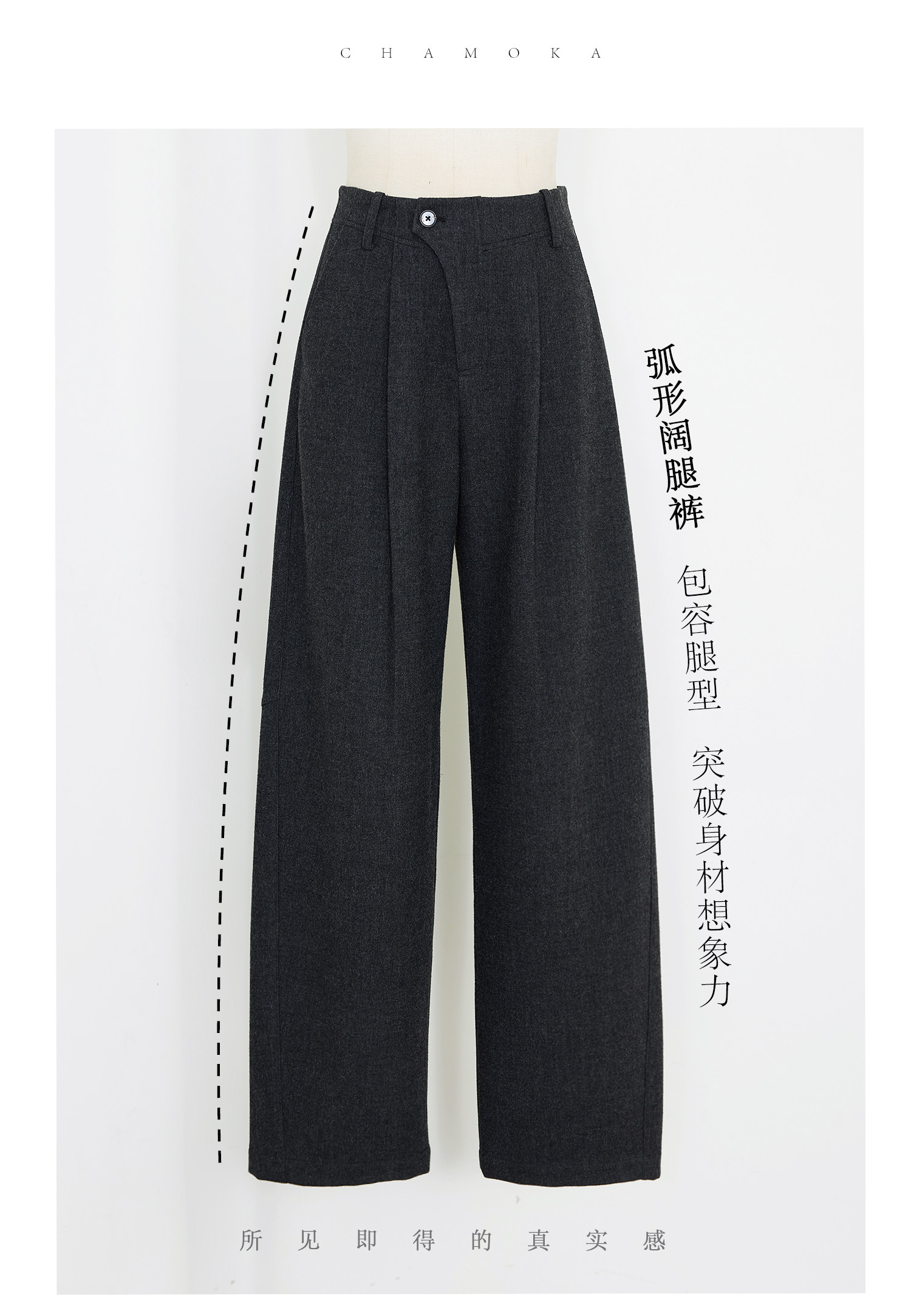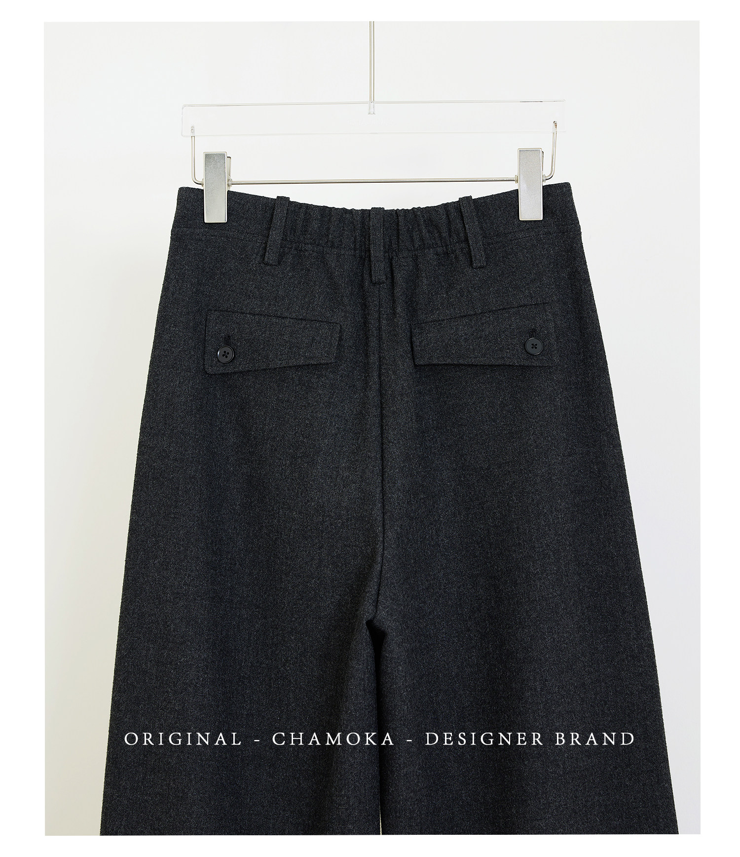 Xia Moka Diagonal Placket Gray Suit Pants for Women, Autumn and Winter, Elastic Waist, Slimming, Curved Pants, Merino Wool Wide-Leg Pants 6855