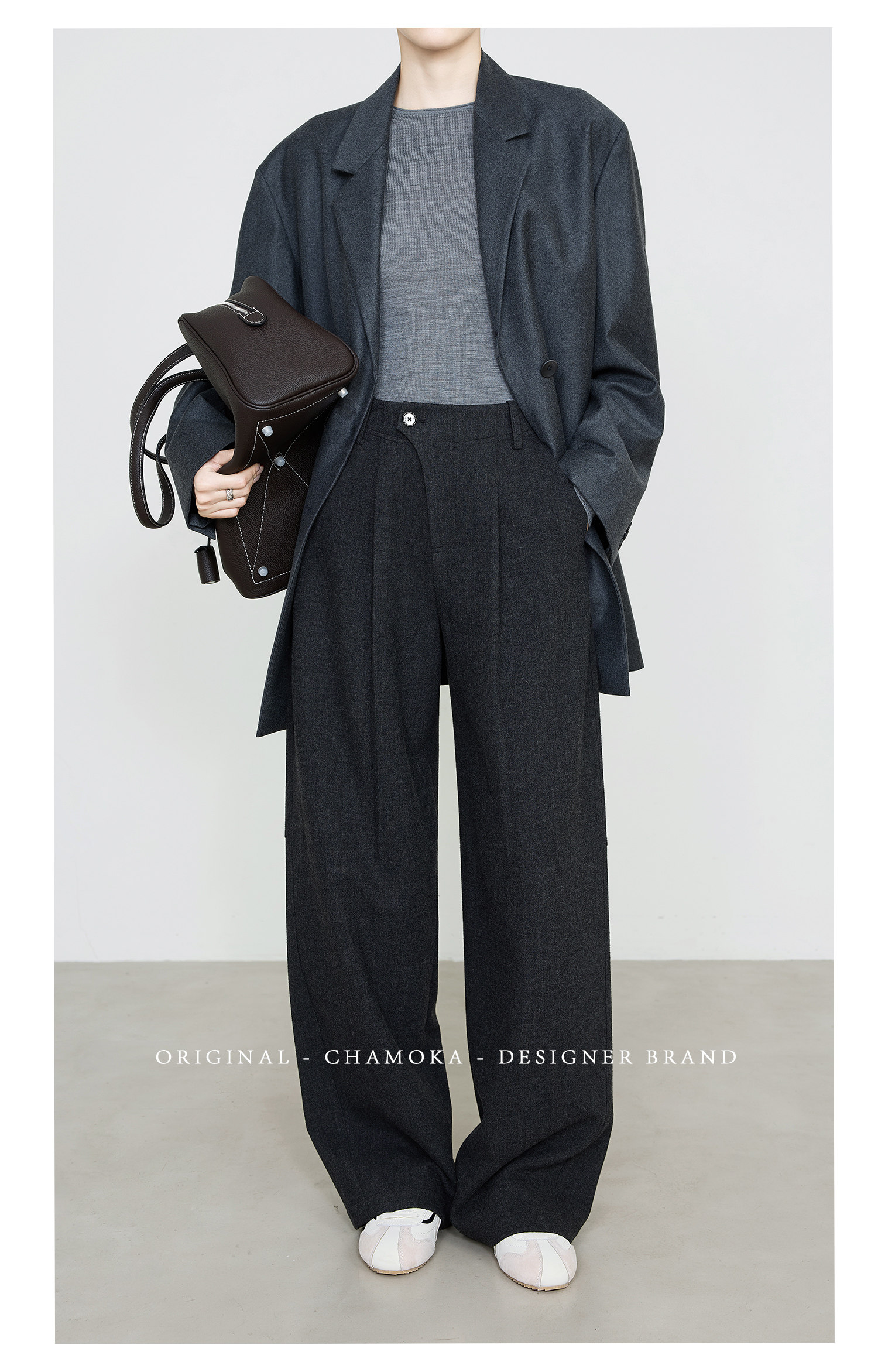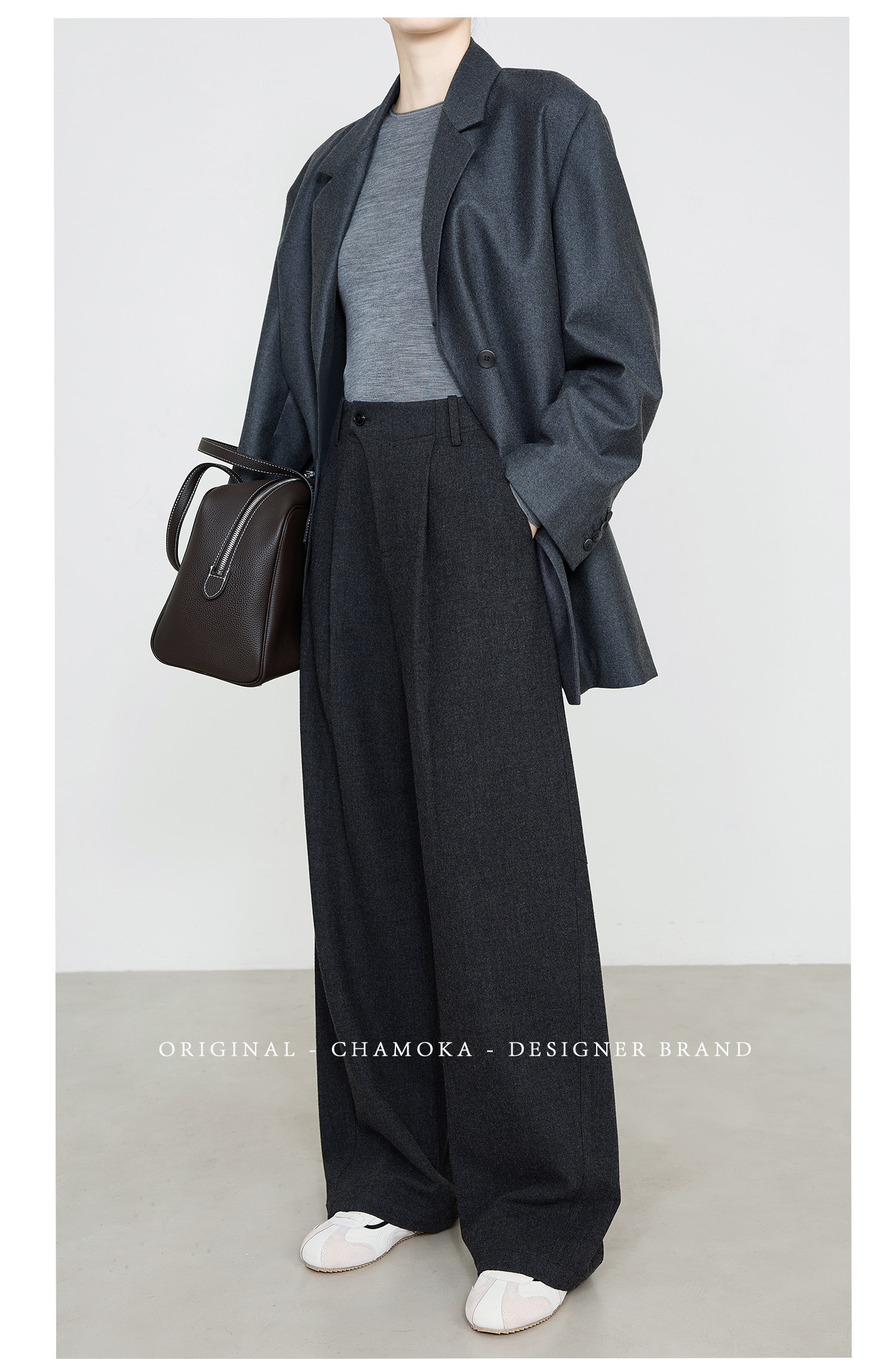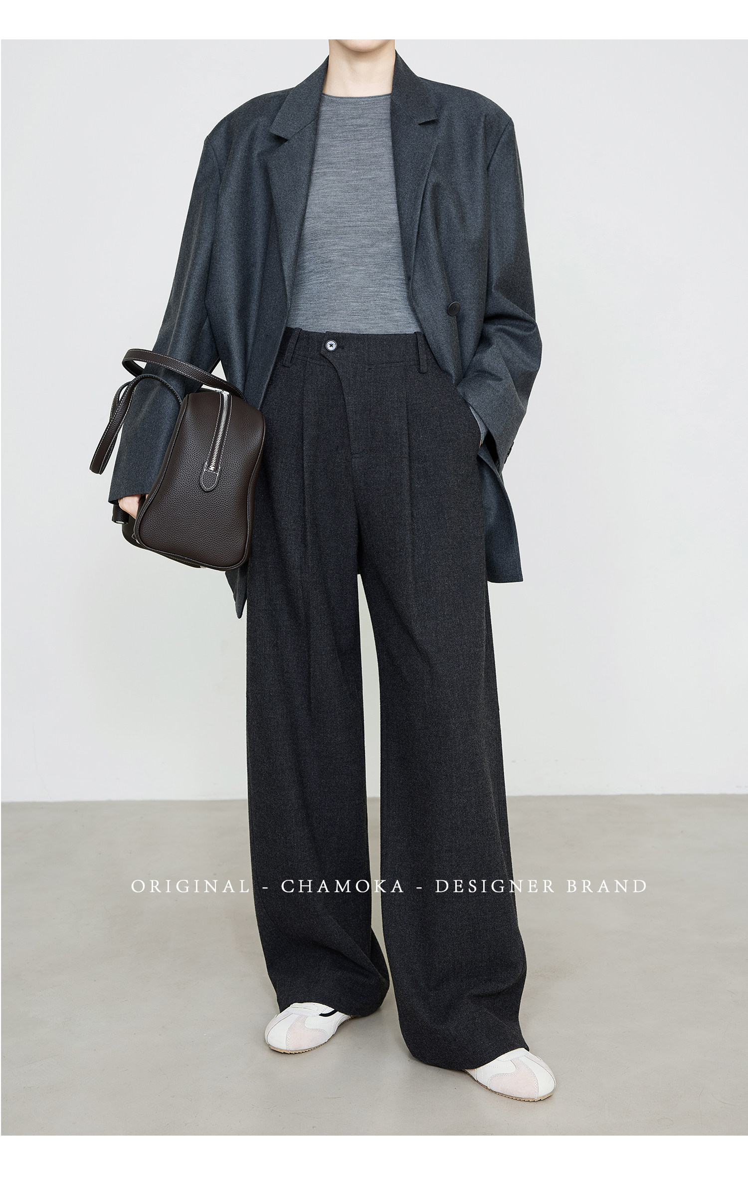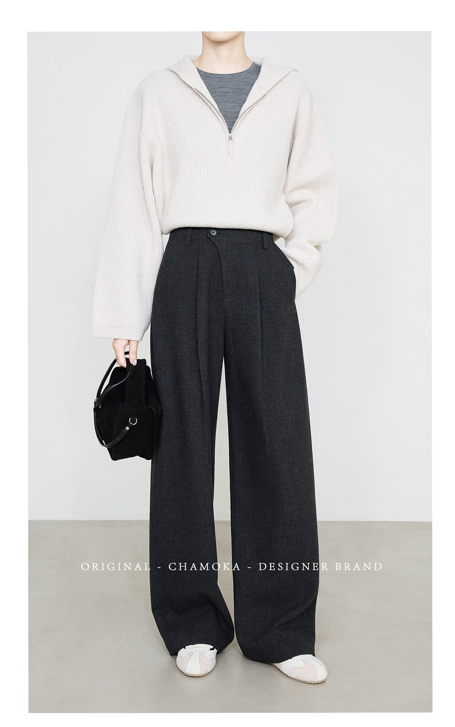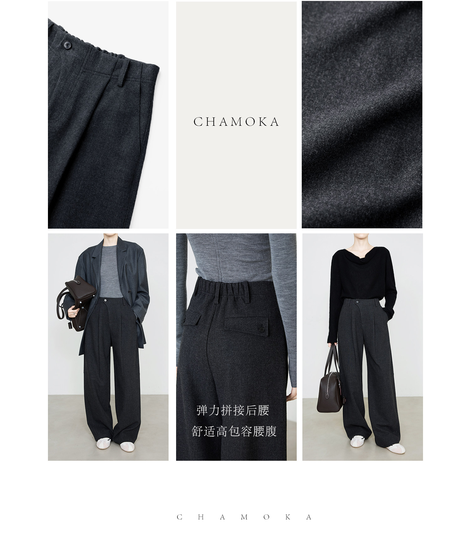 Xia Moka Diagonal Placket Gray Suit Pants for Women, Autumn and Winter, Elastic Waist, Slimming, Curved Pants, Merino Wool Wide-Leg Pants 6855