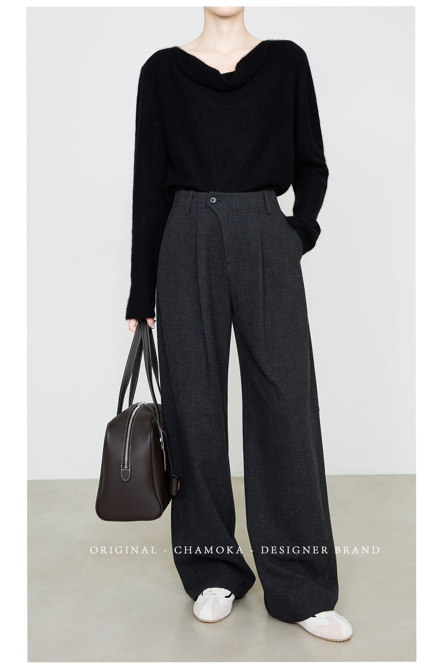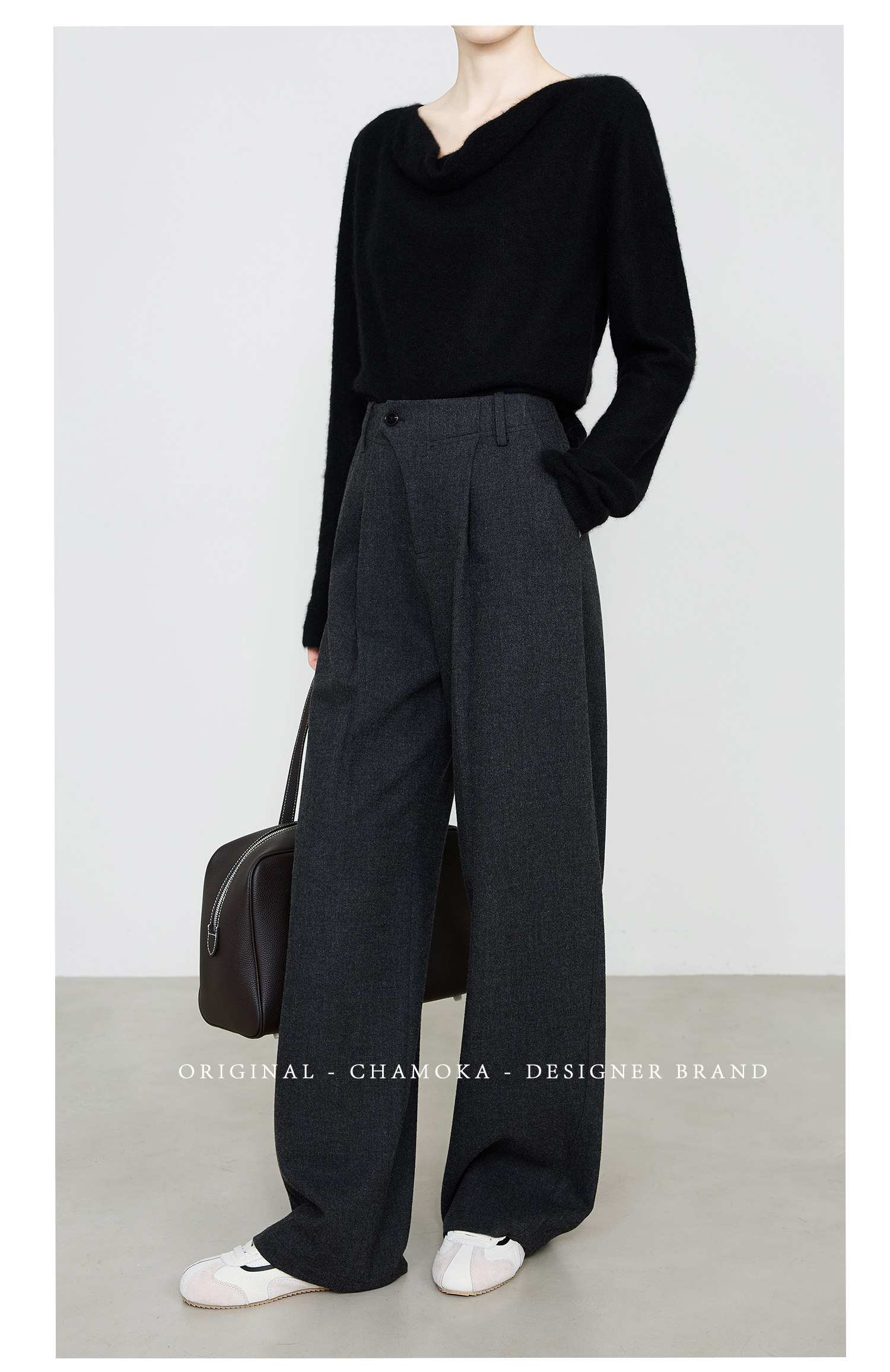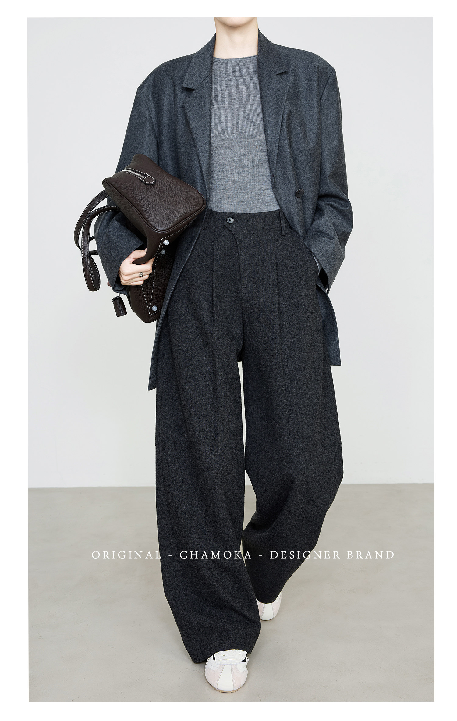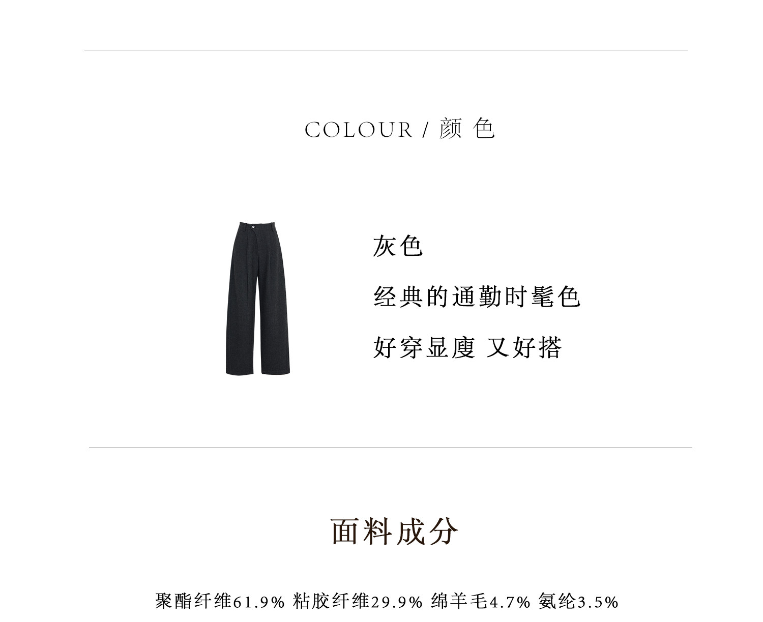 Xia Moka Diagonal Placket Gray Suit Pants for Women, Autumn and Winter, Elastic Waist, Slimming, Curved Pants, Merino Wool Wide-Leg Pants 6855