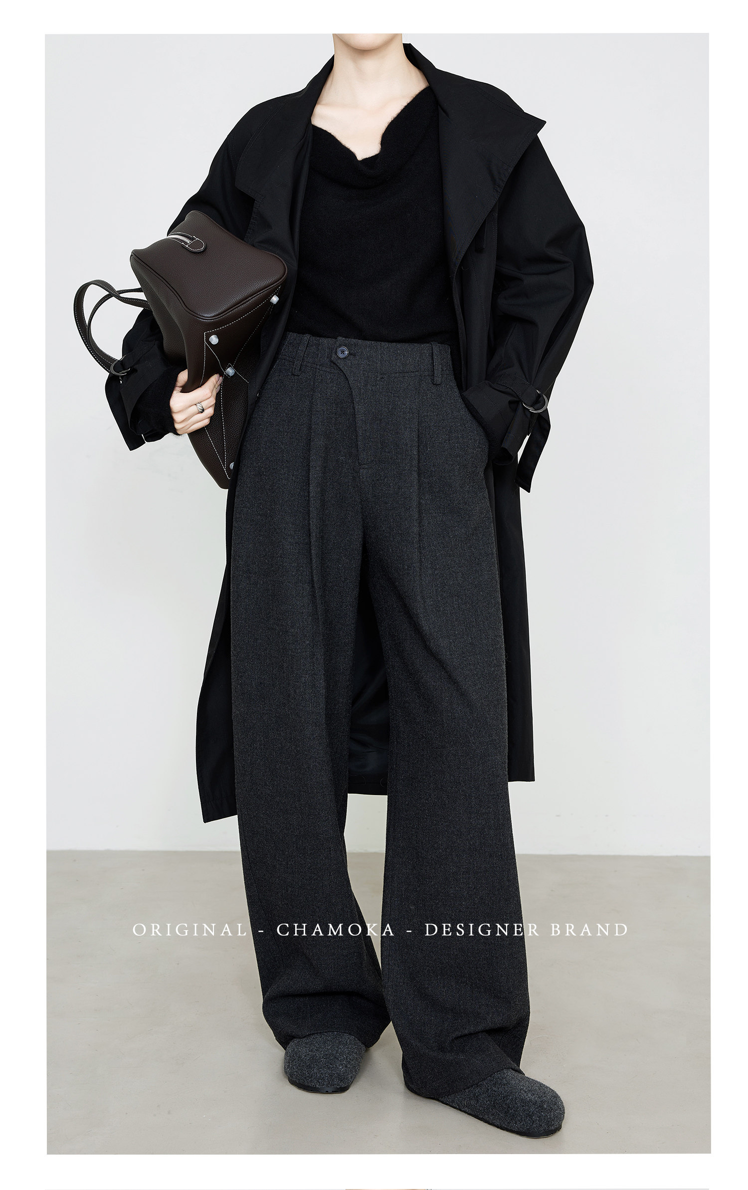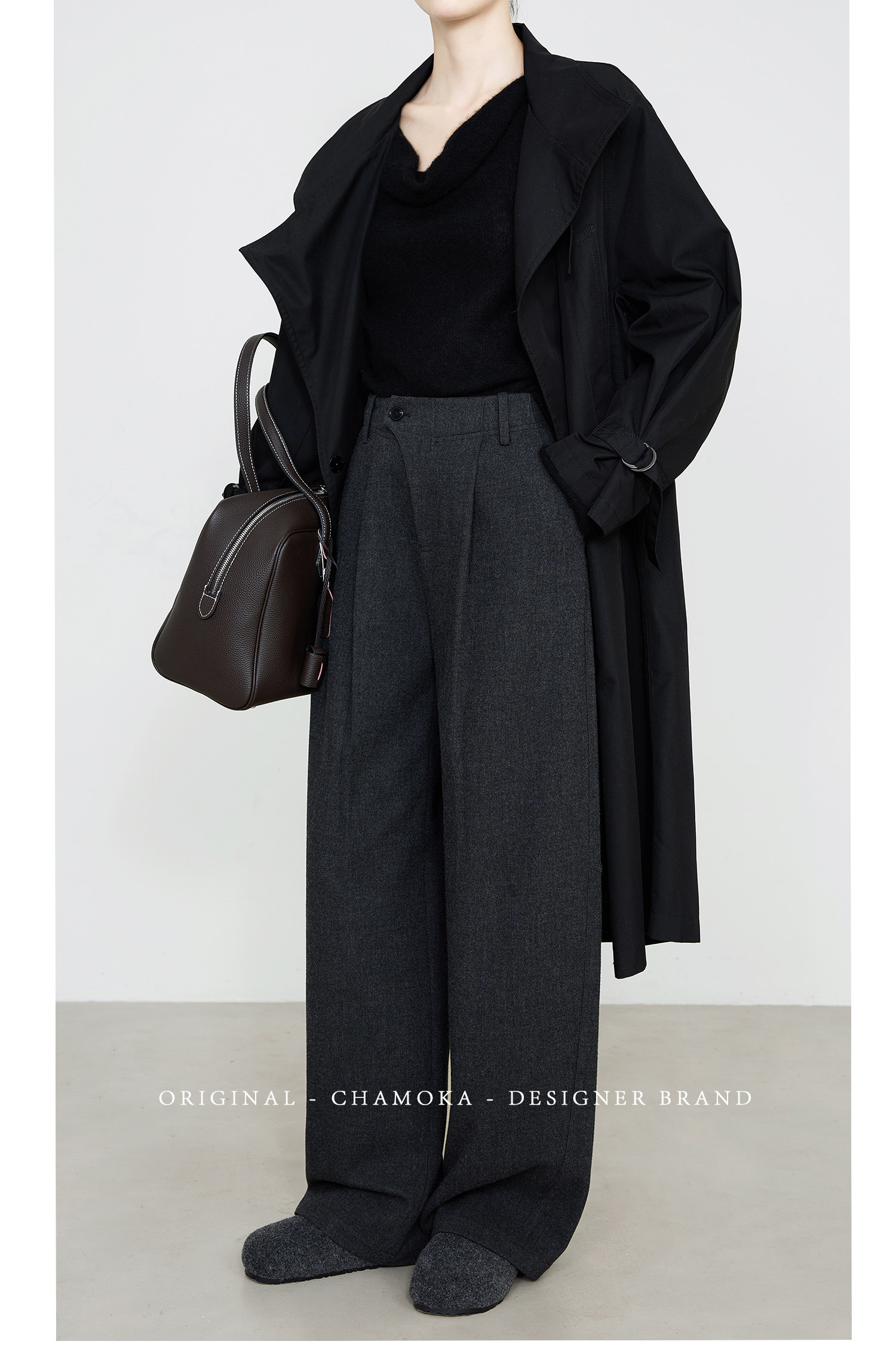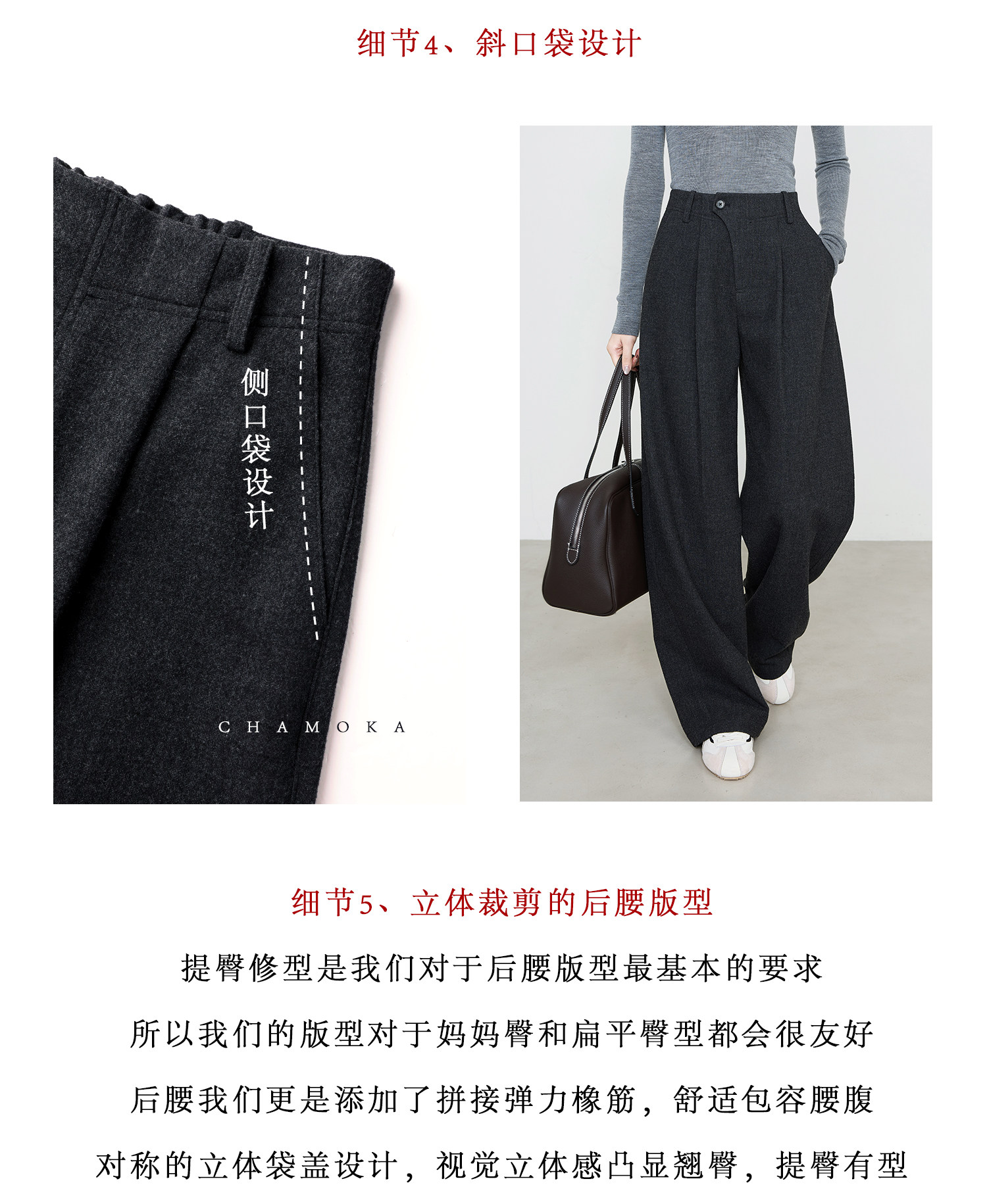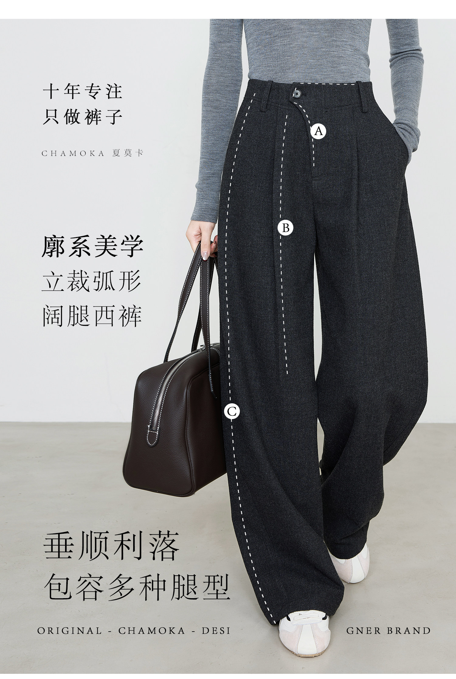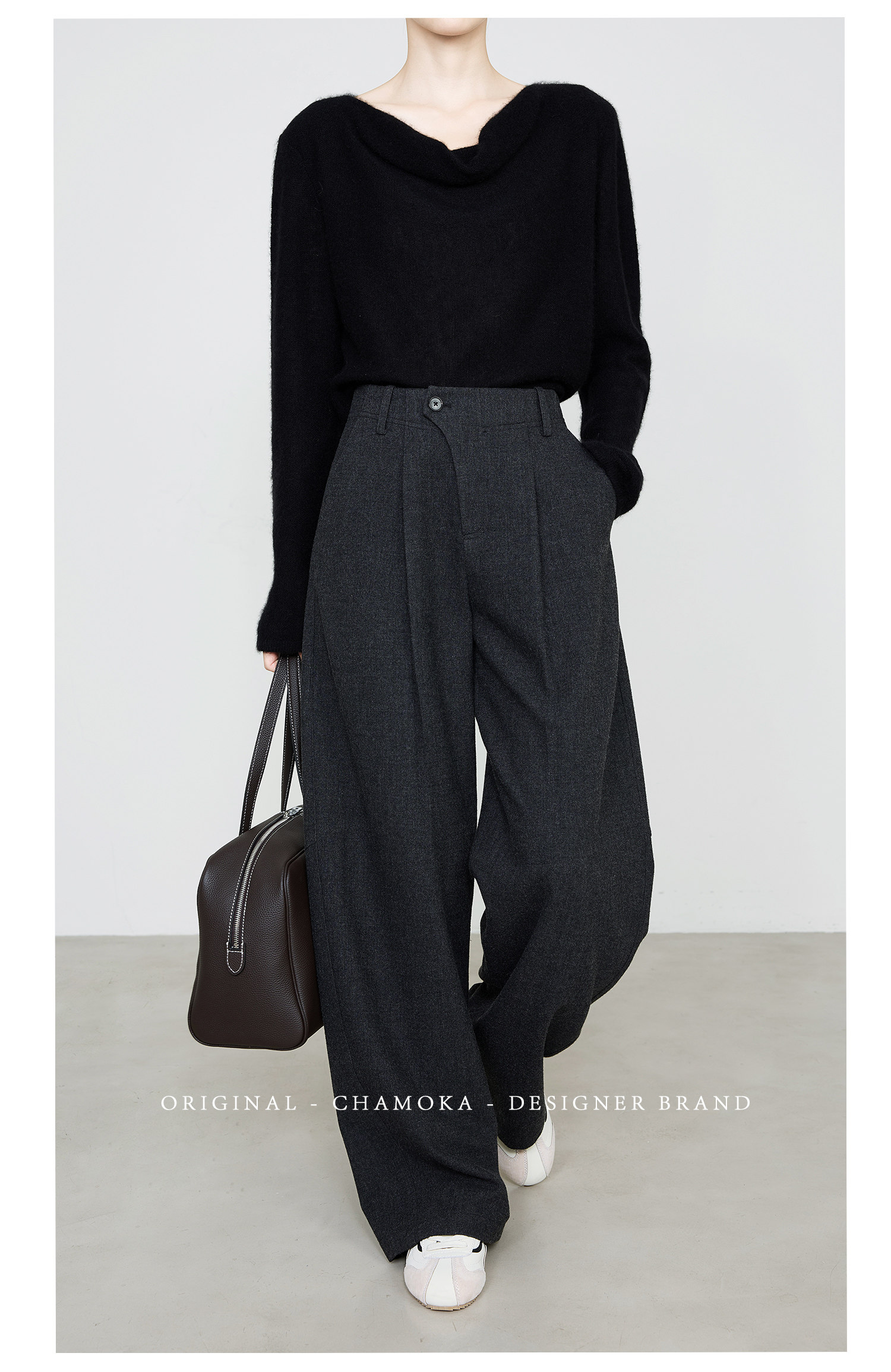 Xia Moka Diagonal Placket Gray Suit Pants for Women, Autumn and Winter, Elastic Waist, Slimming, Curved Pants, Merino Wool Wide-Leg Pants 6855