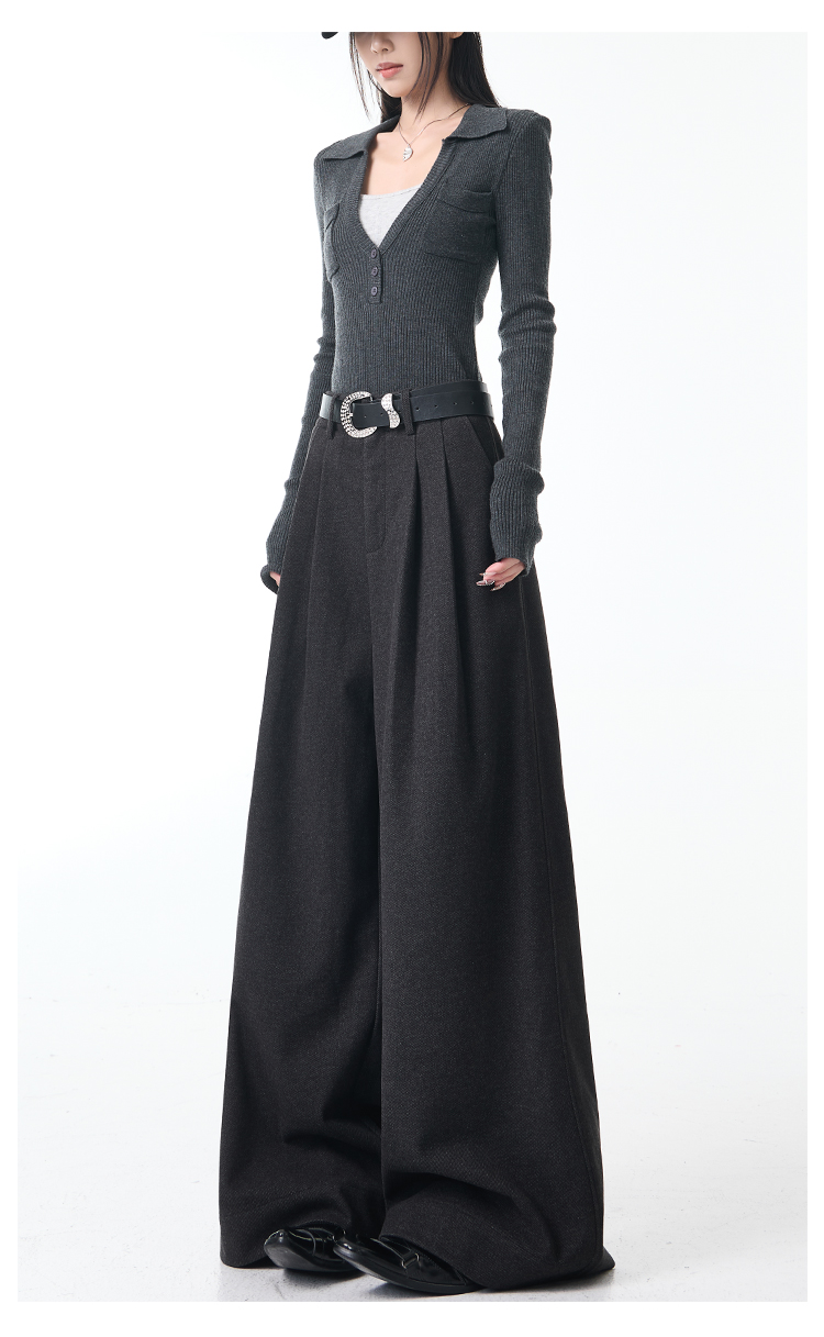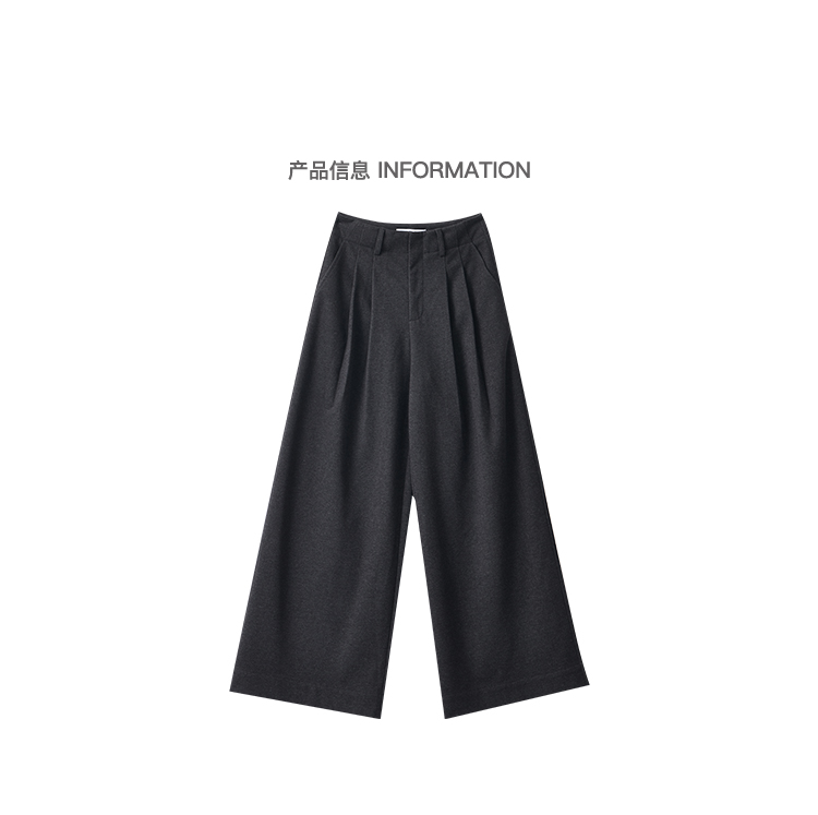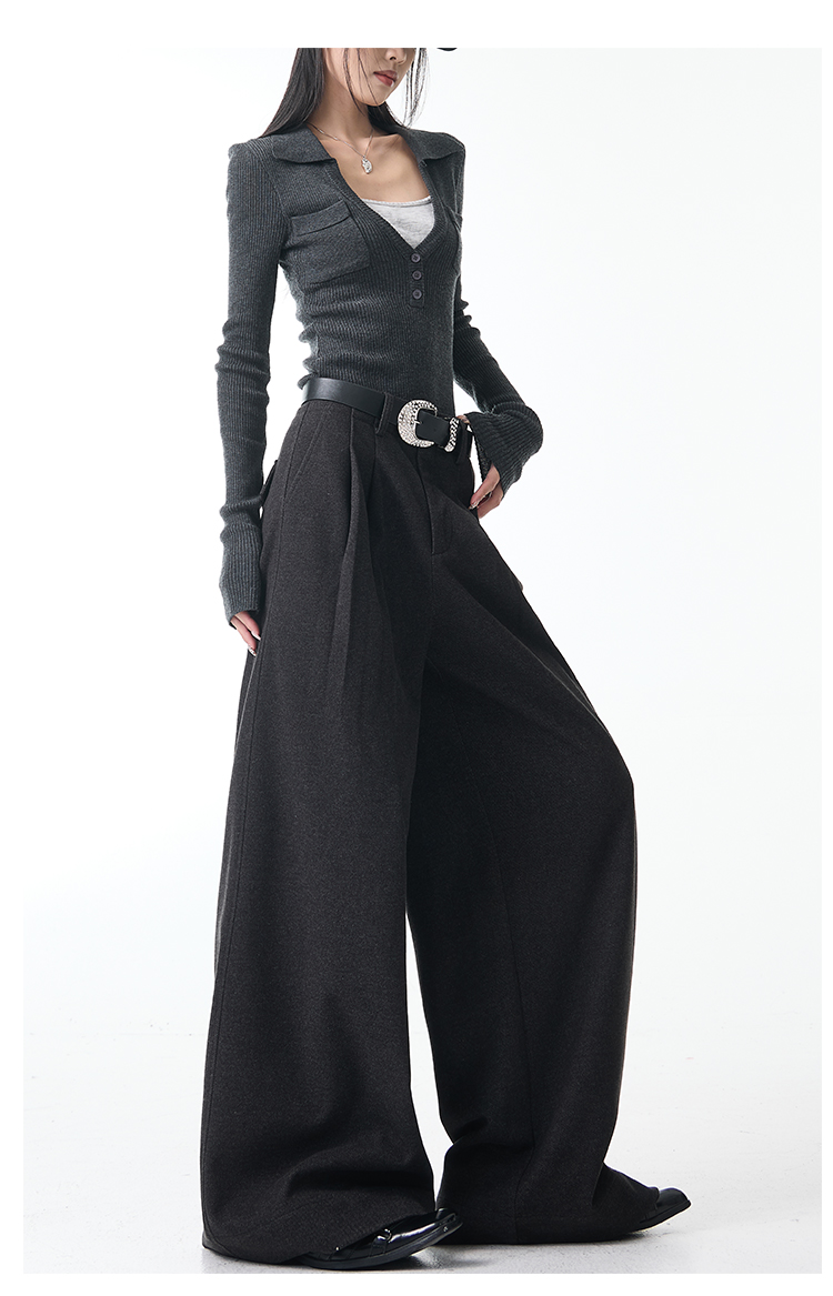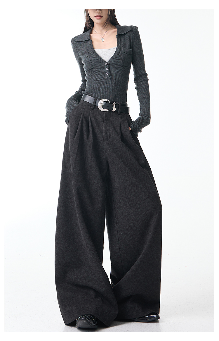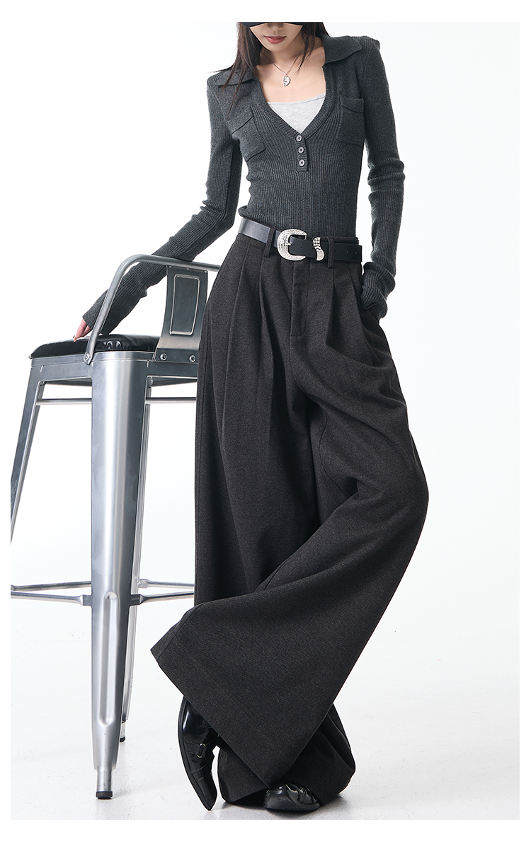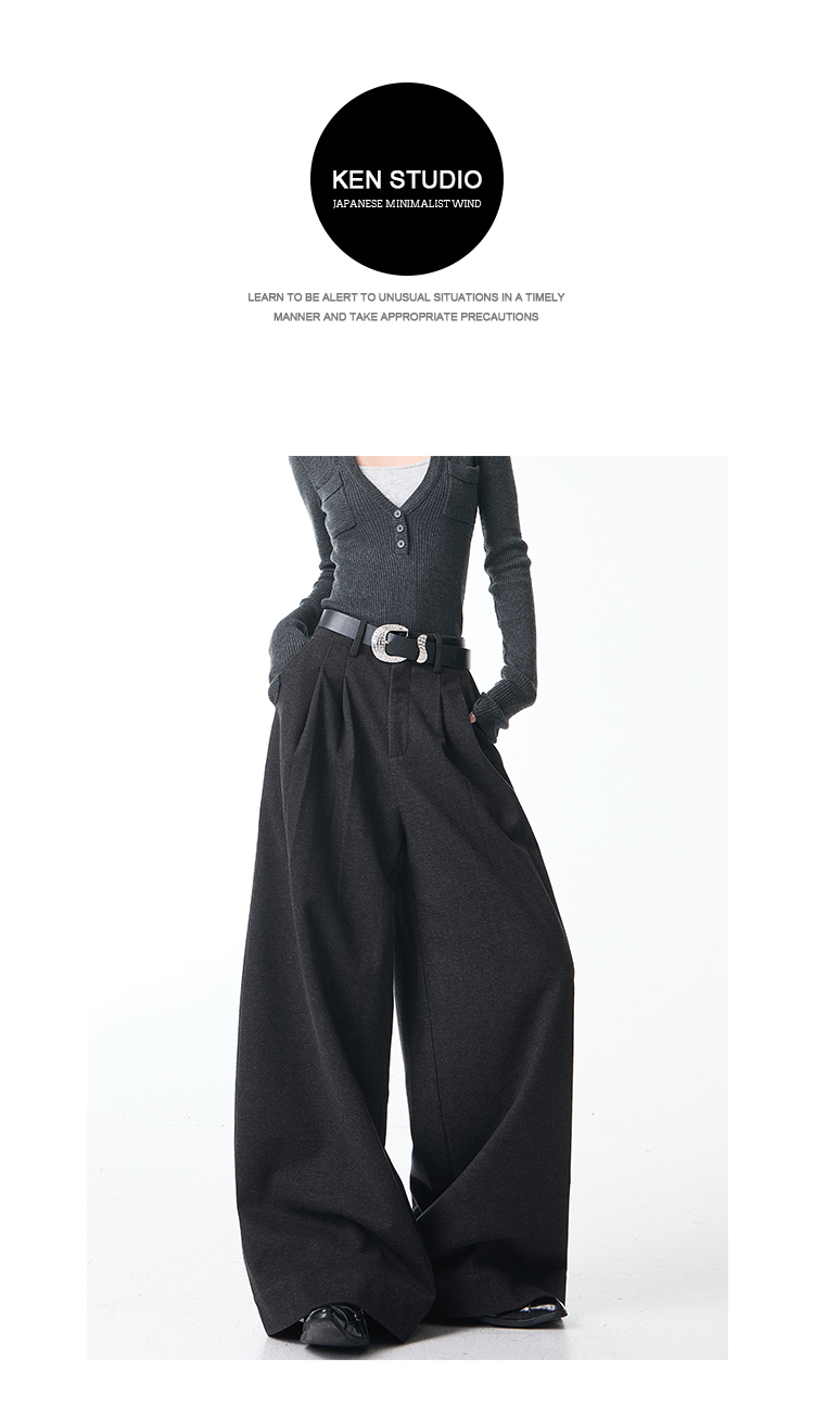 Ken Studio New Autumn and Winter Gray Thickened Wool Pleated Suit Pants for Women, High-Waisted, Loose and Drapey Wide-Leg Pants