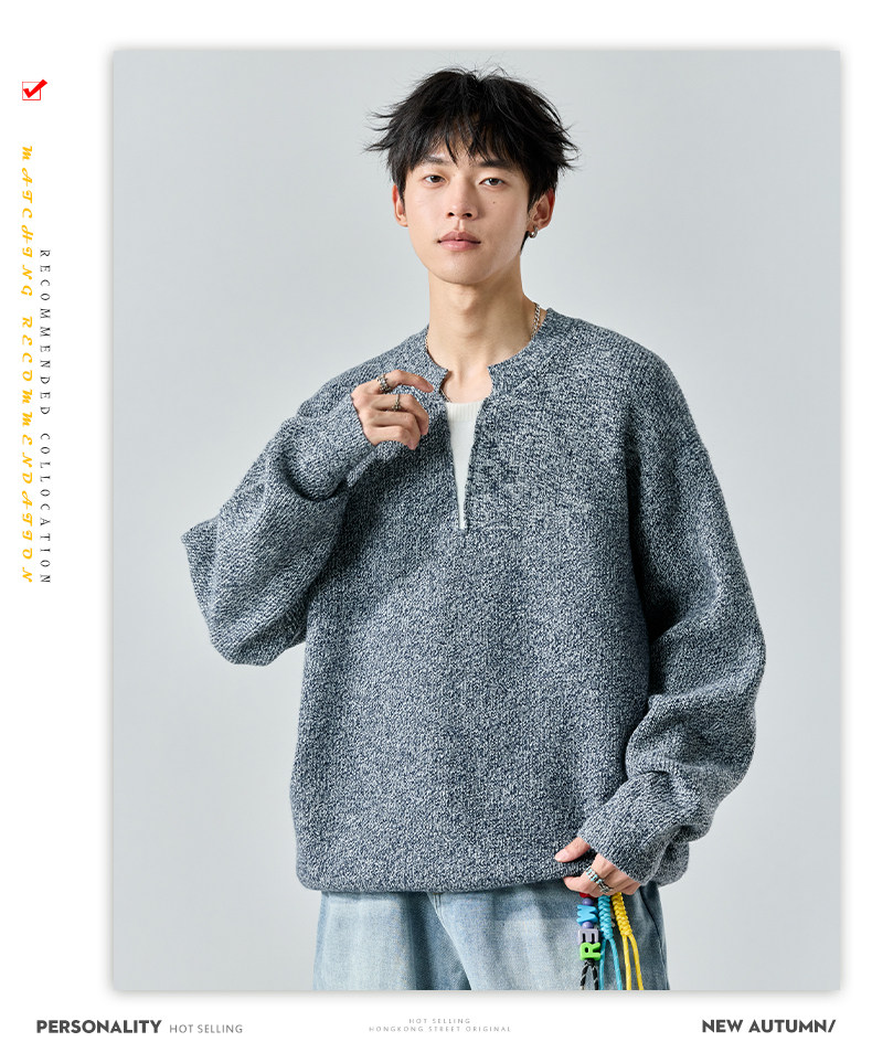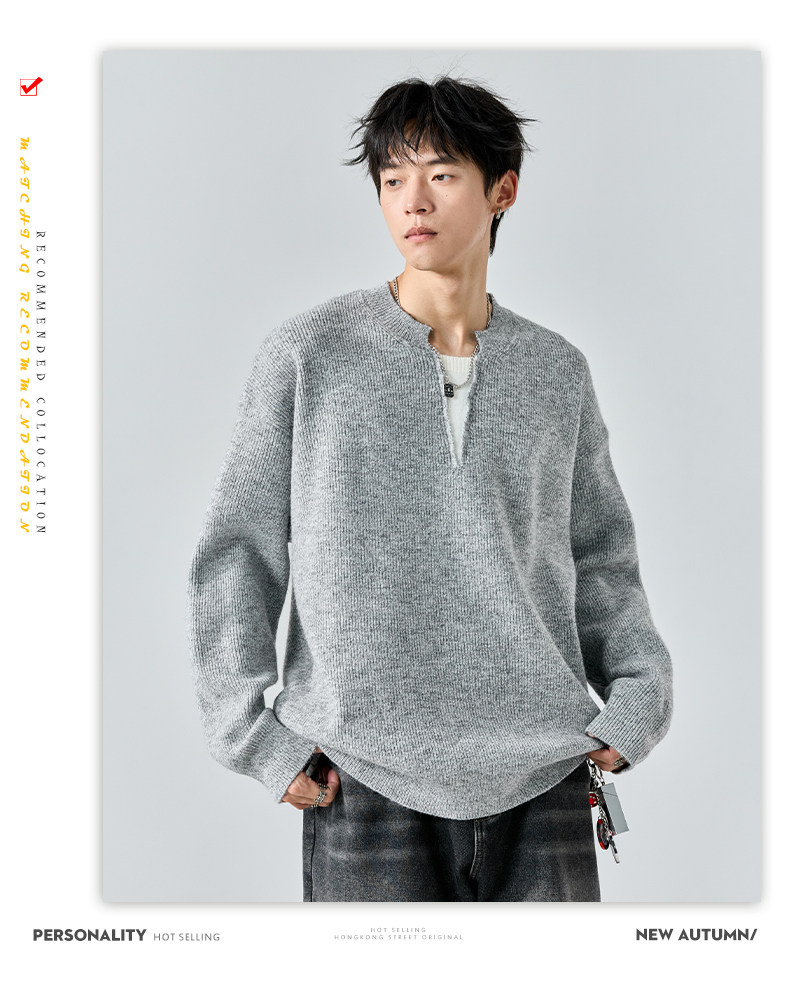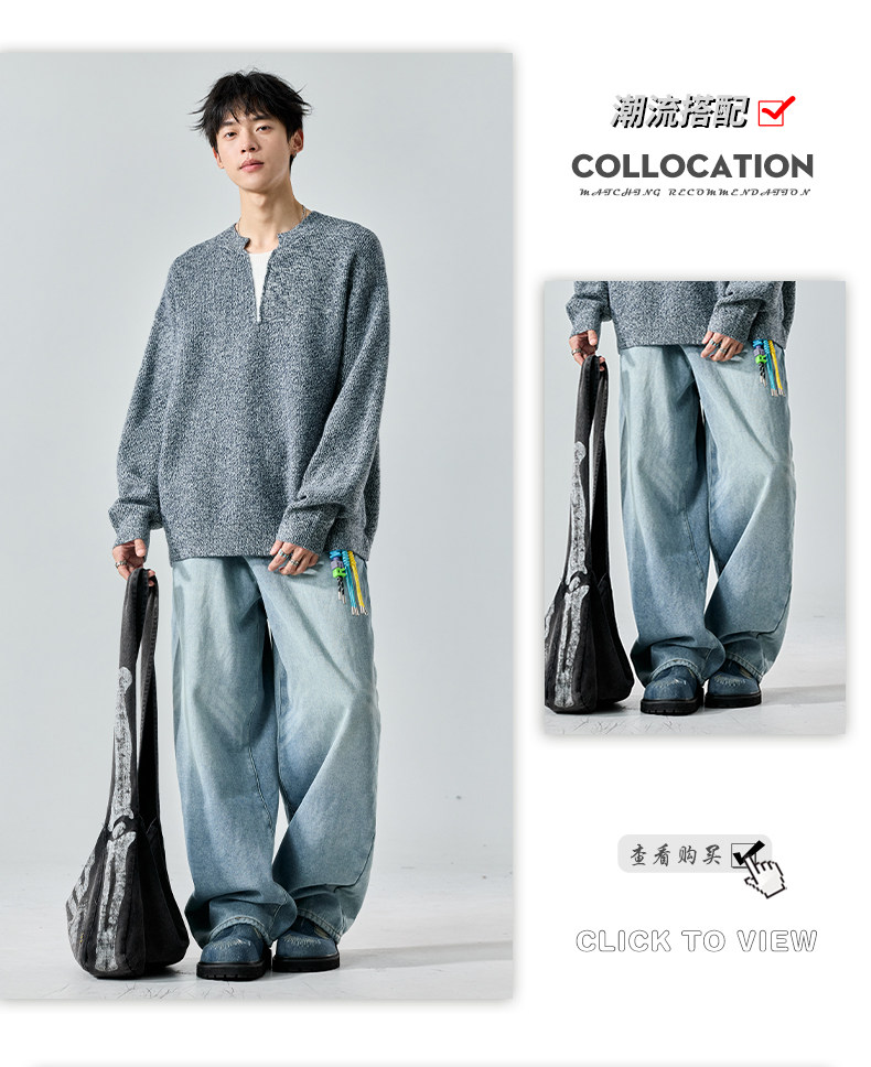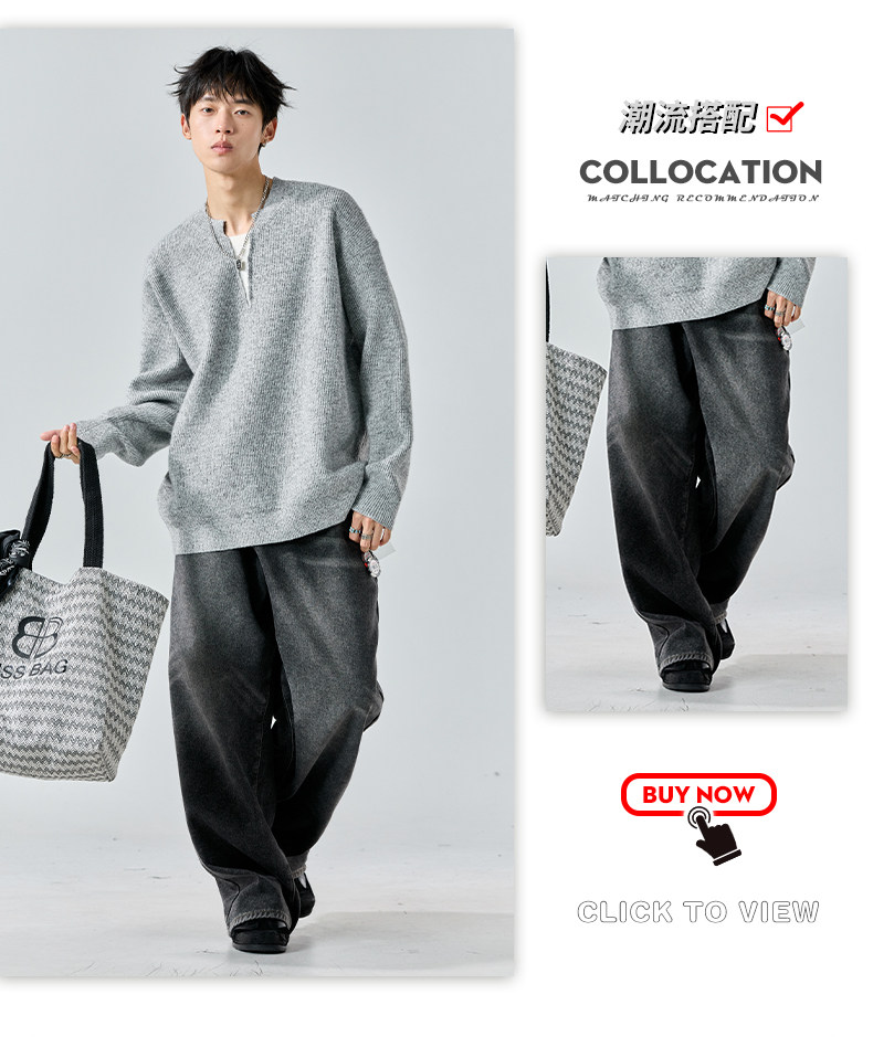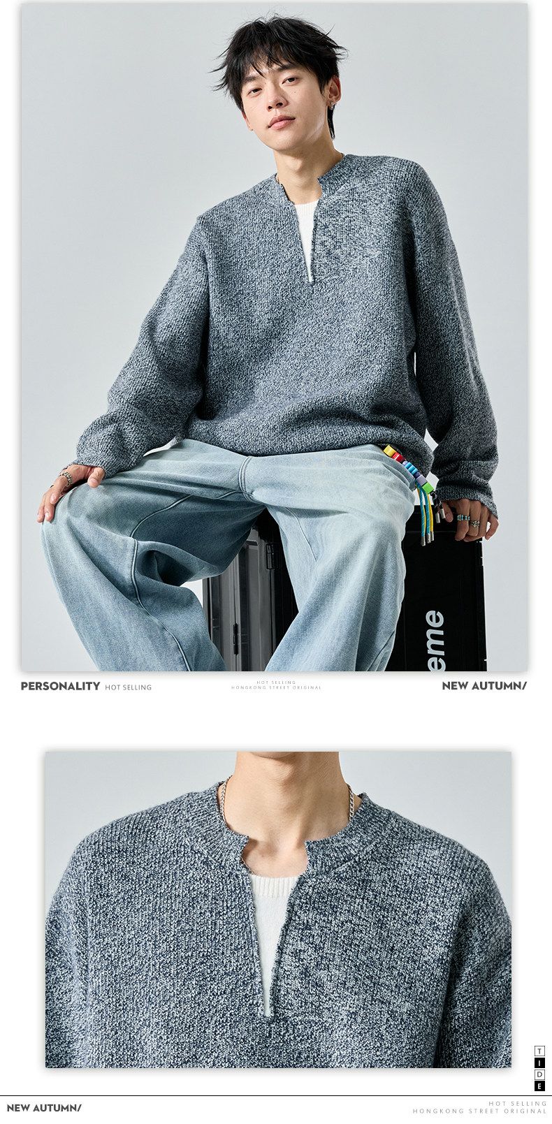 Men's Autumn Outfit: Japanese-Style Color-Blocked V-Neck Sweater Paired with Black Jeans, Giving a High-End and Cool Look