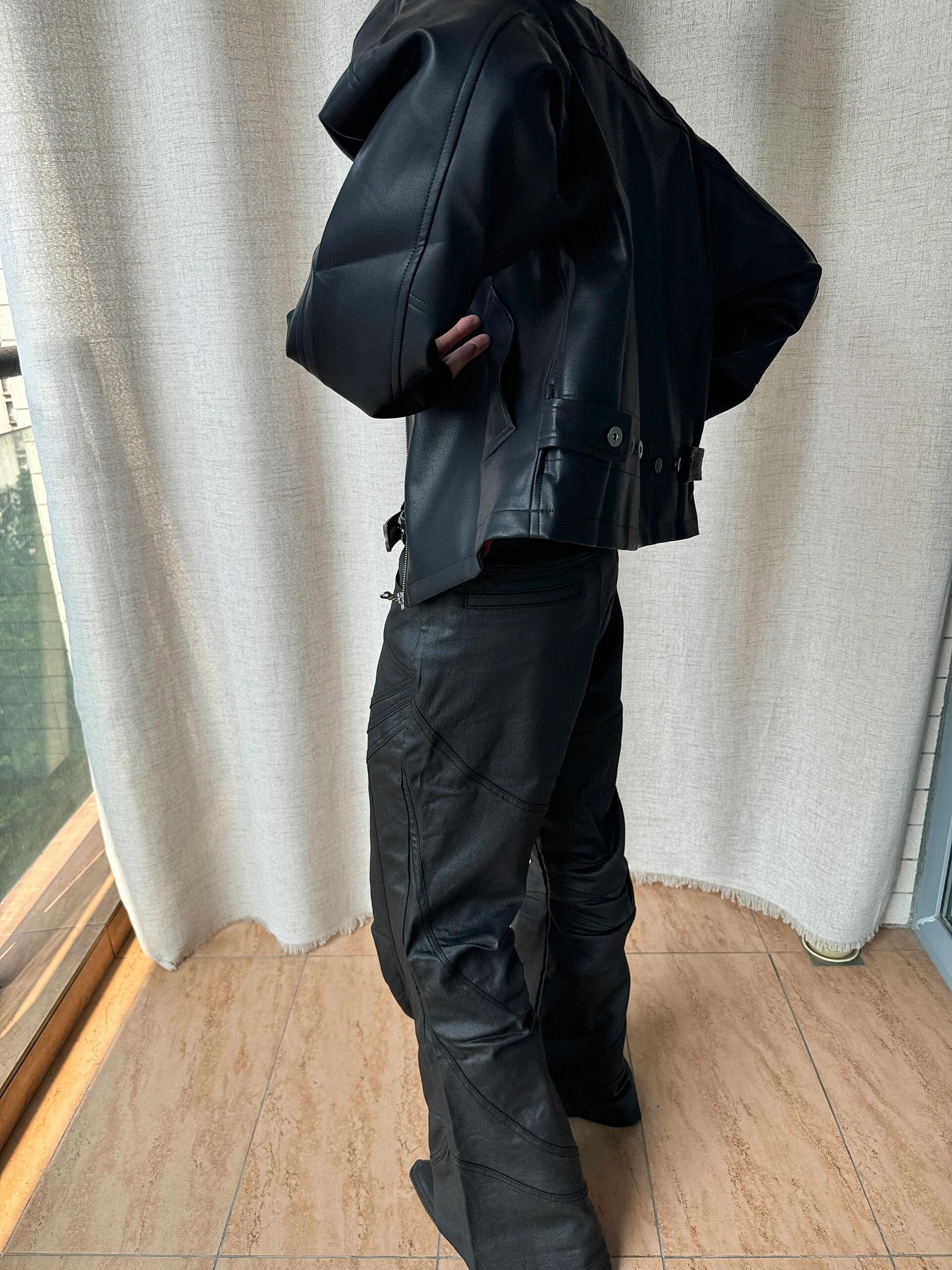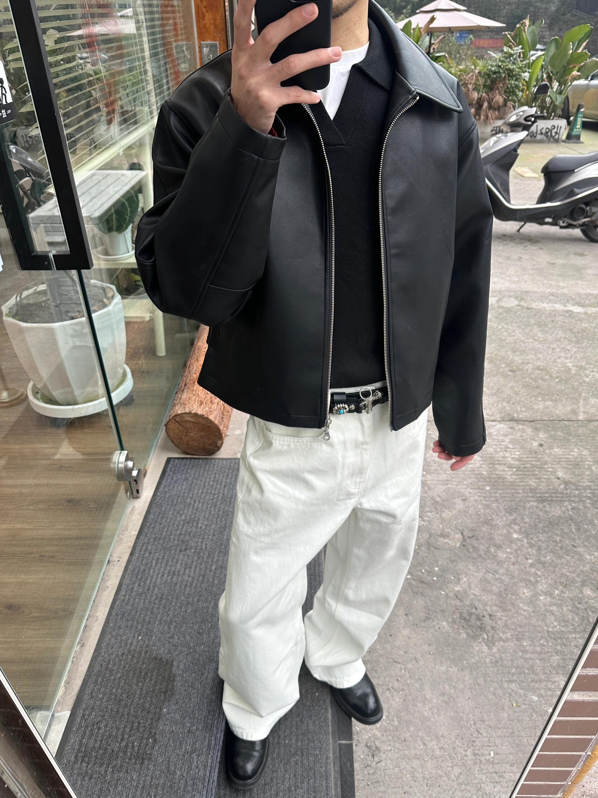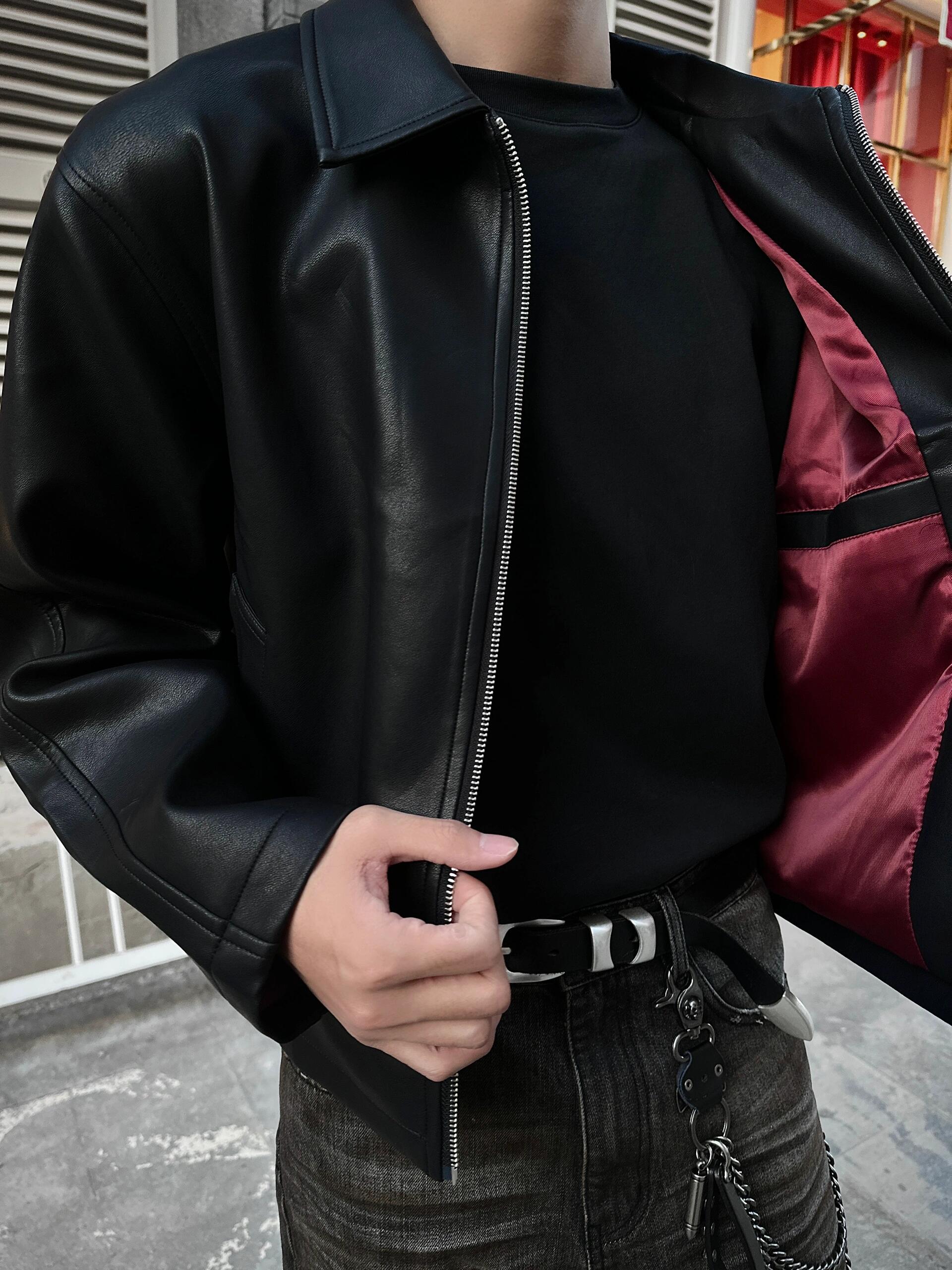 Ankora Red Lining Textured Pu Leather Short Wide Black Leather Jacket Cleanfit Unisex Jacket Intent