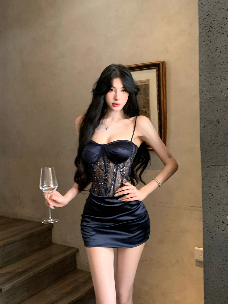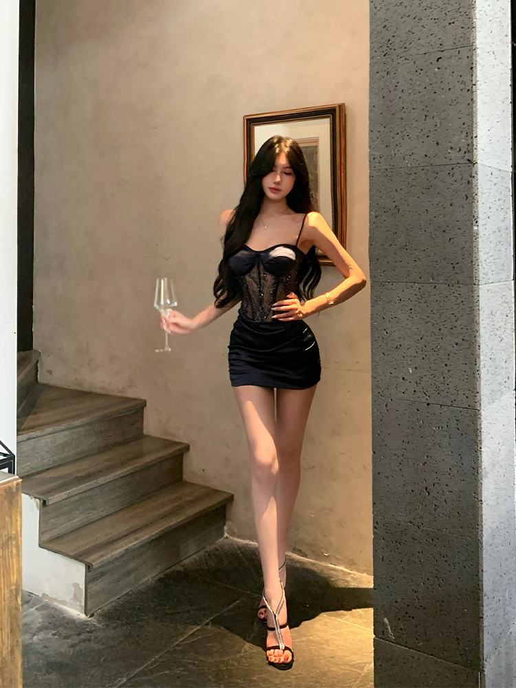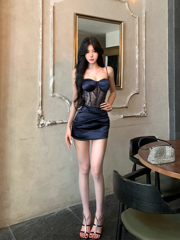 Light Luxury Pure Desire Style Sequin Mesh Fishbone Strap Dress for Women, Autumn Design, Slim Fit, Bodycon Short Skirt