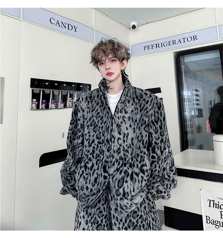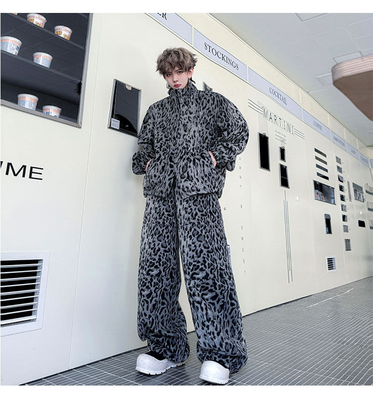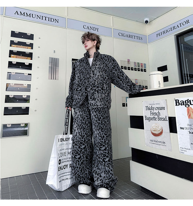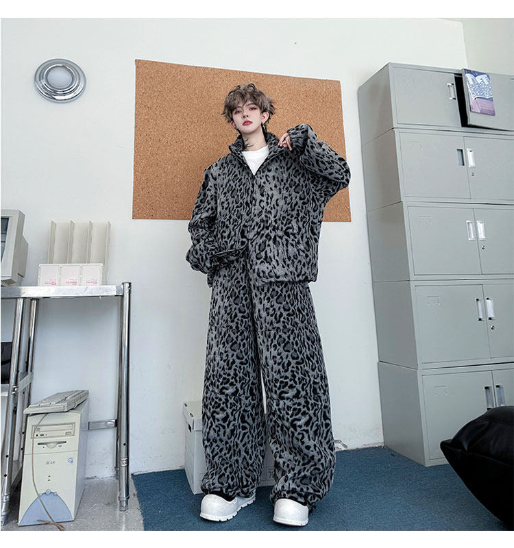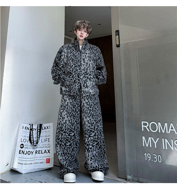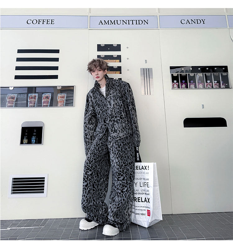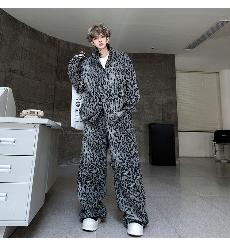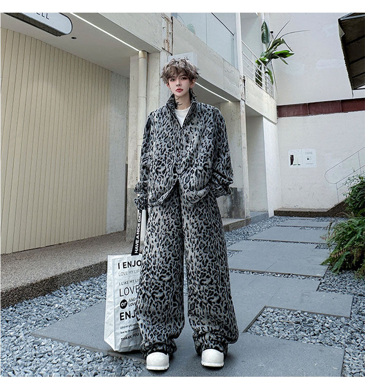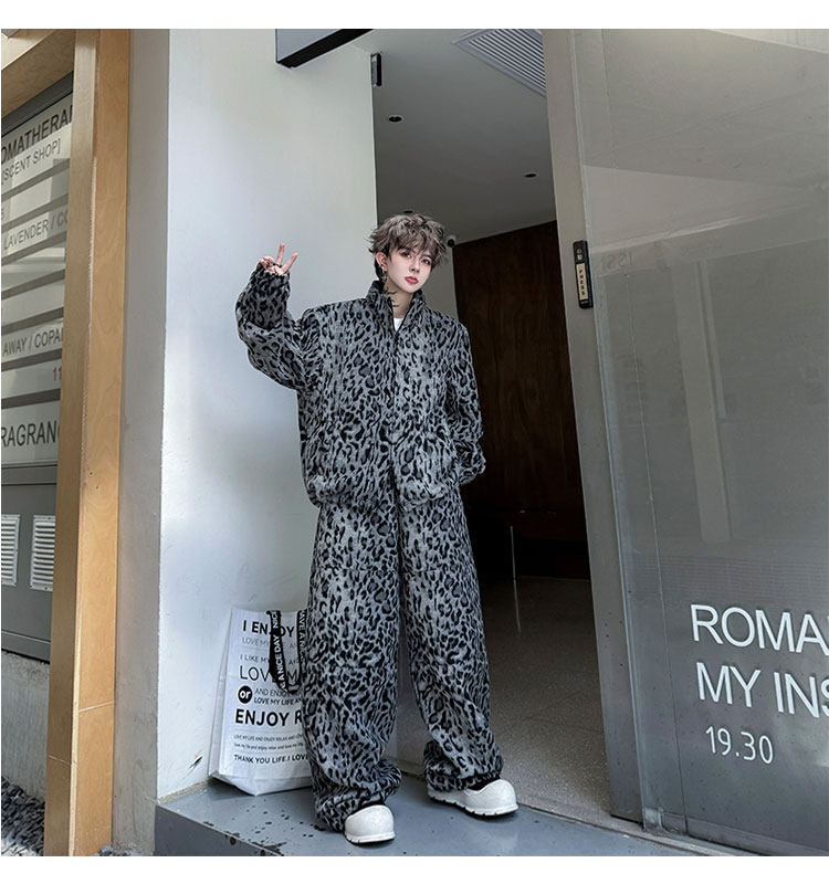 2025 Autumn/Winter Retro Stand-Up Collar Leopard Print Double Zipper Sweatshirt Set for Men with Straight-Leg Pants Casual Two-Piece Set