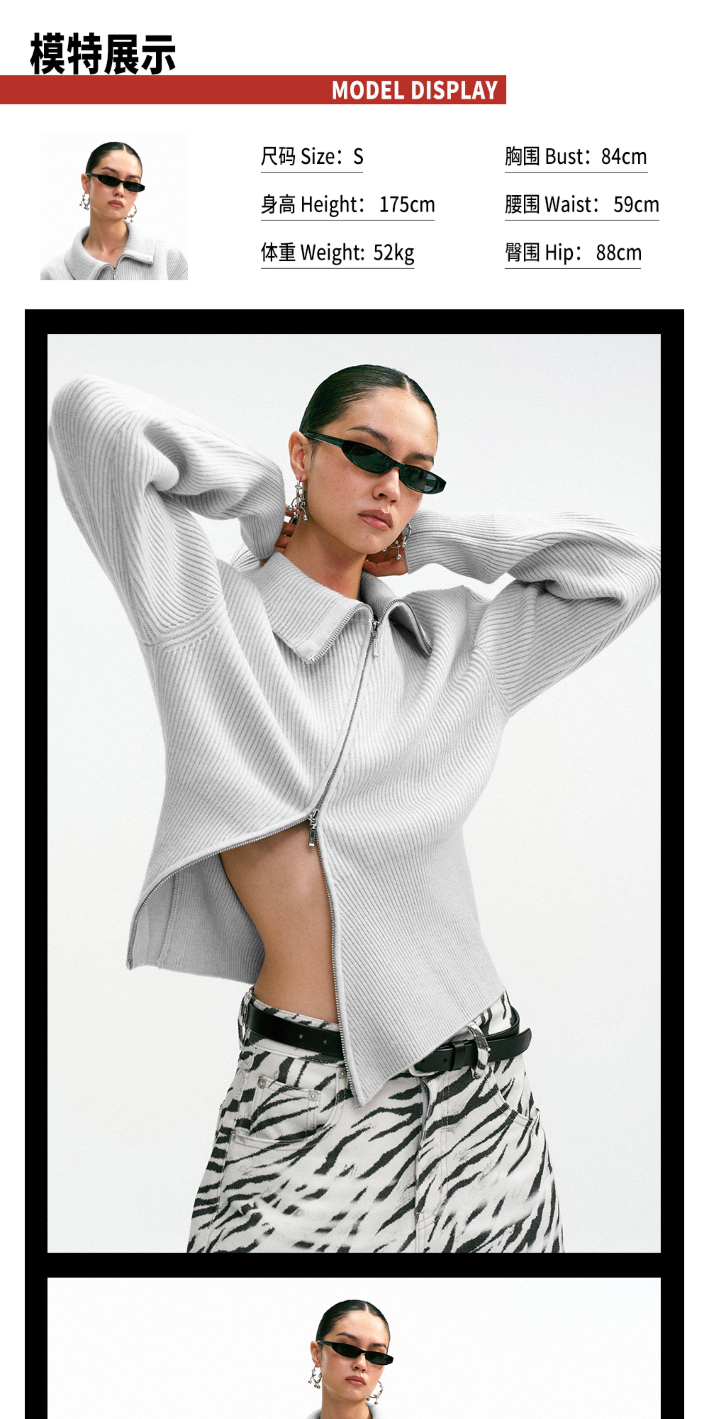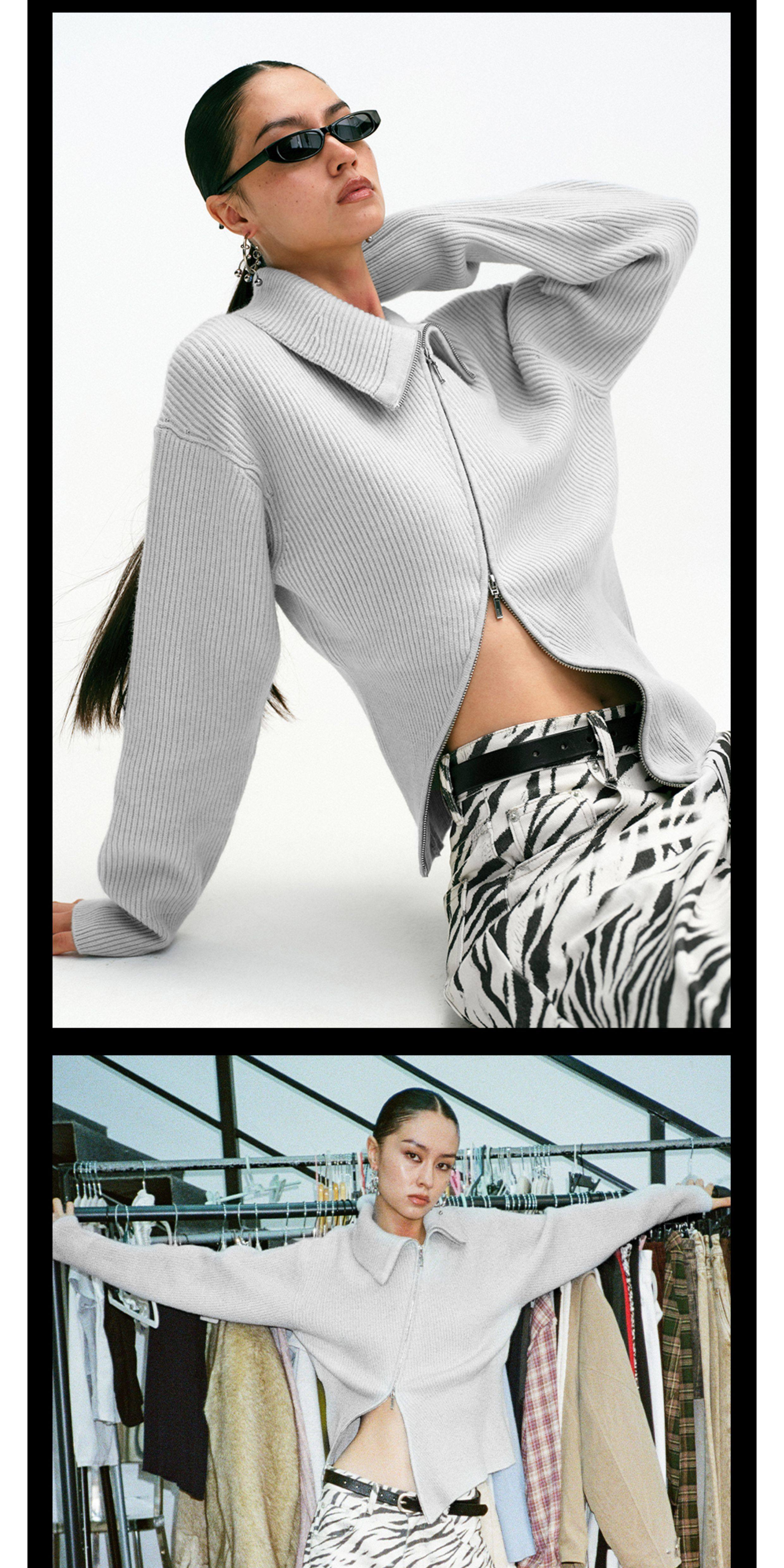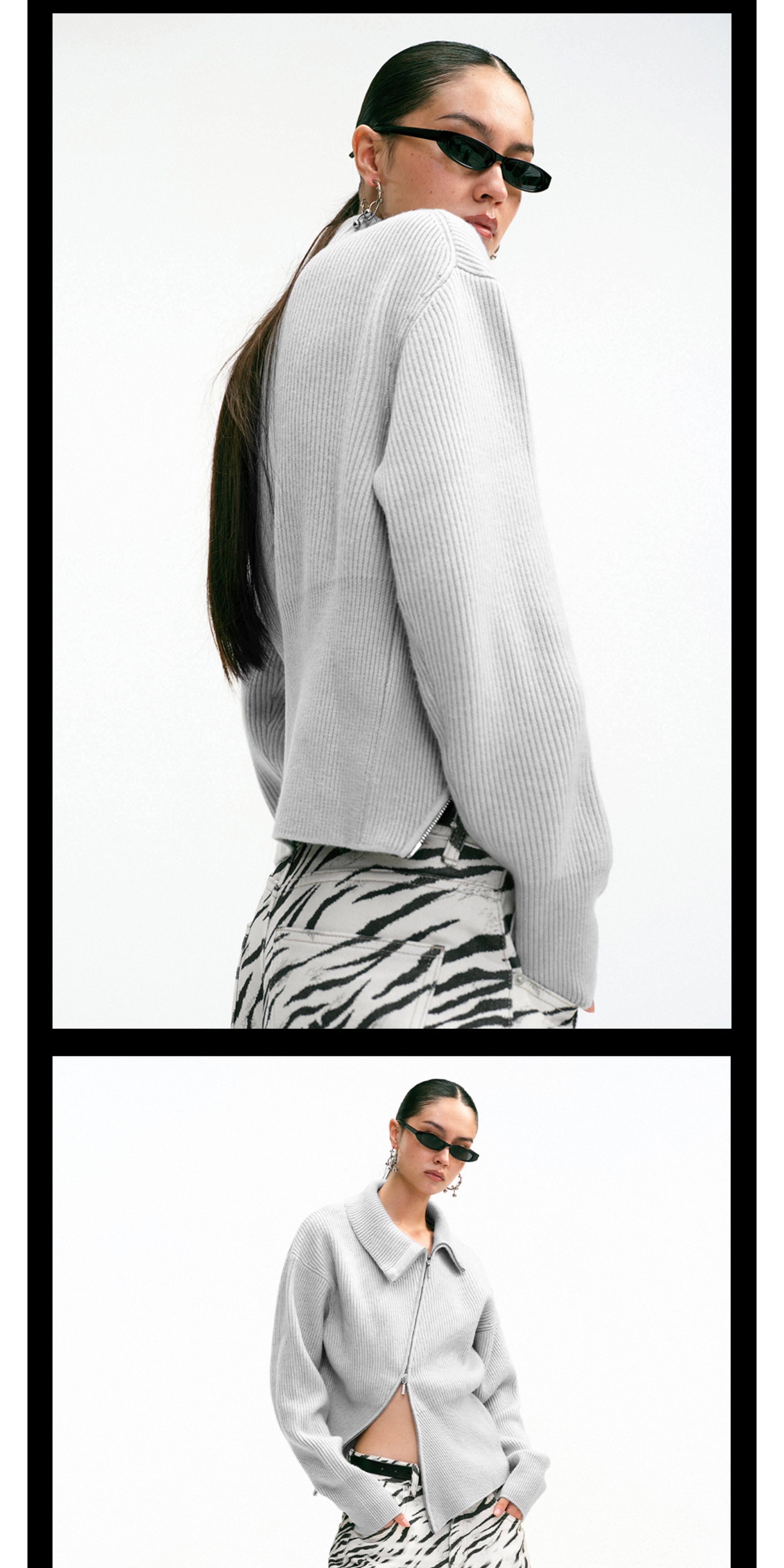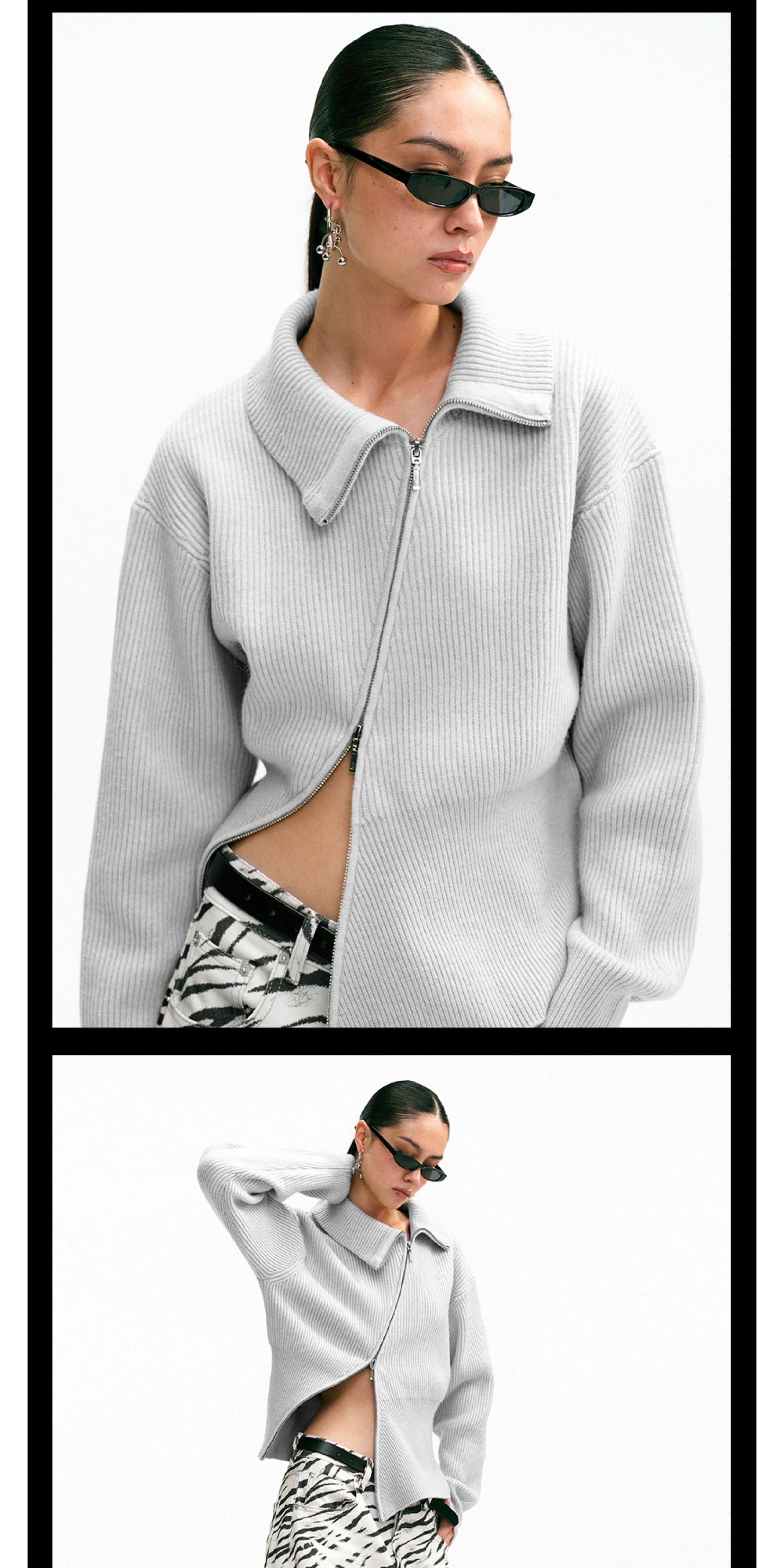 Tr She's Hot Street Diary Gray Diagonal Zipper Vintage Slimming Waist-Cinching Versatile Knitted Cardigan Outerwear