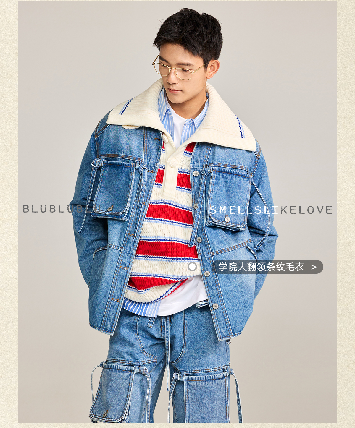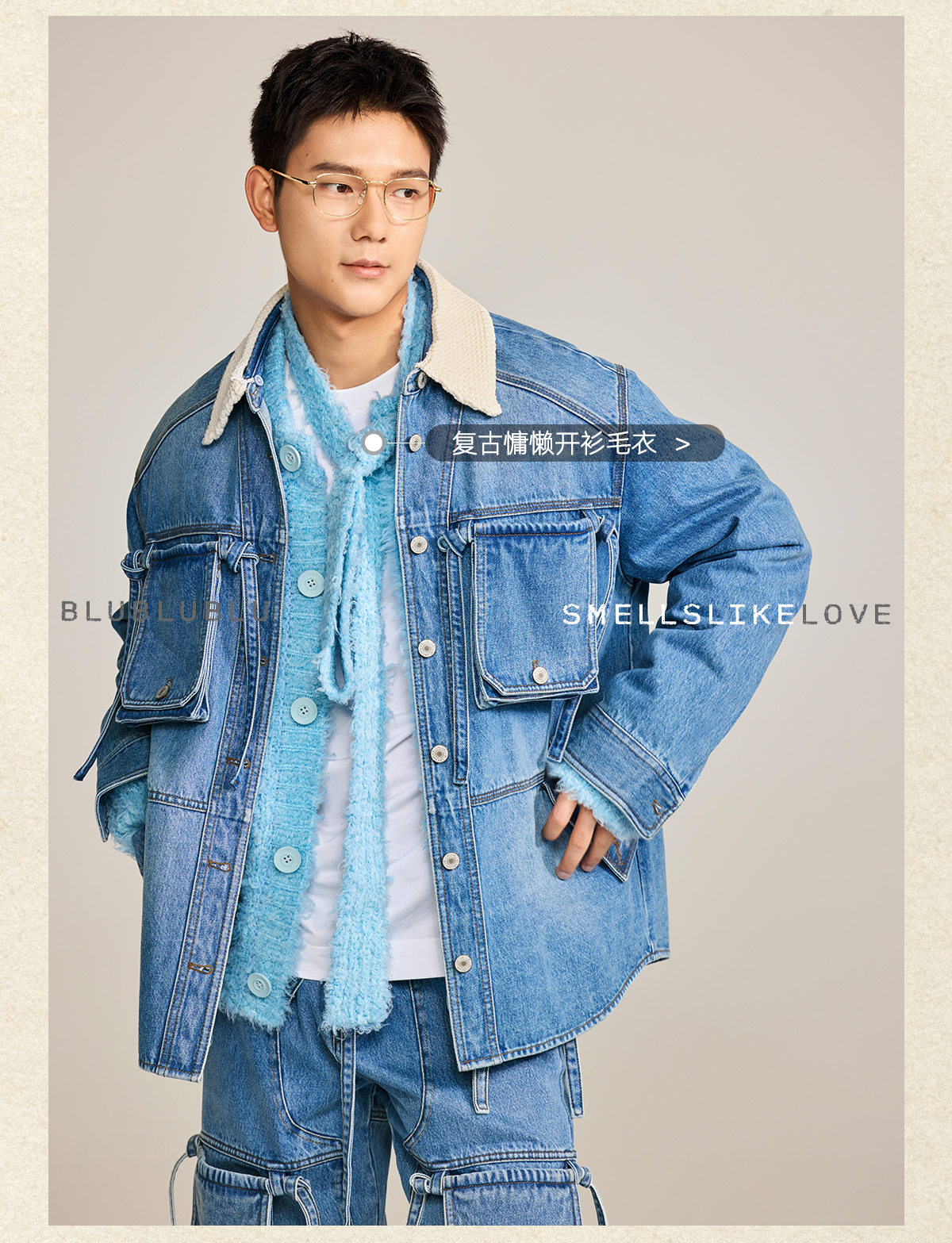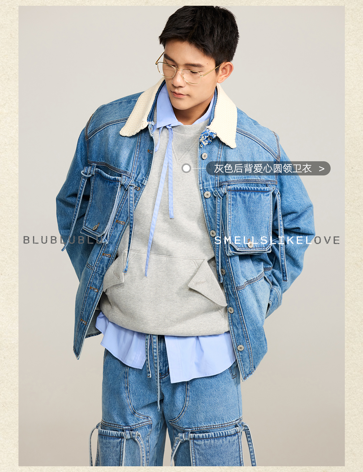 Blublublu Niche Design Men's Workwear Style Retro Denim Jacket Autumn and Winter Distressed Washed Loose Jacket