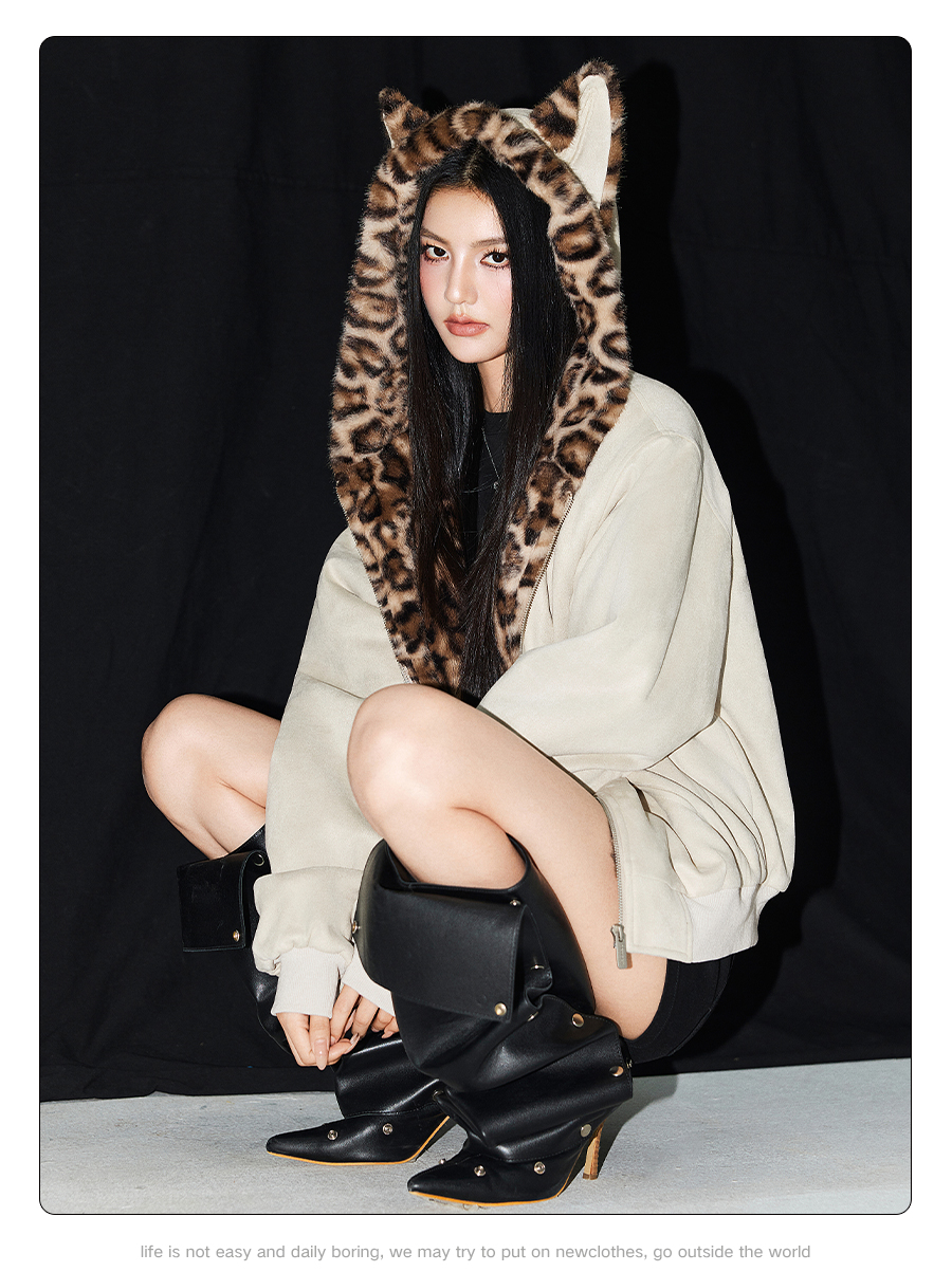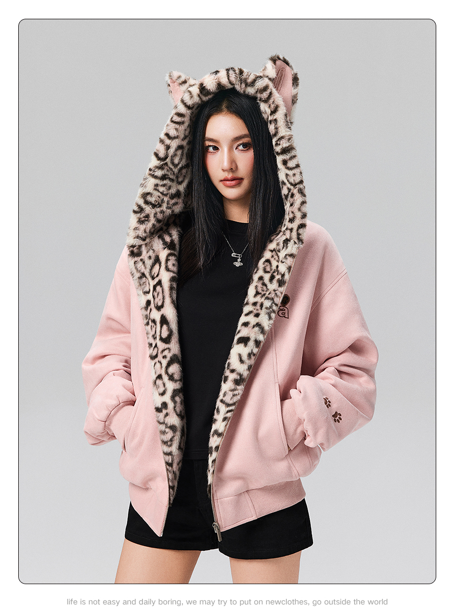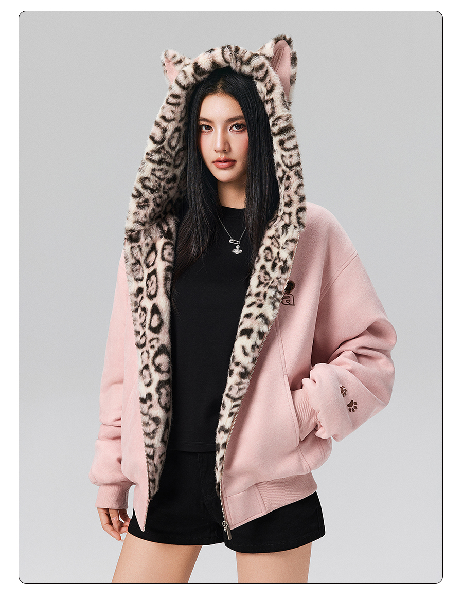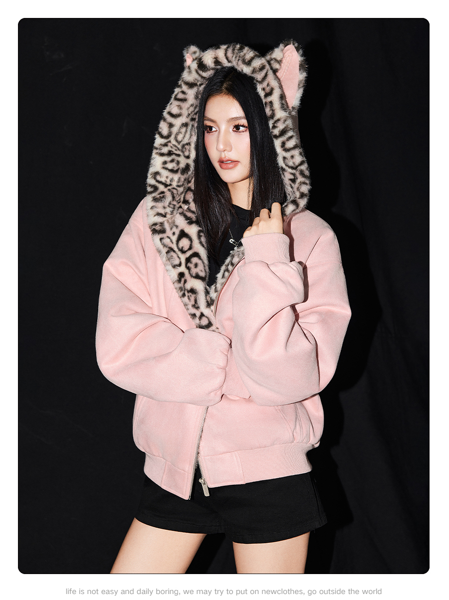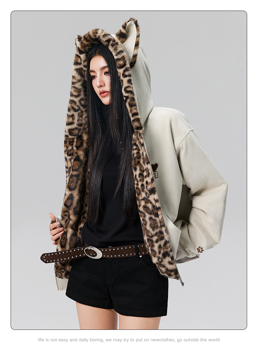 【Achock Official Store】Mu Zhicheng's Same Style Rabbit Ear Warm Sweatshirt Leopard Print Zipper Hooded Fleece Jacket