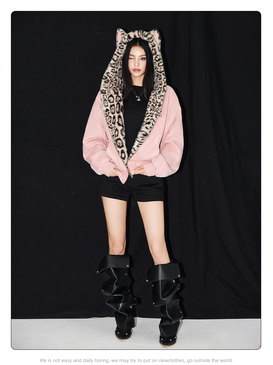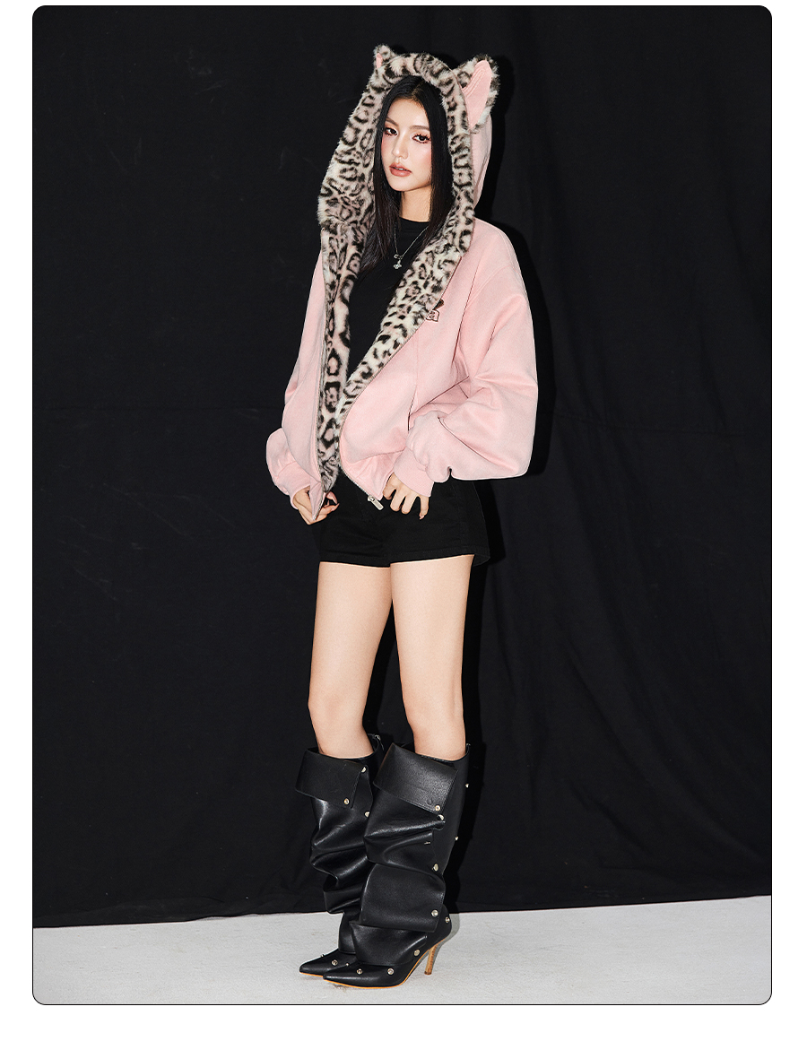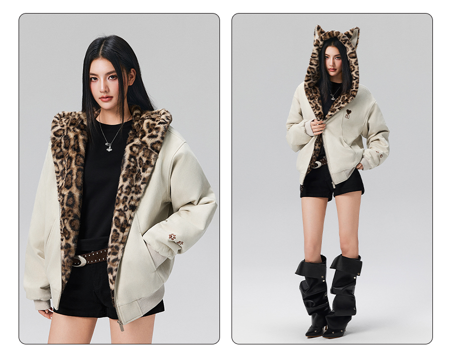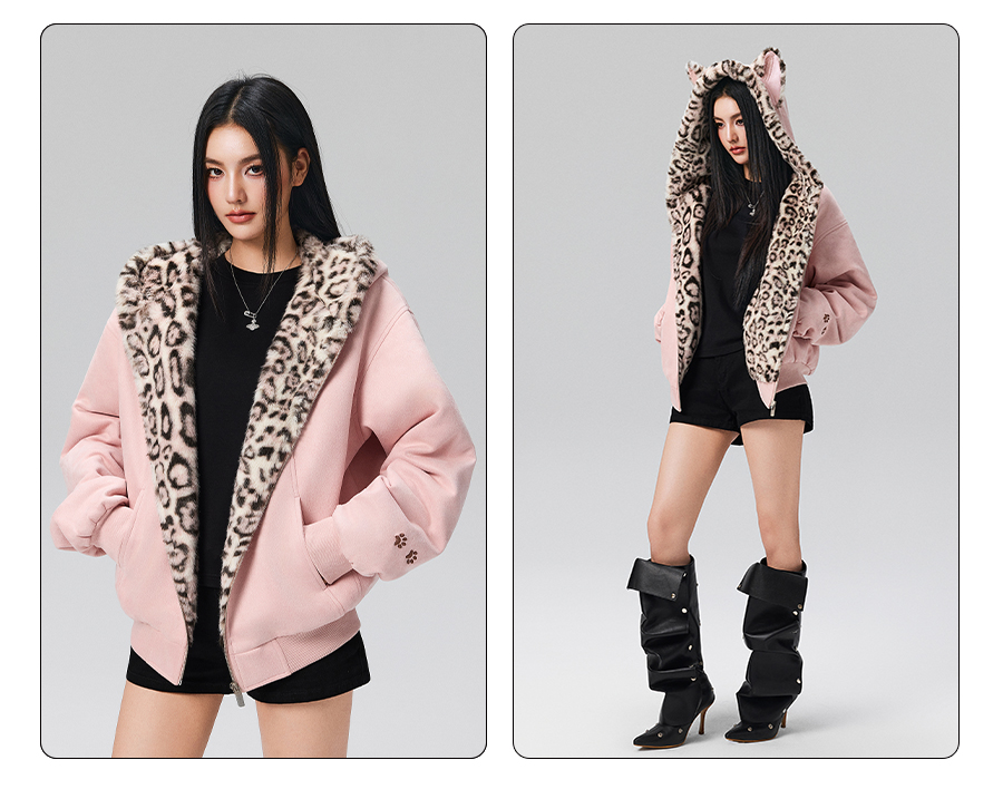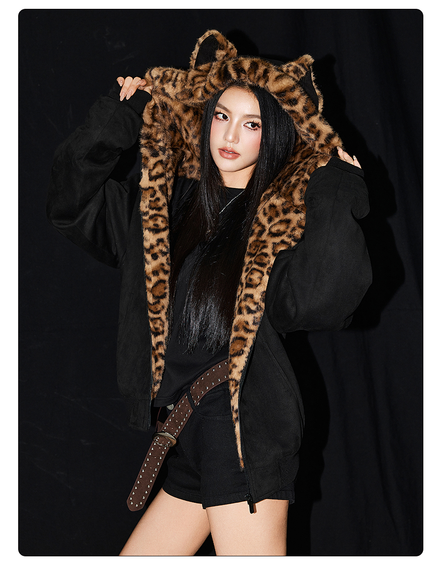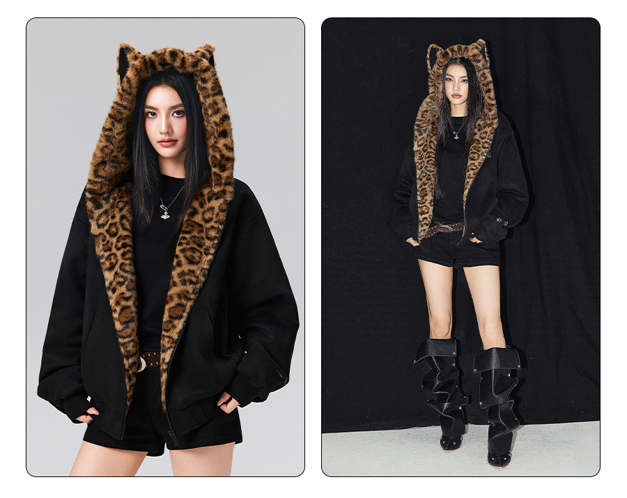 【Achock Official Store】Mu Zhicheng's Same Style Rabbit Ear Warm Sweatshirt Leopard Print Zipper Hooded Fleece Jacket