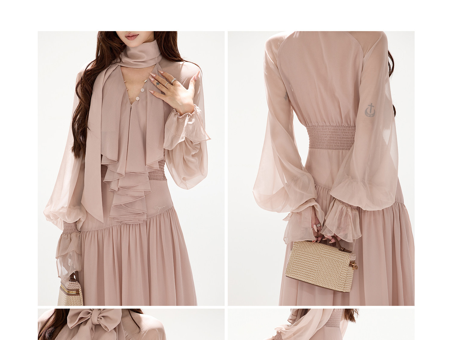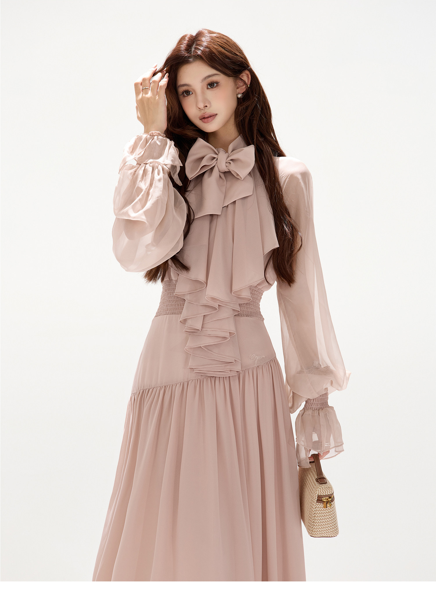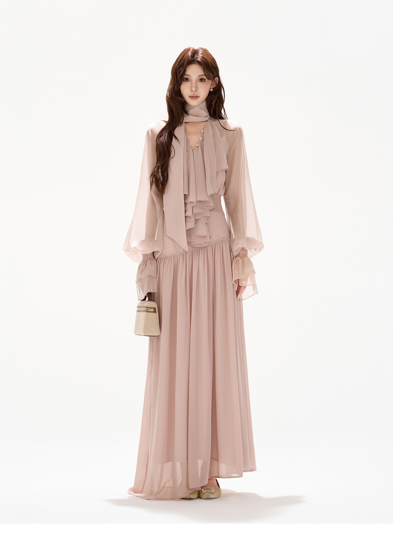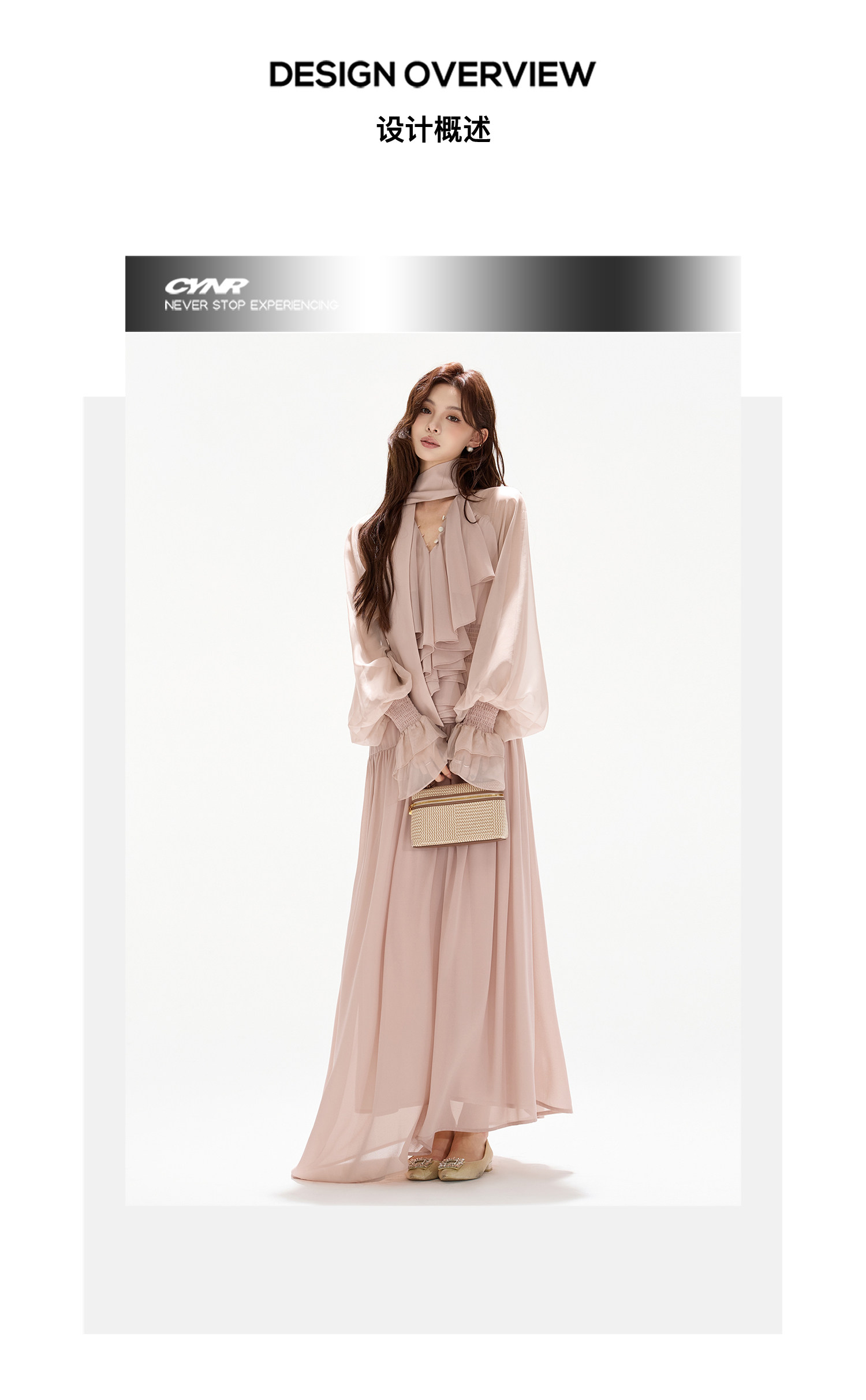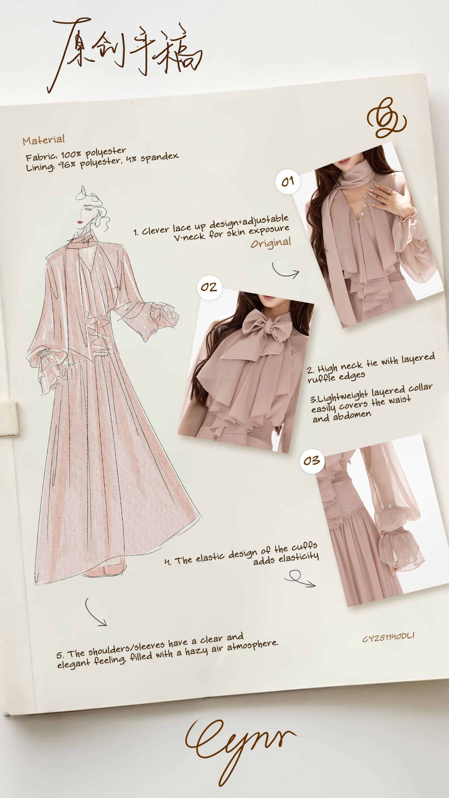 Cynr Original Design French Court-Style Chiffon Ribbon V Neck Lantern Sleeve Dress with Voluminous Hem and Waist-Cinching Long Skirt