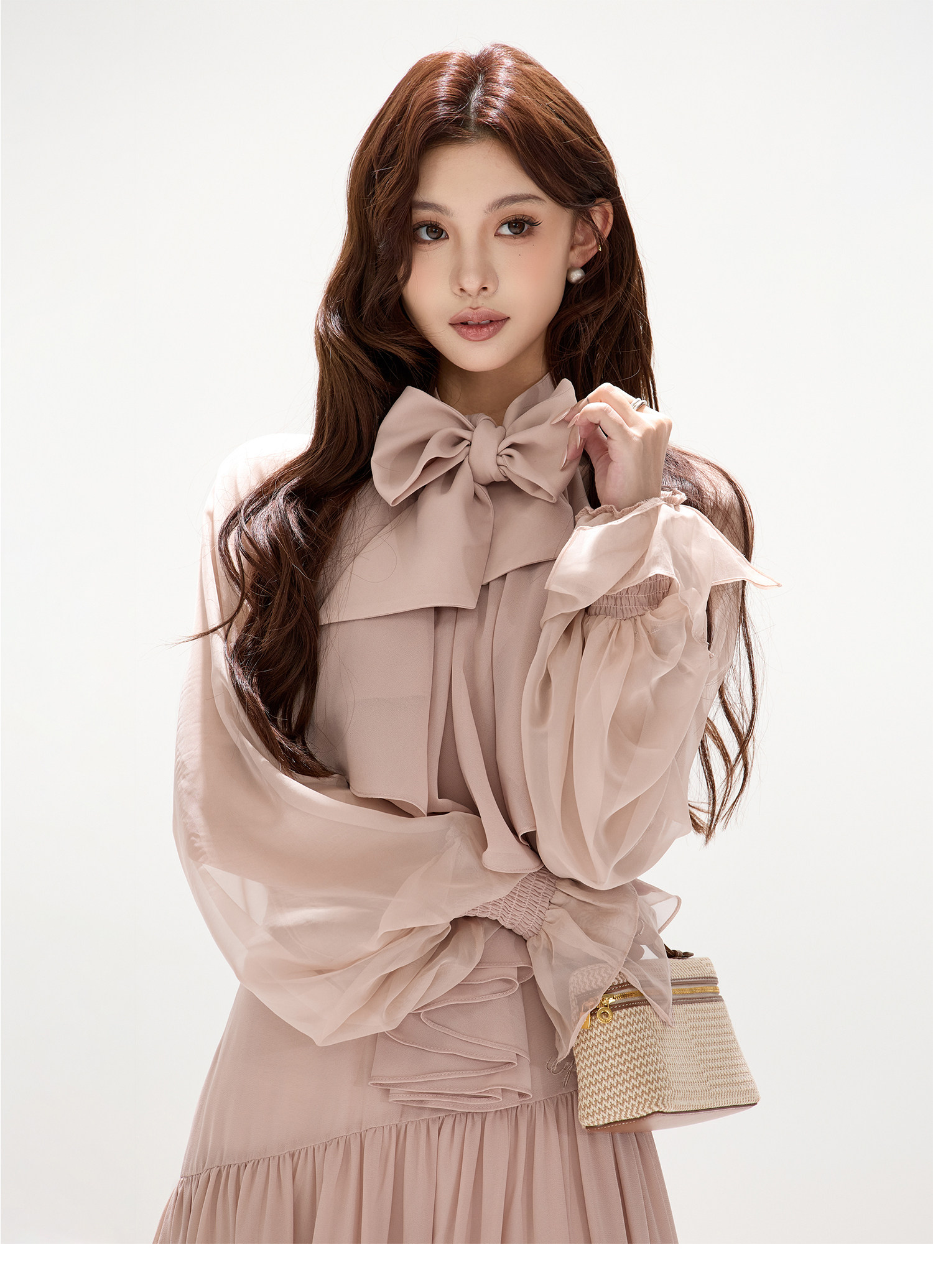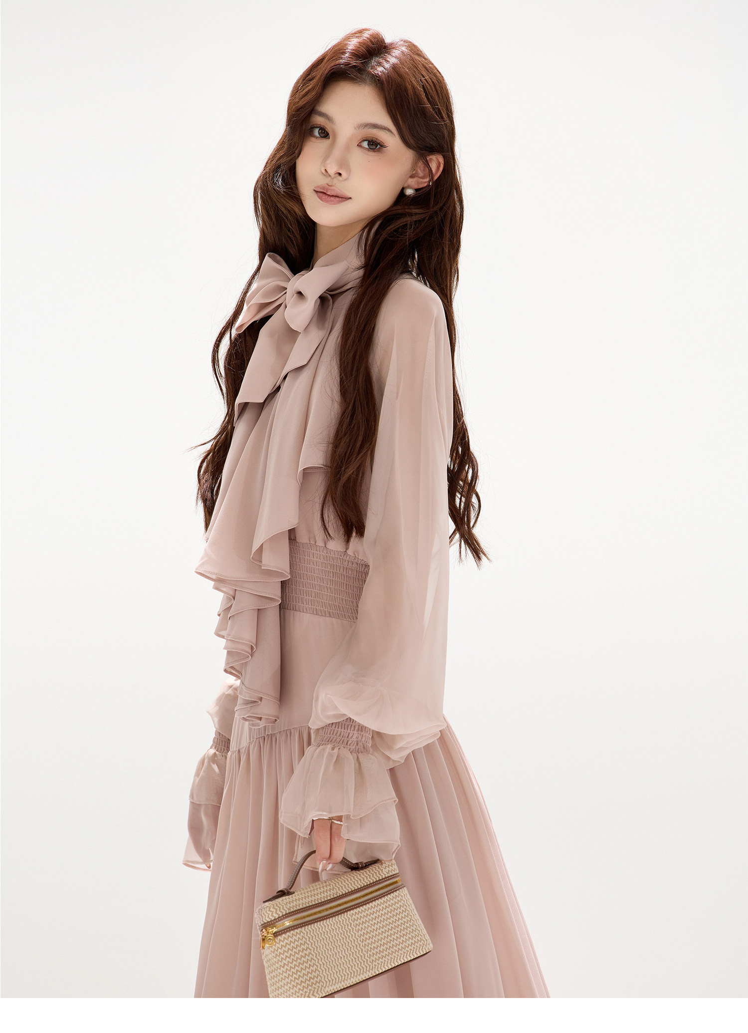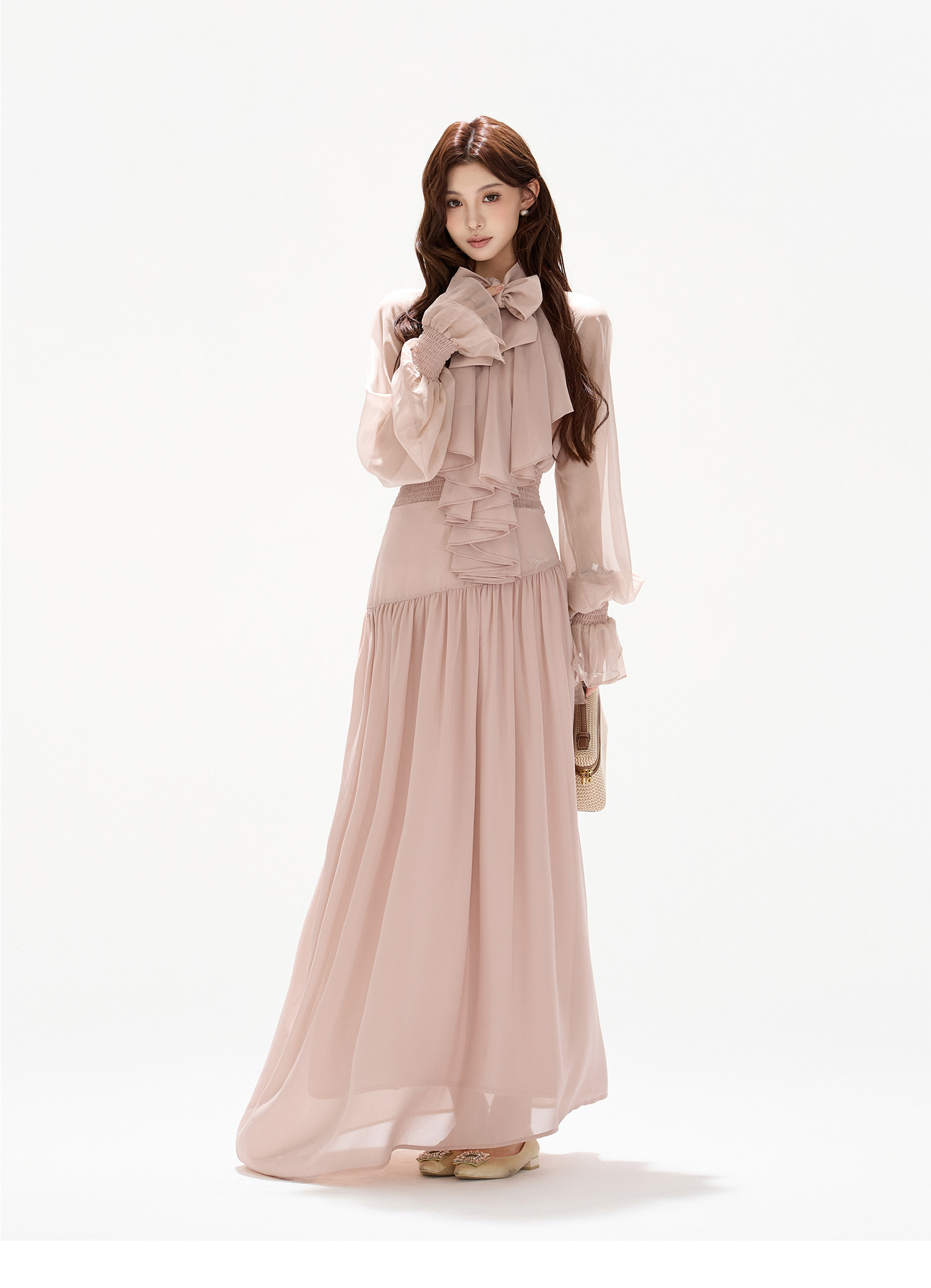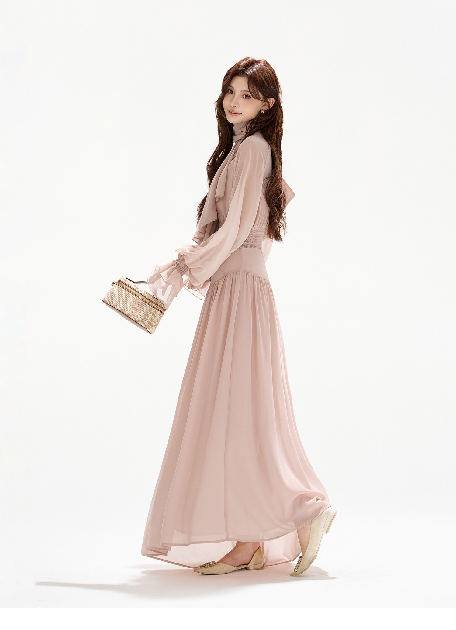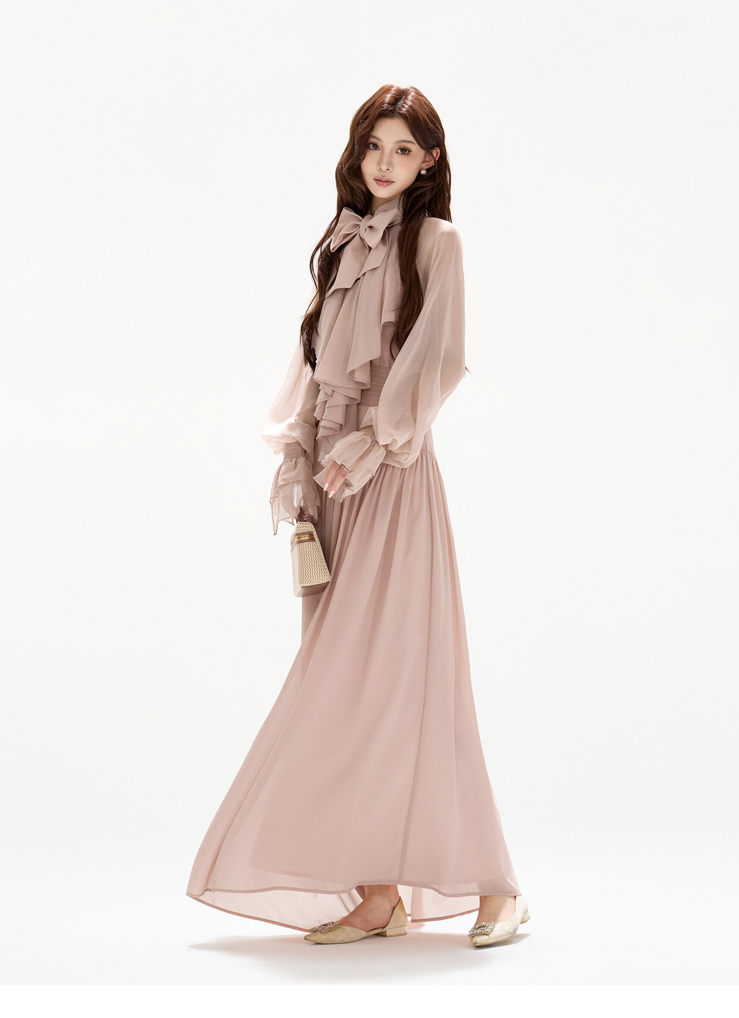 Cynr Original Design French Court-Style Chiffon Ribbon V Neck Lantern Sleeve Dress with Voluminous Hem and Waist-Cinching Long Skirt