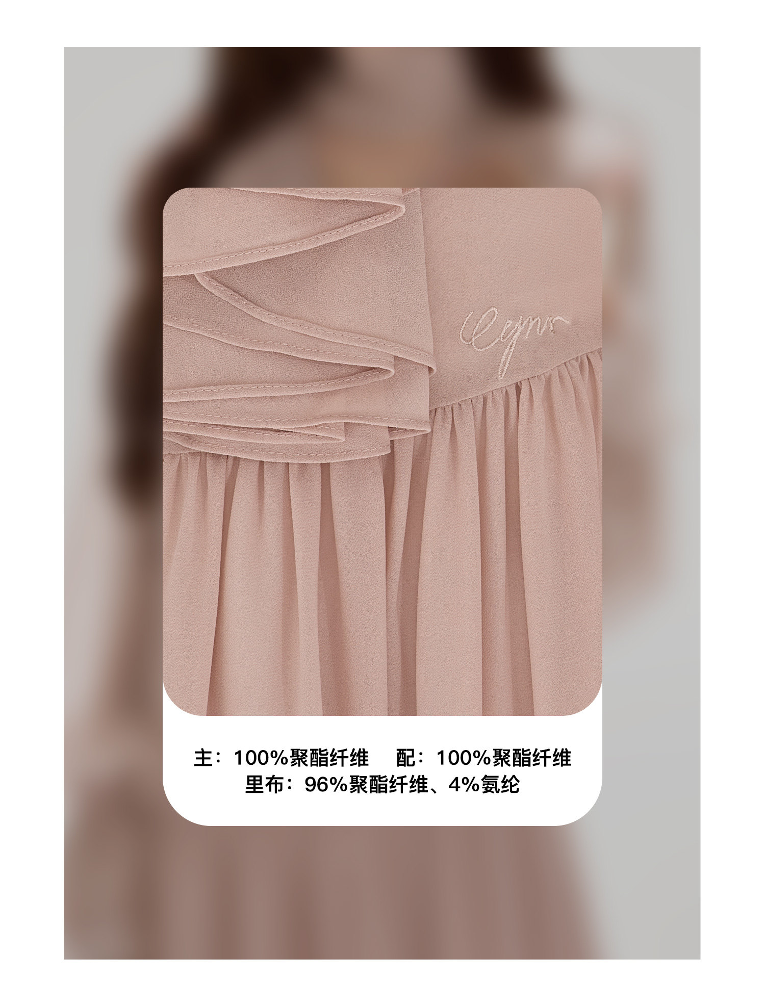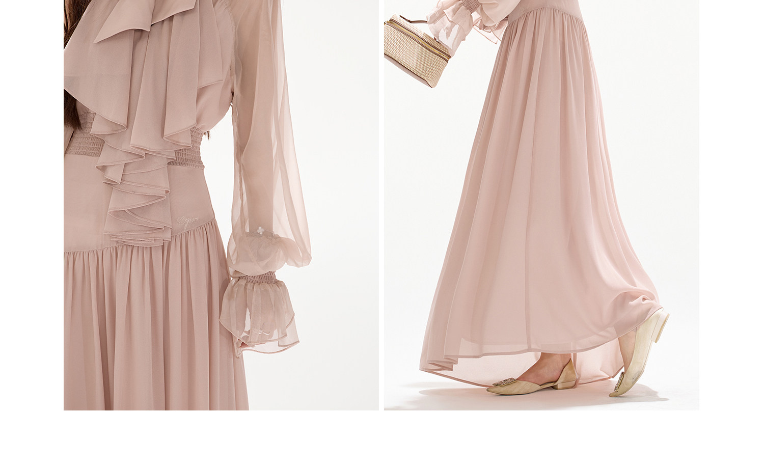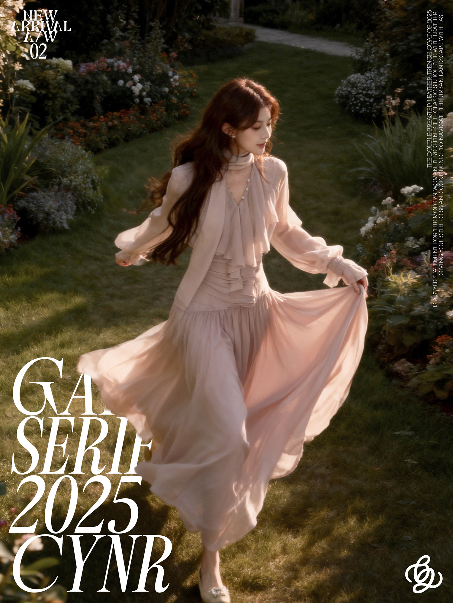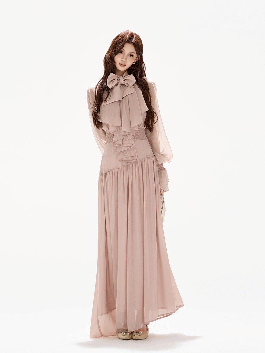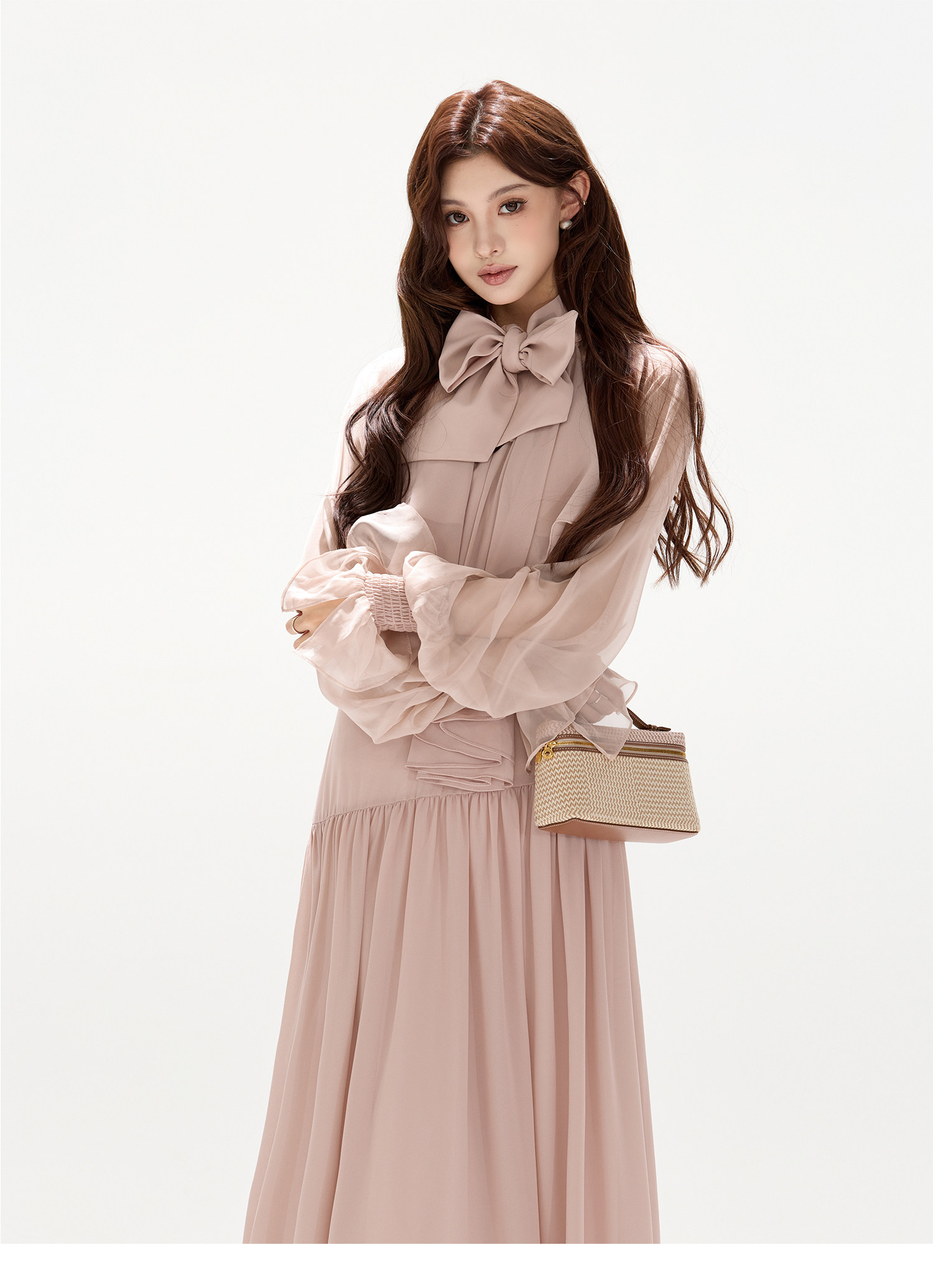 Cynr Original Design French Court-Style Chiffon Ribbon V Neck Lantern Sleeve Dress with Voluminous Hem and Waist-Cinching Long Skirt