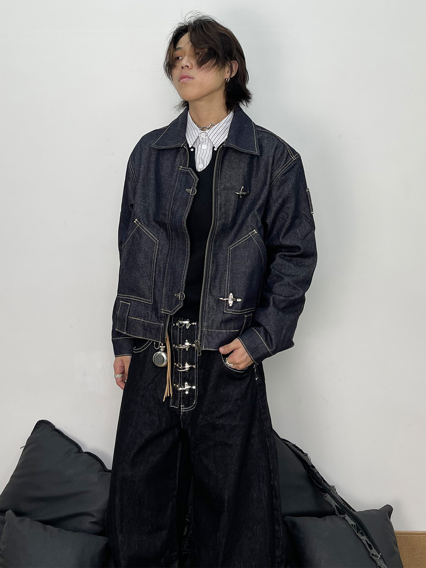 76Street American Retro Washed Denim Jacket for Men and Women, Tailored Patchwork with Snap Buttons, Short Wide Lapel Jacket