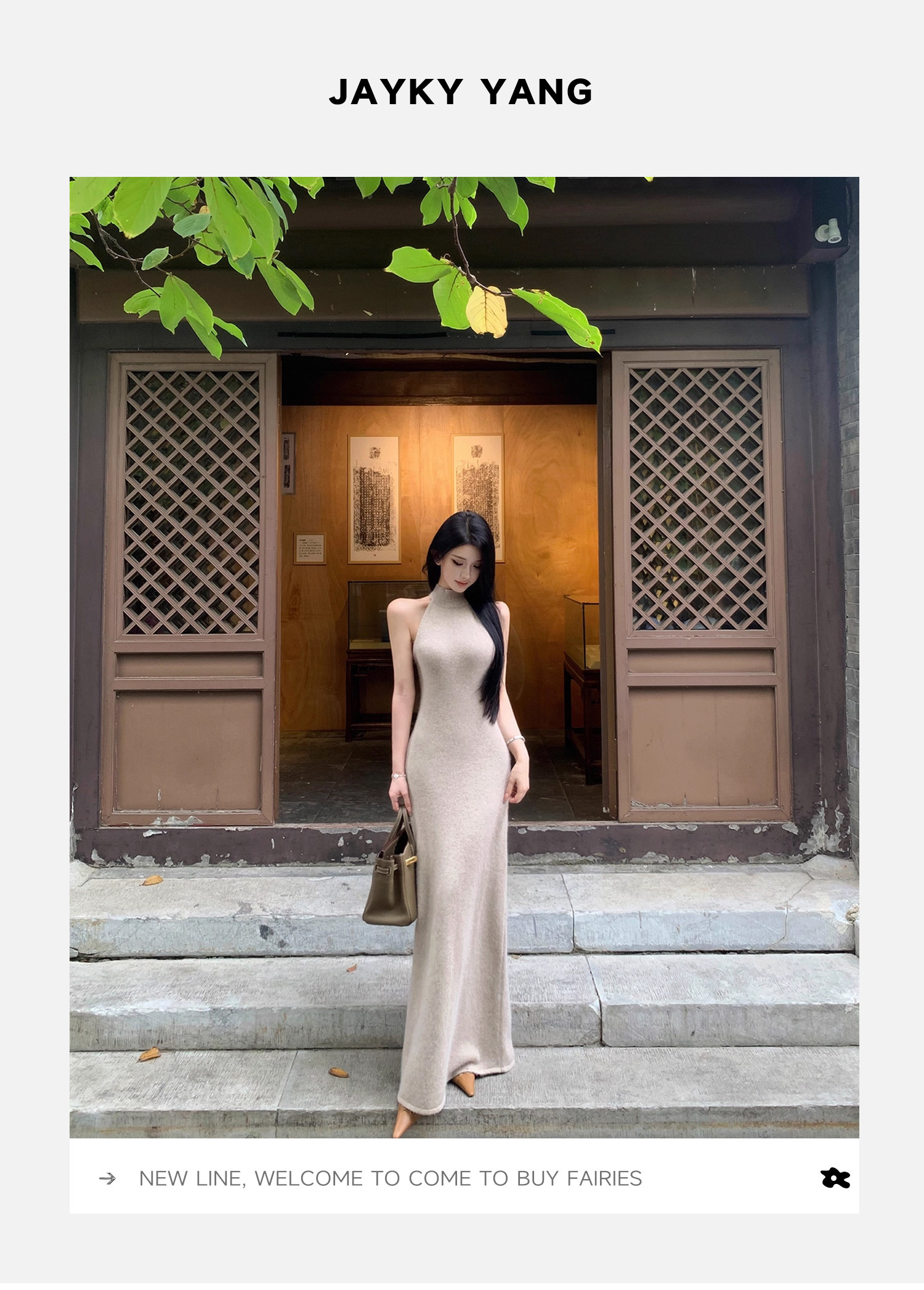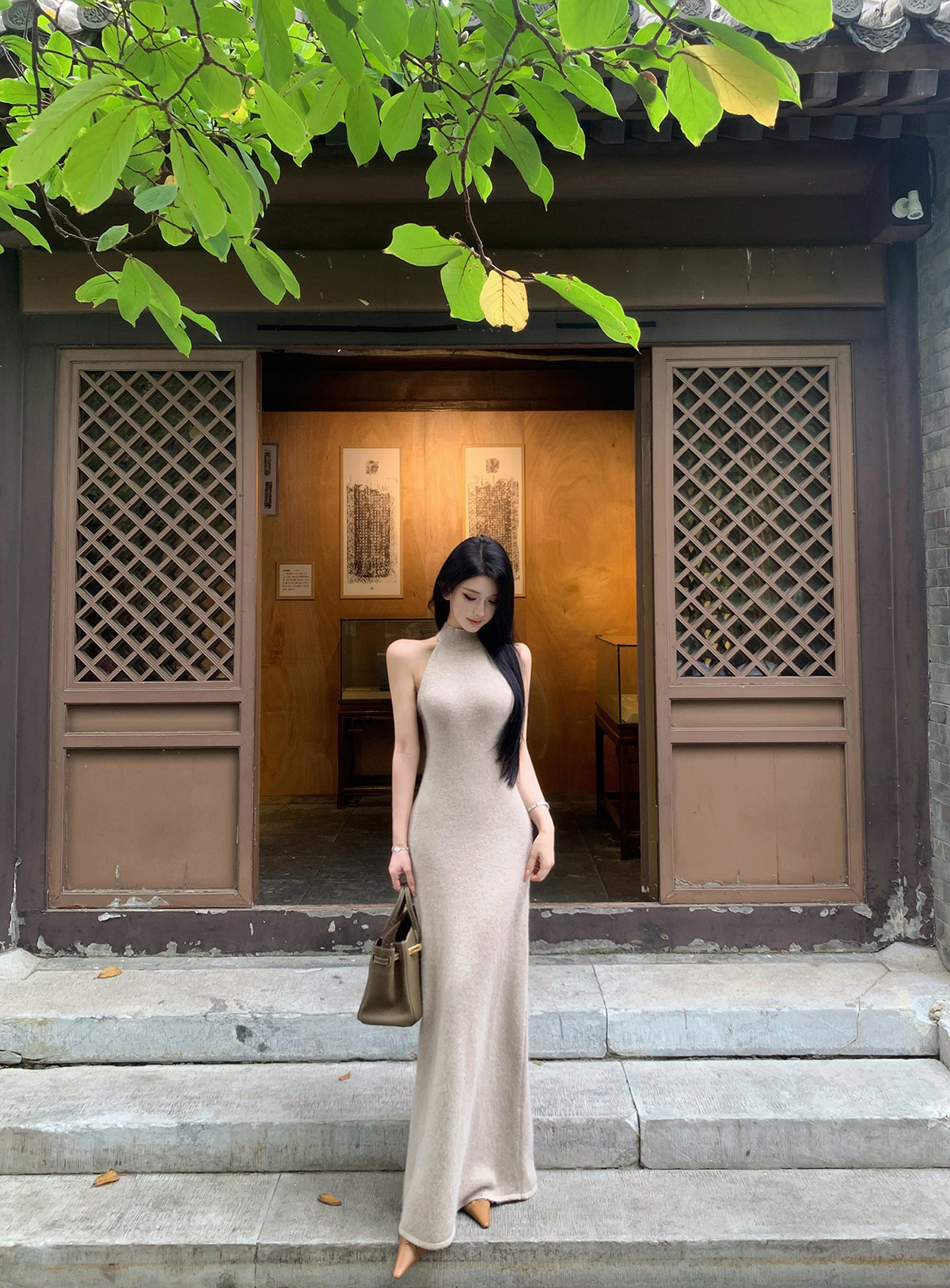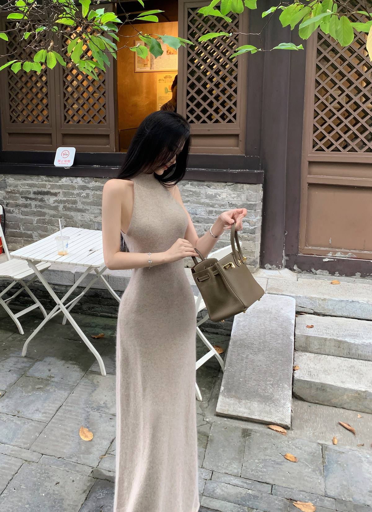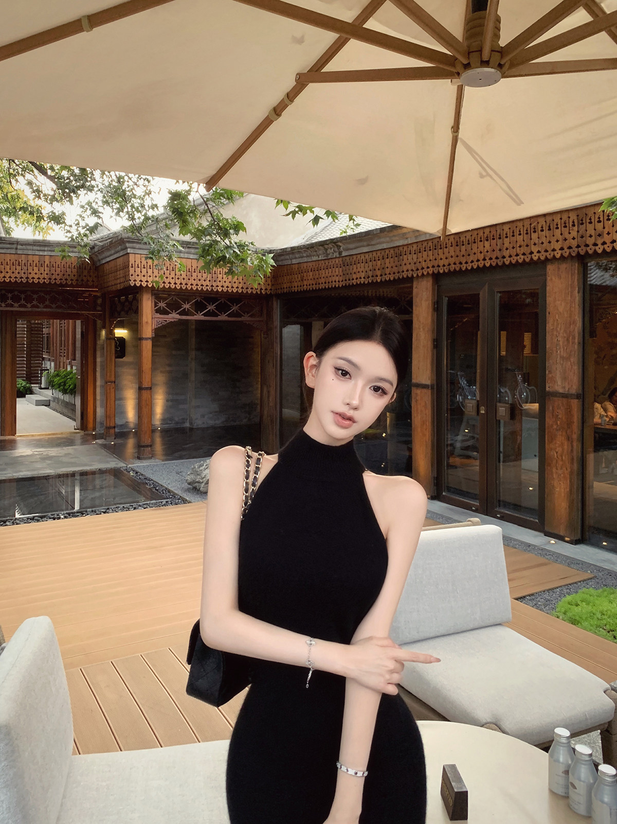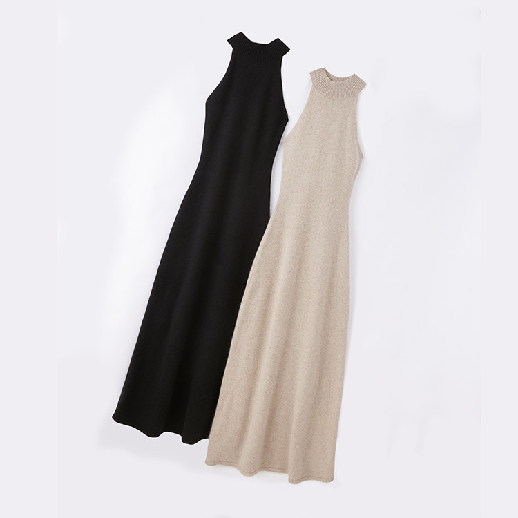 无袖挂脖的设计,露出部分肌肤平衡针织裙的厚重感,