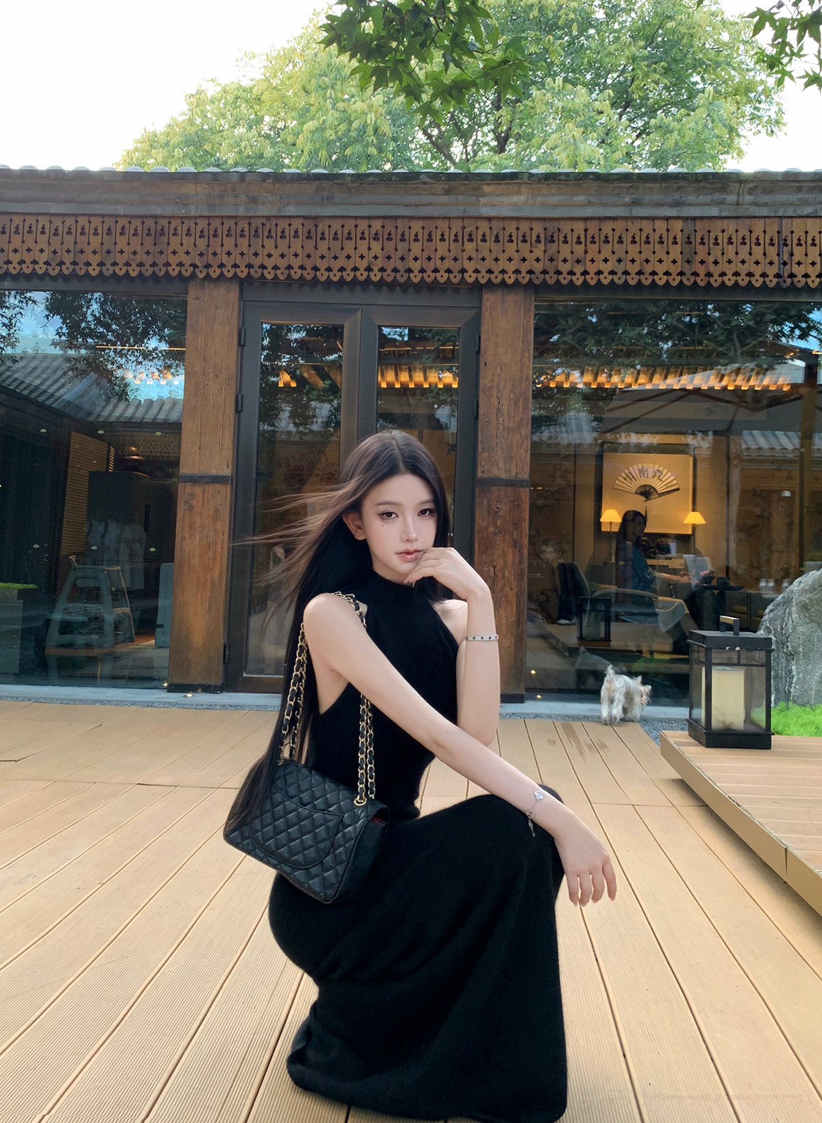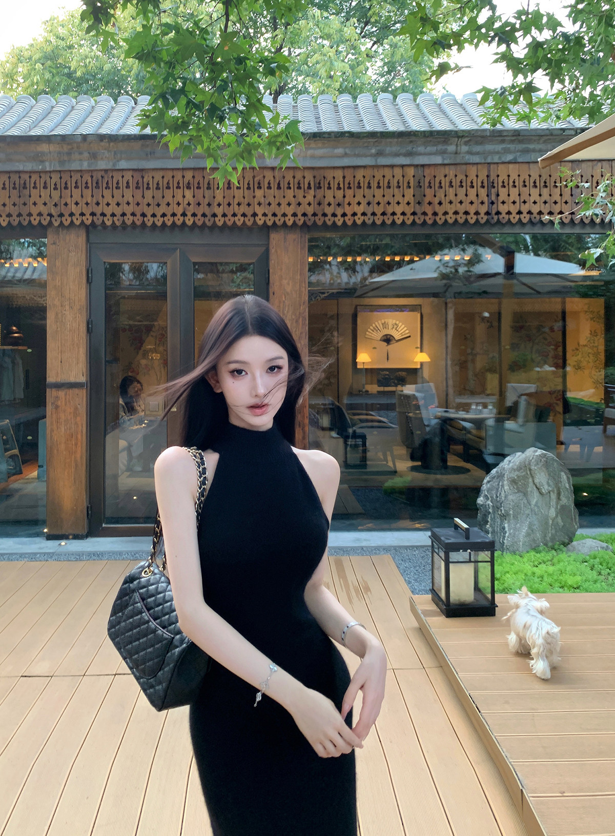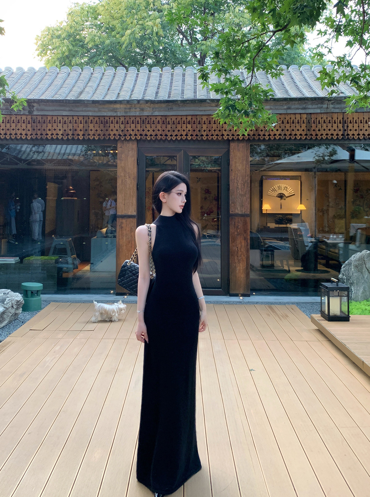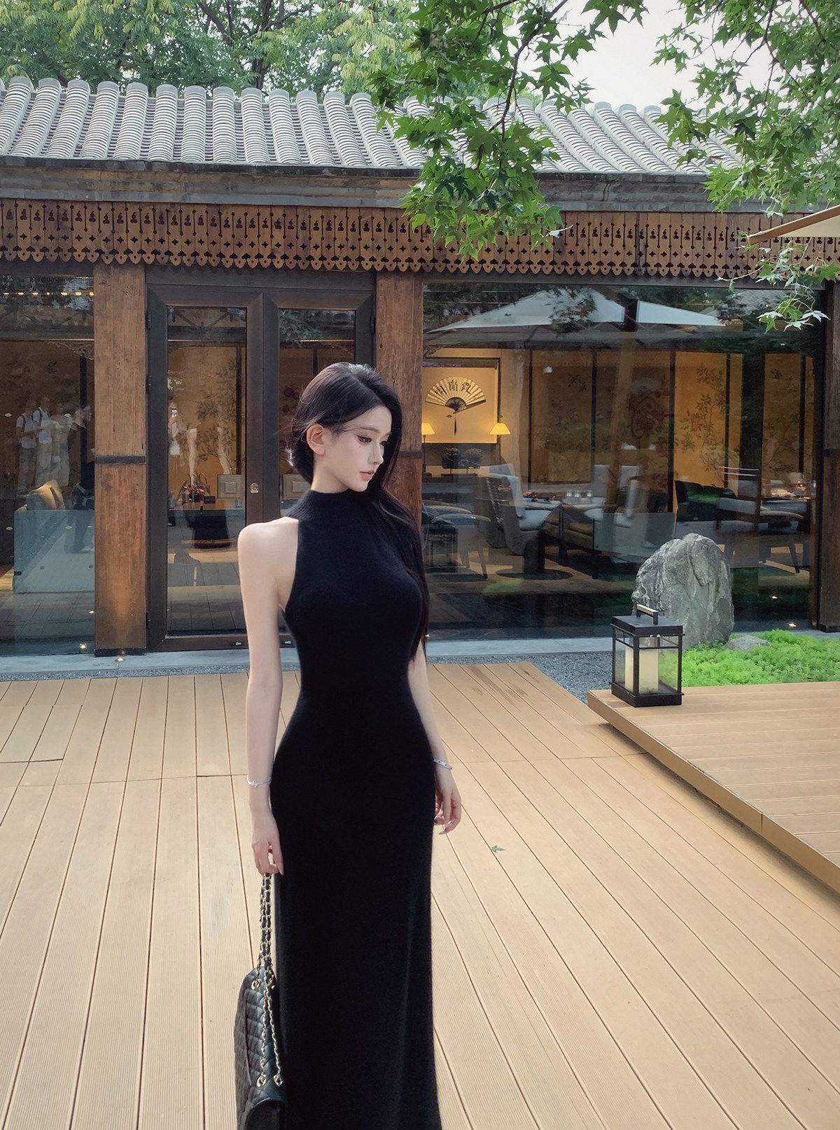 无袖挂脖的设计,露出部分肌肤平衡针织裙的厚重感,