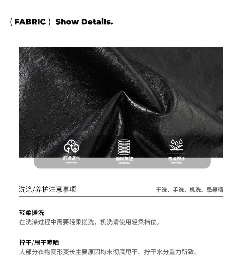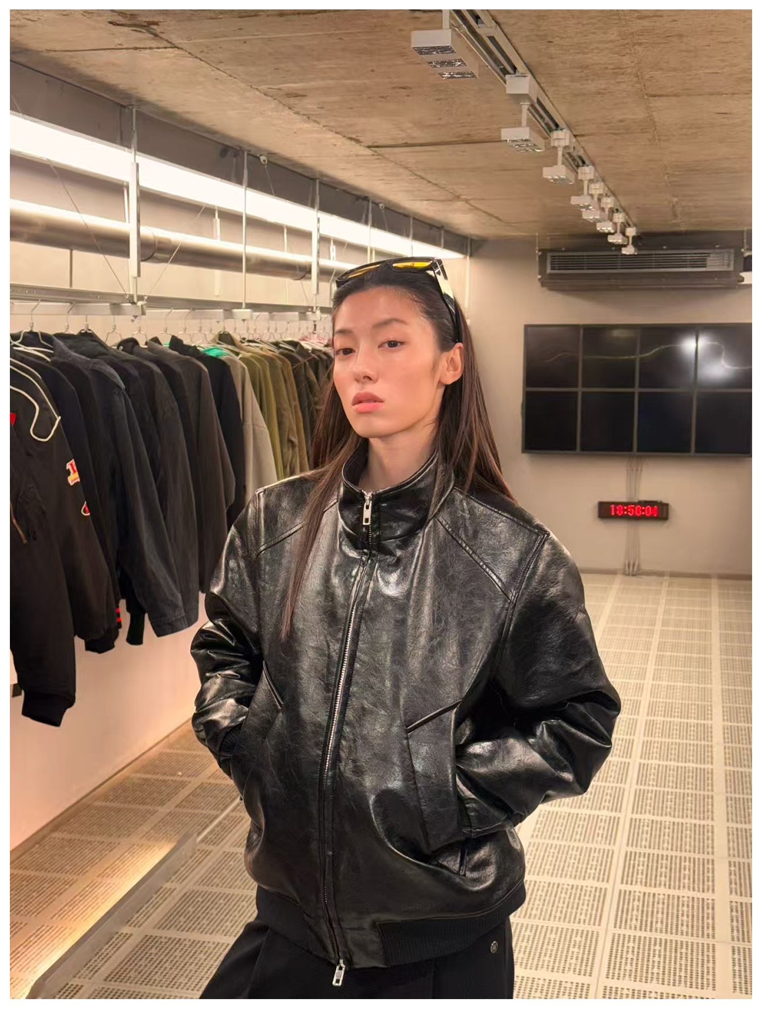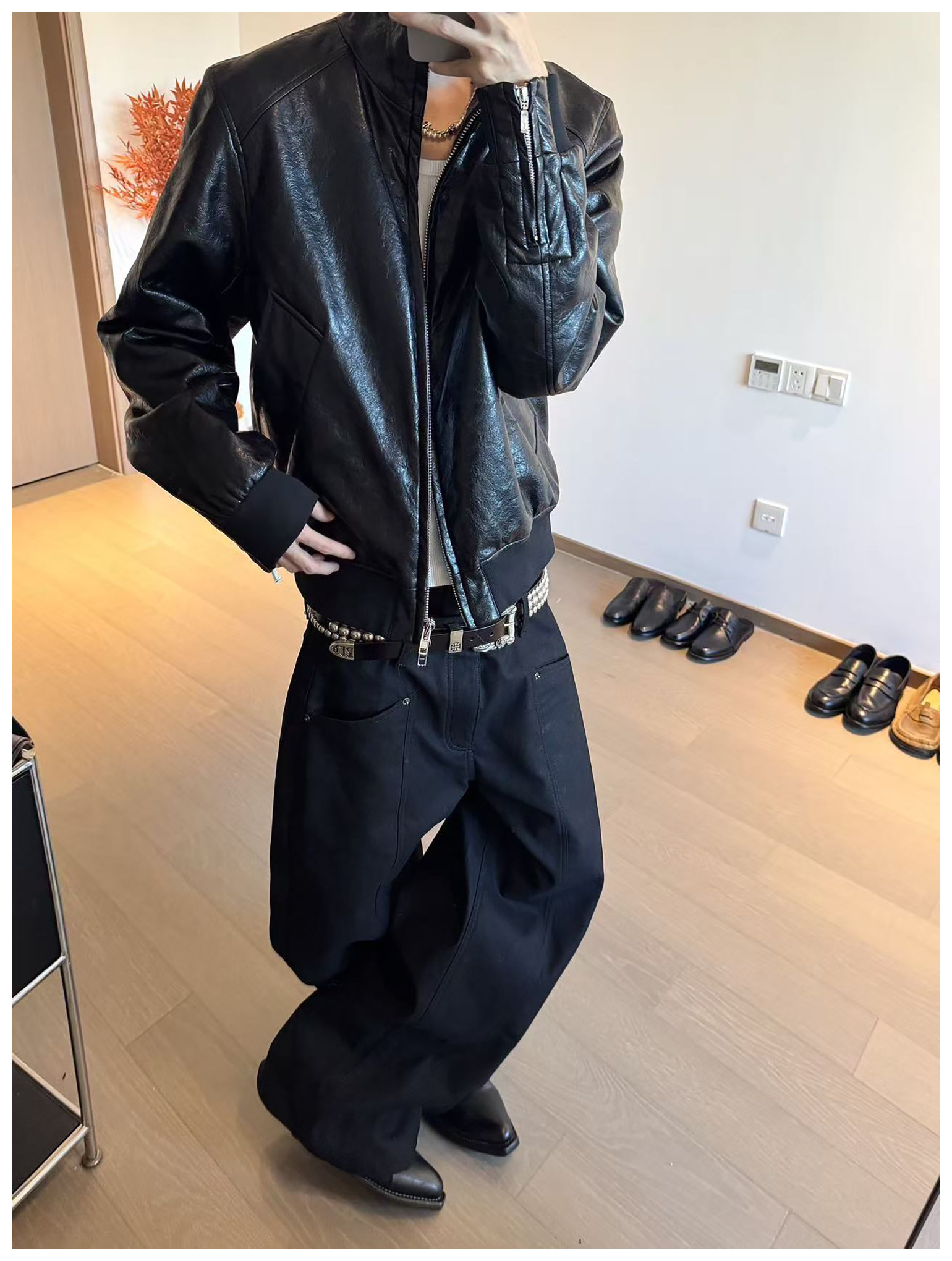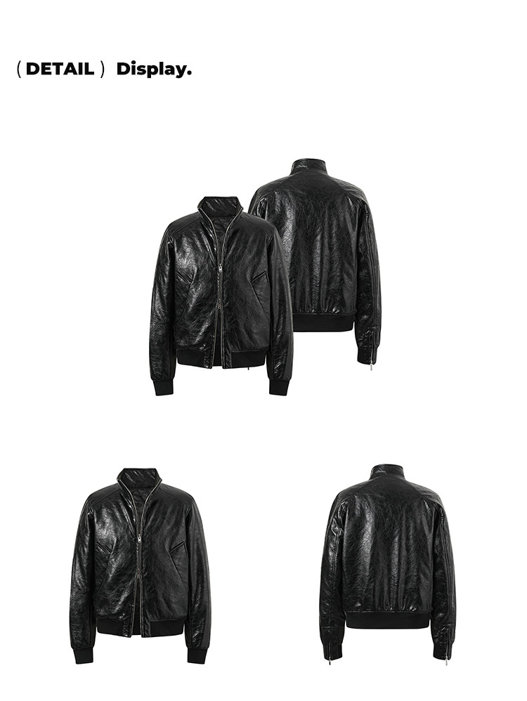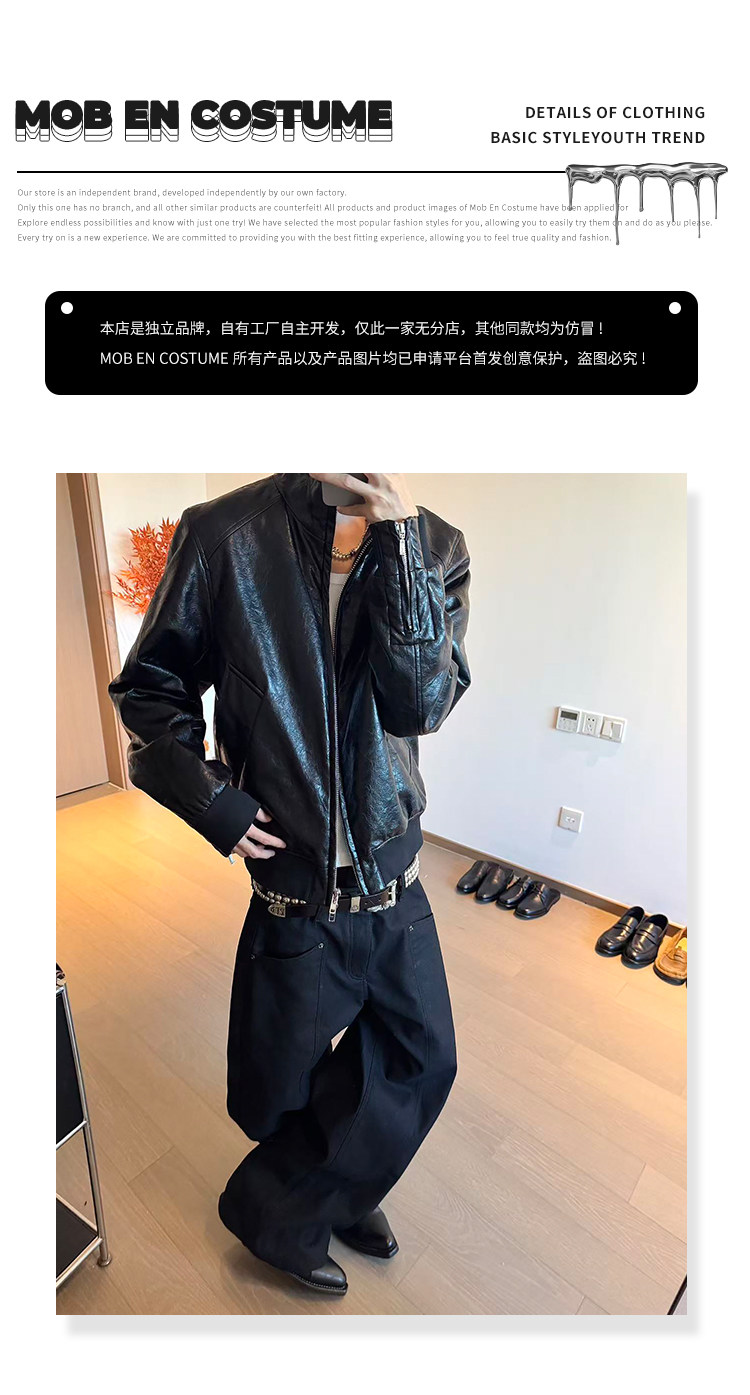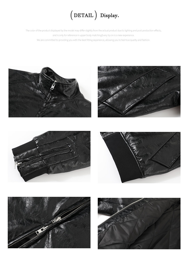 Mob in Costume/Stand-Up Collar Pu Leather Jacket, Cotton-Padded Motorcycle Leather Jacket, Warm, Slim-Fitting, Windproof, Unisex