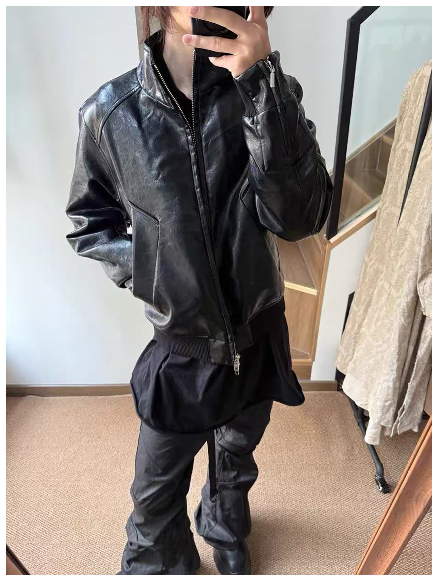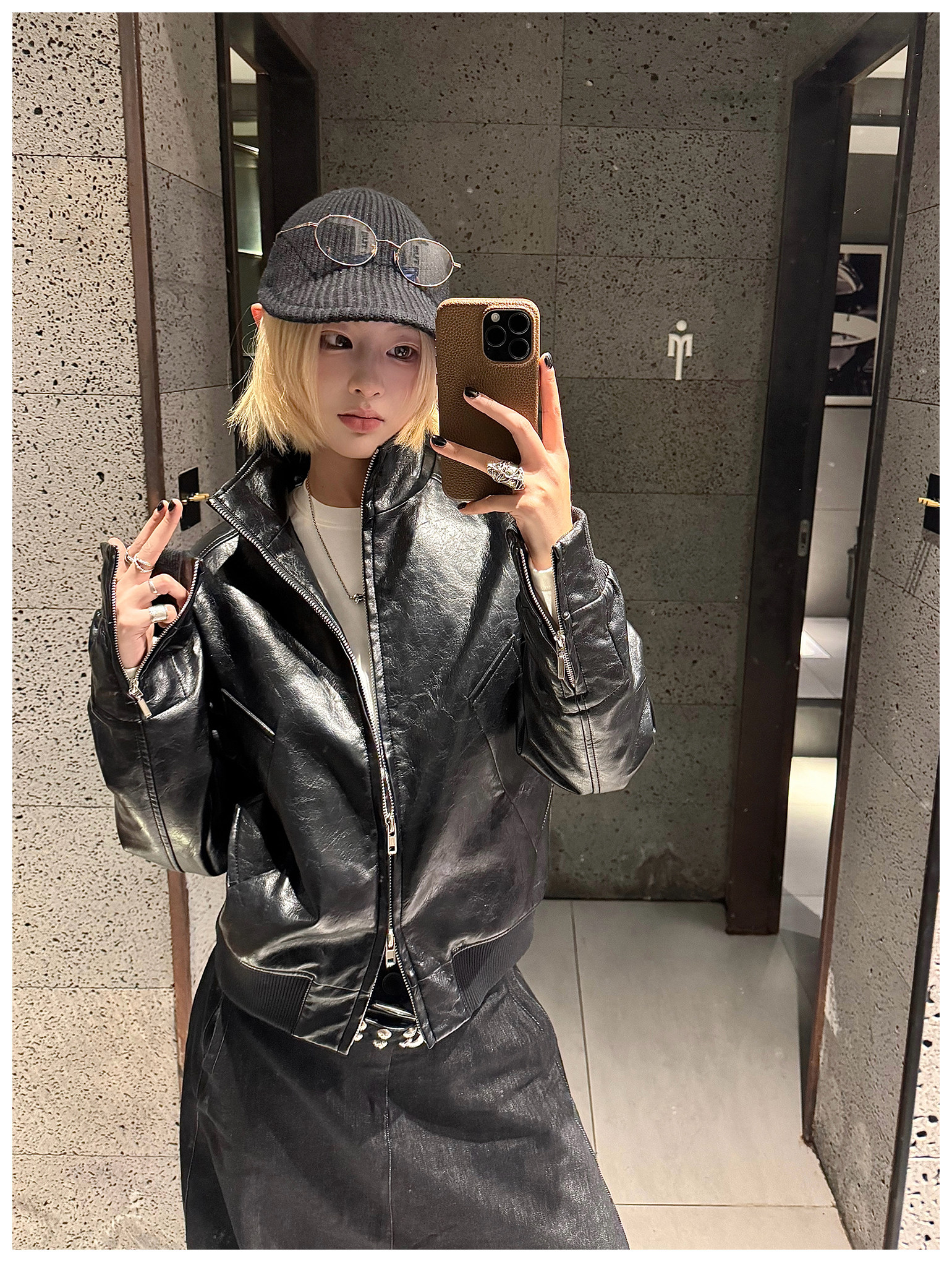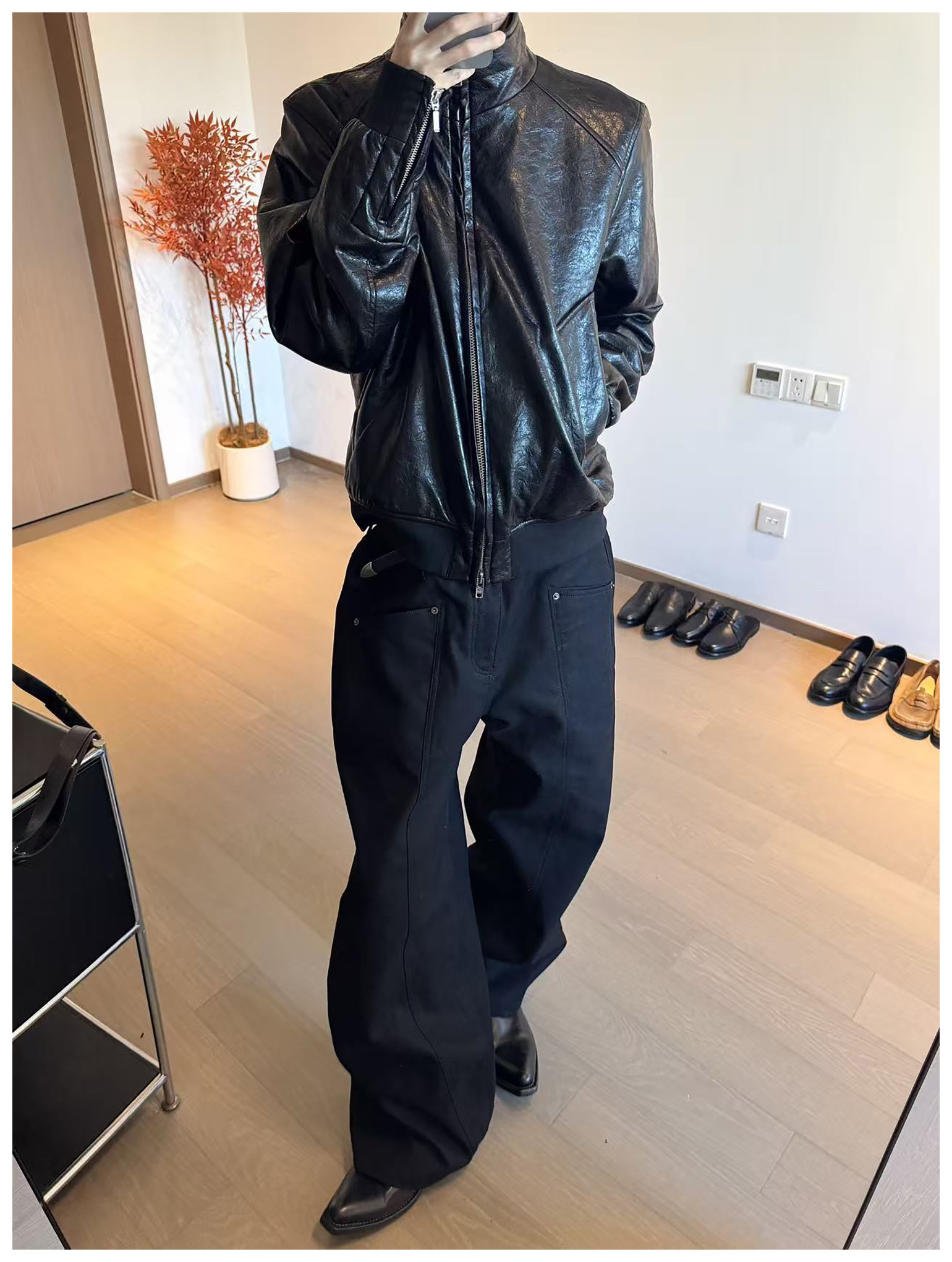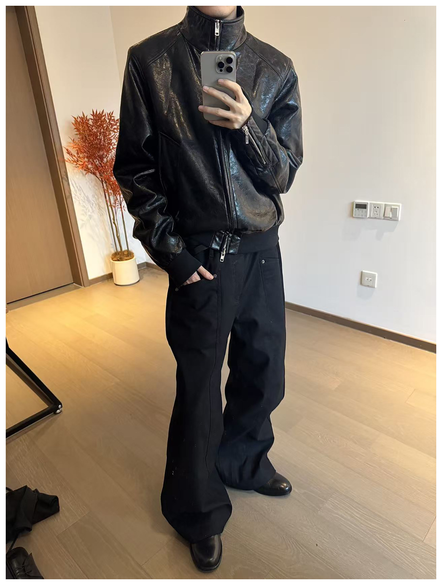 Mob in Costume/Stand-Up Collar Pu Leather Jacket, Cotton-Padded Motorcycle Leather Jacket, Warm, Slim-Fitting, Windproof, Unisex