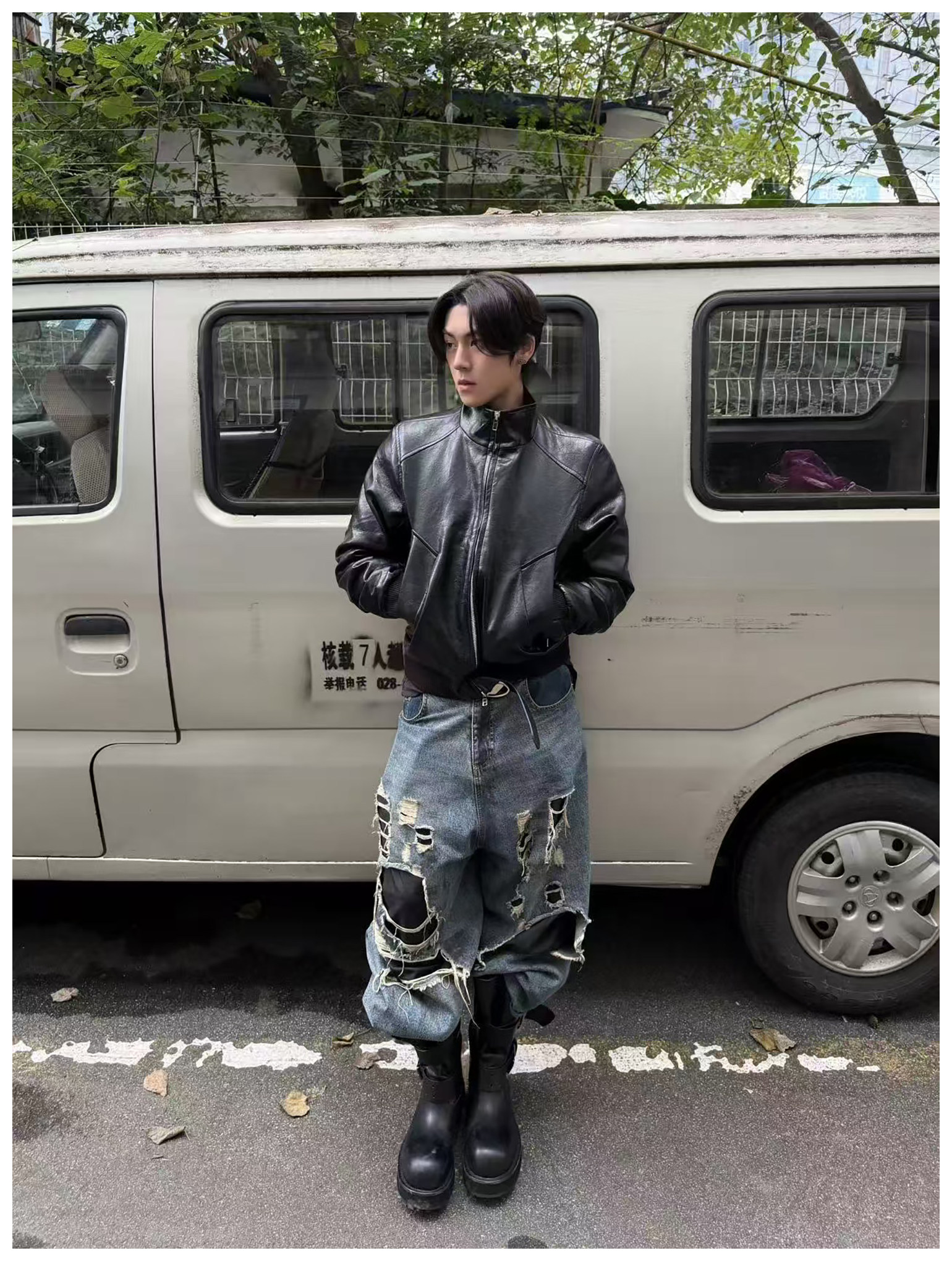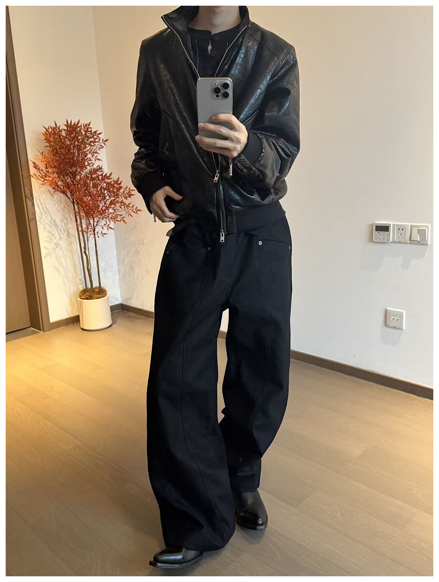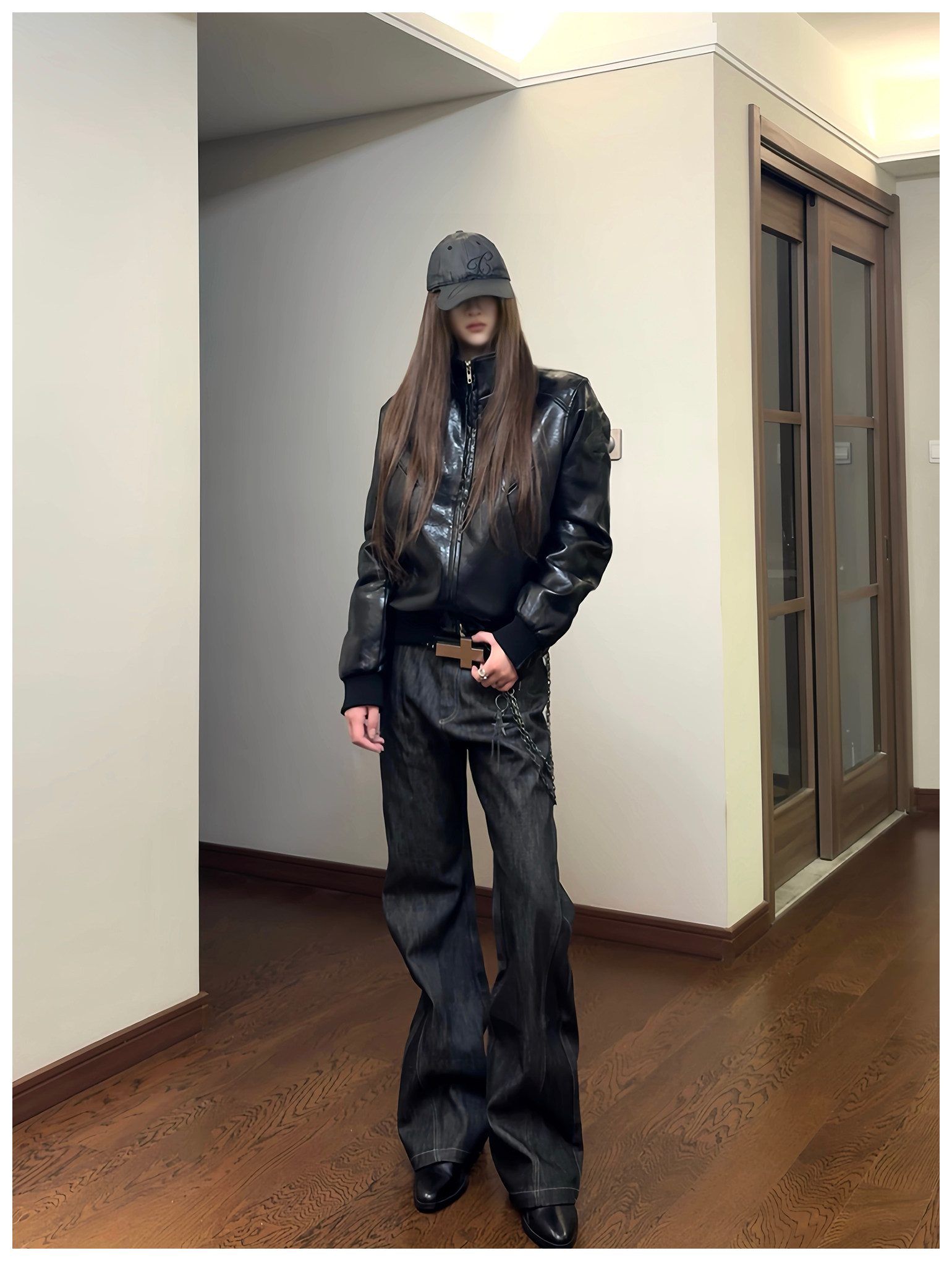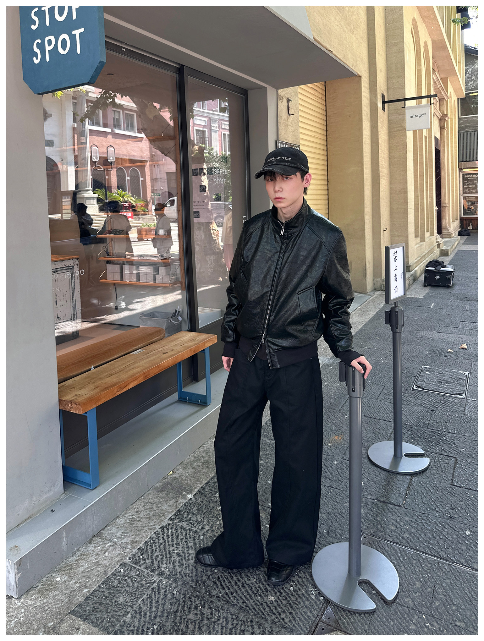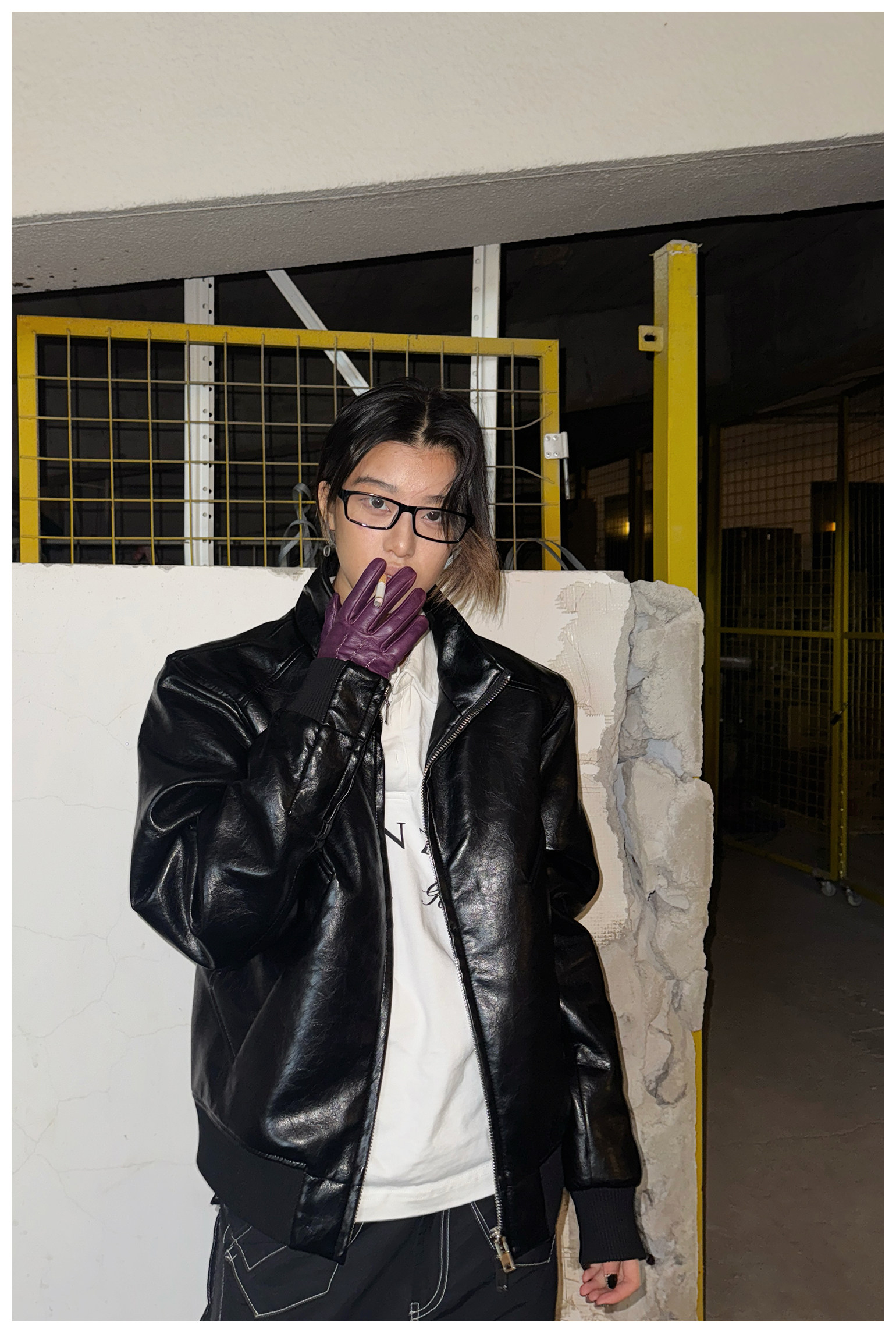 Mob in Costume/Stand-Up Collar Pu Leather Jacket, Cotton-Padded Motorcycle Leather Jacket, Warm, Slim-Fitting, Windproof, Unisex