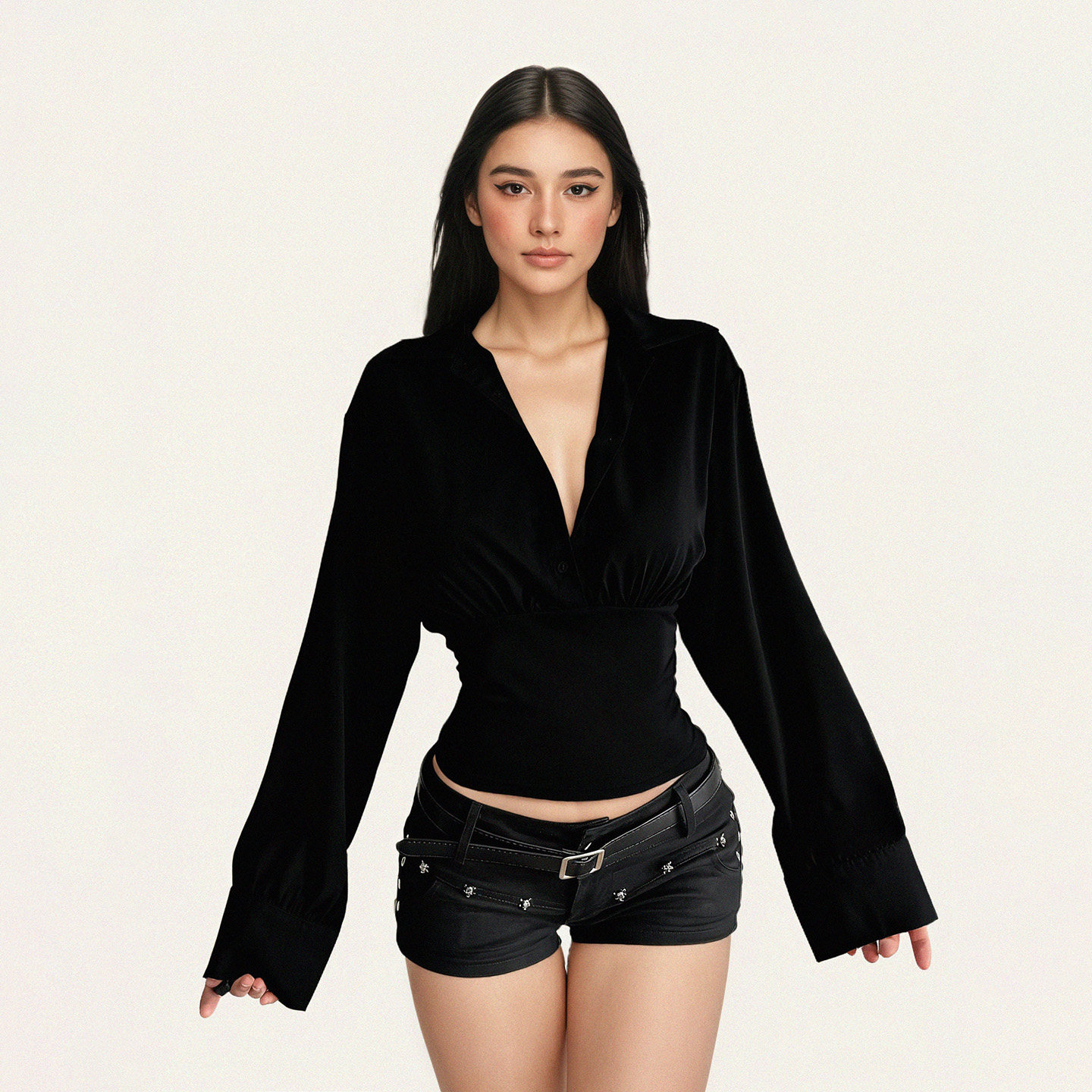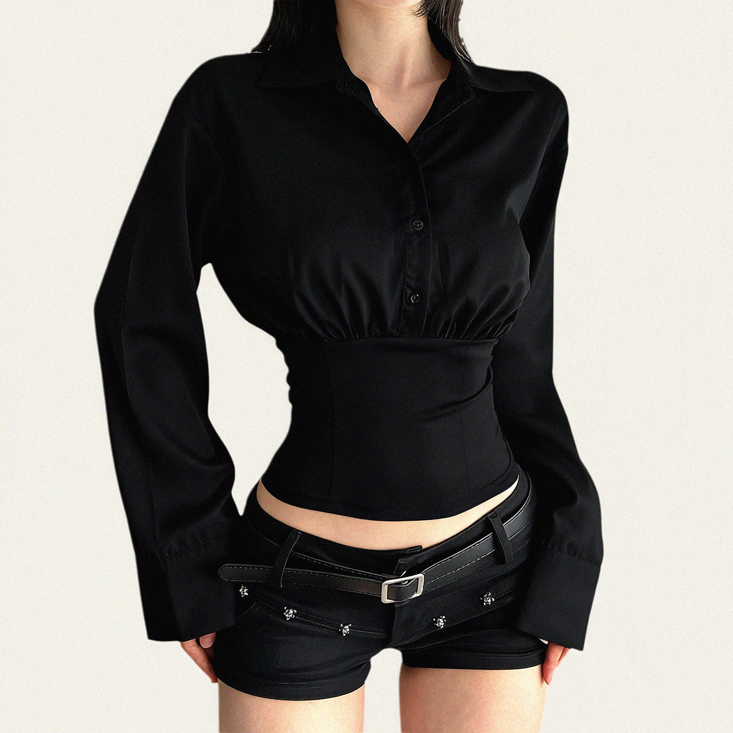 Funoff American Retro Black Button-Down Polo Collar Long-Sleeve Shirt 25 Autumn Siren Style Commuter Waist-Cinching Top