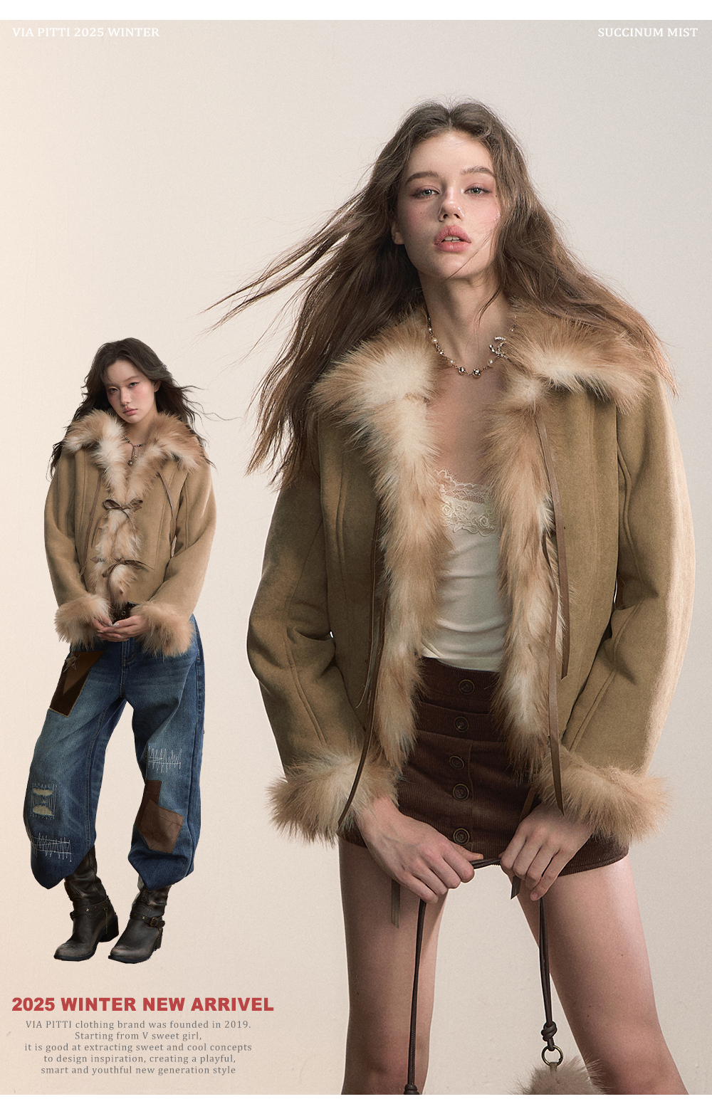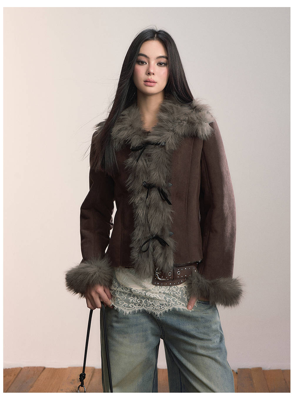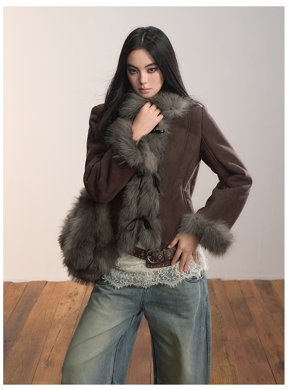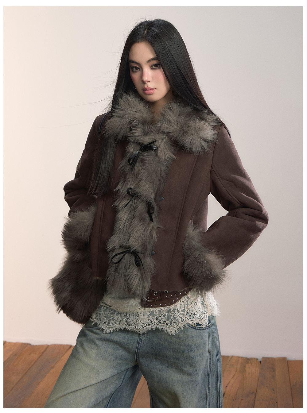 Viapitti Design-Focused Heavy-Duty Bow-Tie Faux Fur Integrated Coat for Women, Autumn and Winter Large Fur Collar Top